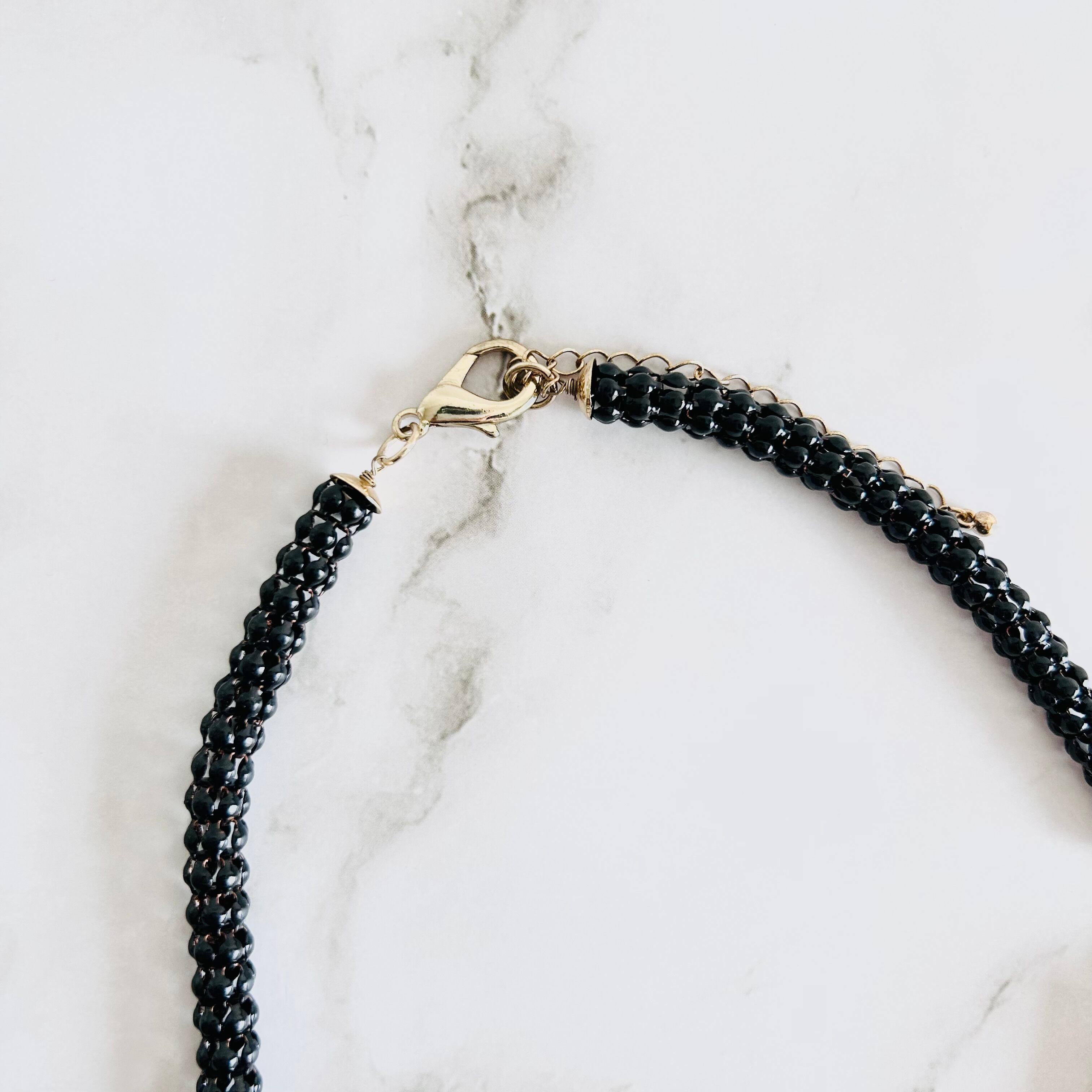 お首元を彩るのは、デザイン性のある艶やかなブラックのチェーン。
