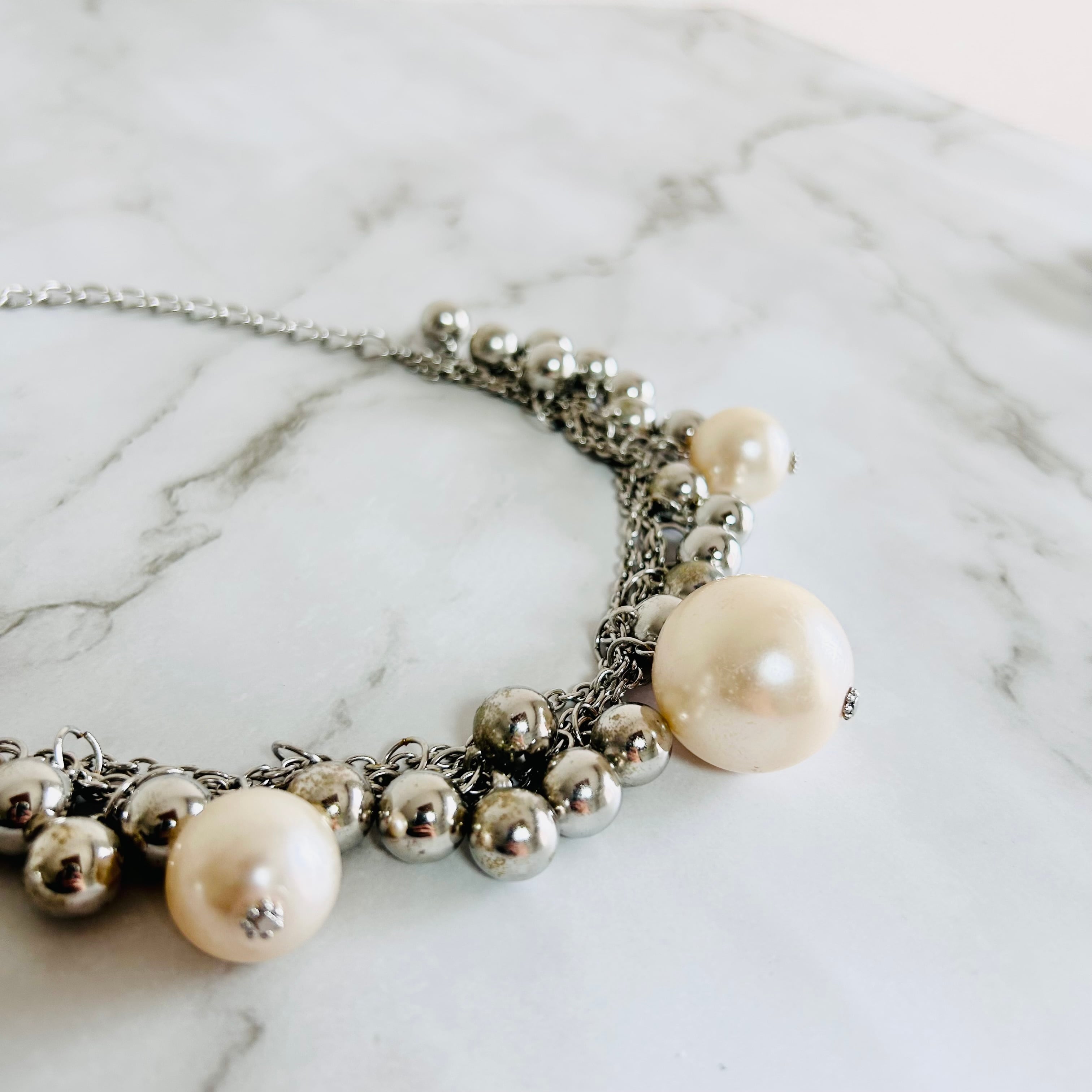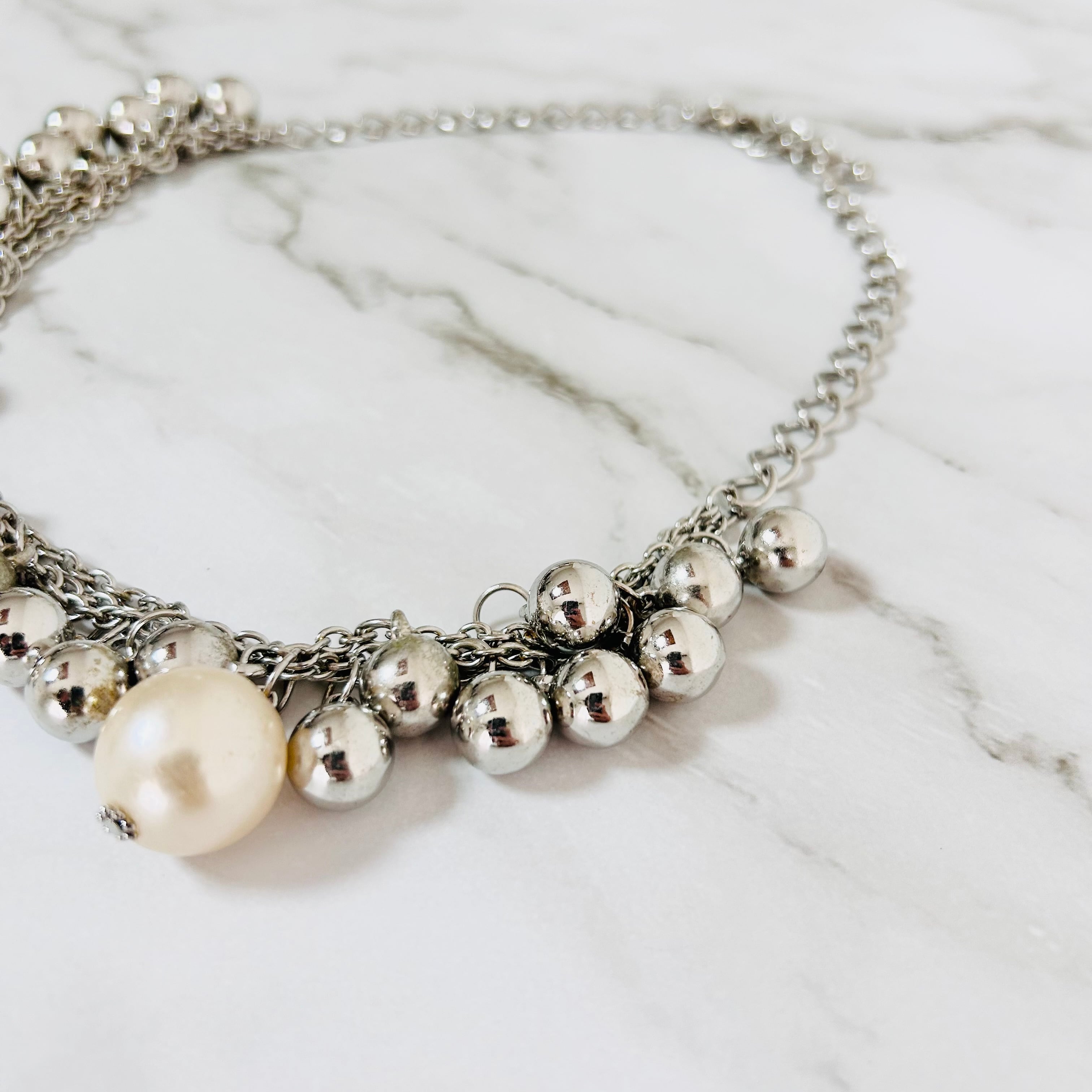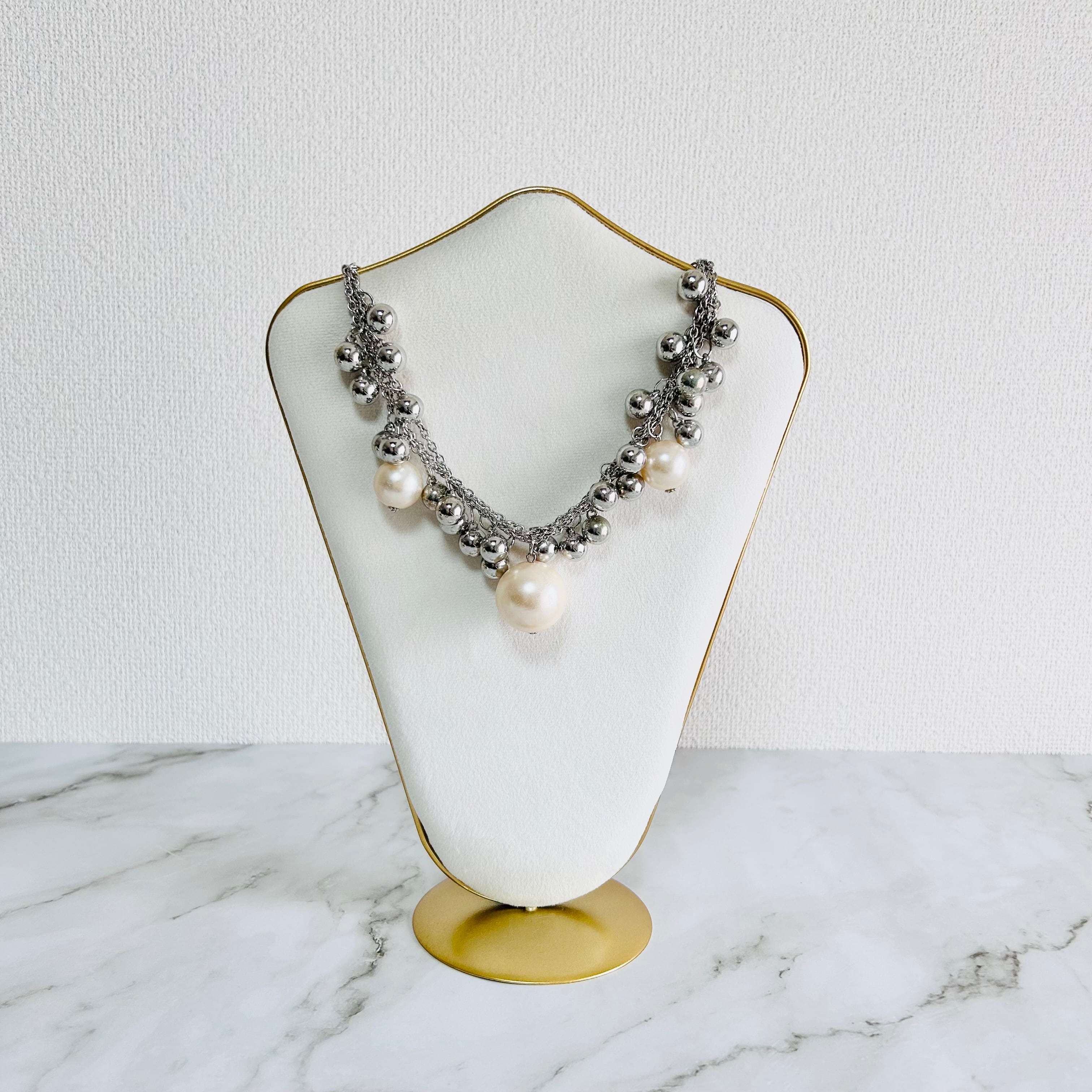 シルバーカラーのチェーンに、メタルボールとアイボリー系カラーのパールボールをデコレートした華やかなネックレスです。