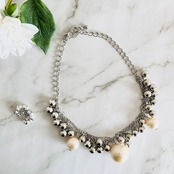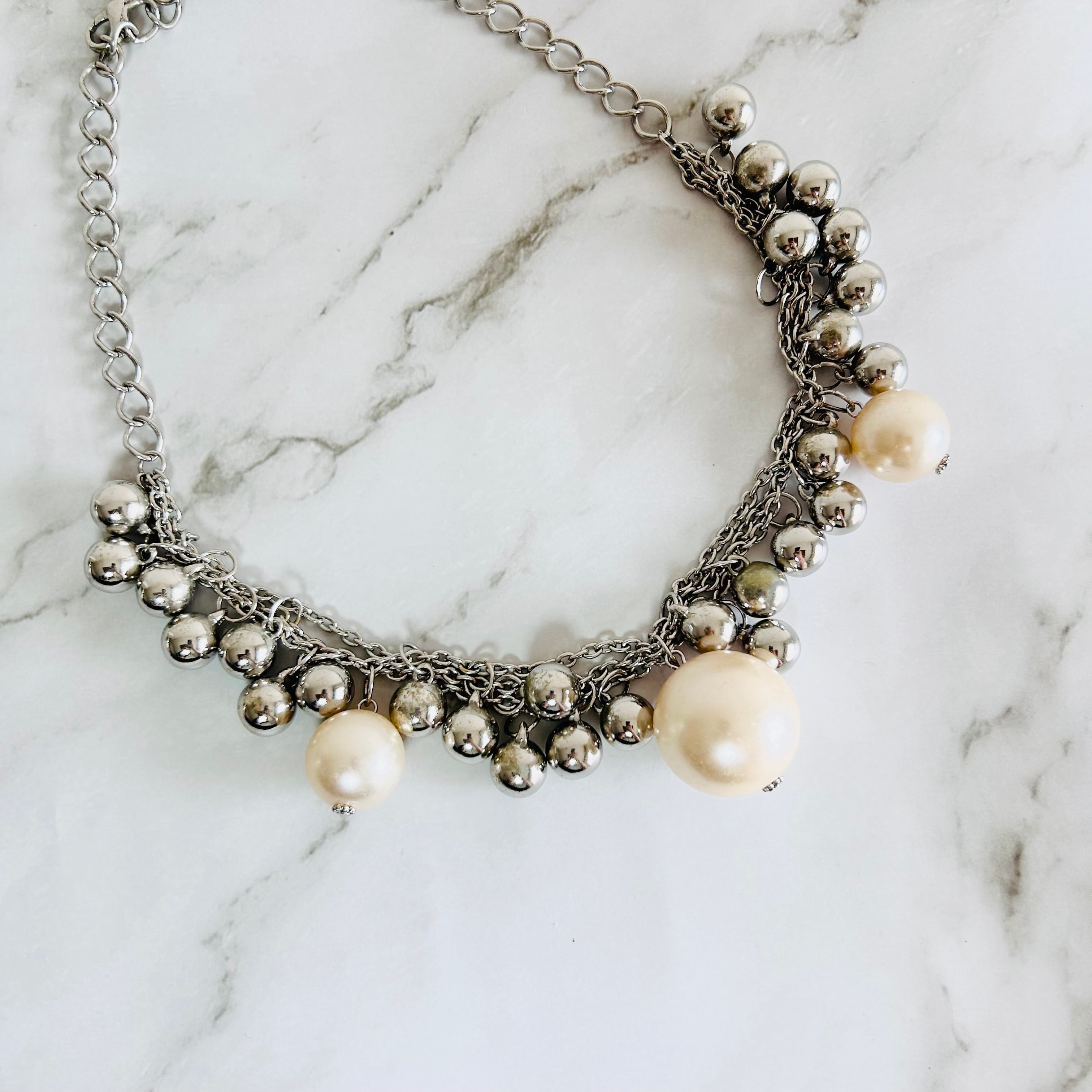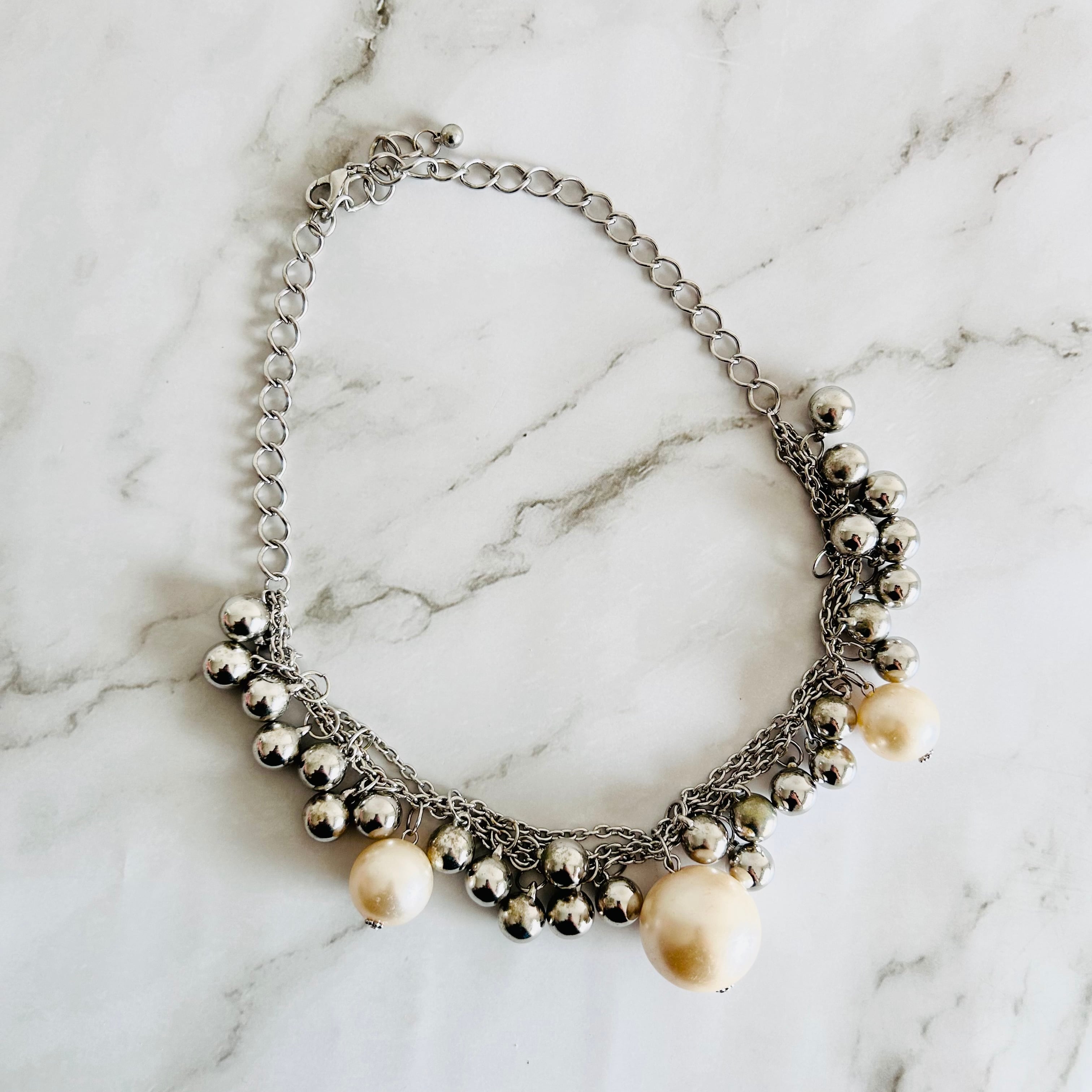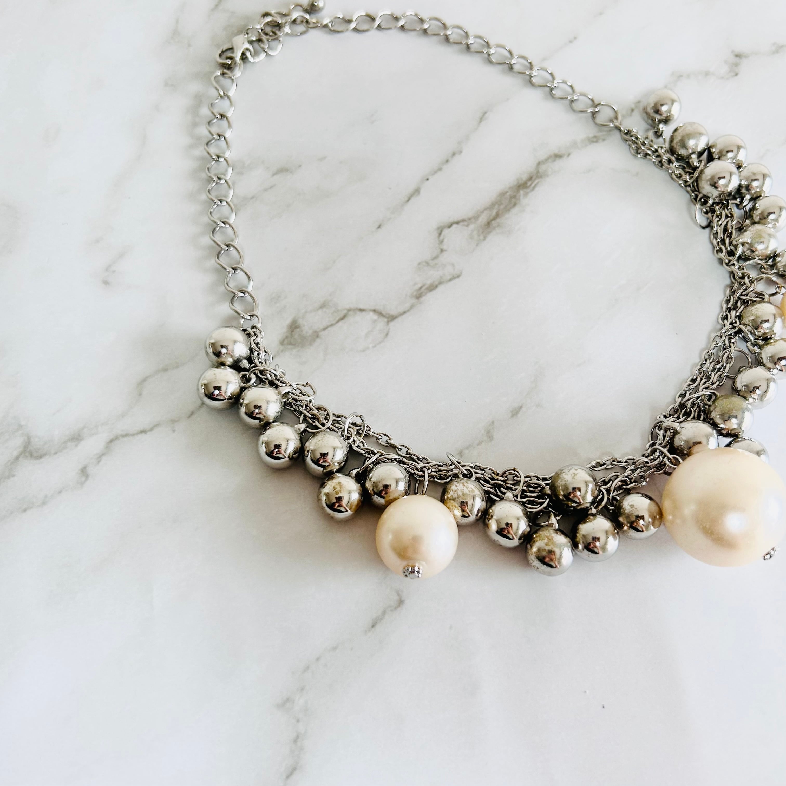 シルバーカラーのチェーンに、メタルボールとアイボリー系カラーのパールボールをデコレートした華やかなネックレスです。