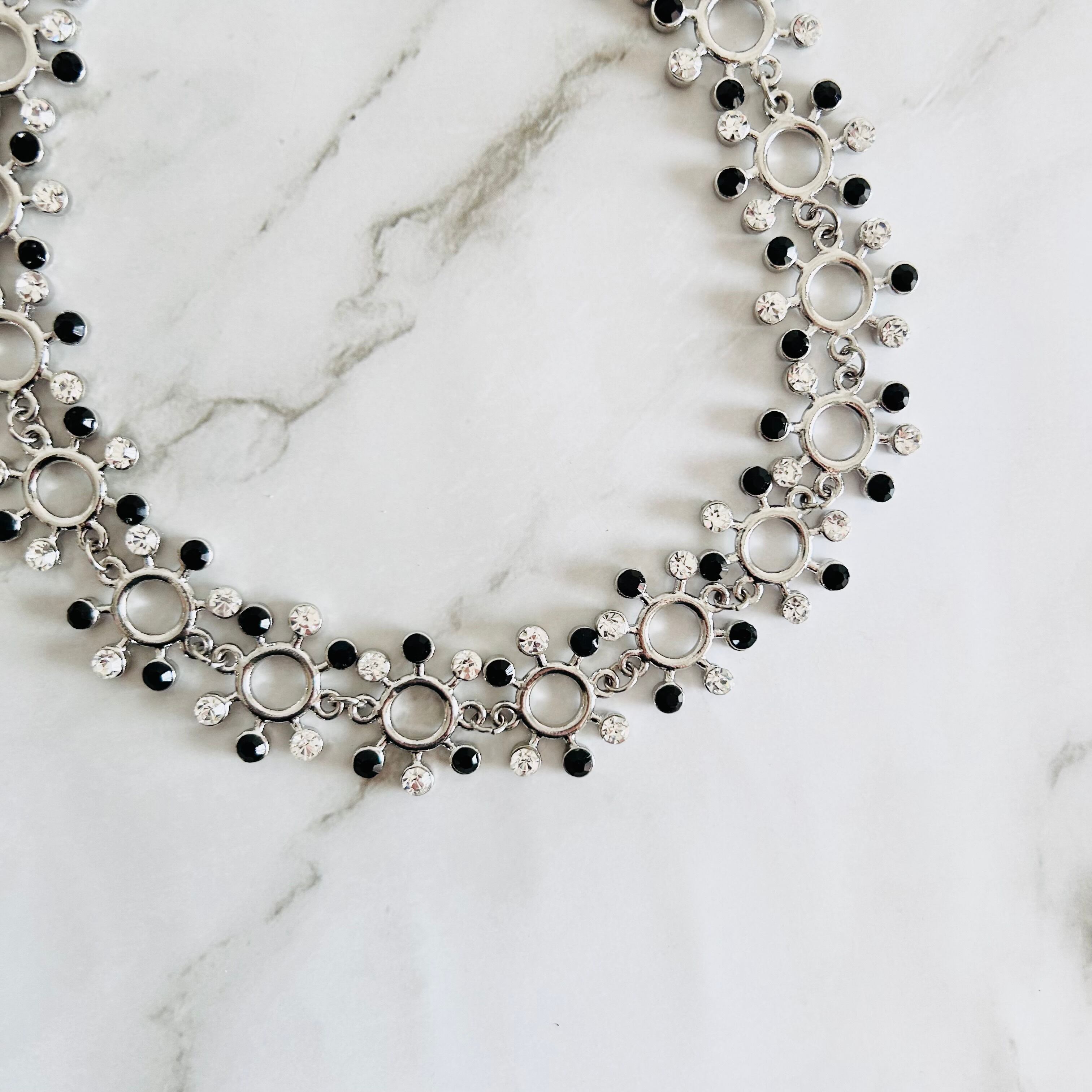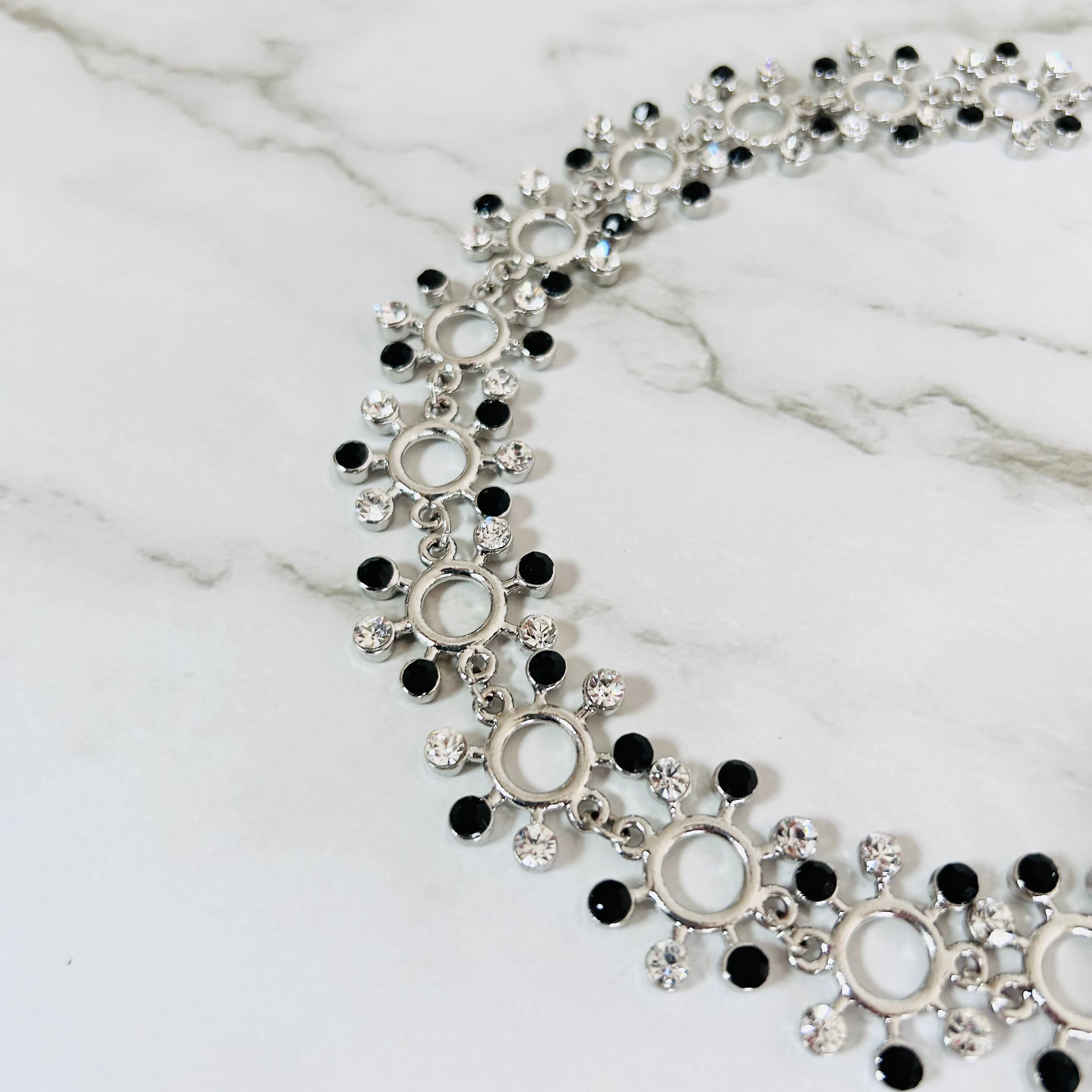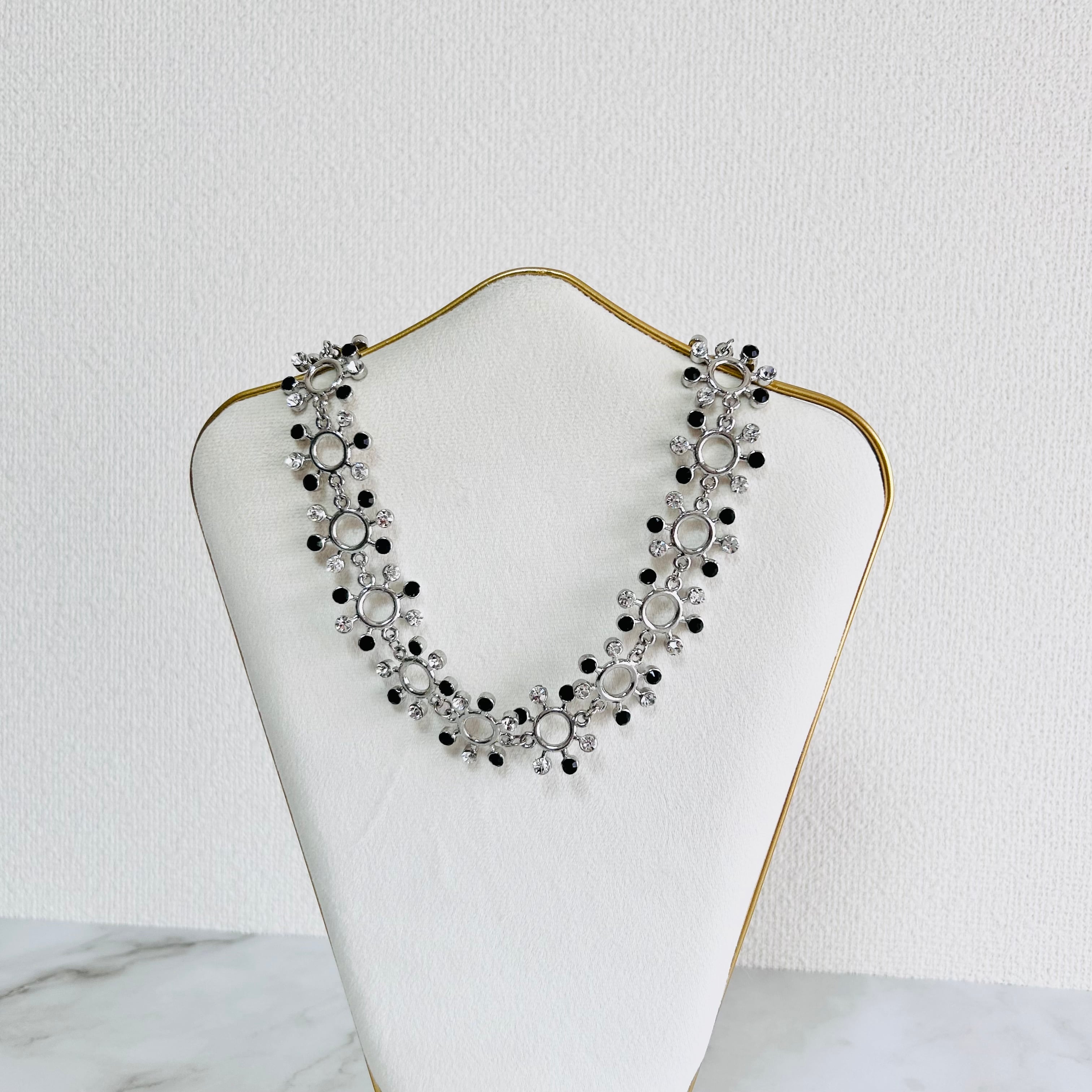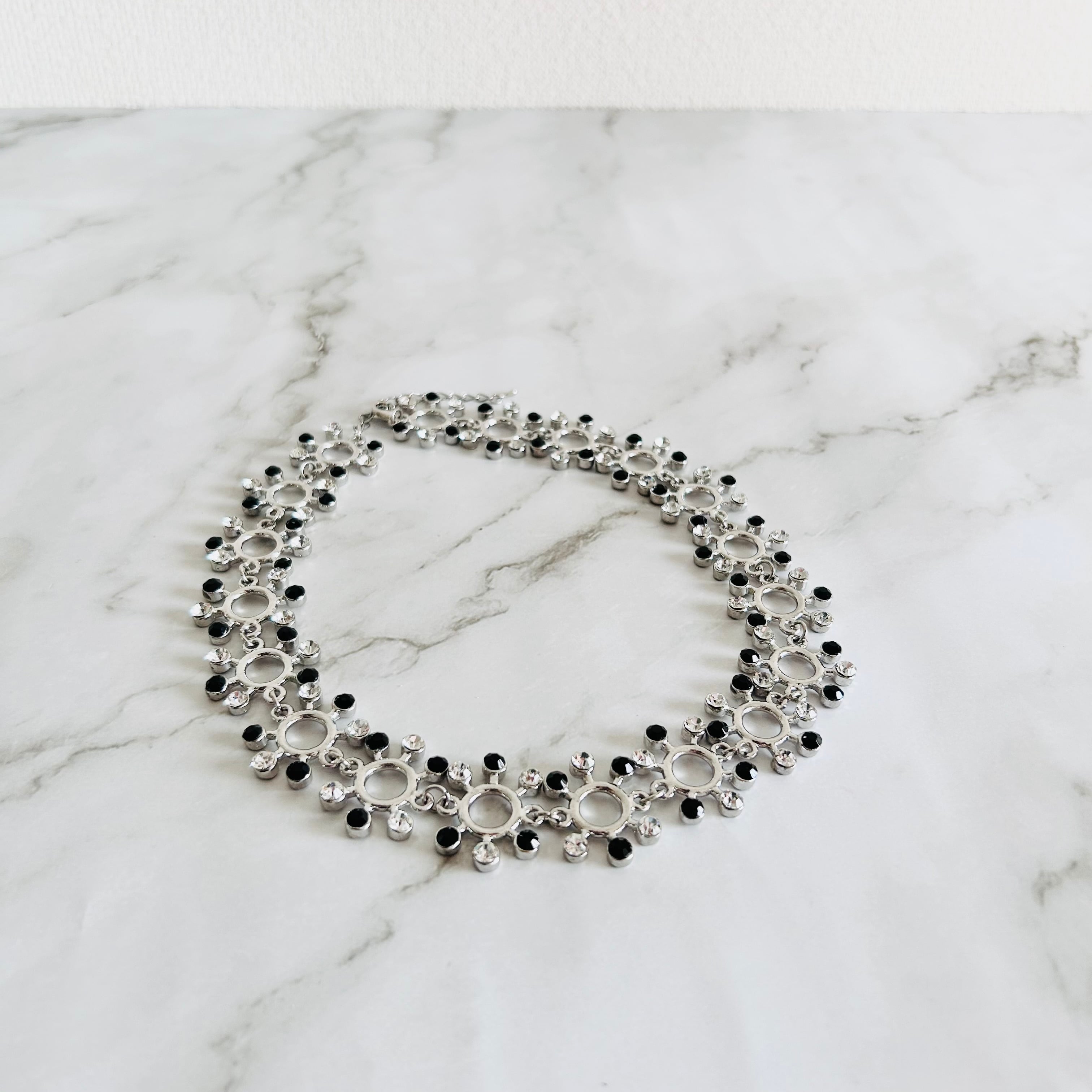 艶やかなシルバーのフレームに、クリアとブラックのラインストーンをリズミカルに並べたデザインネックレスです。