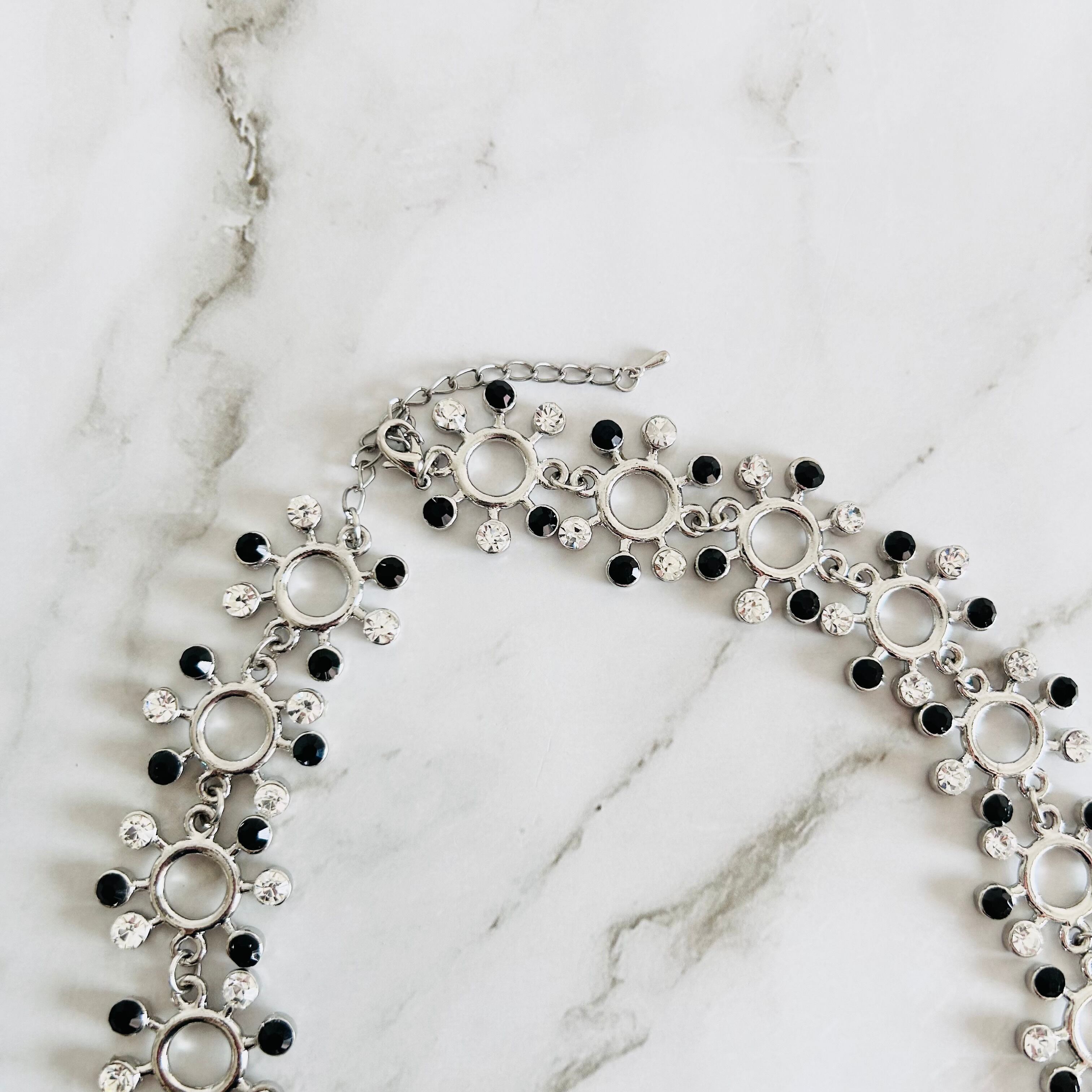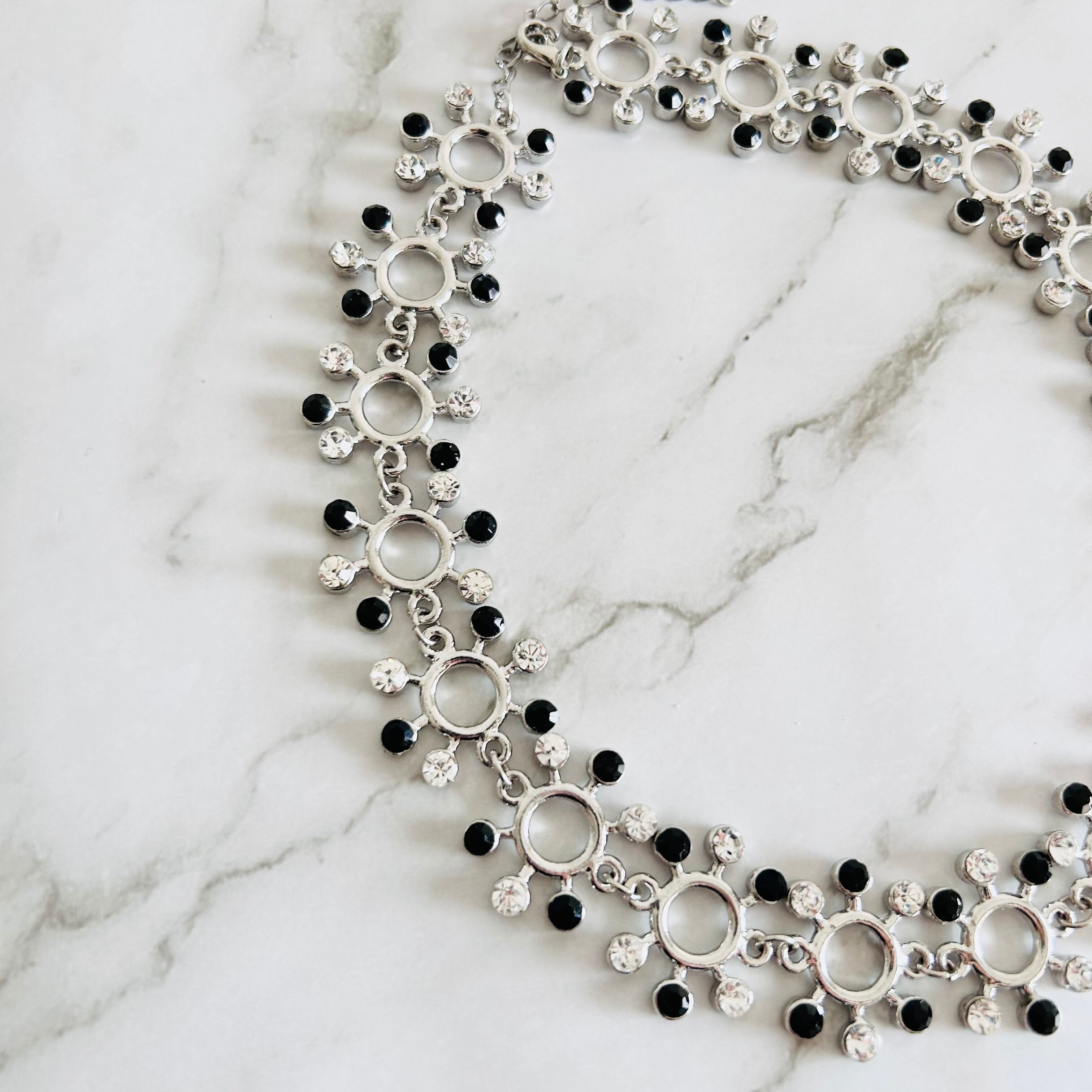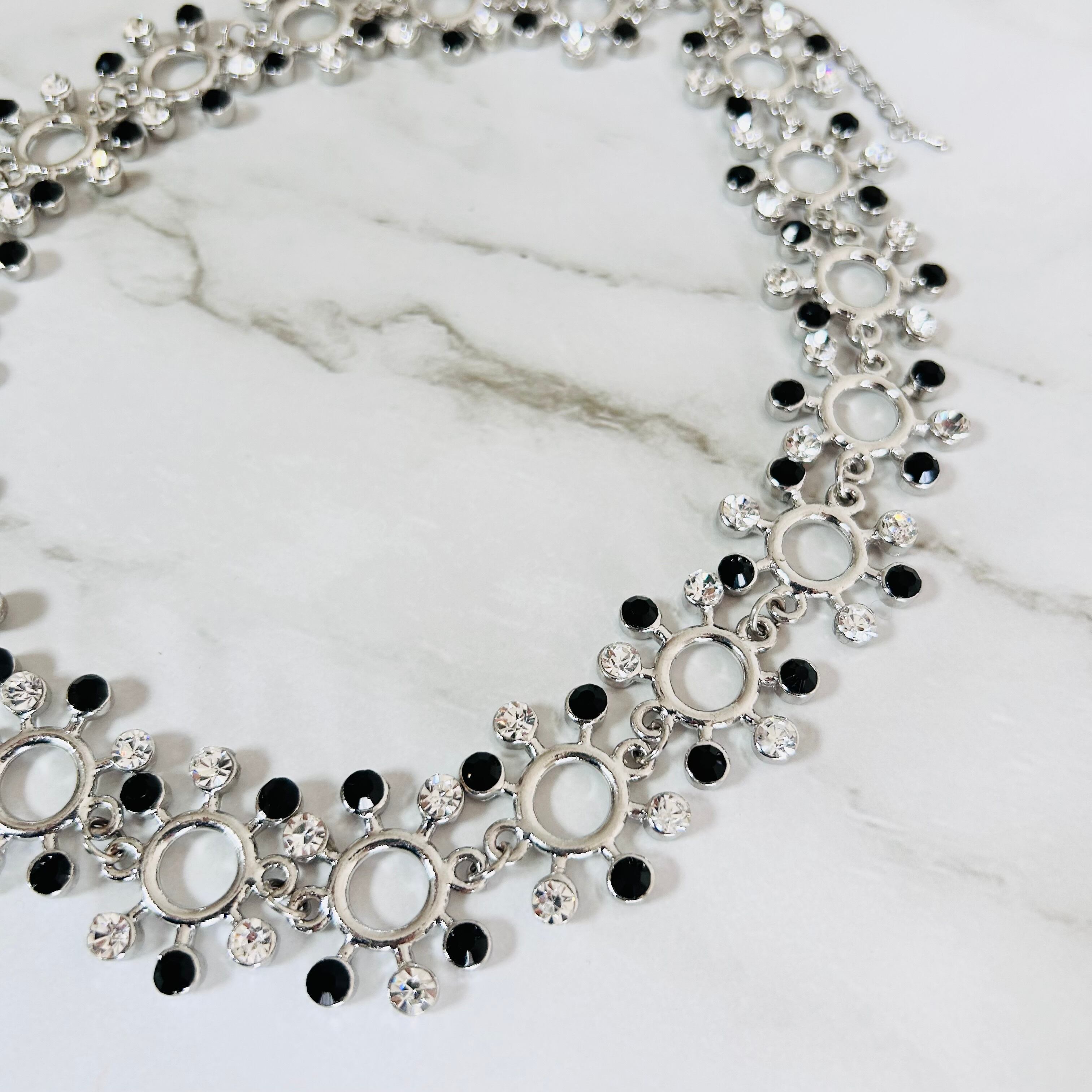 艶やかなシルバーのフレームに、クリアとブラックのラインストーンをリズミカルに並べたデザインネックレスです。