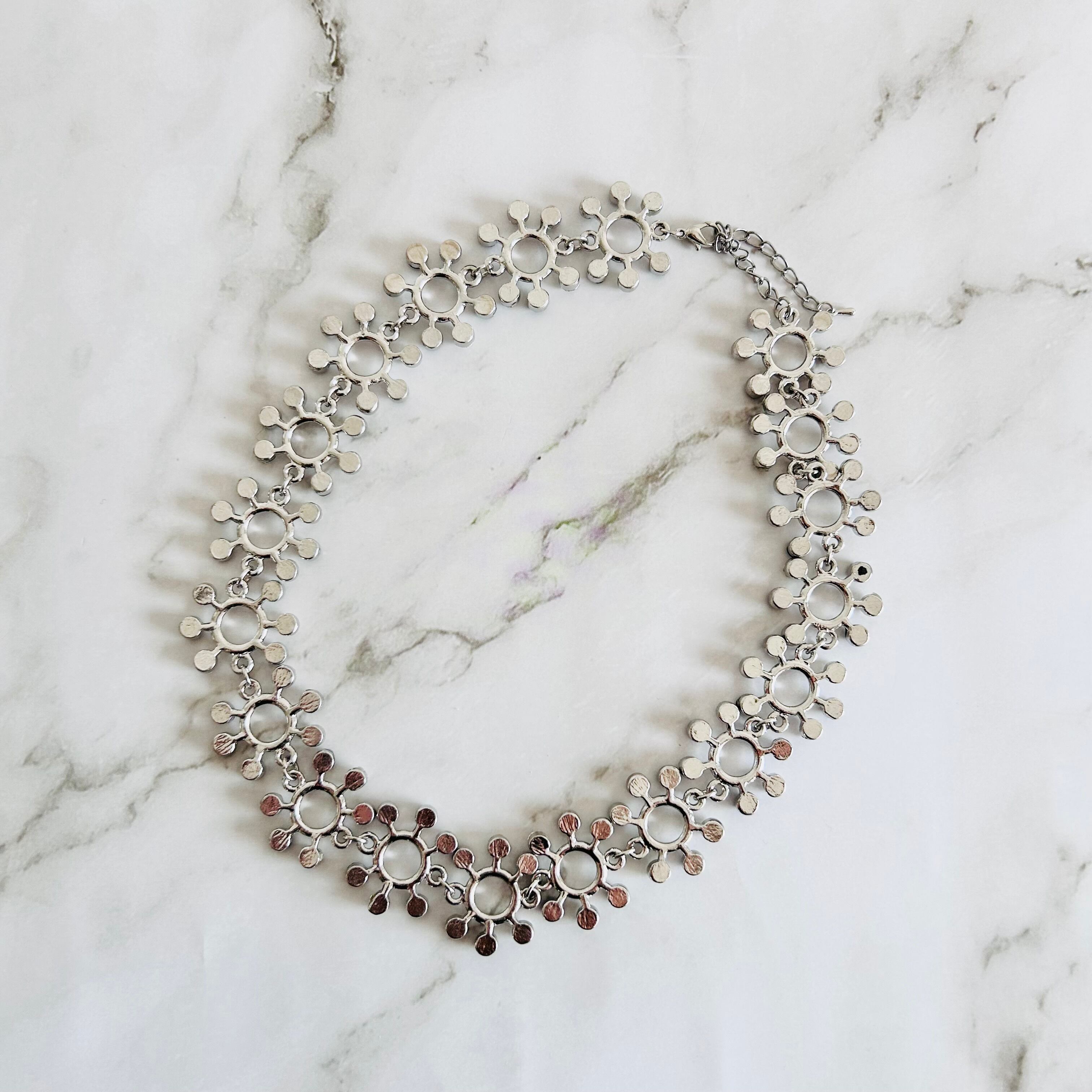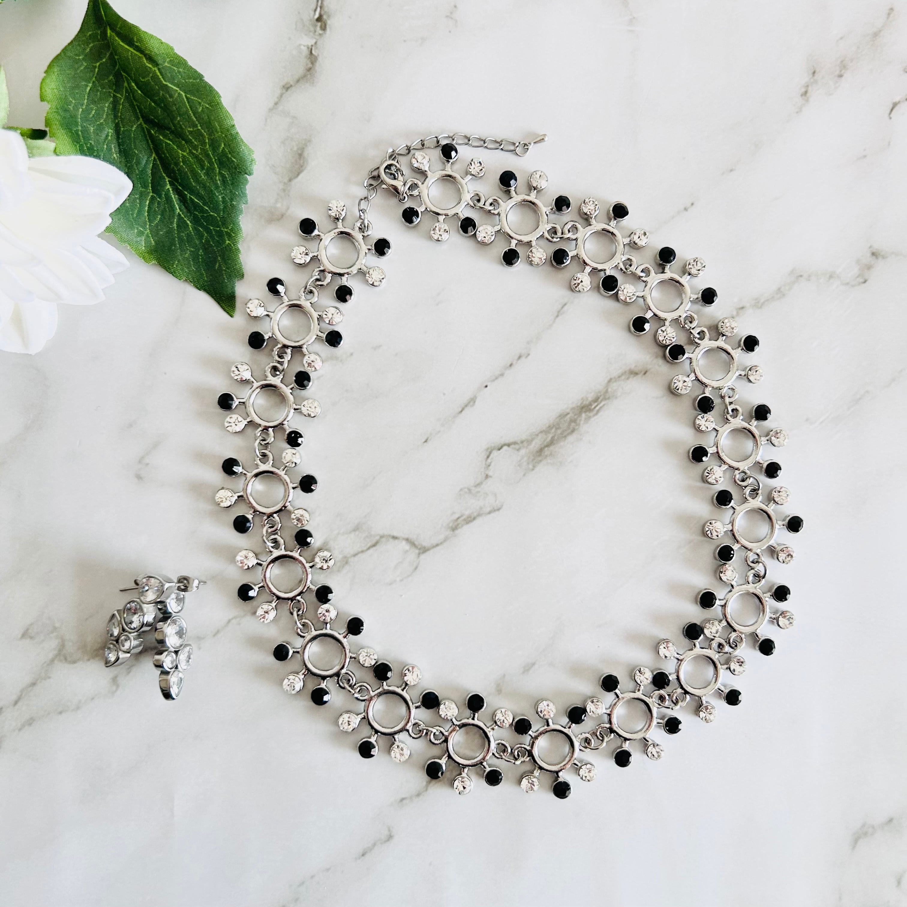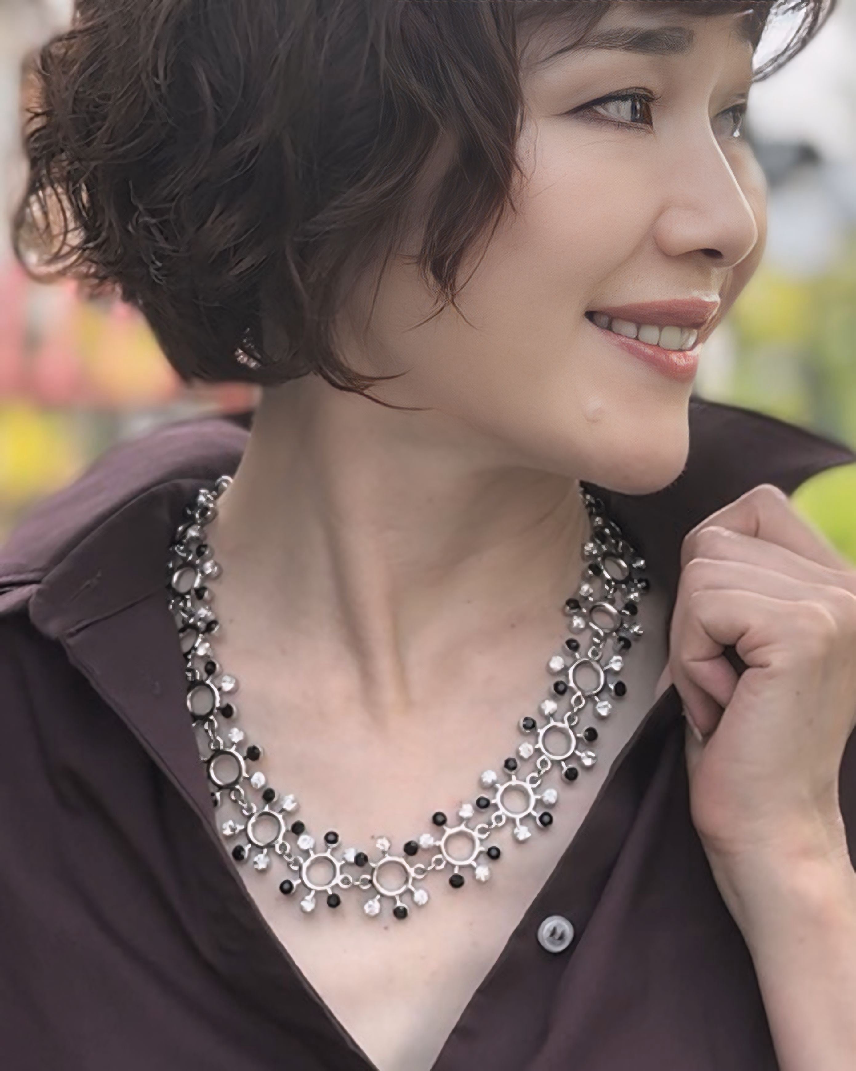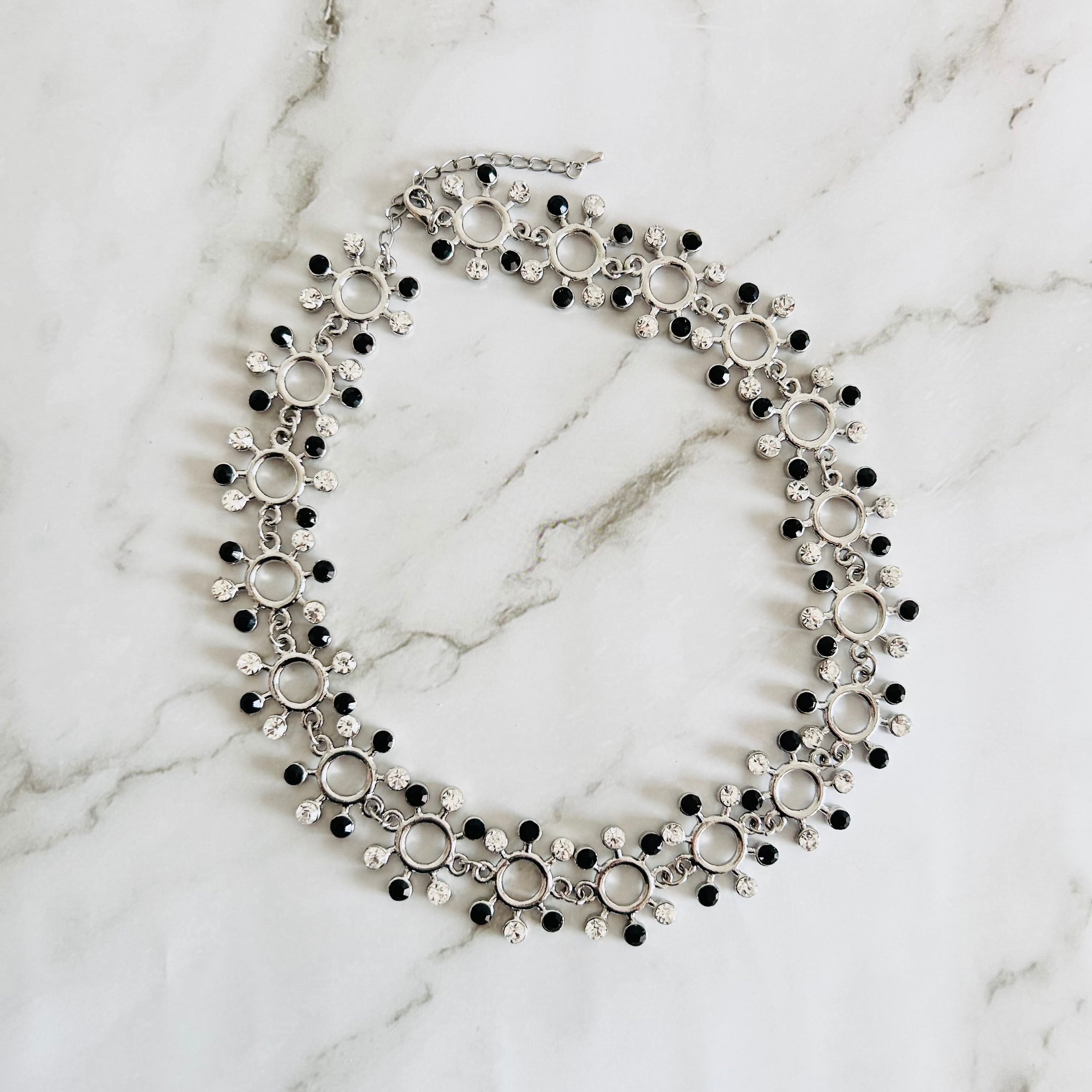 艶やかなシルバーのフレームに、クリアとブラックのラインストーンをリズミカルに並べたデザインネックレスです。