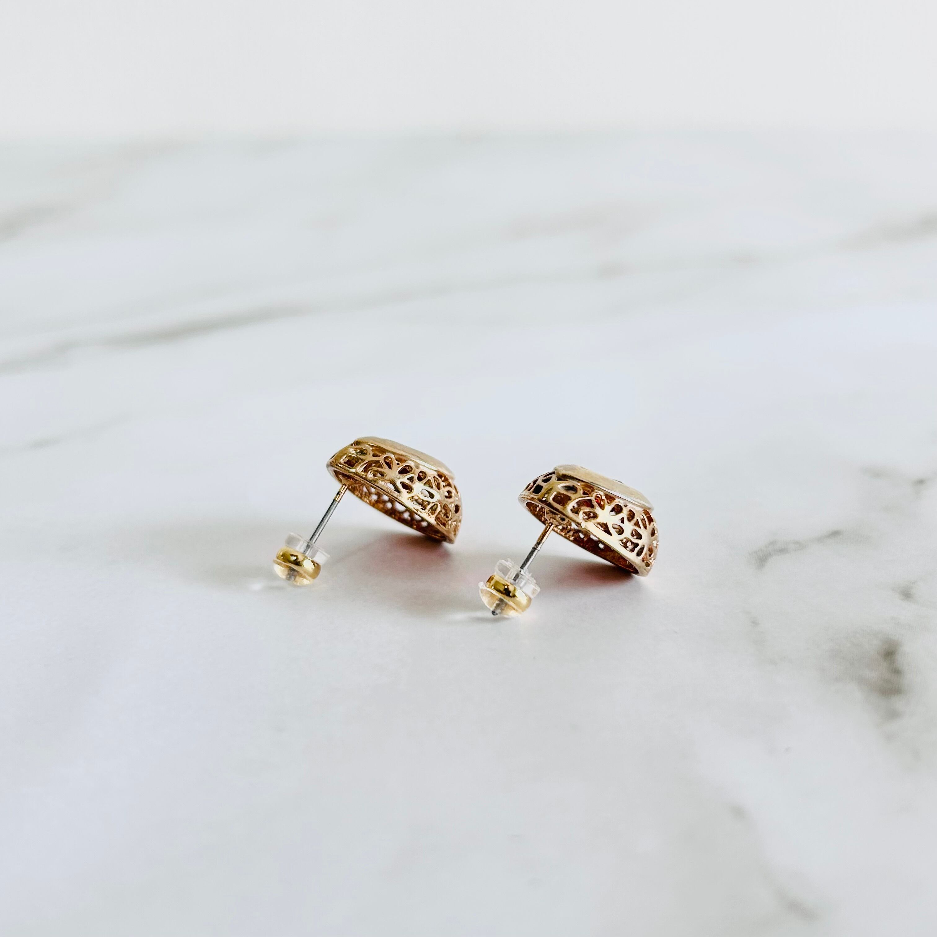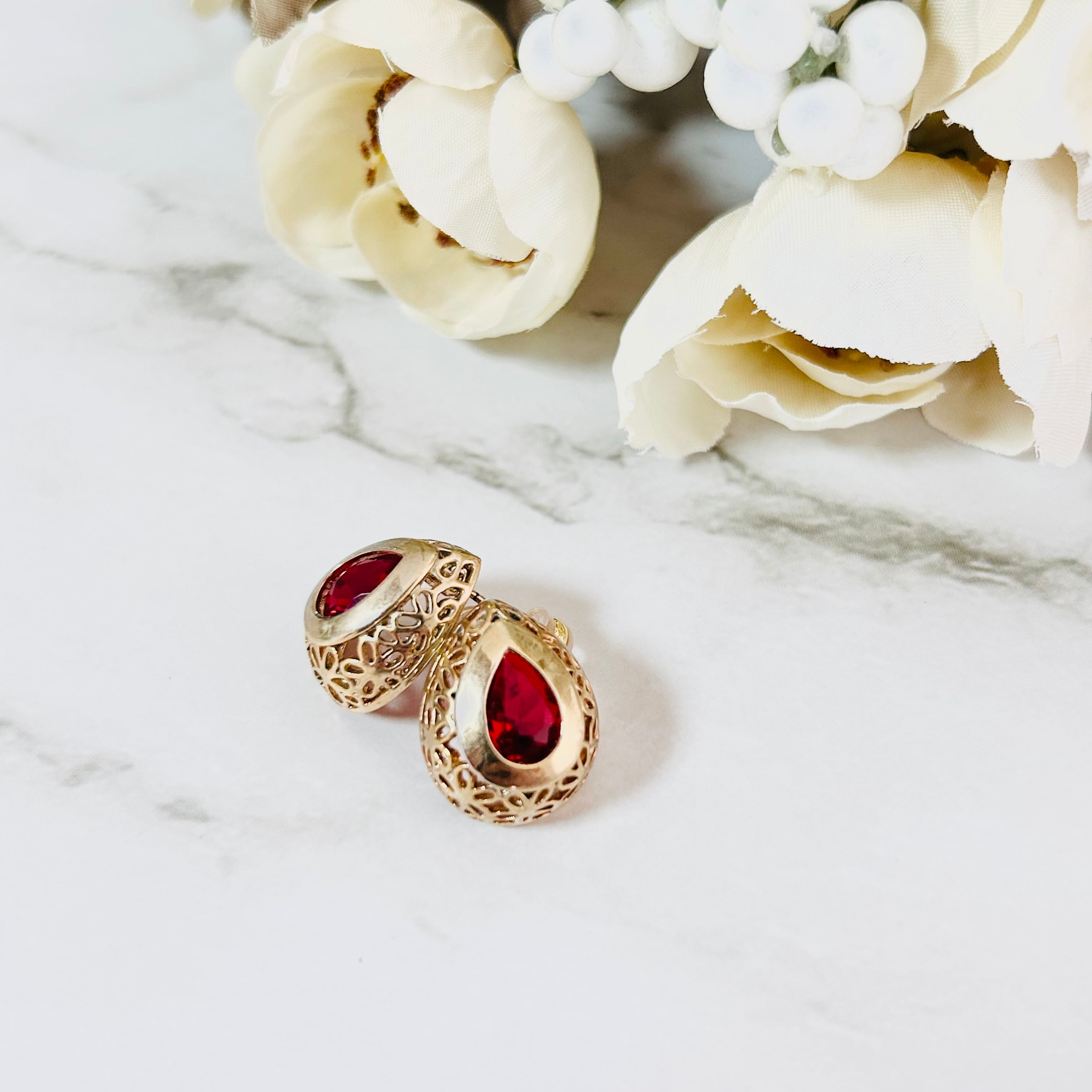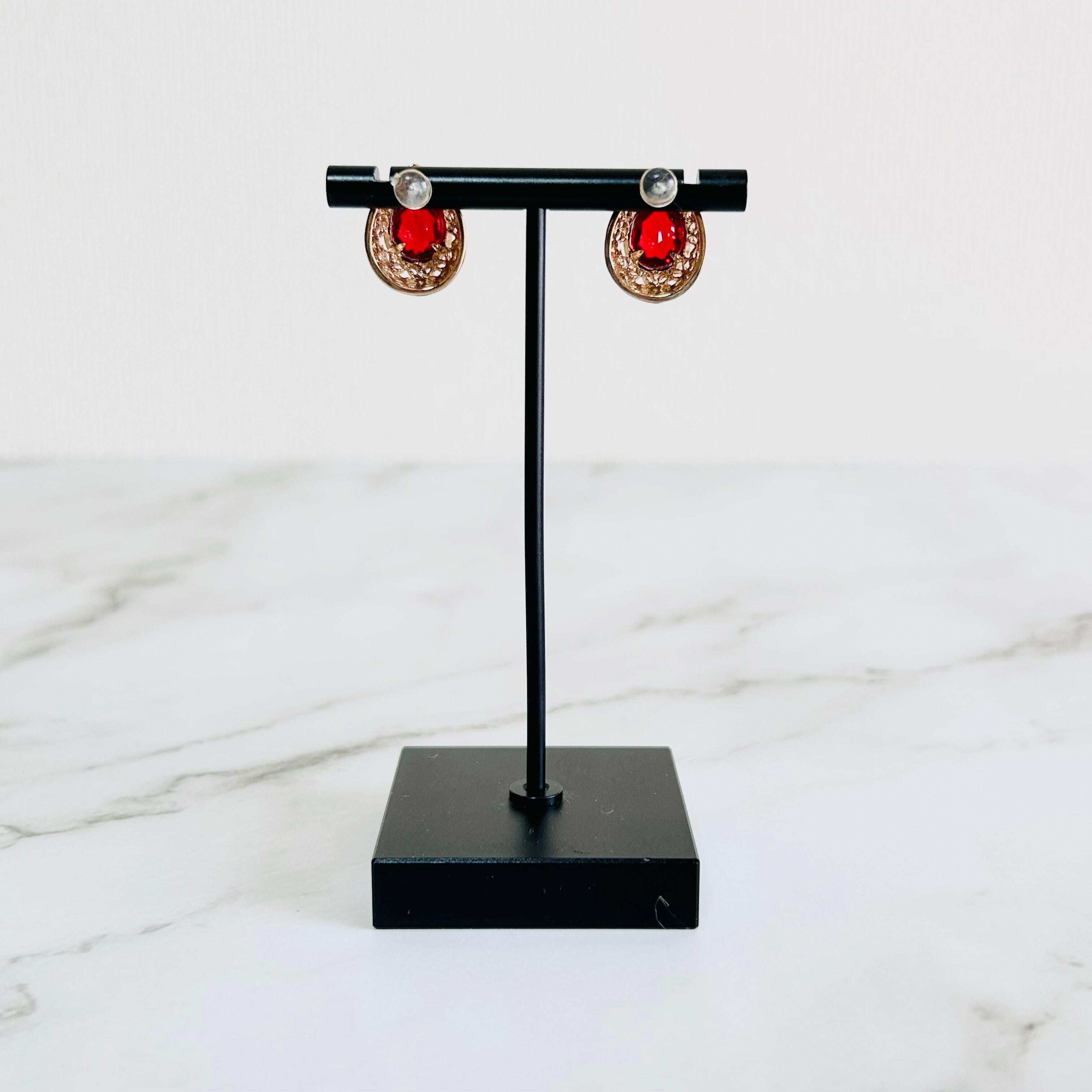 繊細な透かし模様のアンティークゴールドフレームに、深みのあるルビーレッドのクリスタルストーンをあしらったエレガントなピアスです。
