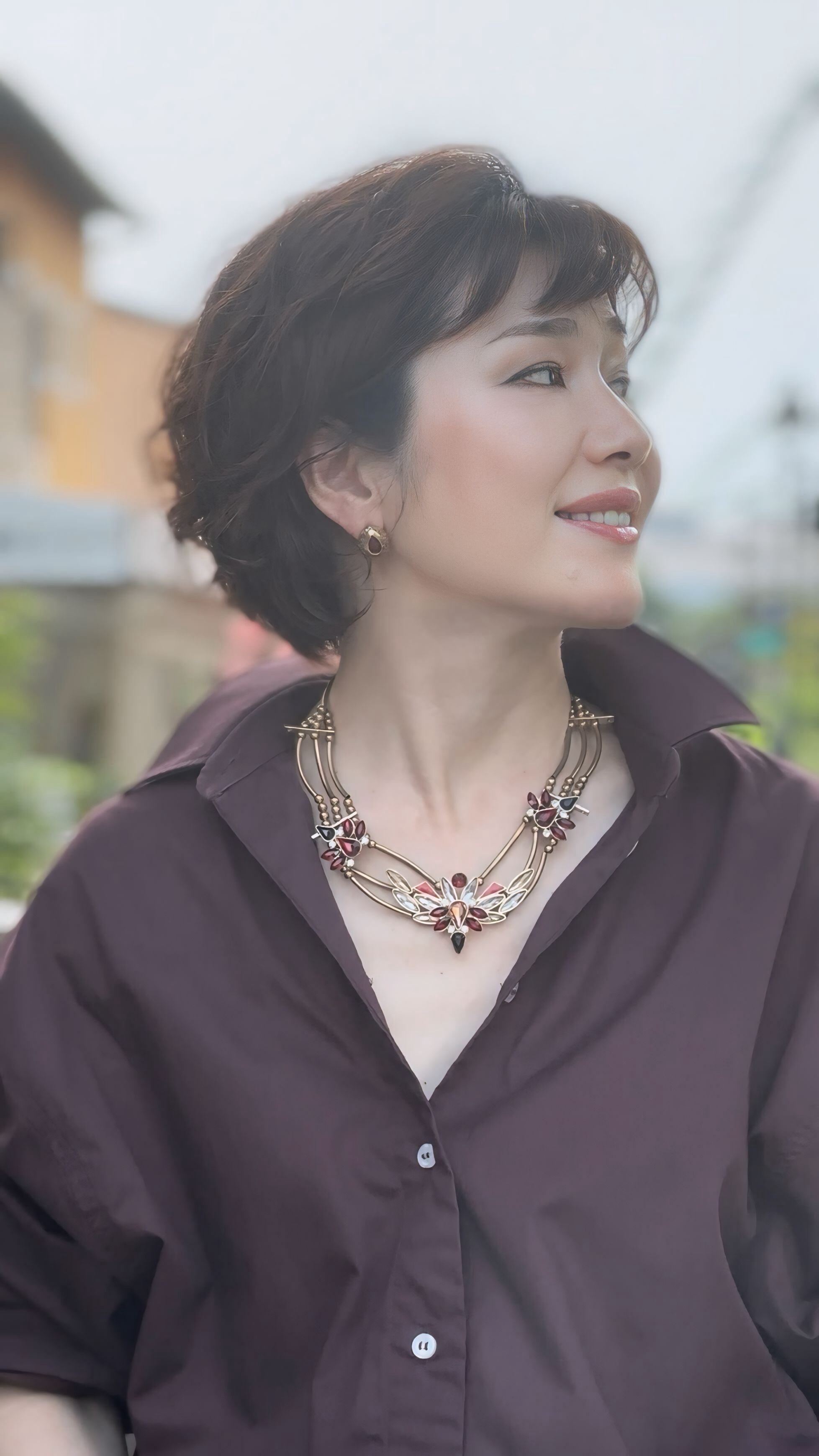光を受けるたびに赤い煌めきが際立ち、クラシカルでありながらも女性らしい華やかさを演出してくれます。