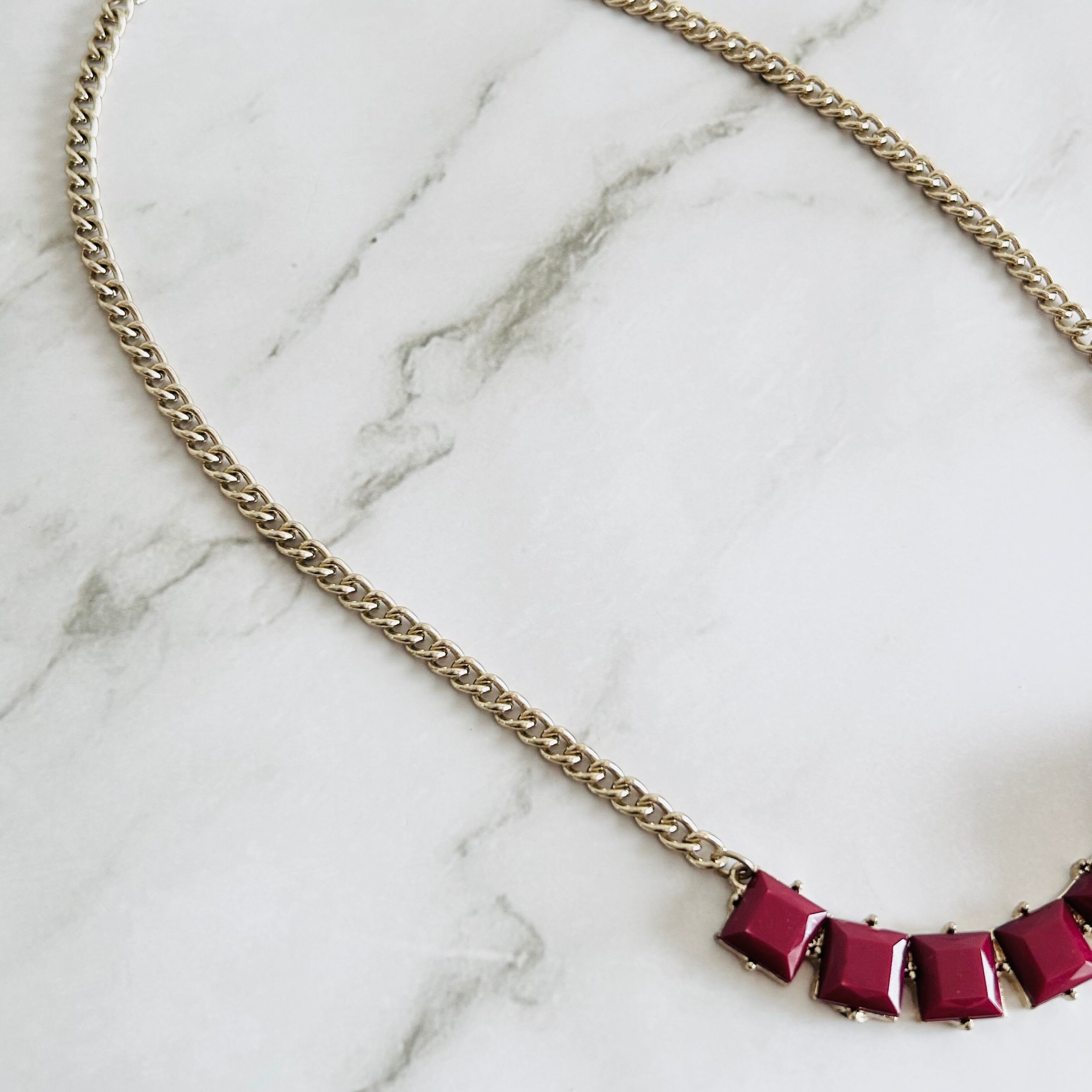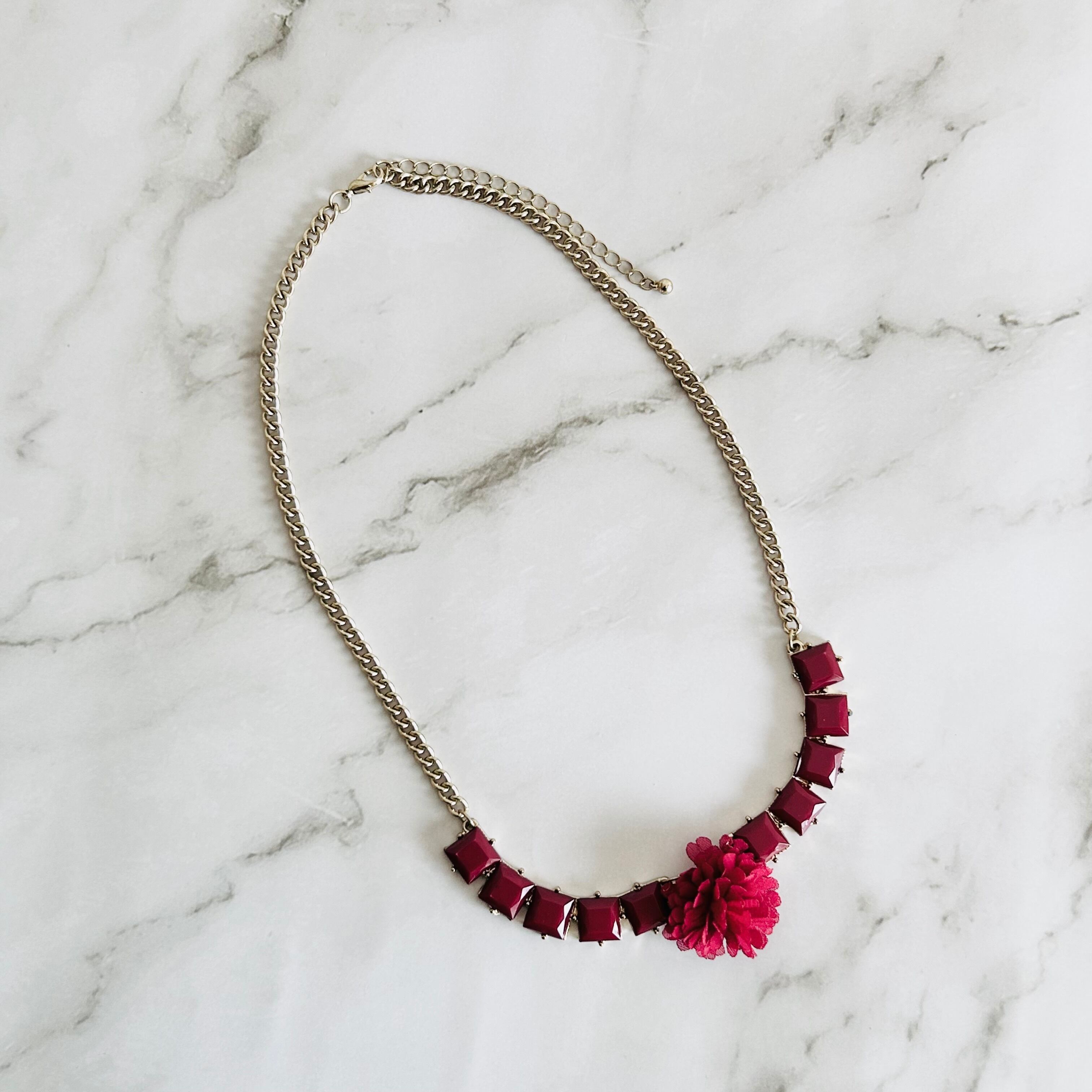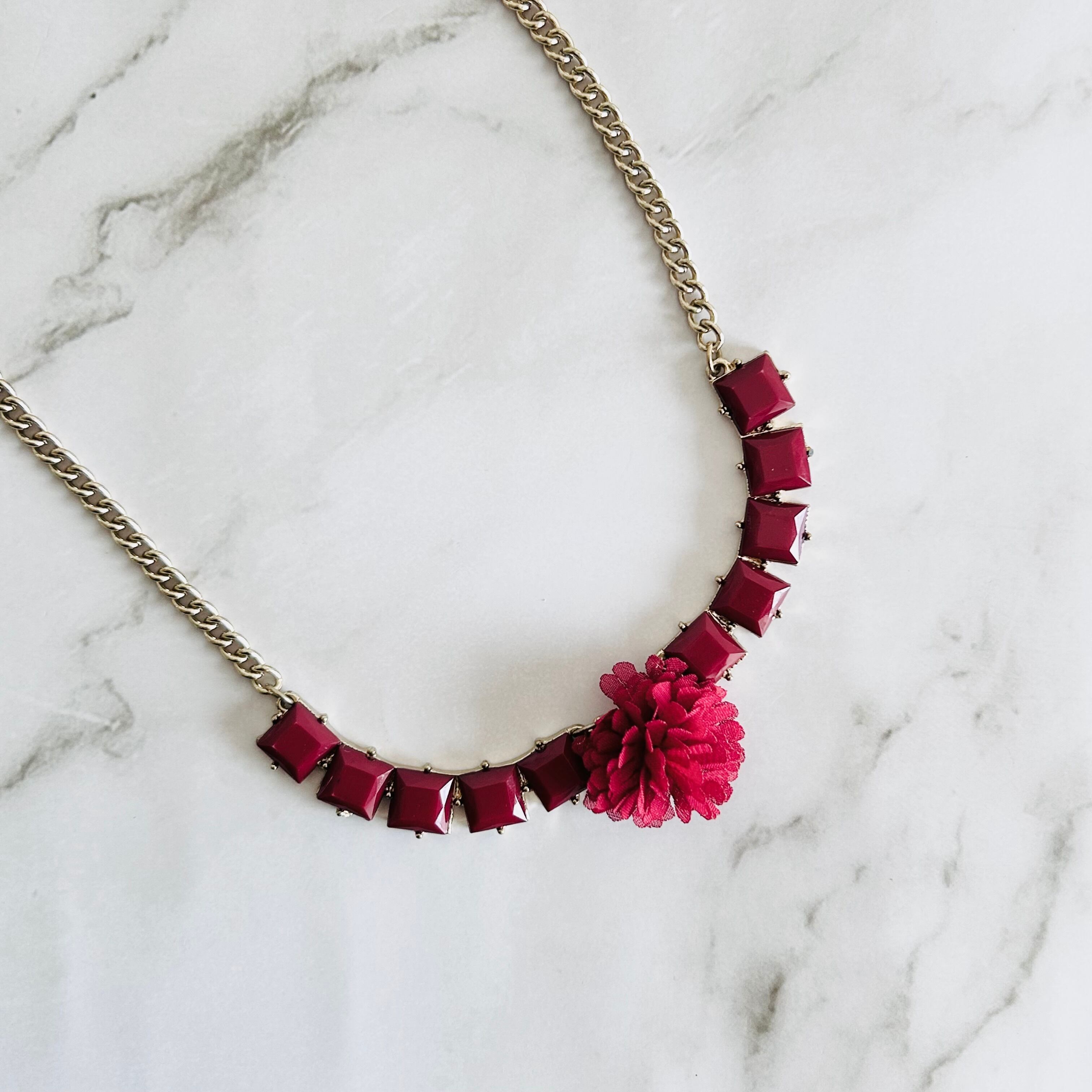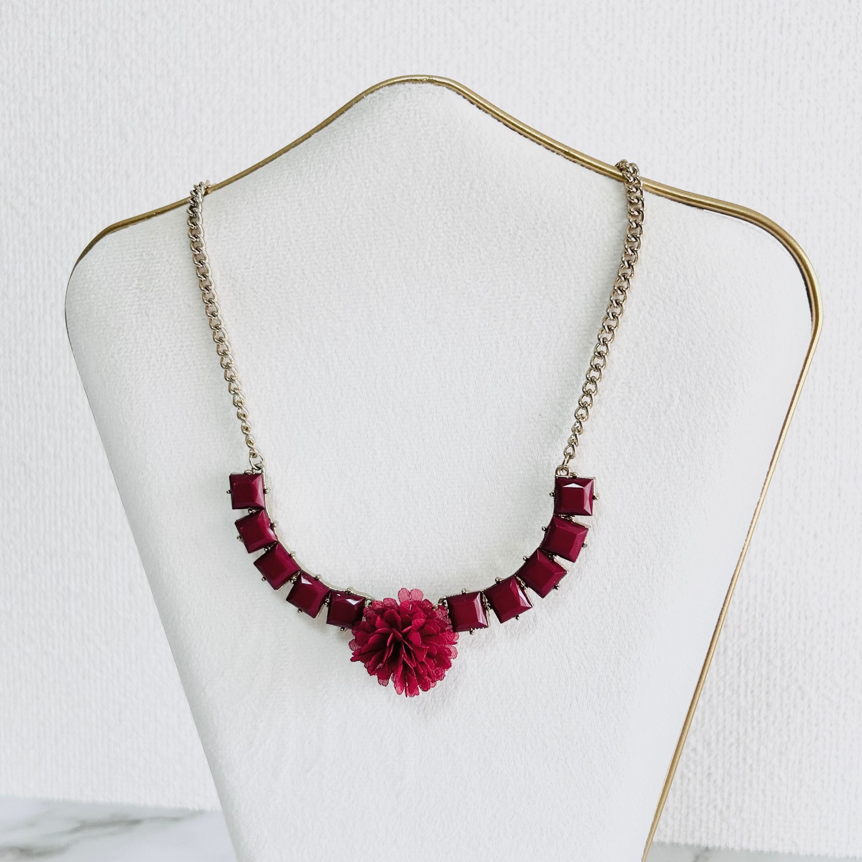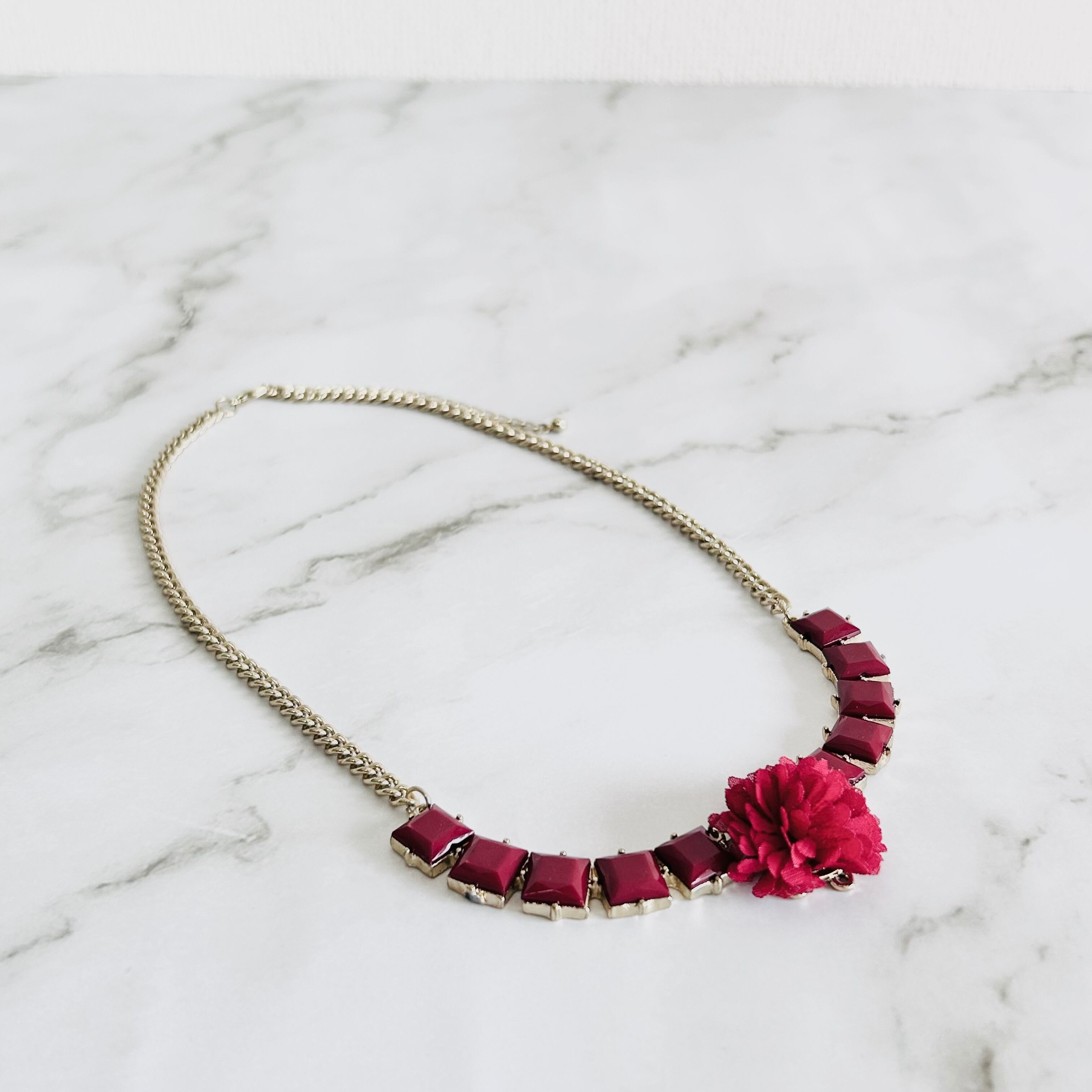 ワインレッドのスクエアストーンを連ね、中央には布製のフラワーモチーフをあしらった、印象的でフェミニンなネックレスです。