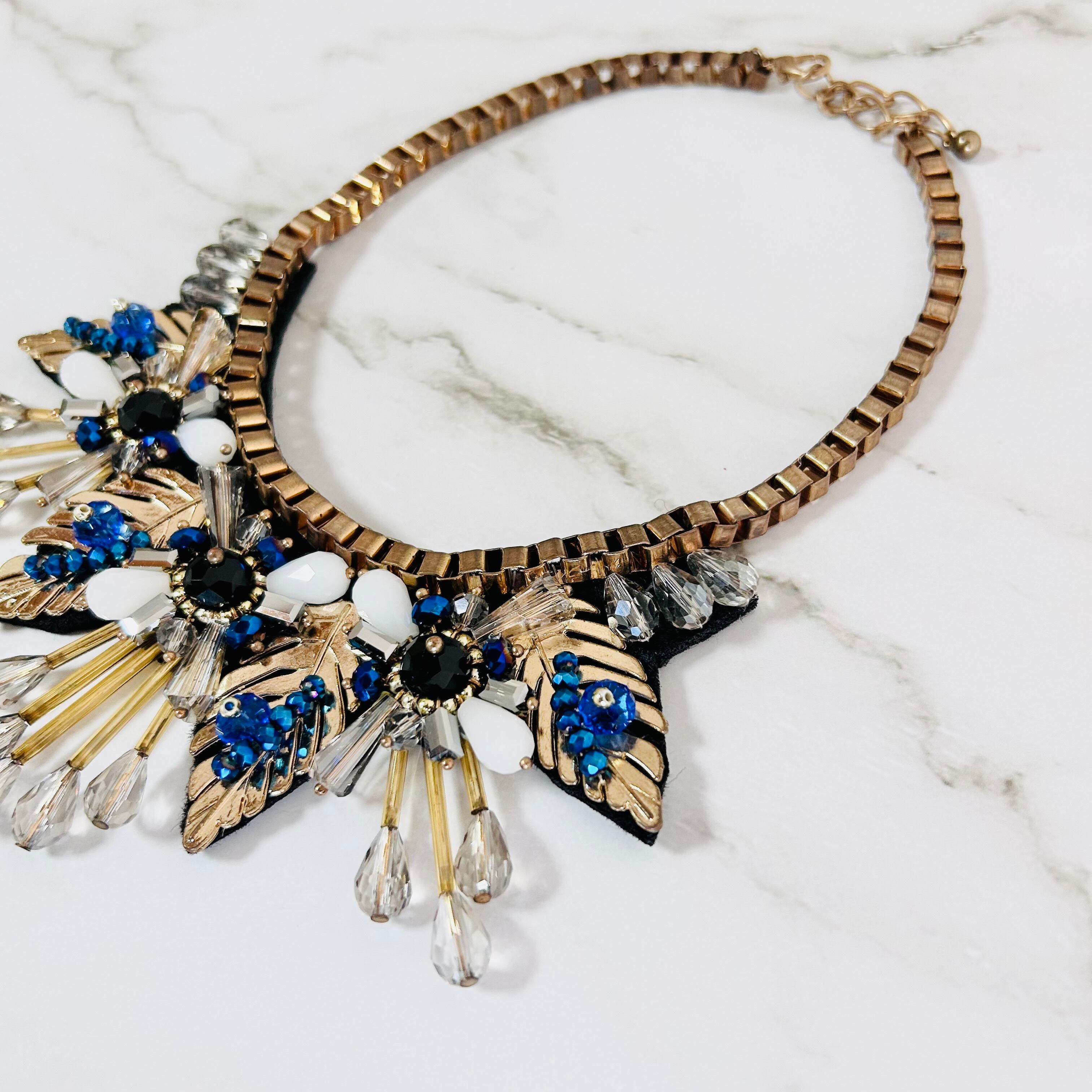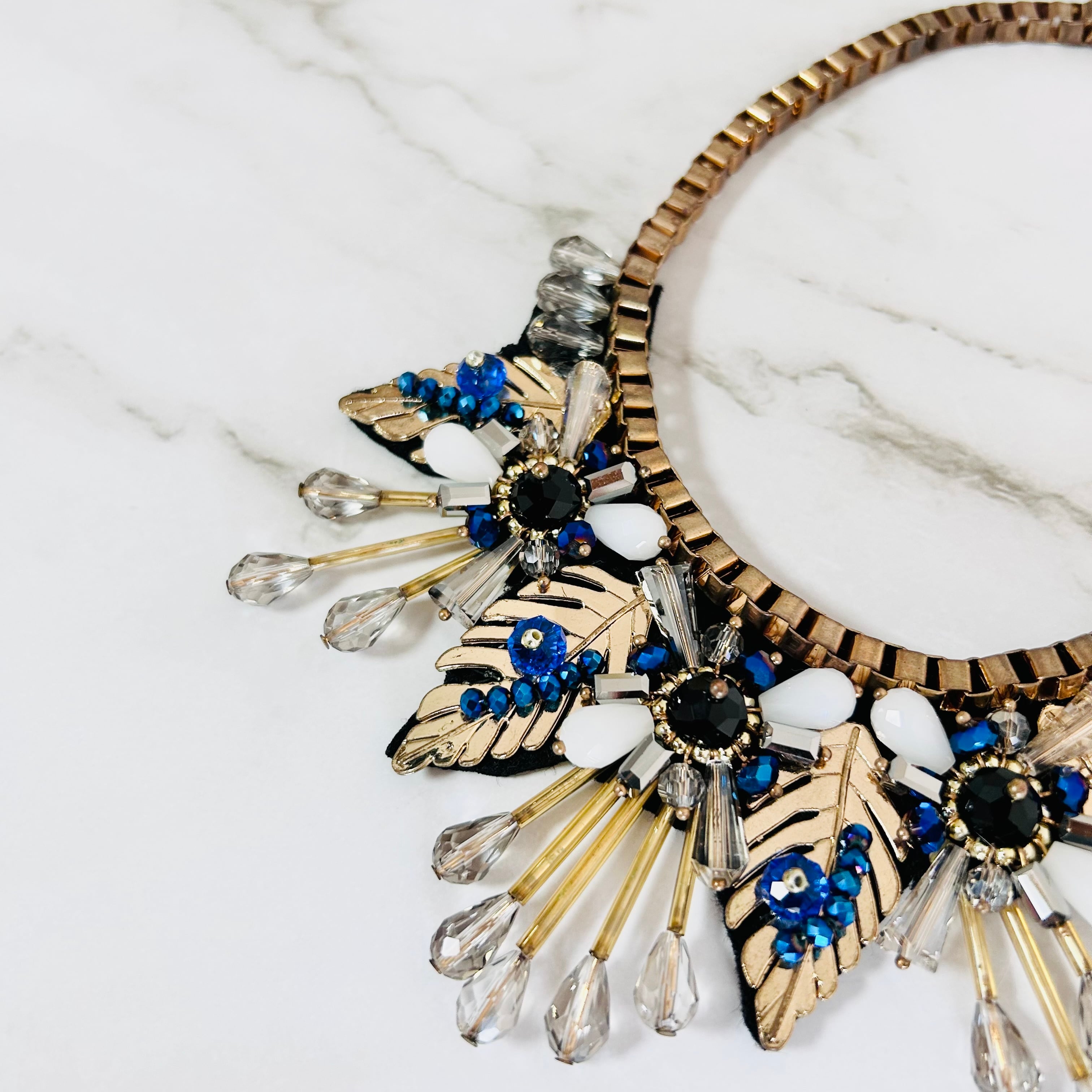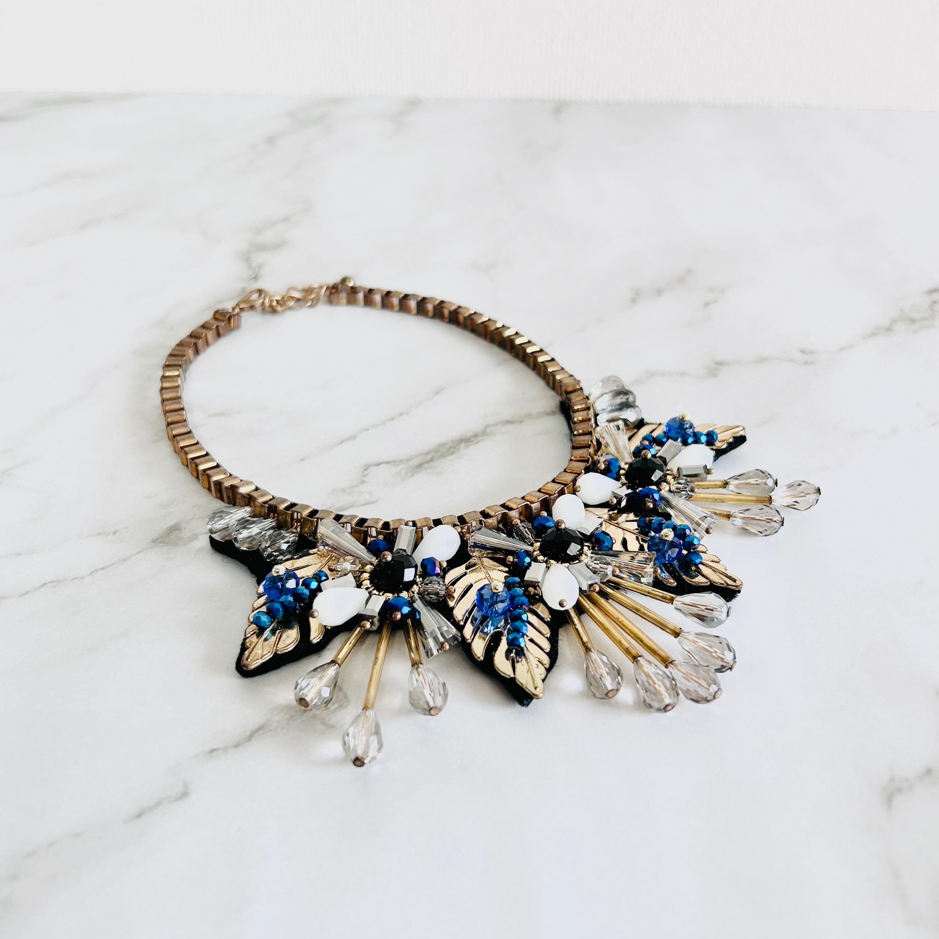 ブルーとホワイトのビーズがアクセントとなり、透明感のあるしずく型パーツが動くたびに揺れて、胸元を華やかに彩ります。