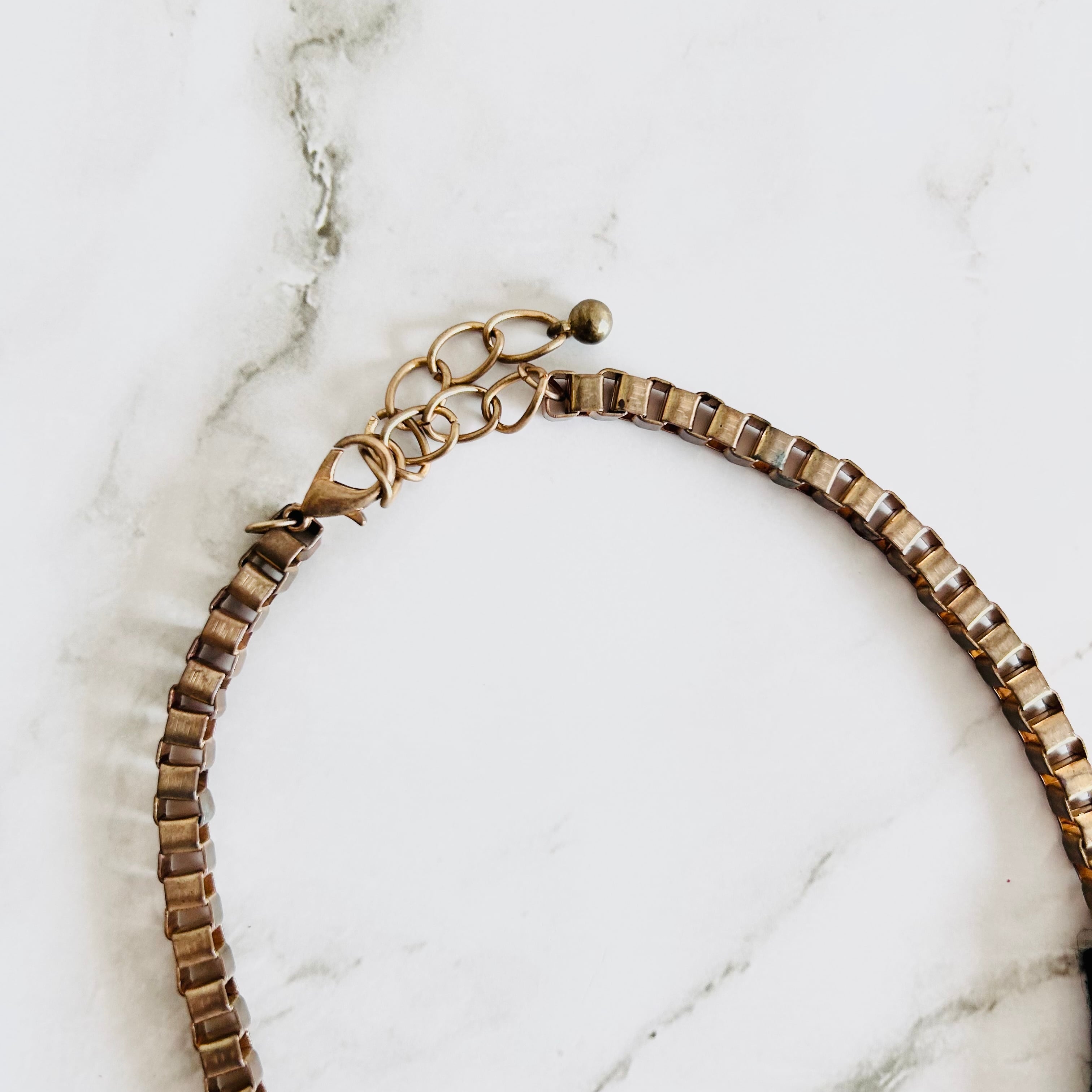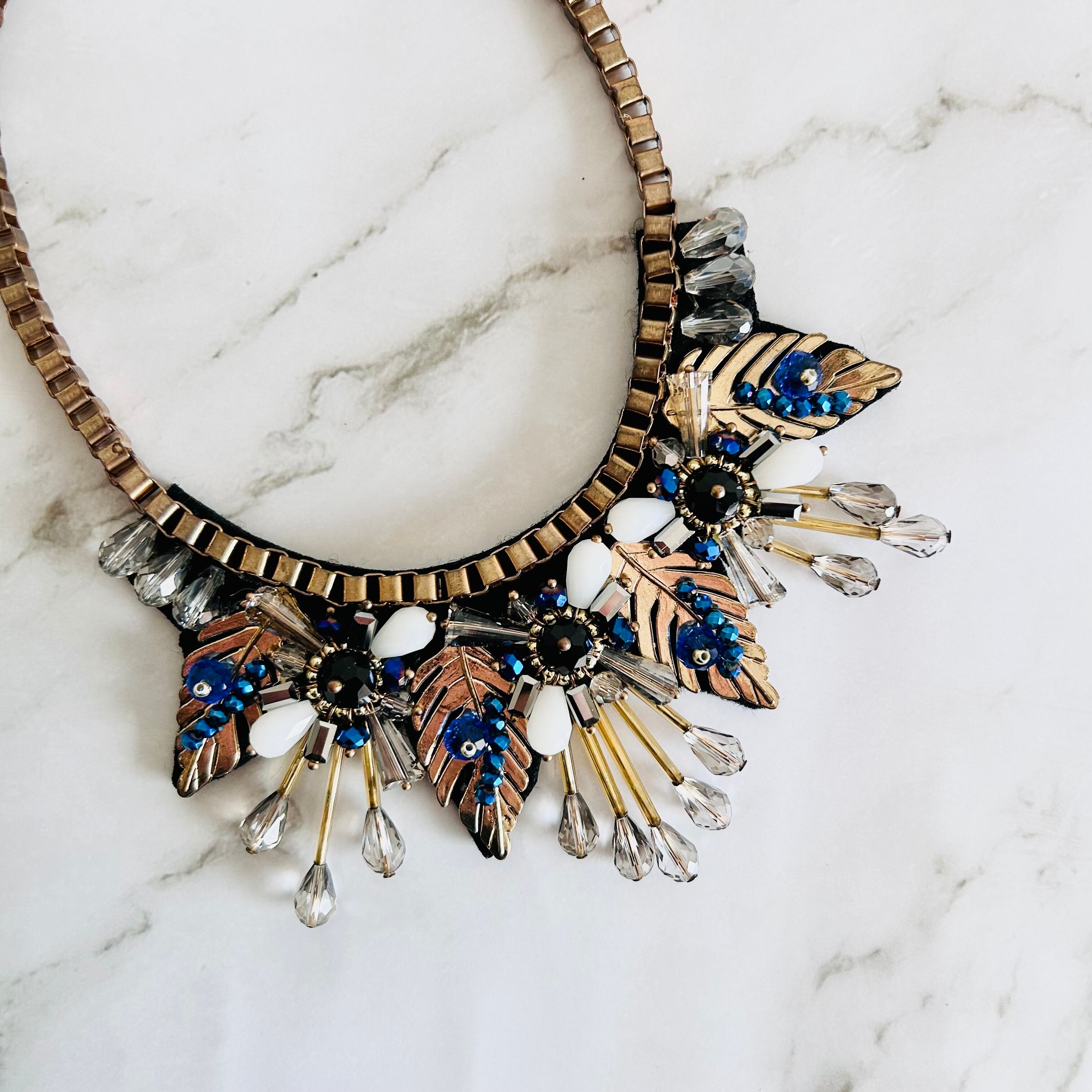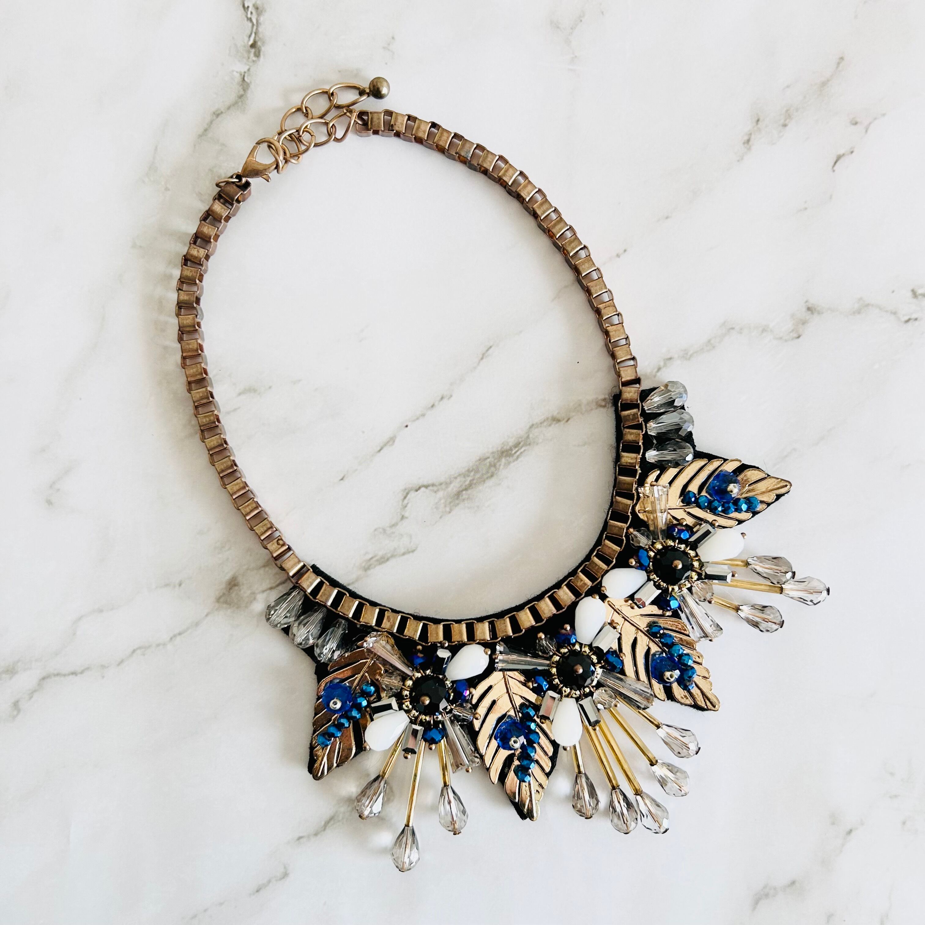 アンティークゴールドのチェーンに、リーフモチーフとビジュービーズを組み合わせた存在感のあるネックレスです。