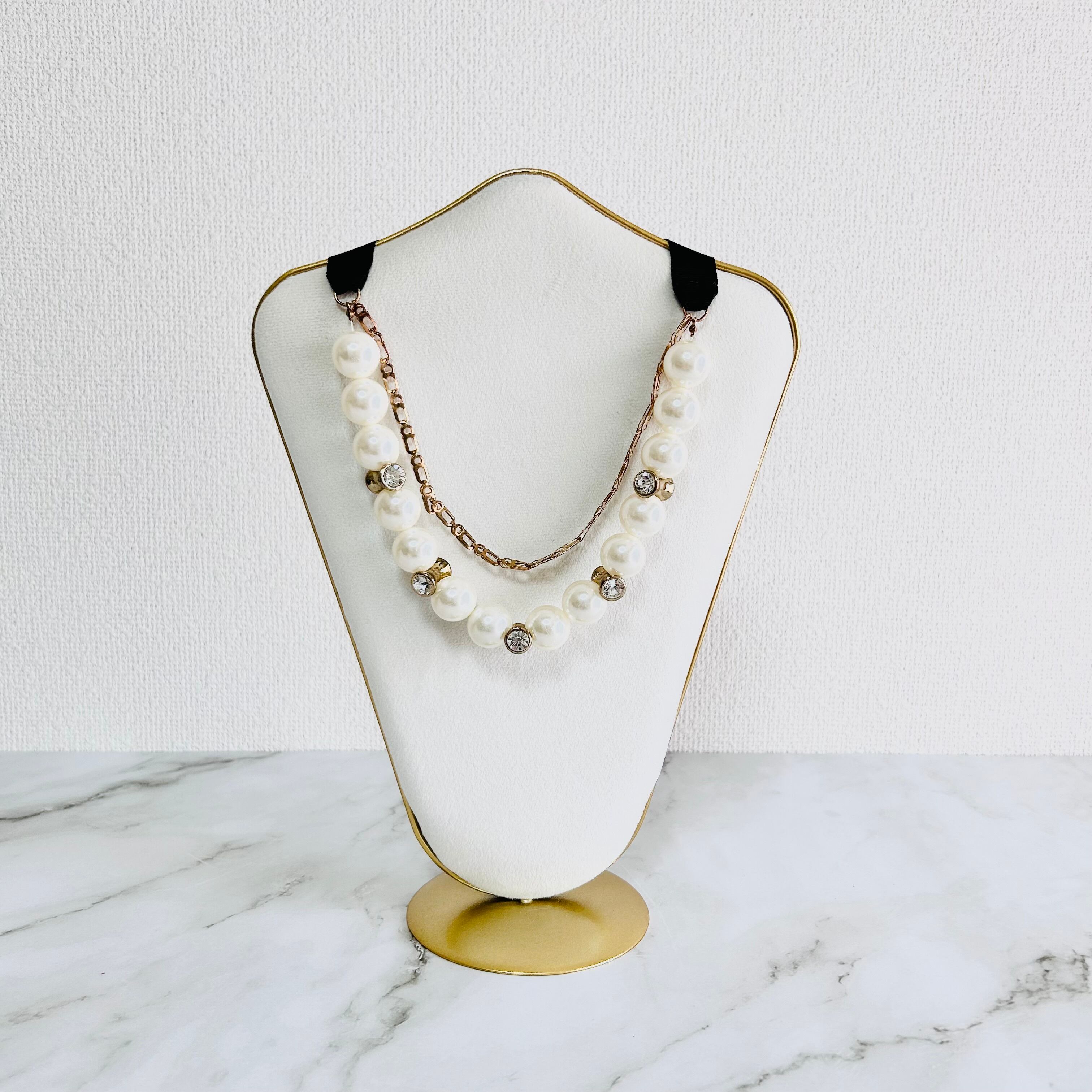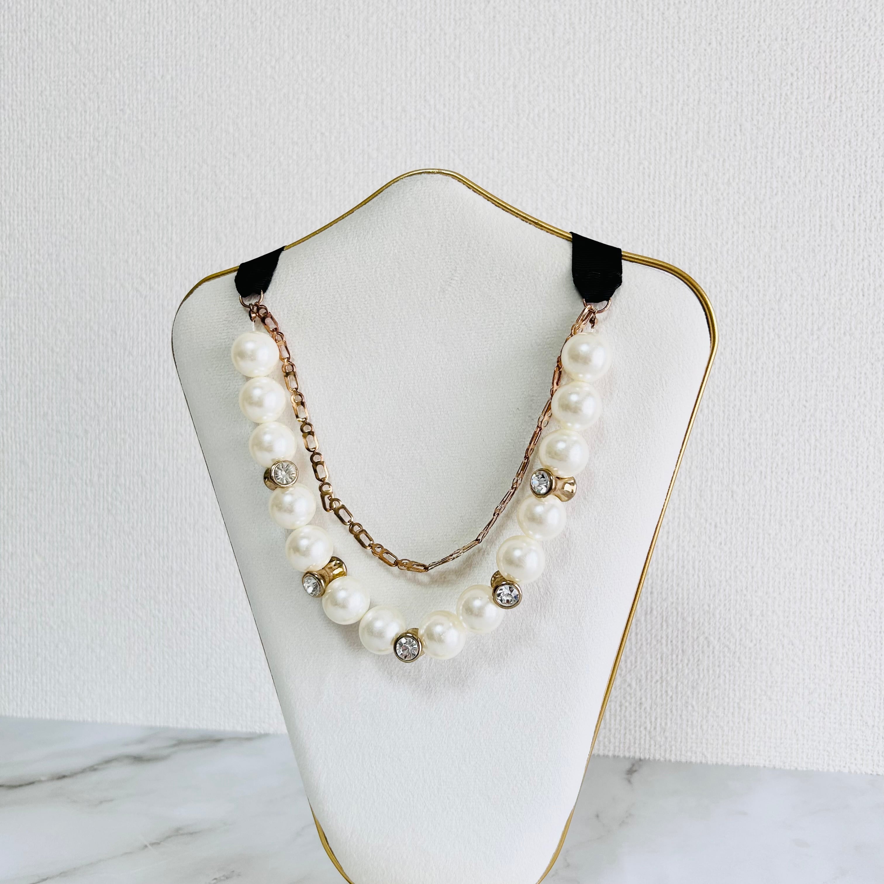 艶やかな大粒パールとユニークなゴールドのメタルパーツを連ねたものにアンティークゴールドチェーンをプラスした華やかさ溢れる2連ネックレスです。