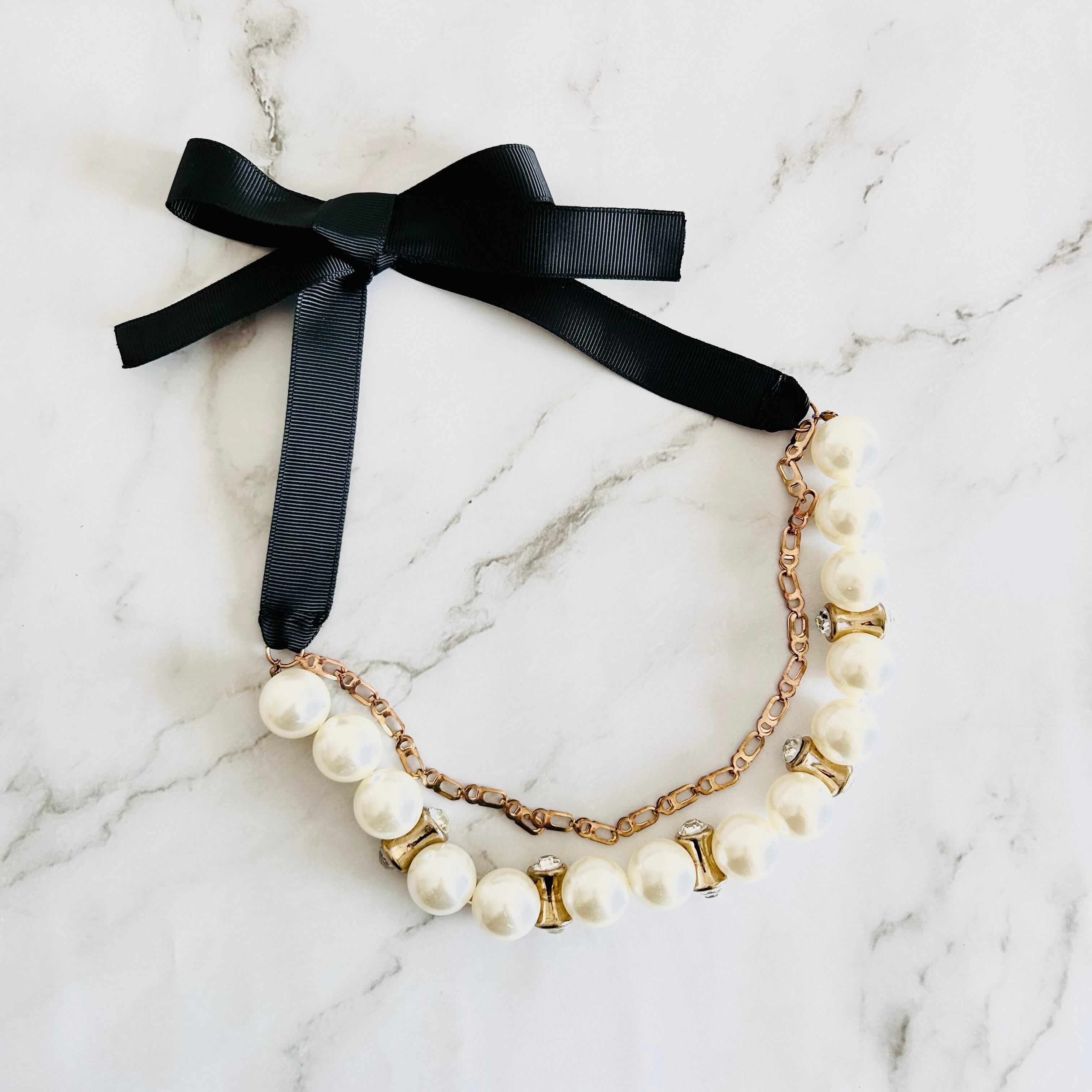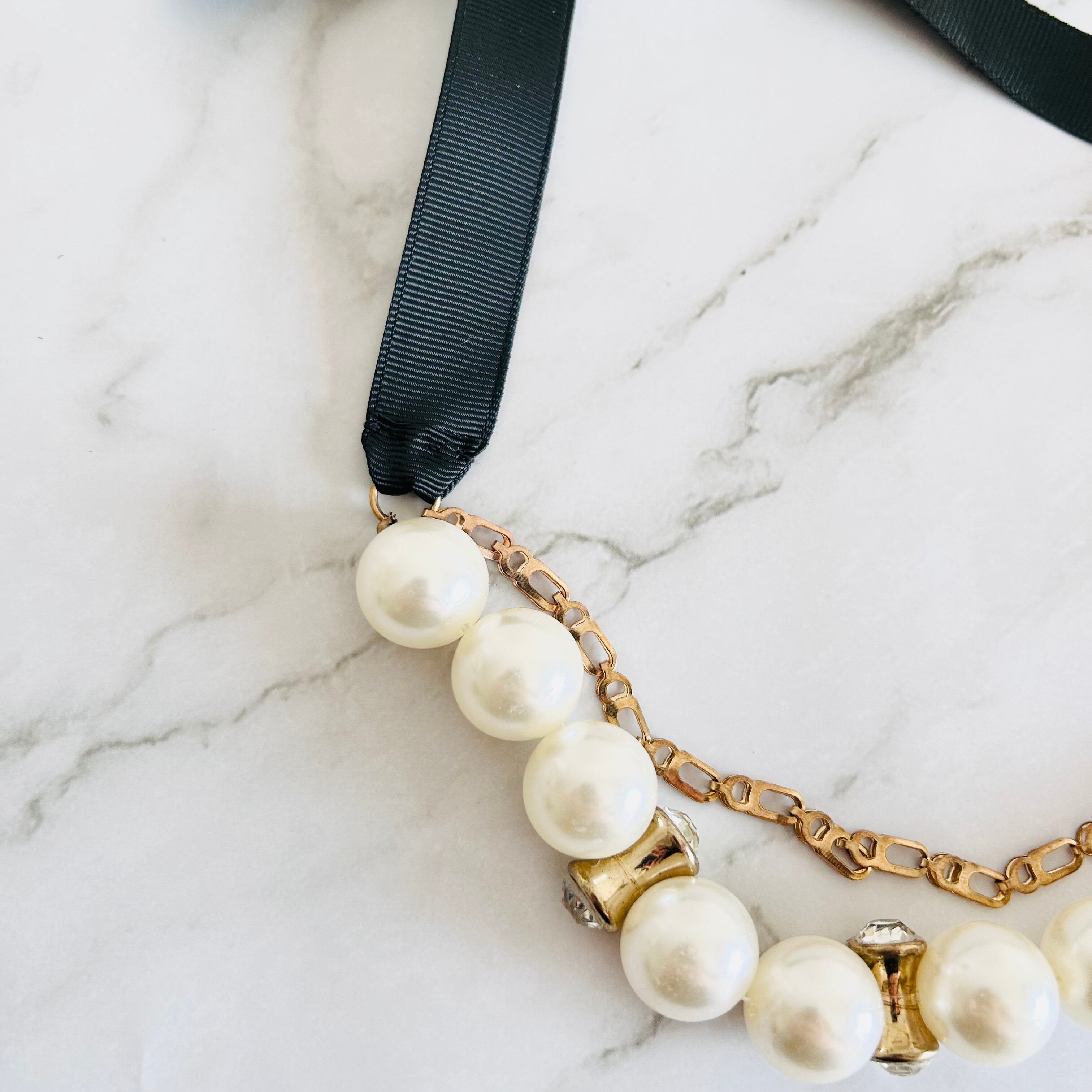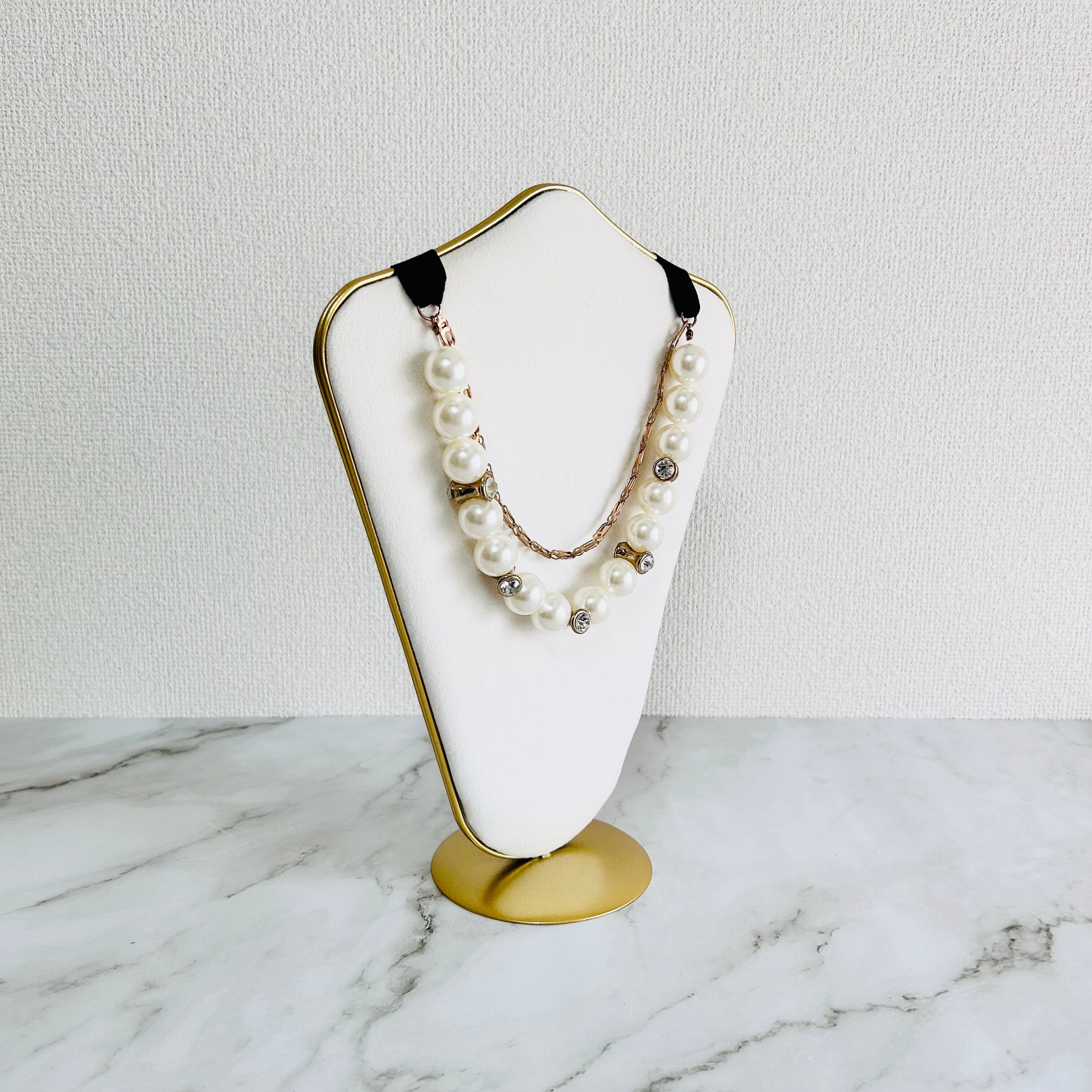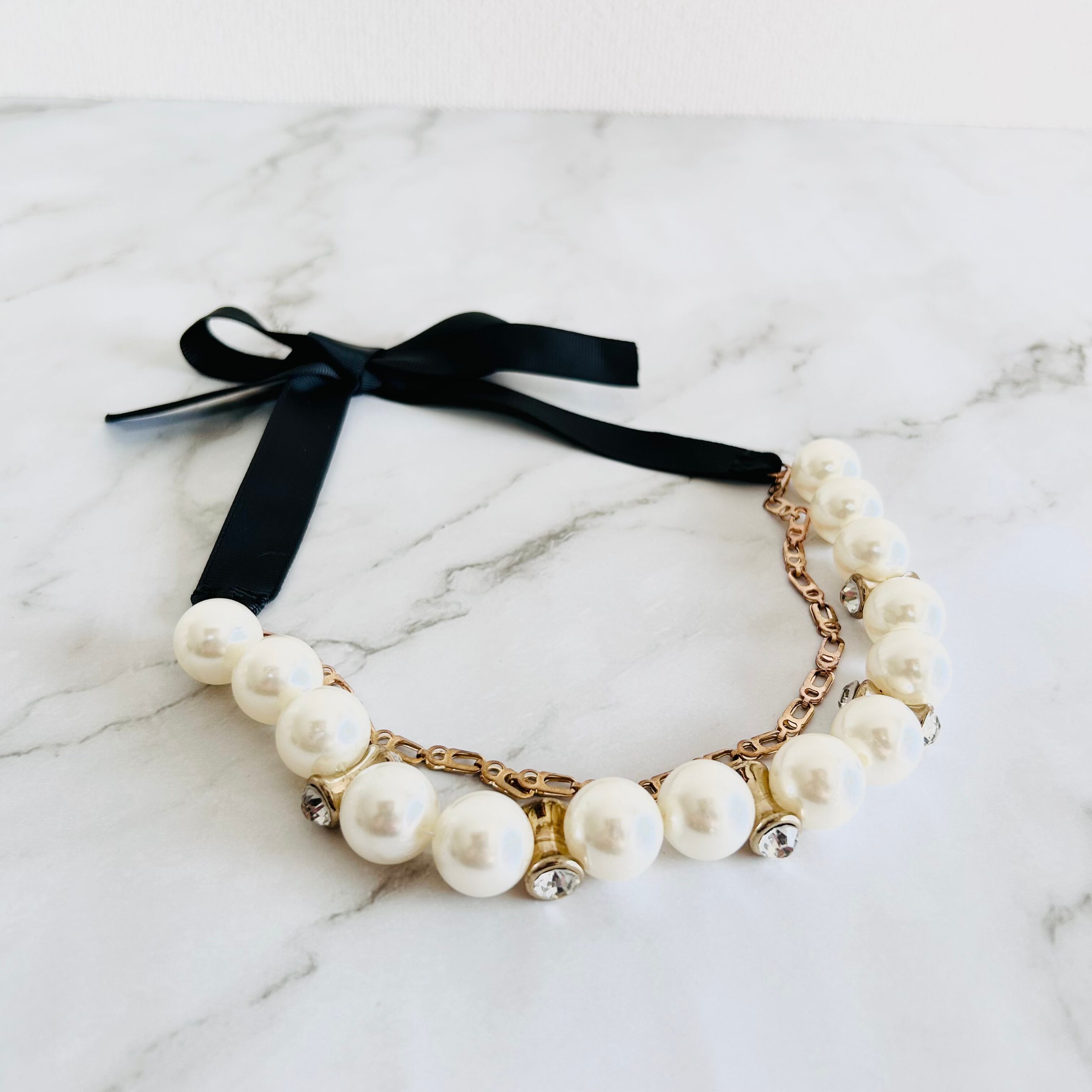 ネック部分はブラックのリボンで結ぶ仕様になっており、長さを自在に調整できるのも嬉しいポイントです。パールとリボンのコントラストが、クラシカルでありながらモダンな雰囲気を演出します。
