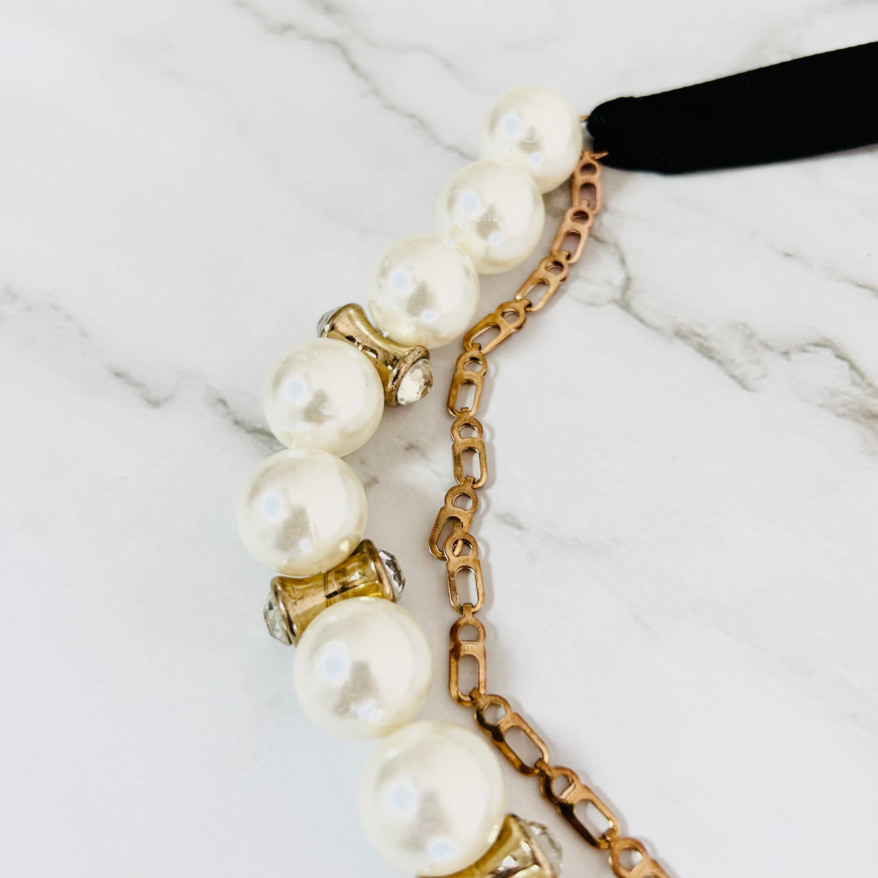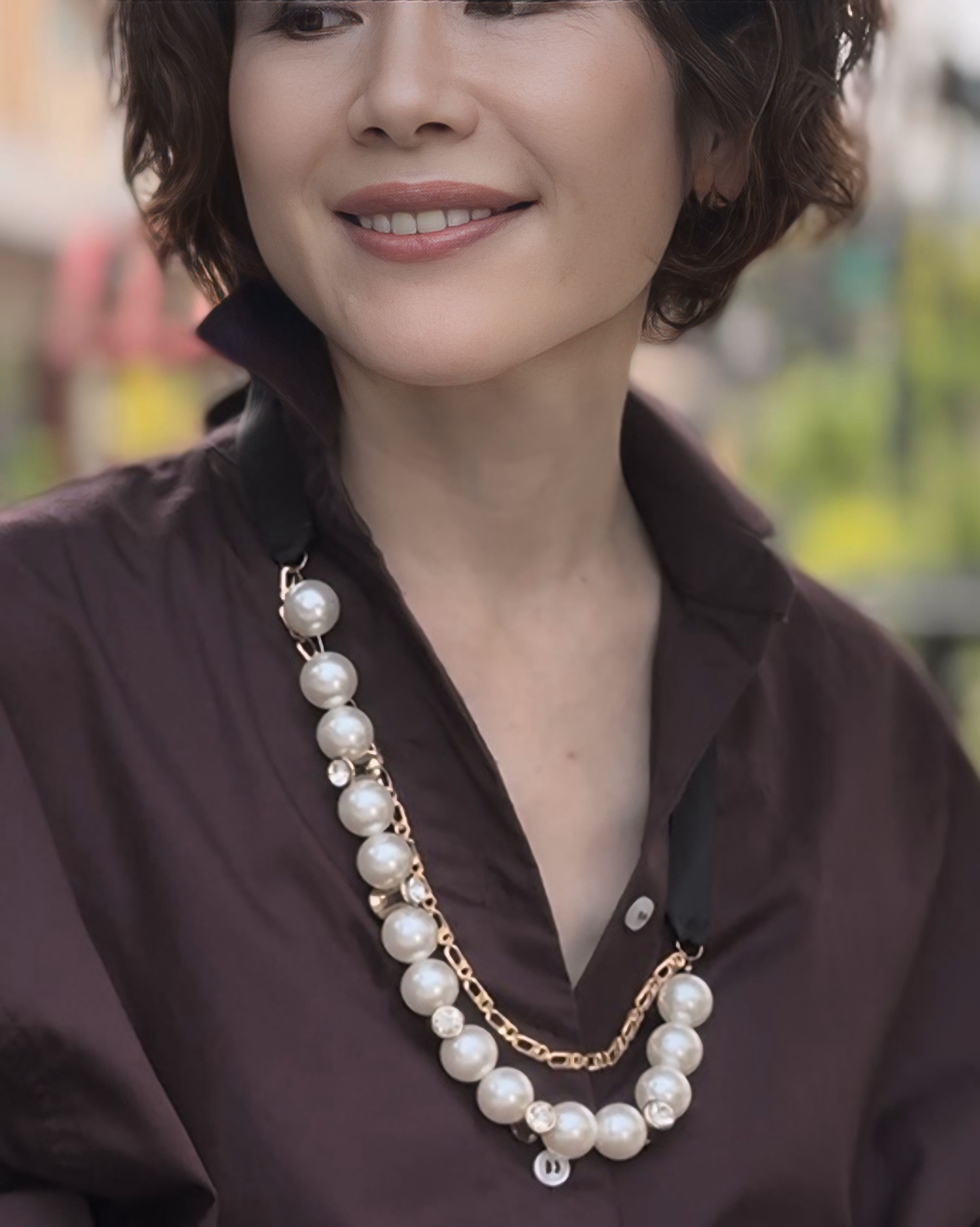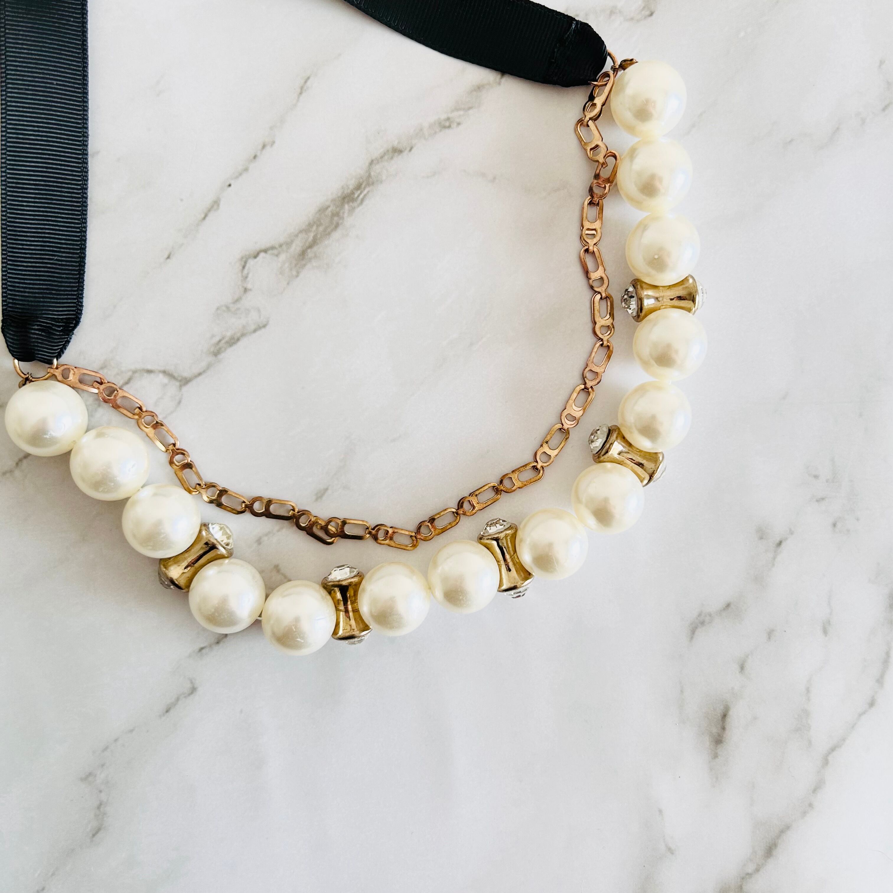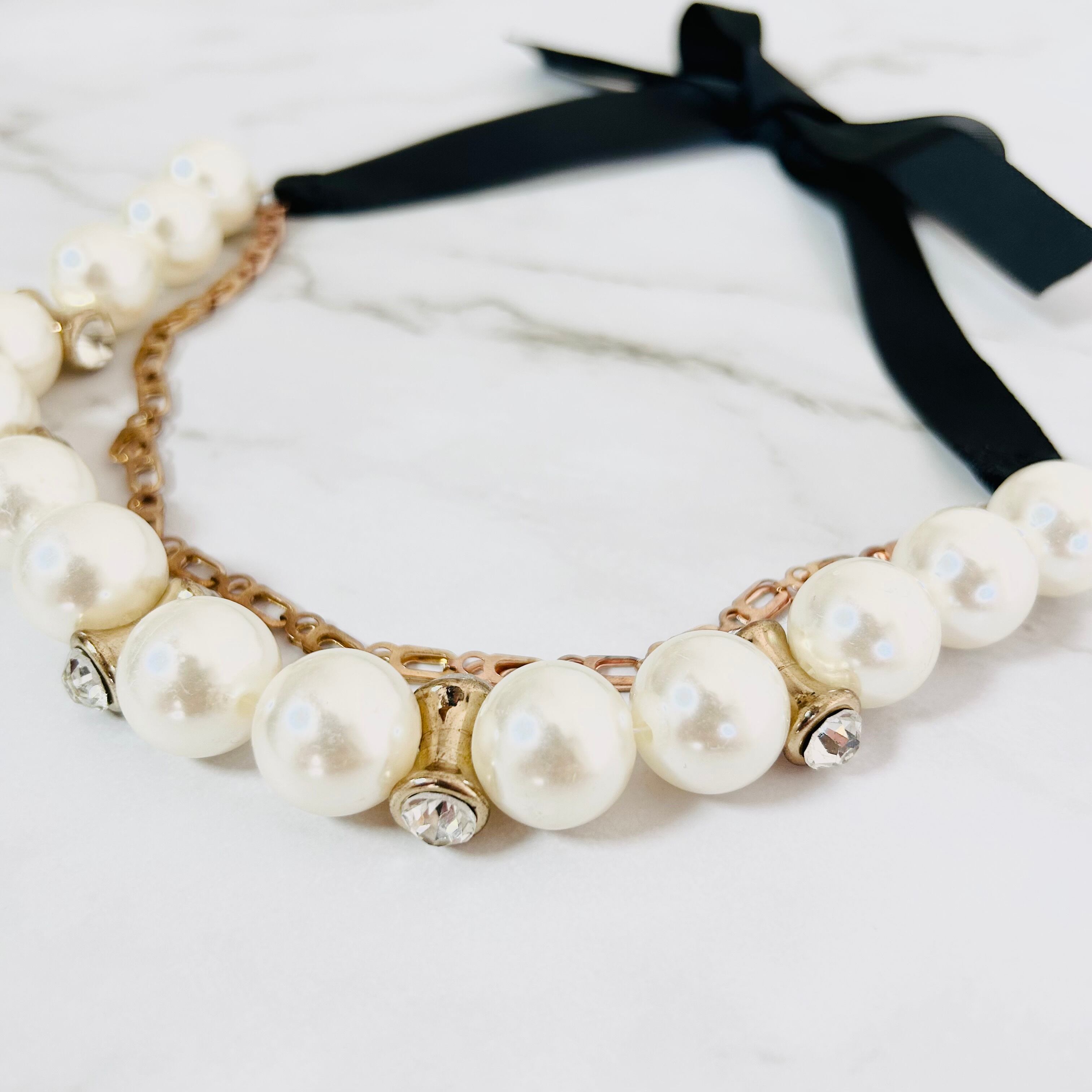 ネック部分はブラックのリボンで結ぶ仕様になっており、長さを自在に調整できるのも嬉しいポイントです。パールとリボンのコントラストが、クラシカルでありながらモダンな雰囲気を演出します。