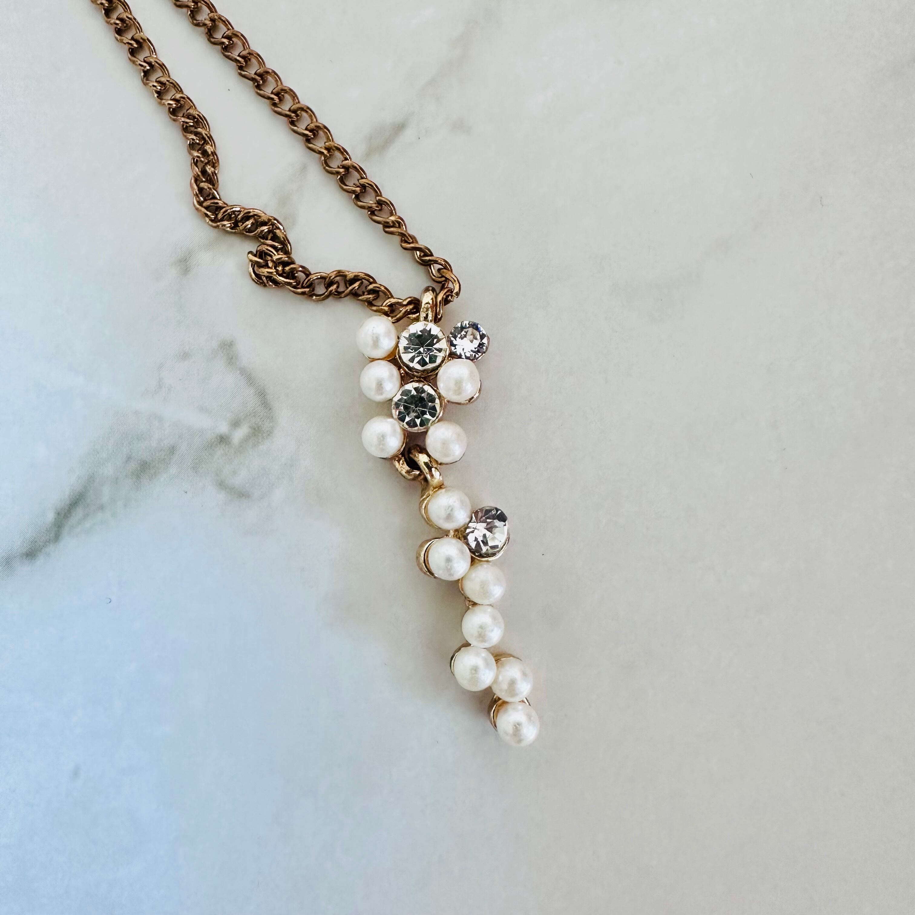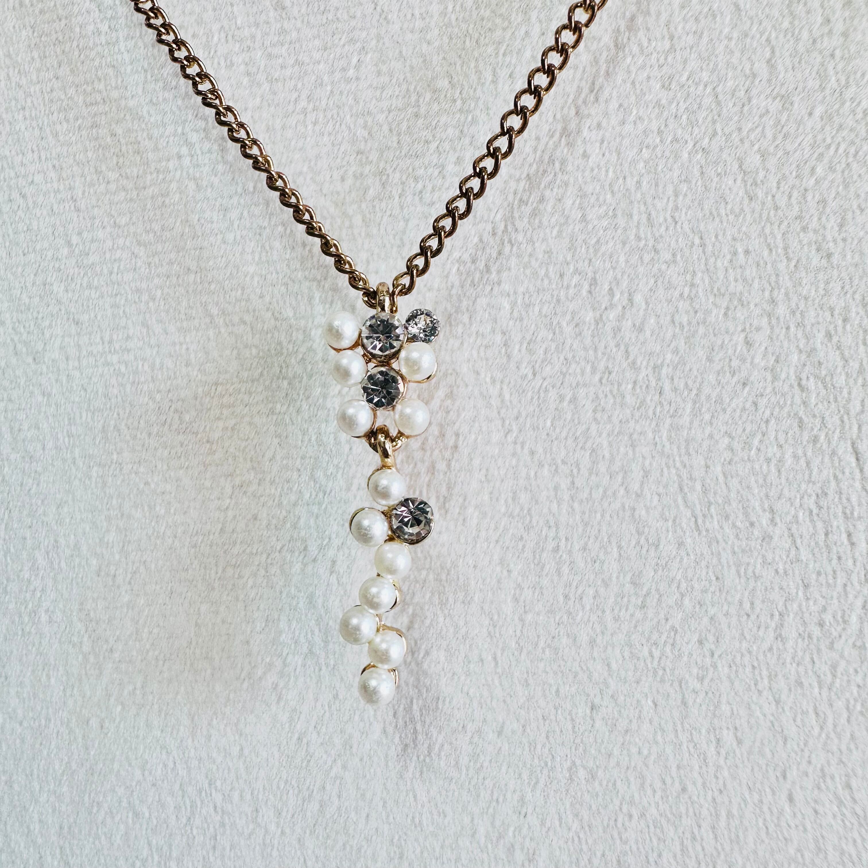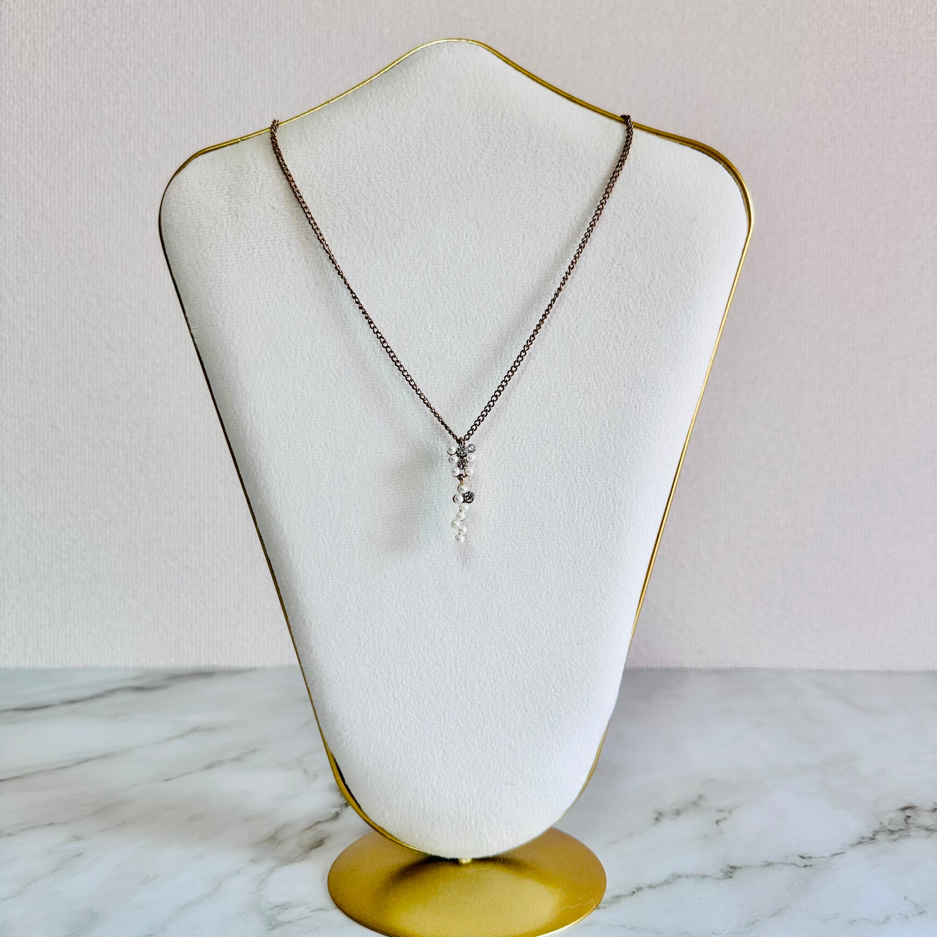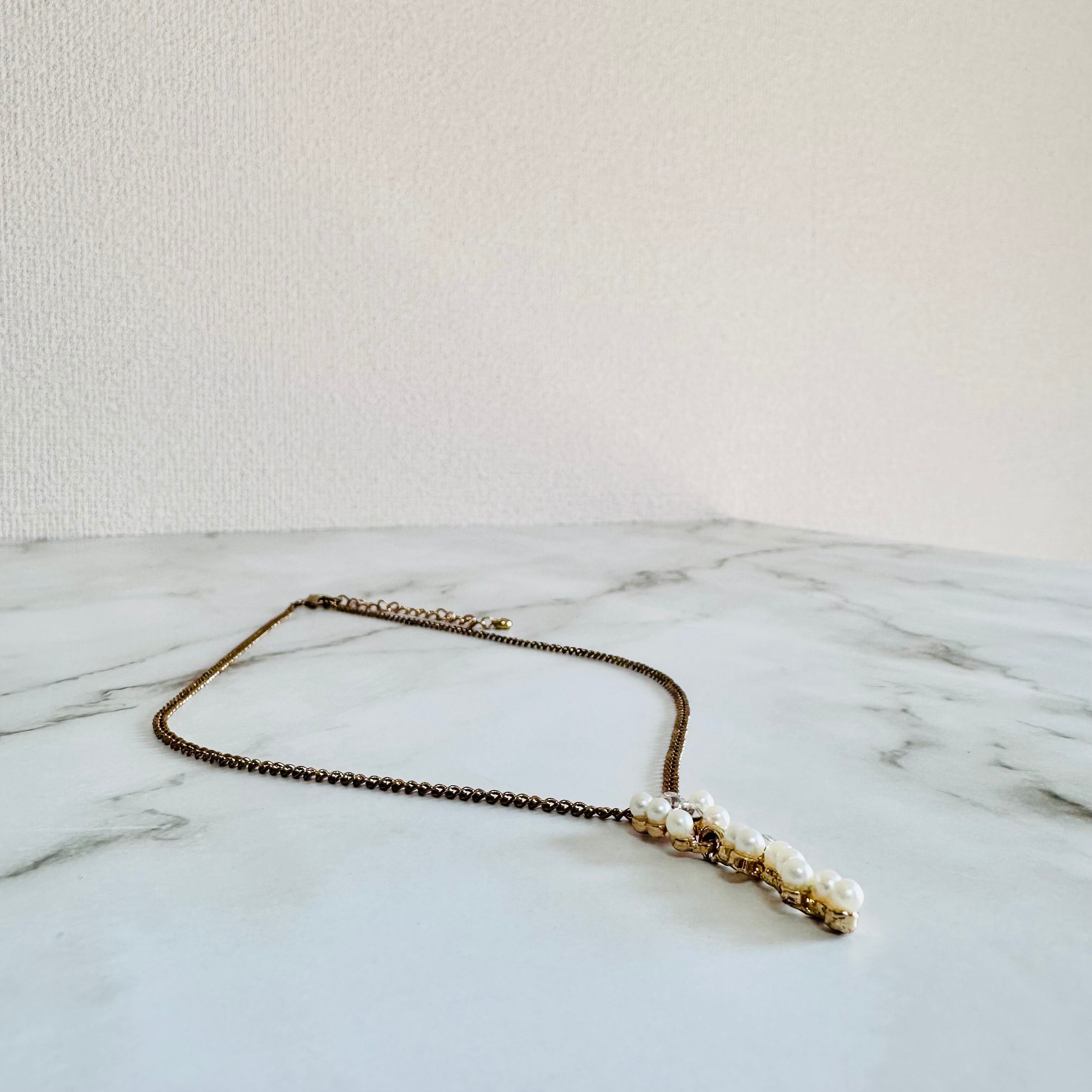 アンティーク調のゴールドチェーンに、パールとクリアストーンを縦に連ねたペンダントトップが印象的なネックレスです。