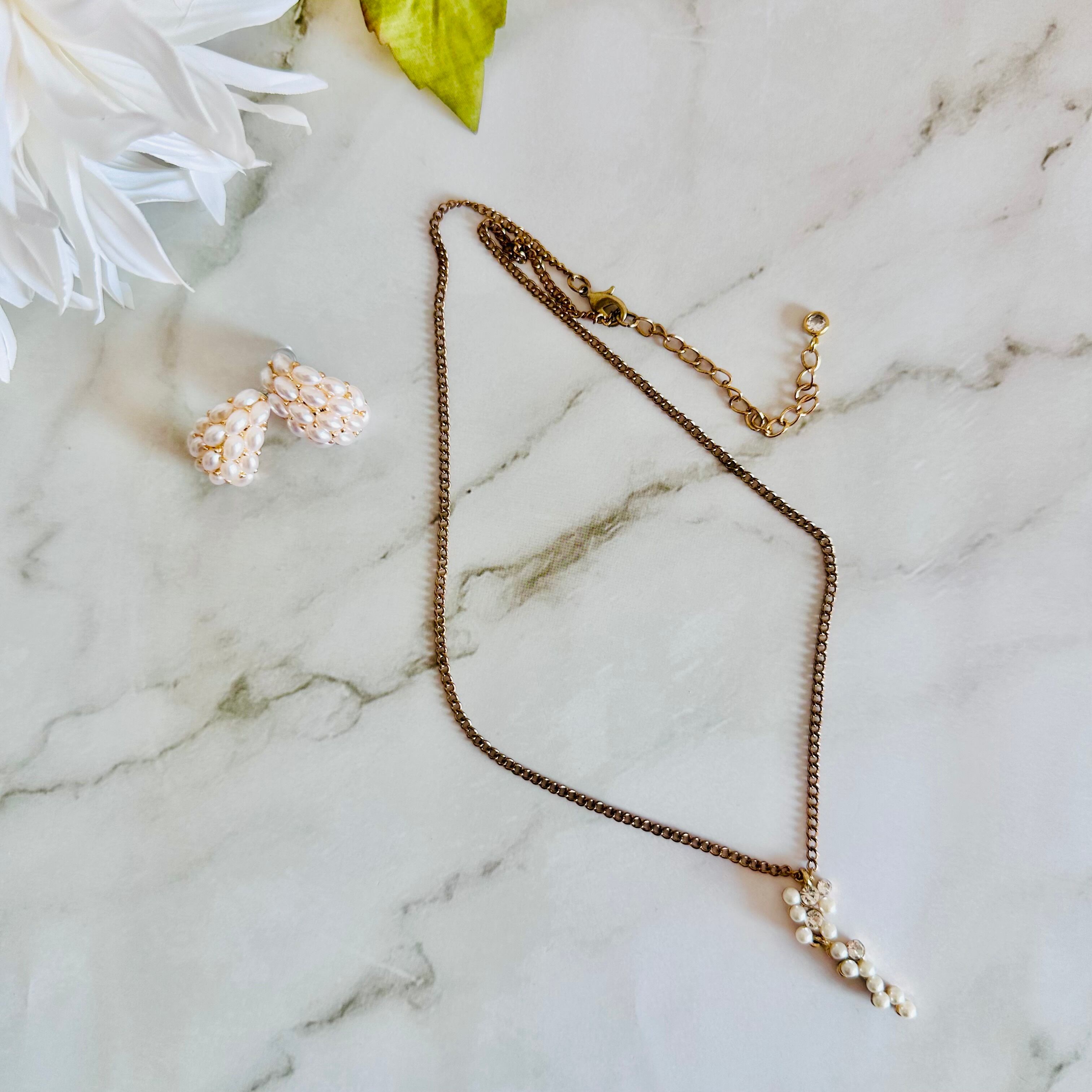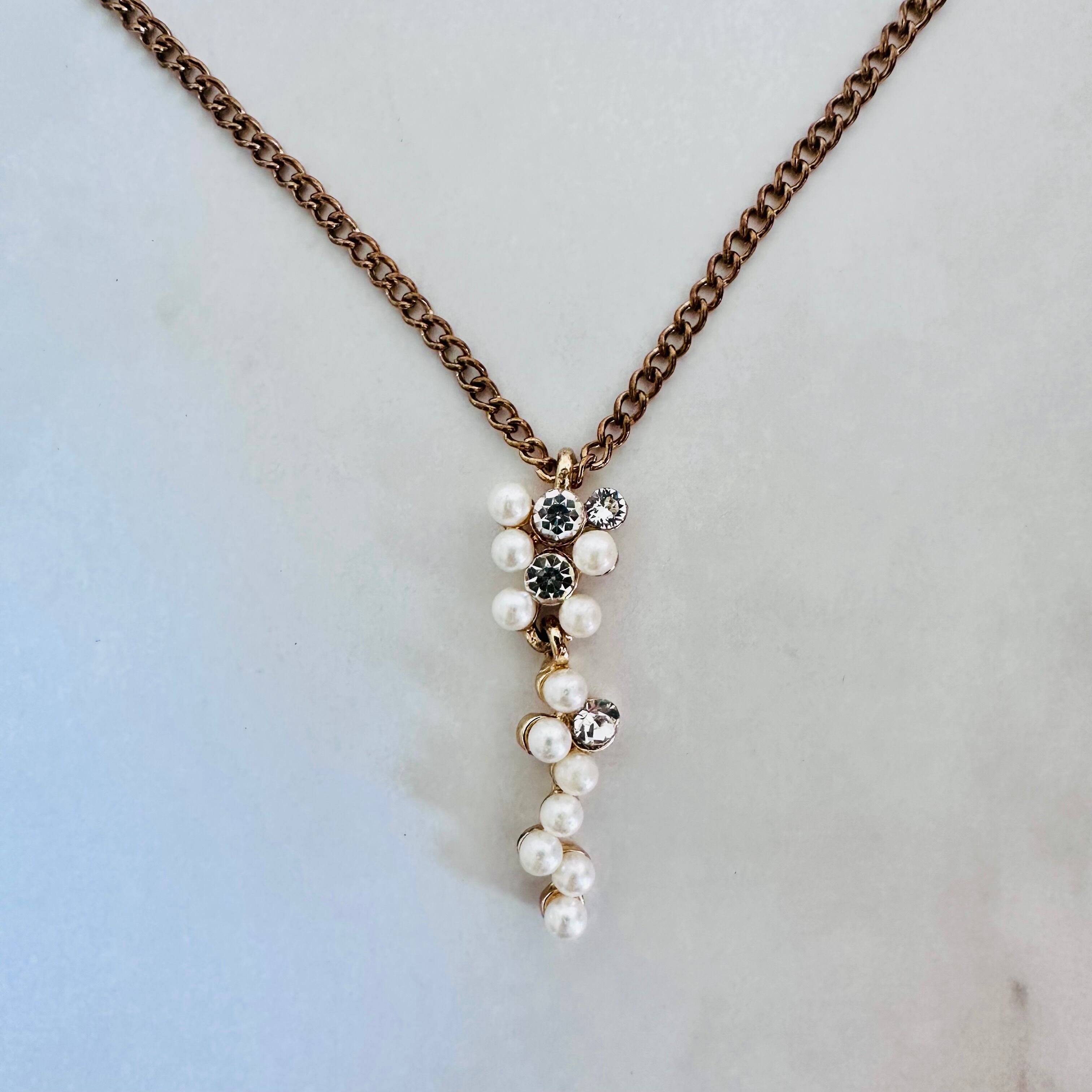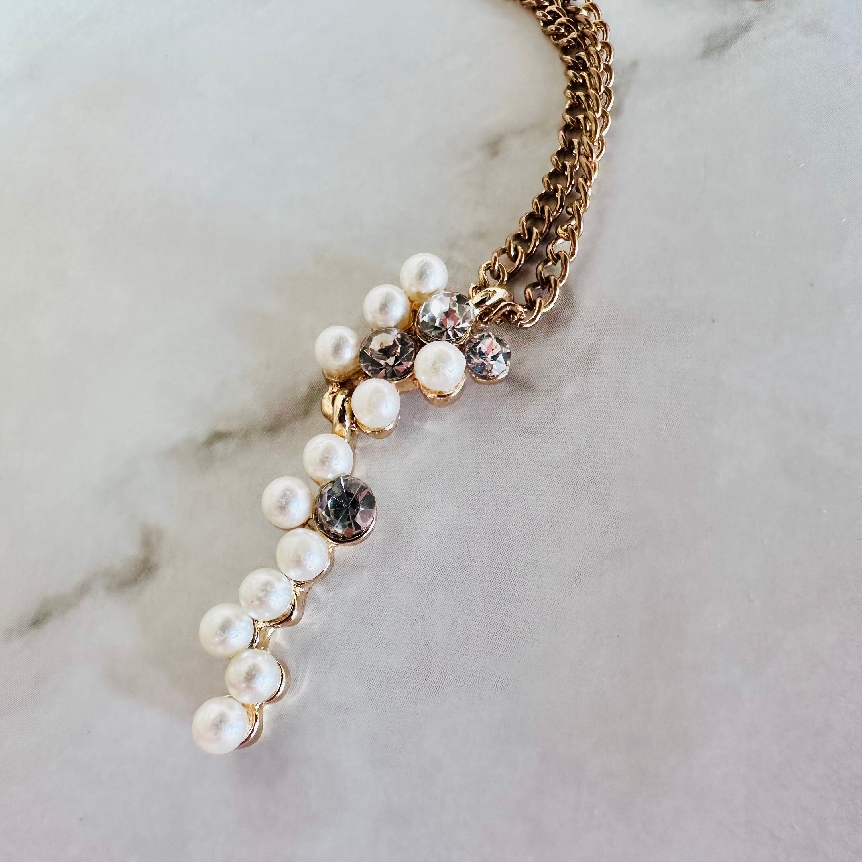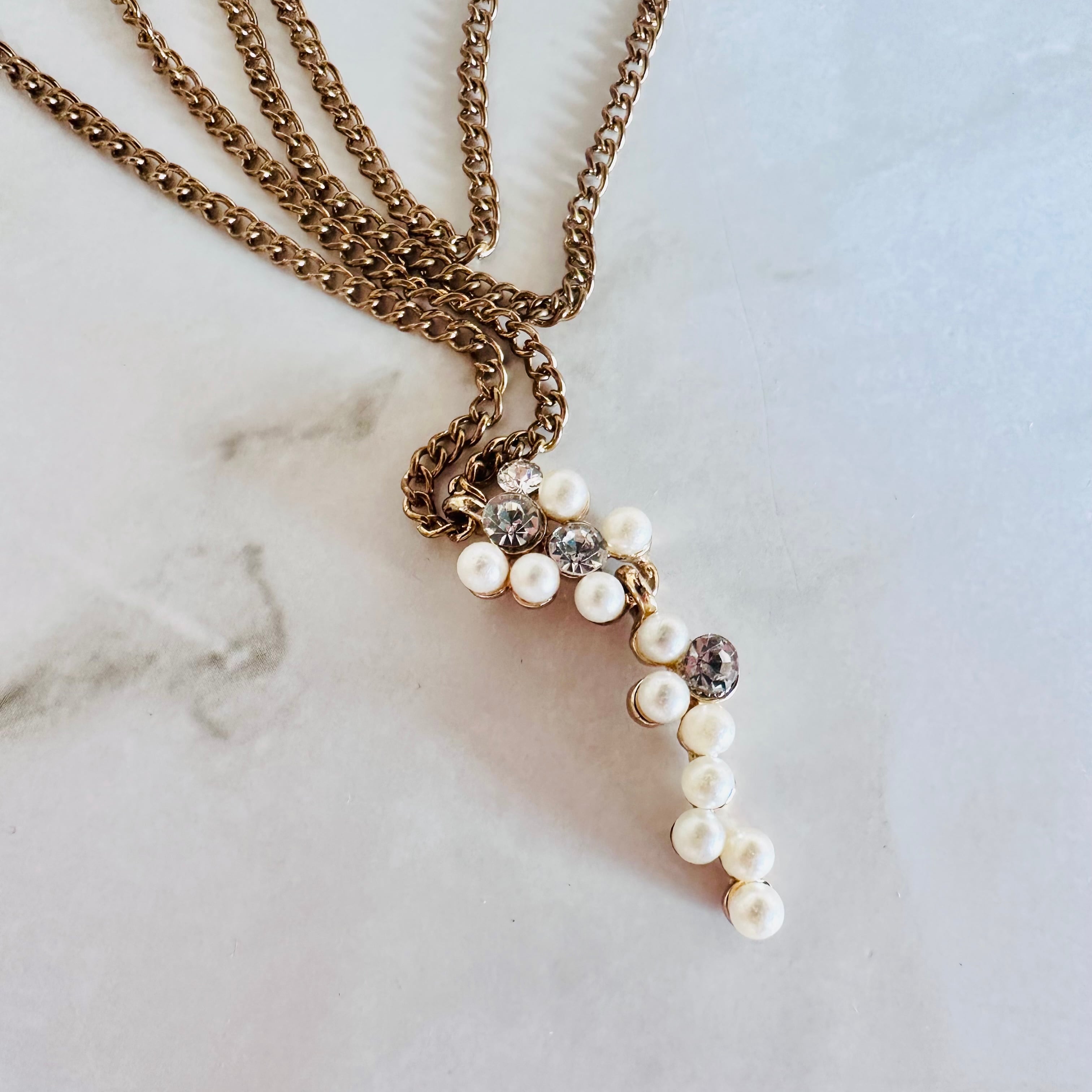 アンティーク調のゴールドチェーンに、パールとクリアストーンを縦に連ねたペンダントトップが印象的なネックレスです。