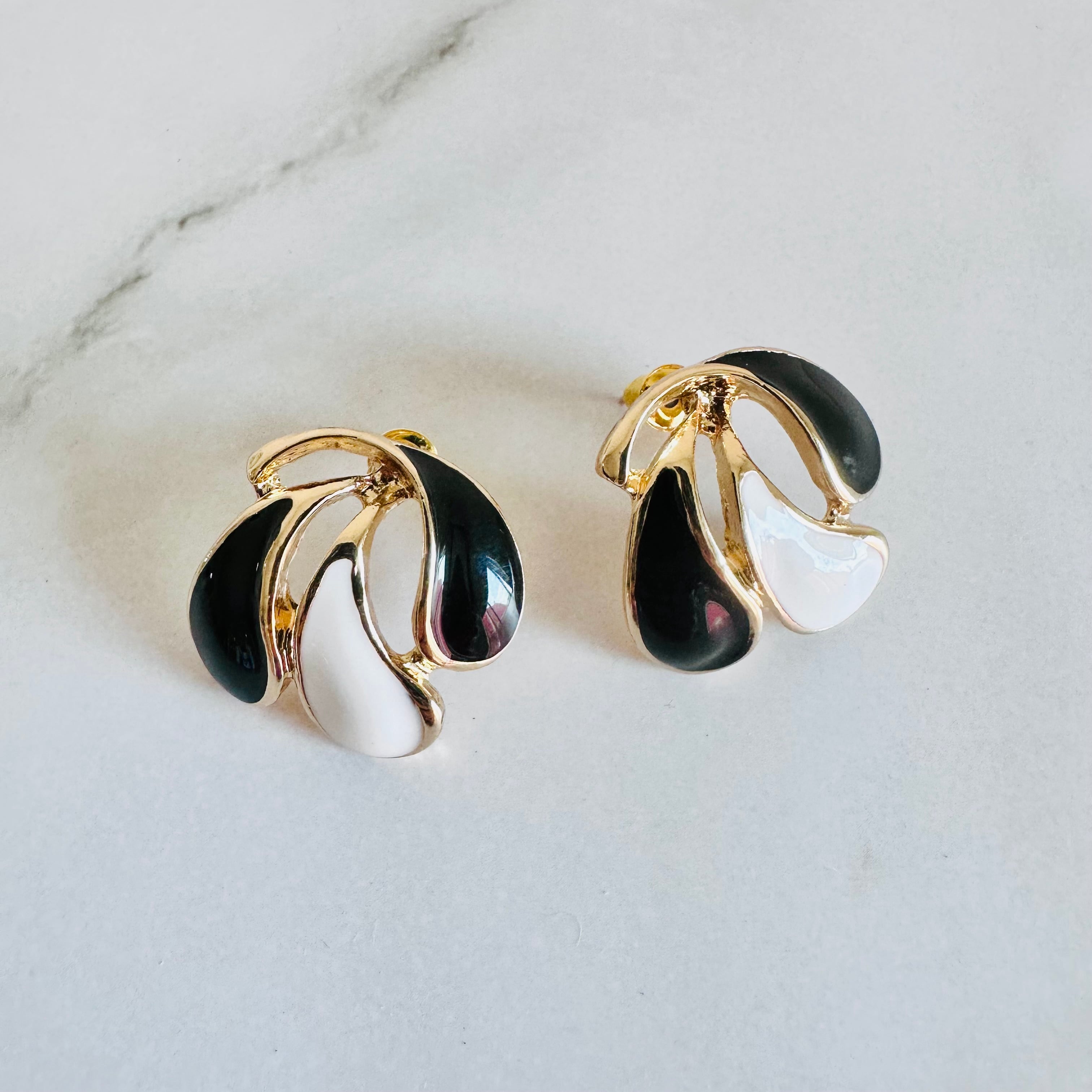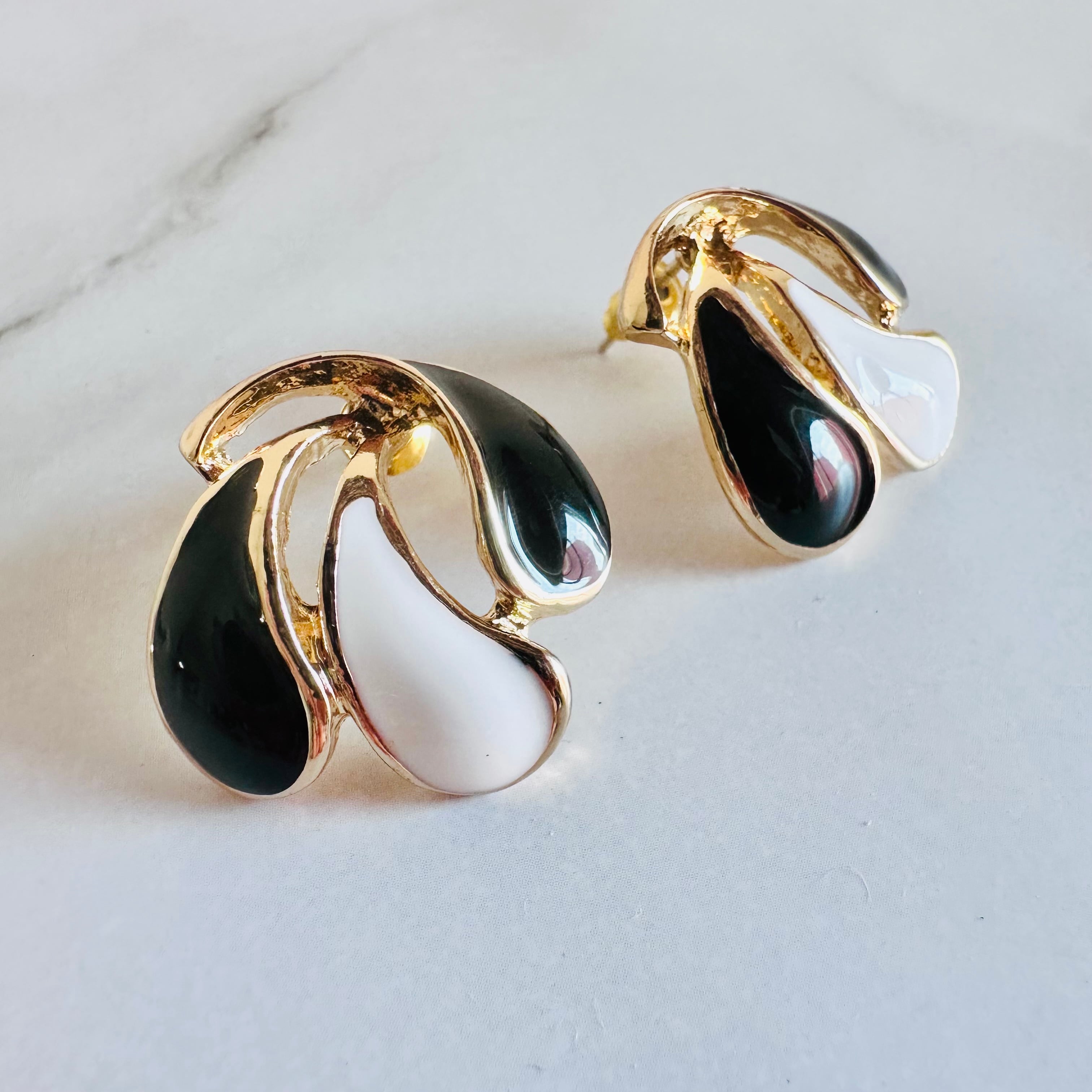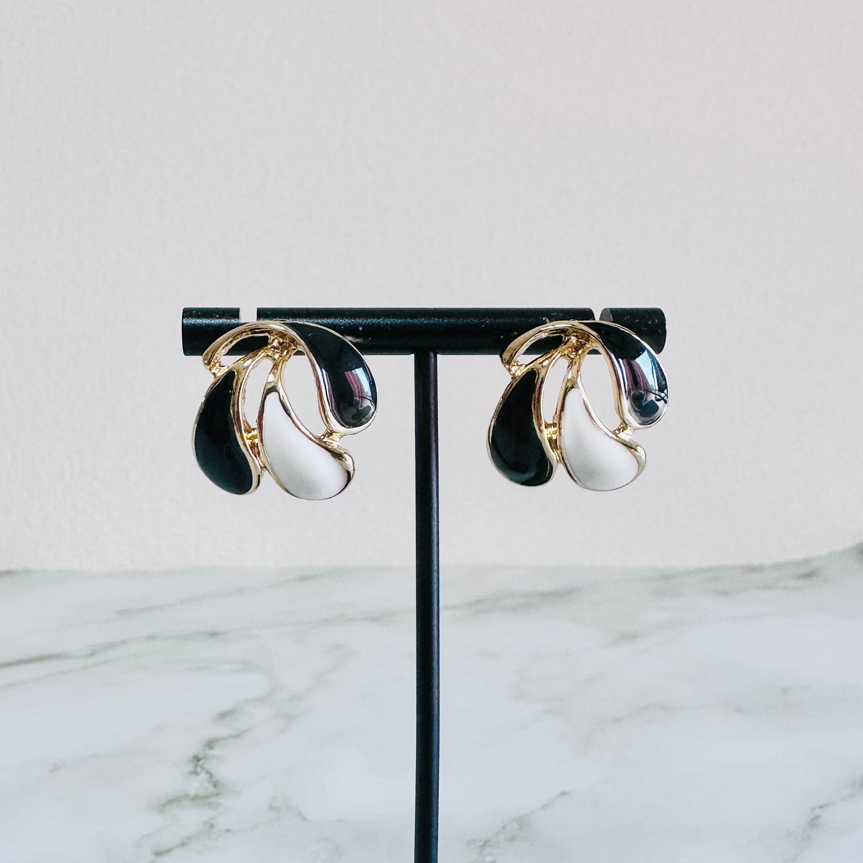 エナメルトーンの艶やかなブラックとホワイトのコントラストが美しい、しずくのようなフォルムのピアスです。
