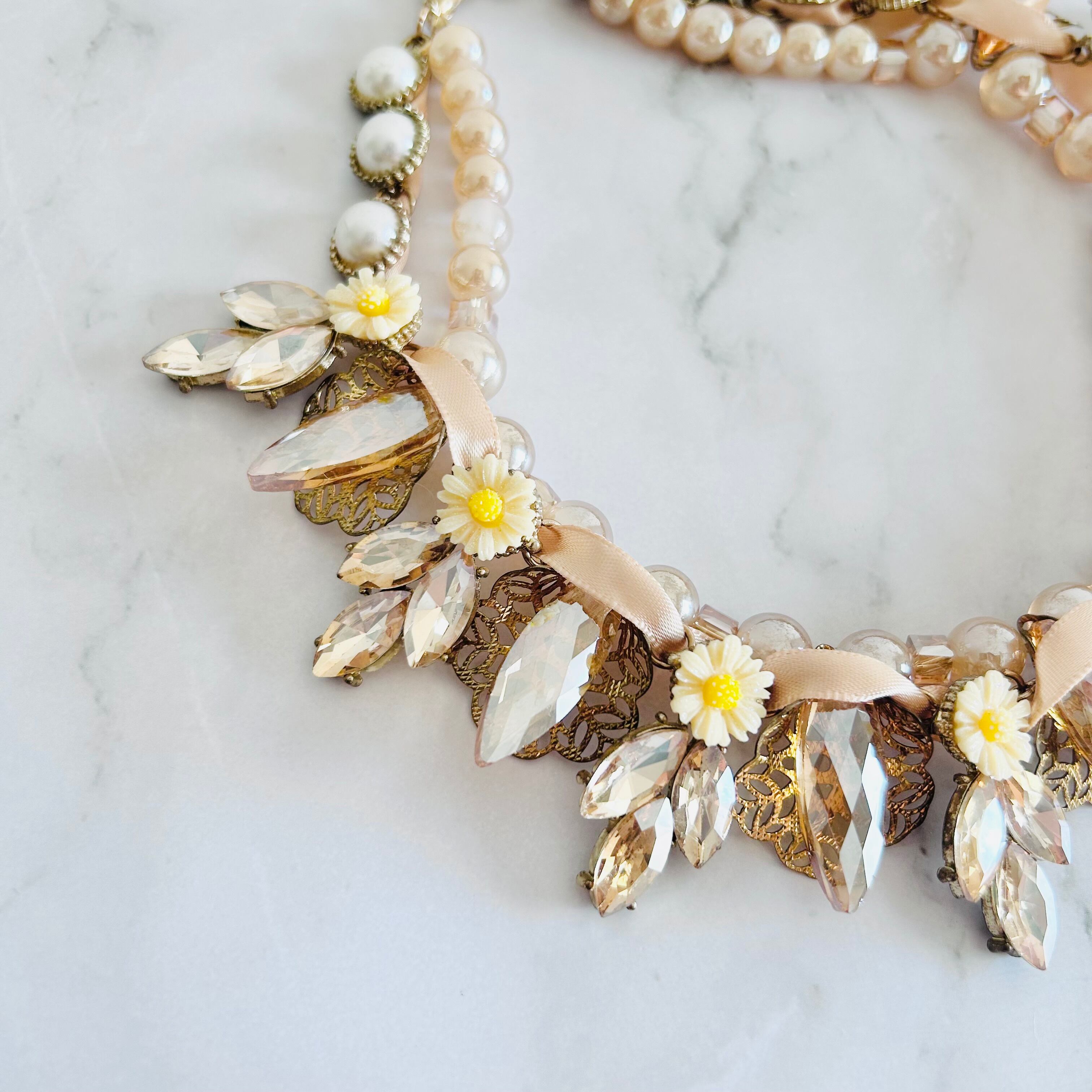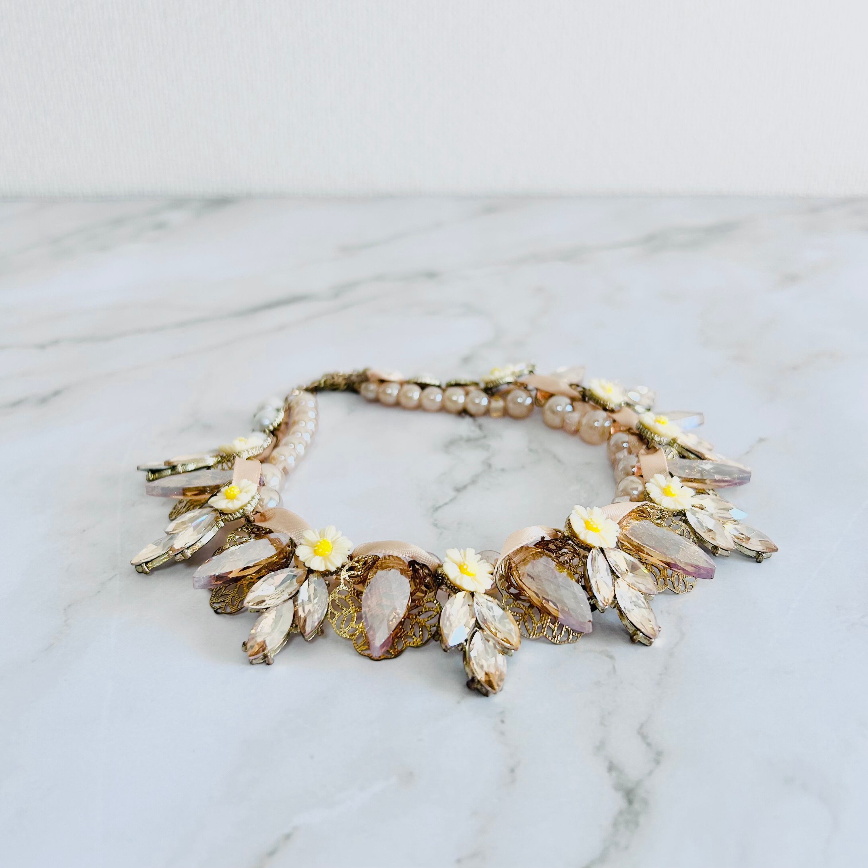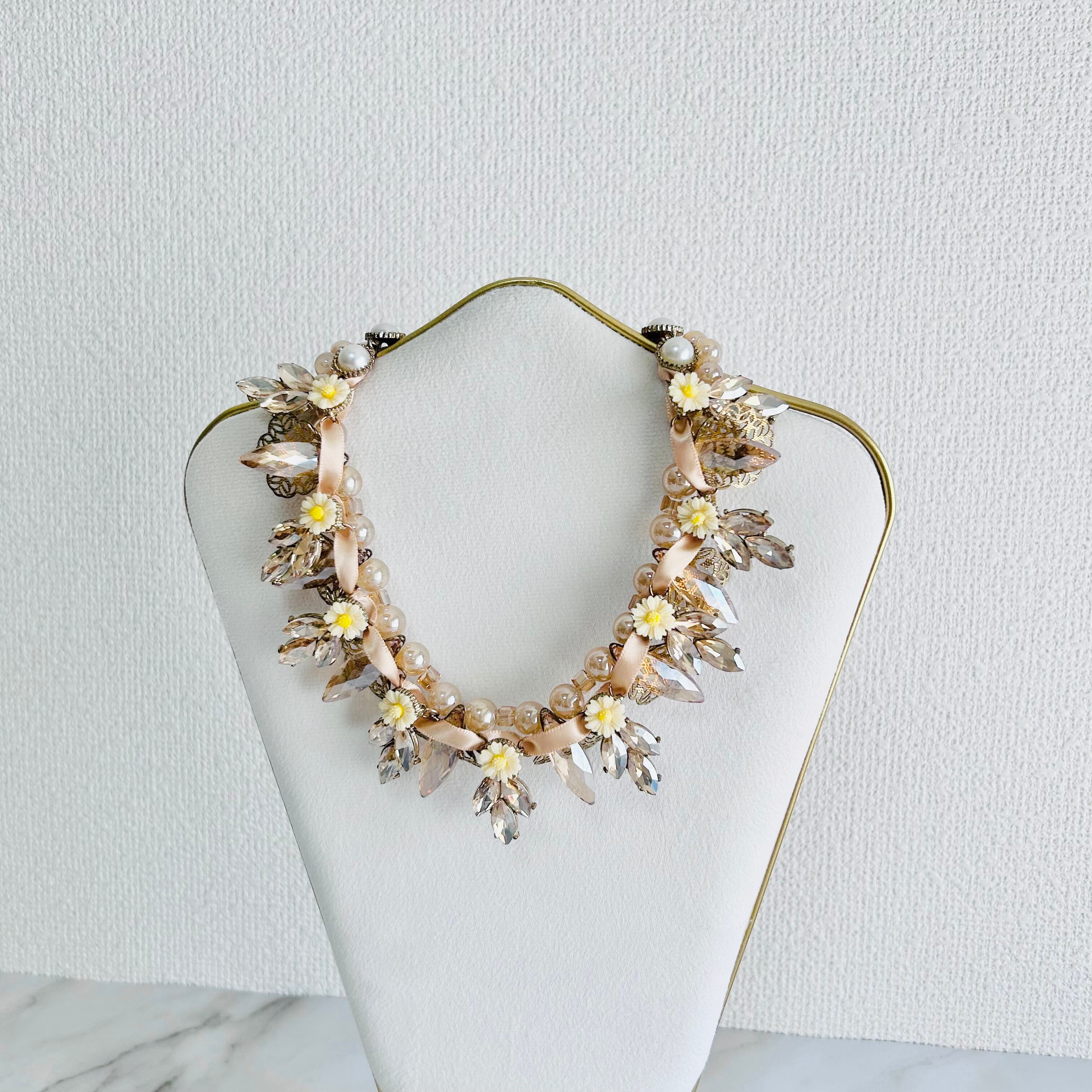 艶やかなベージュトーンのパールビーズに、オレンジ系のクリアに煌めくビーズやドロップカットのクリスタル、愛らしいイエローフラワーモチーフを散りばめ、リボンでデコレートした華やかなネックレスです。