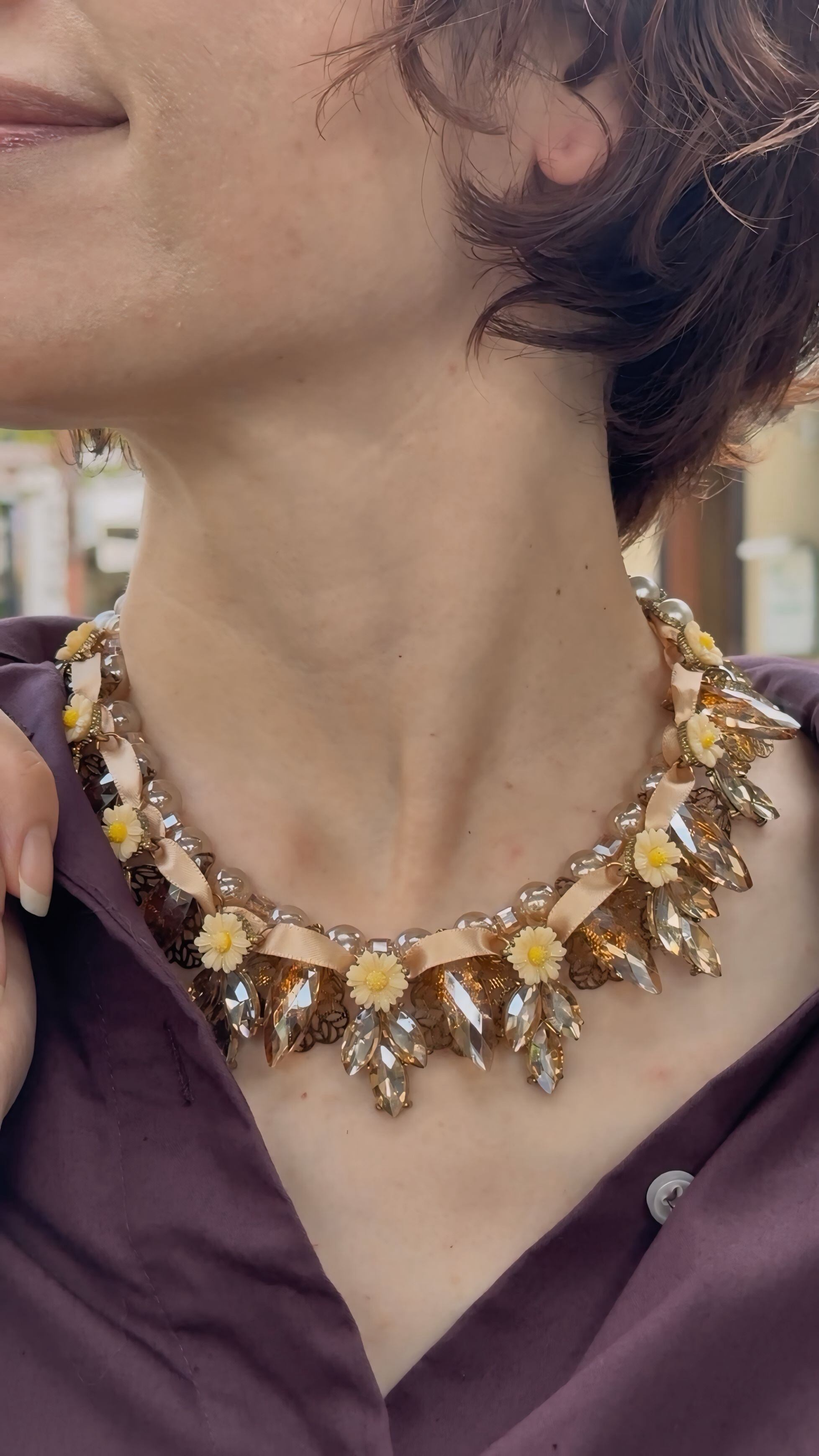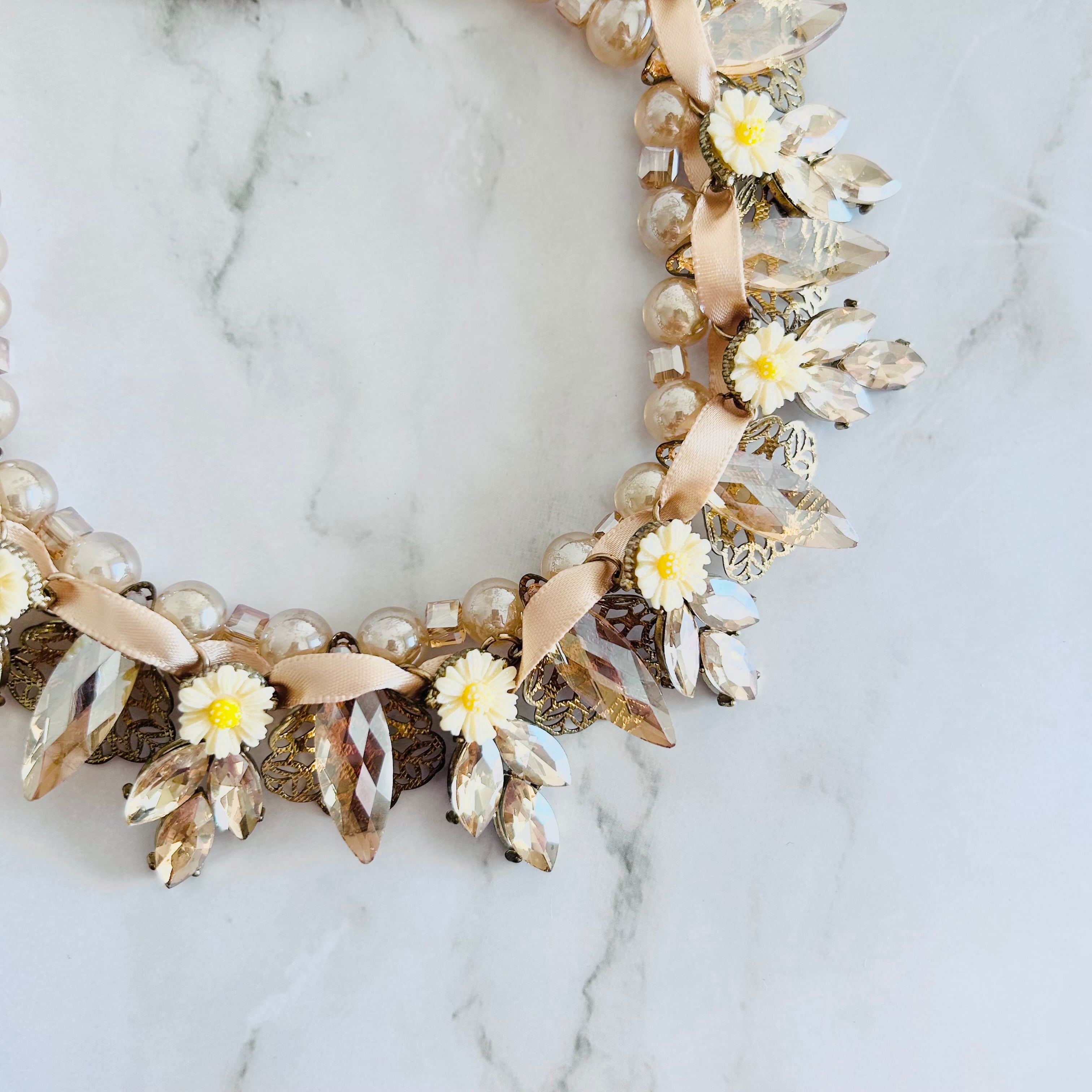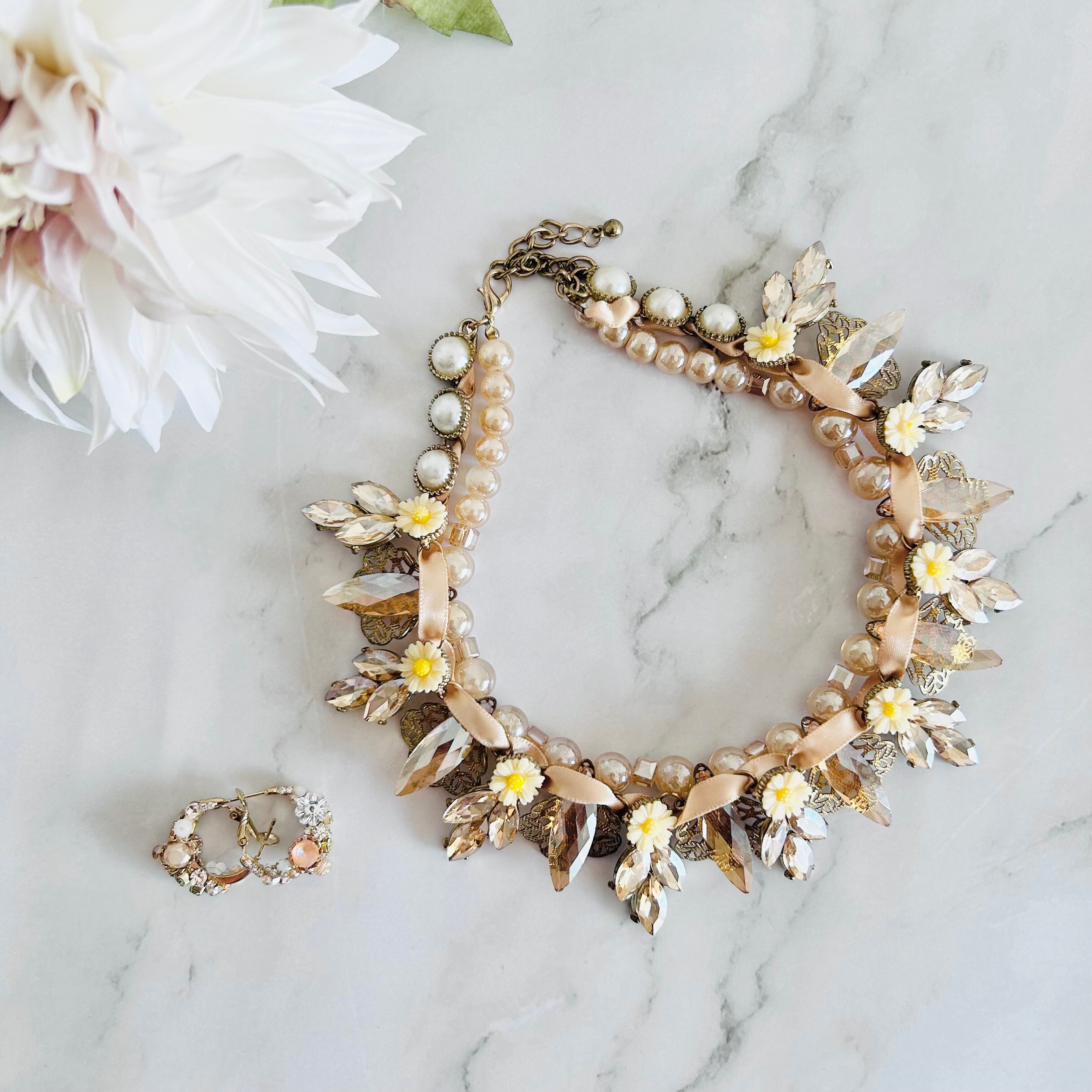 艶やかなベージュトーンのパールビーズに、オレンジ系のクリアに煌めくビーズやドロップカットのクリスタル、愛らしいイエローフラワーモチーフを散りばめ、リボンでデコレートした華やかなネックレスです。