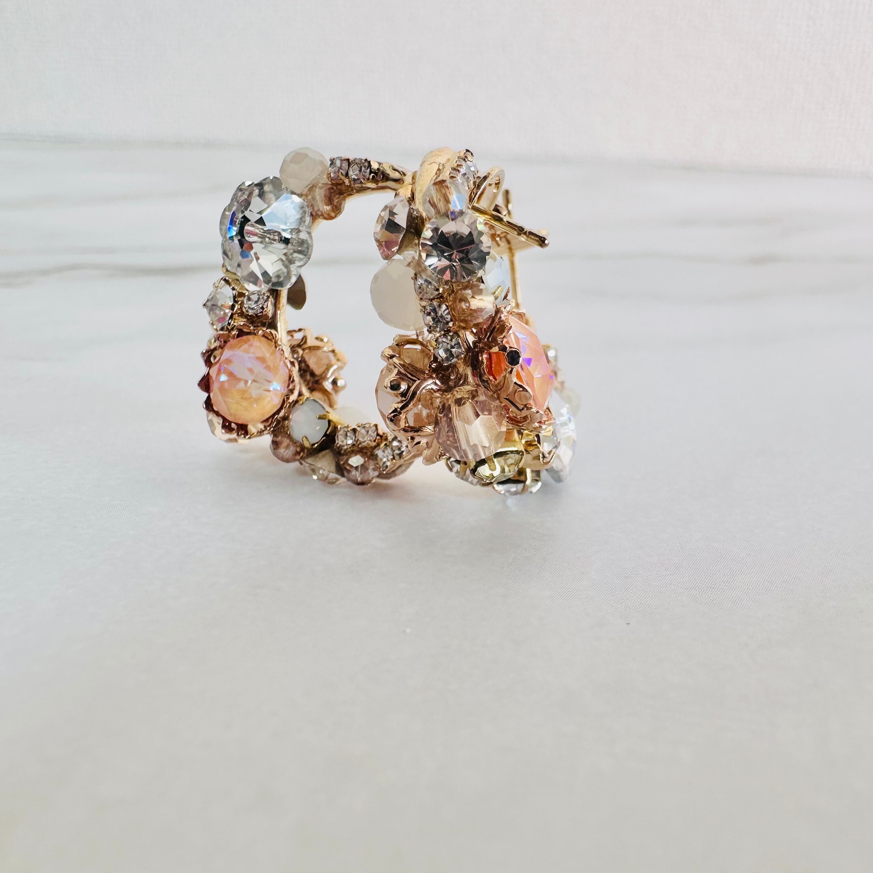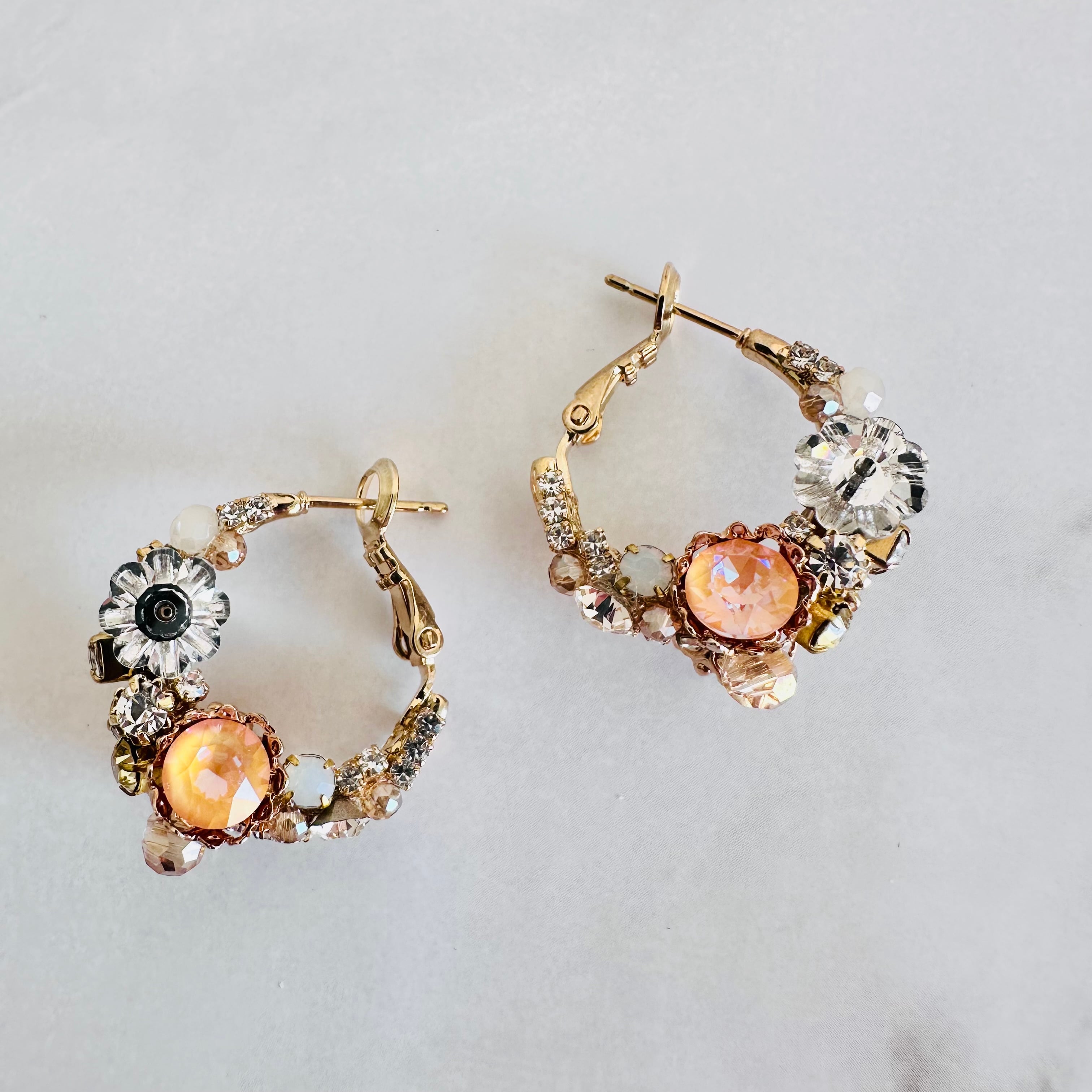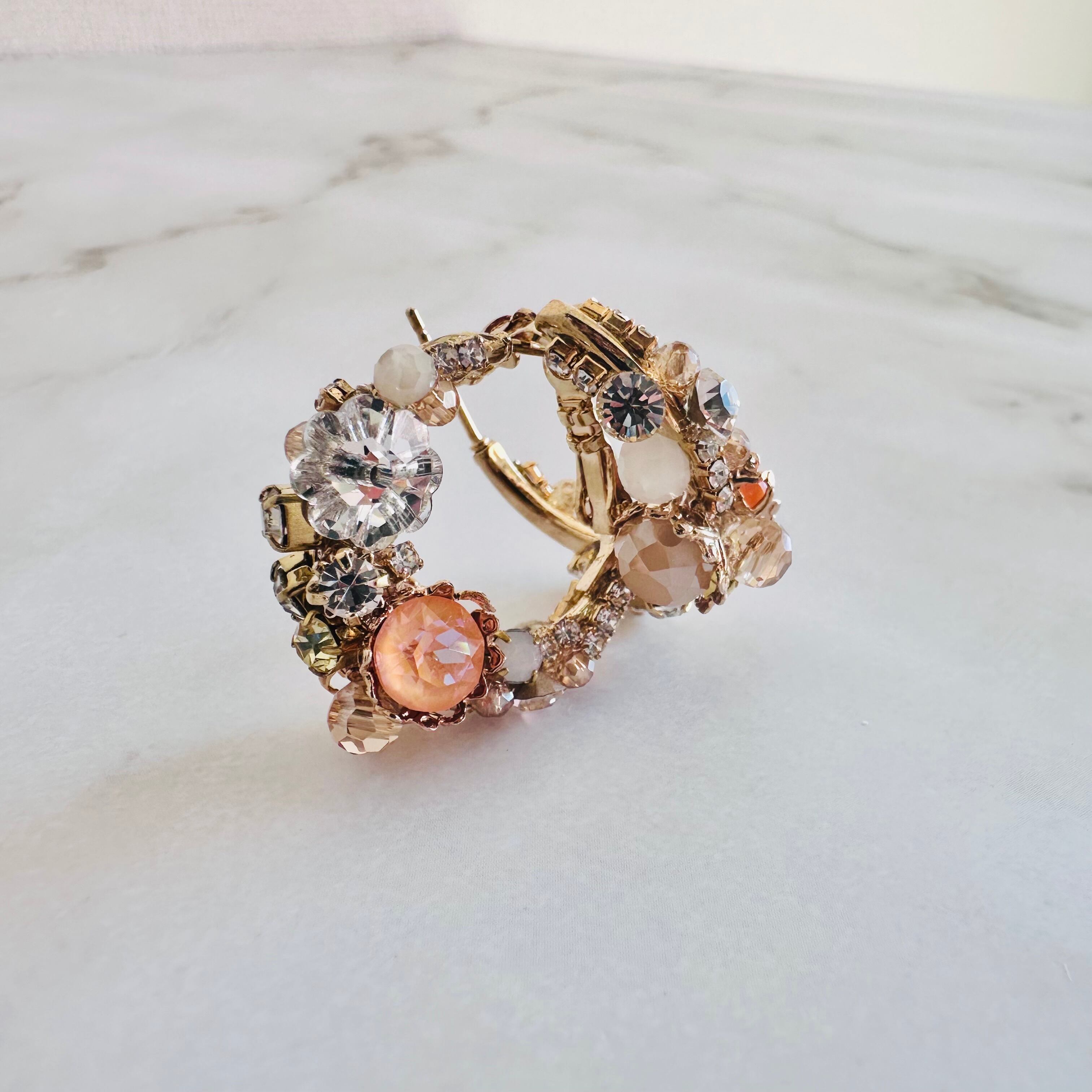 繊細なゴールドのフープに、淡いオレンジ系やベージュの美しいクリスタルビジューを贅沢にあしらったピアスです。
