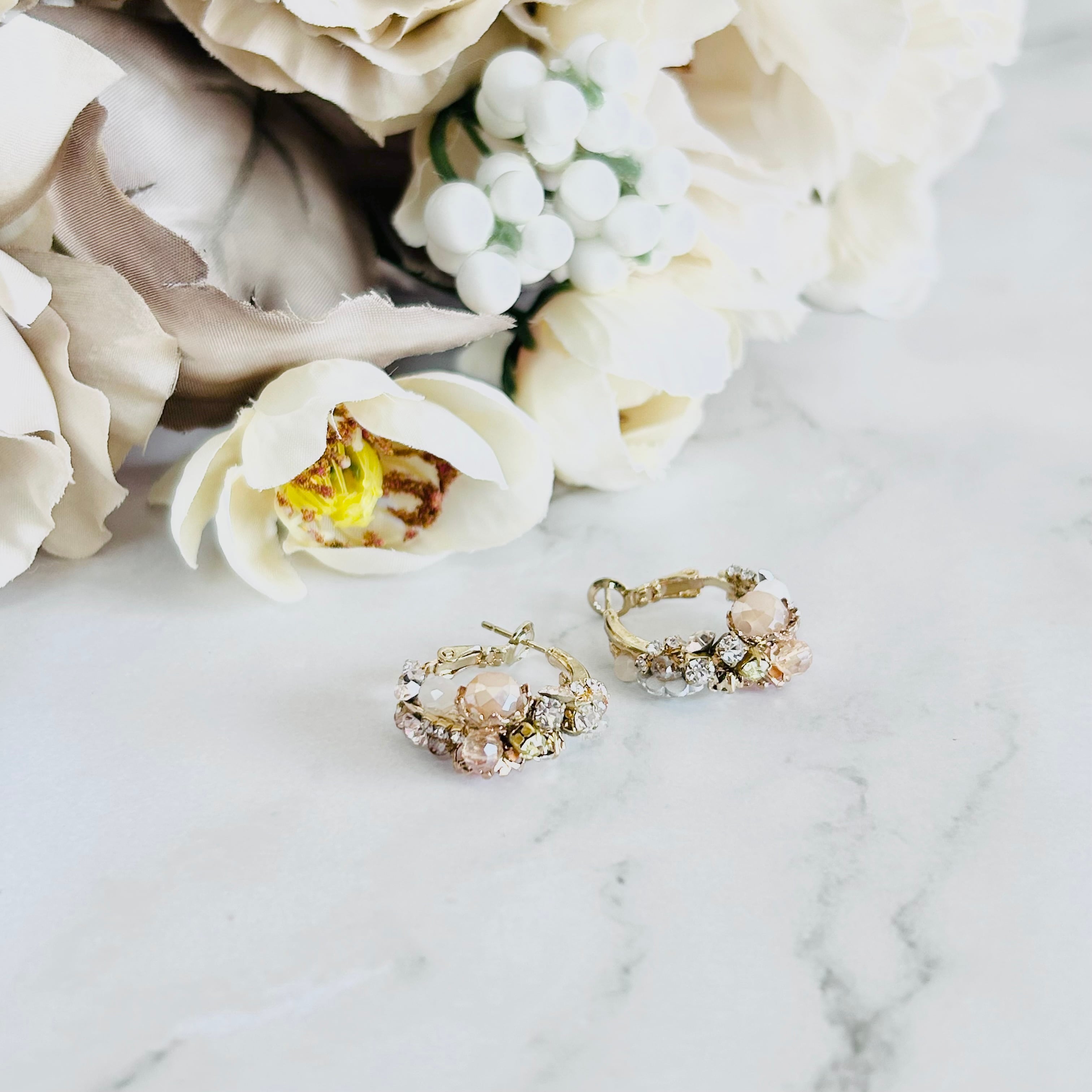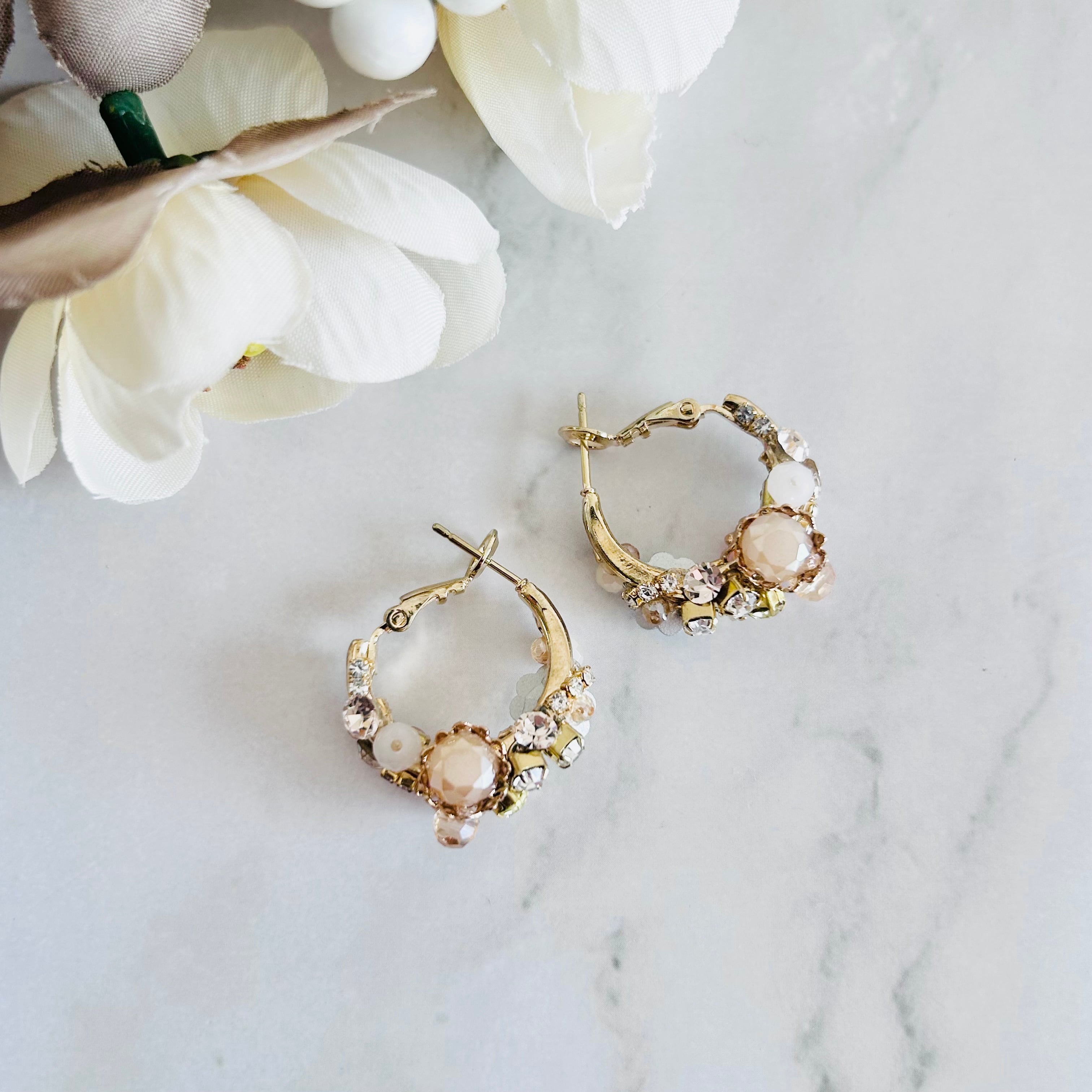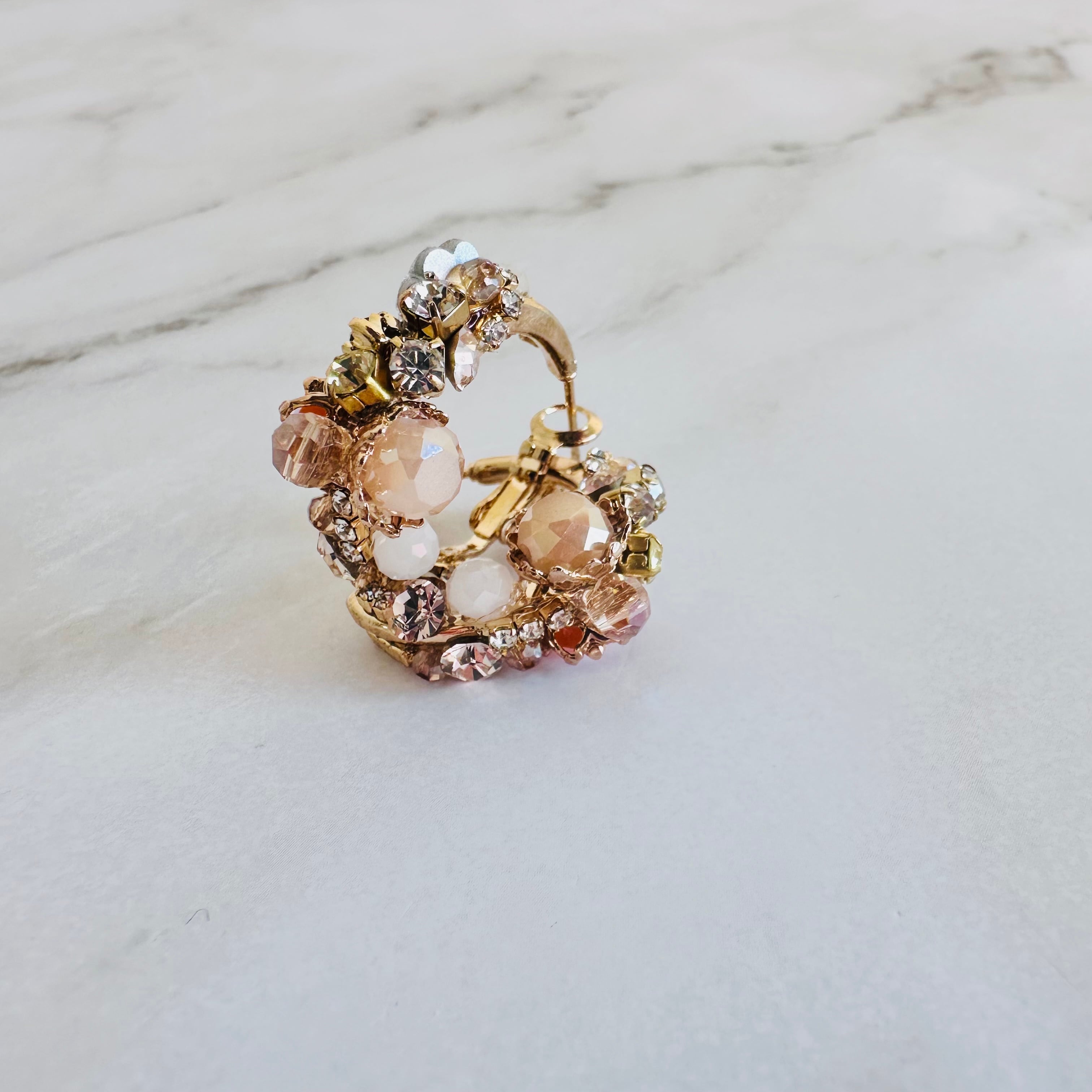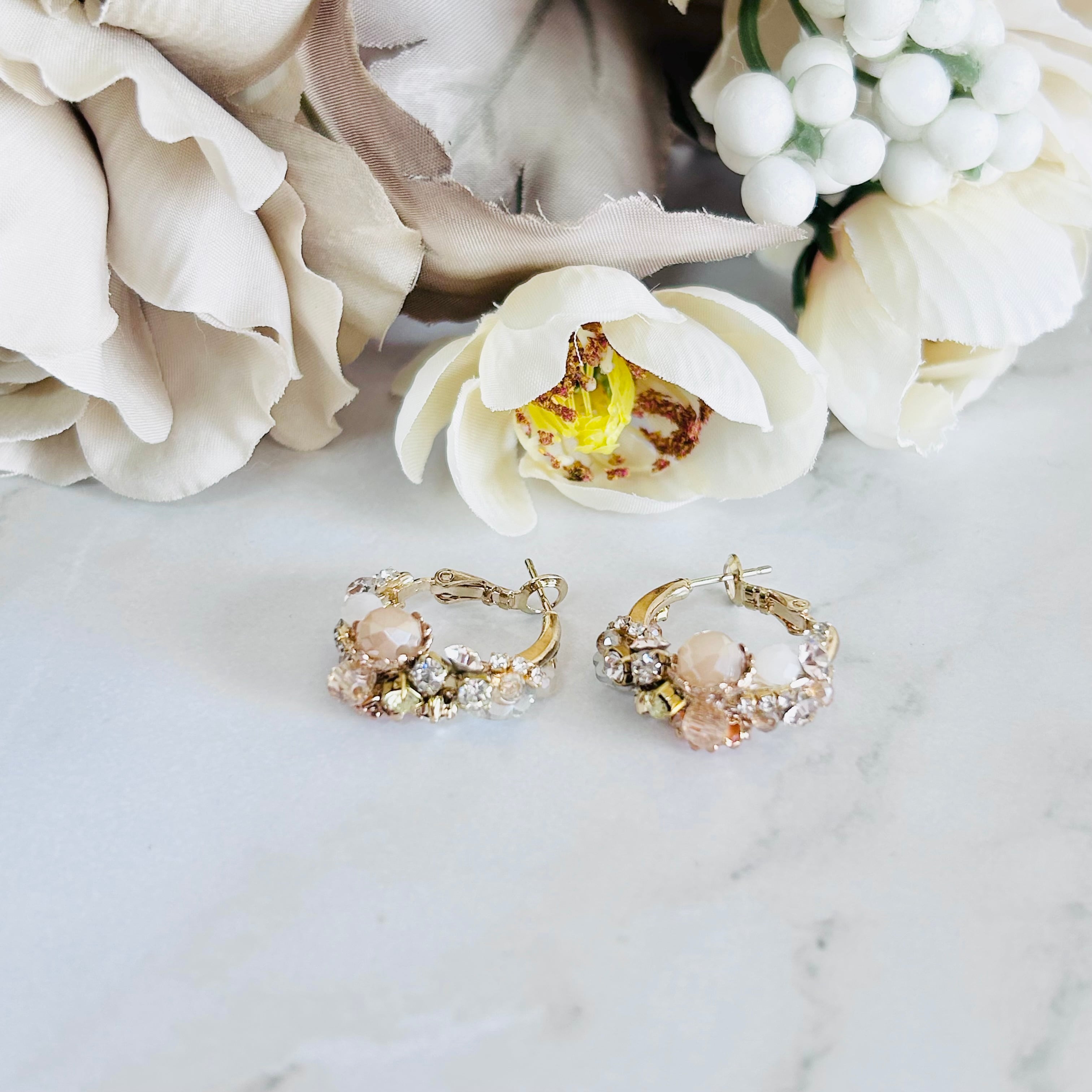 繊細なゴールドのフープに、淡いオレンジ系やベージュの美しいクリスタルビジューを贅沢にあしらったピアスです。