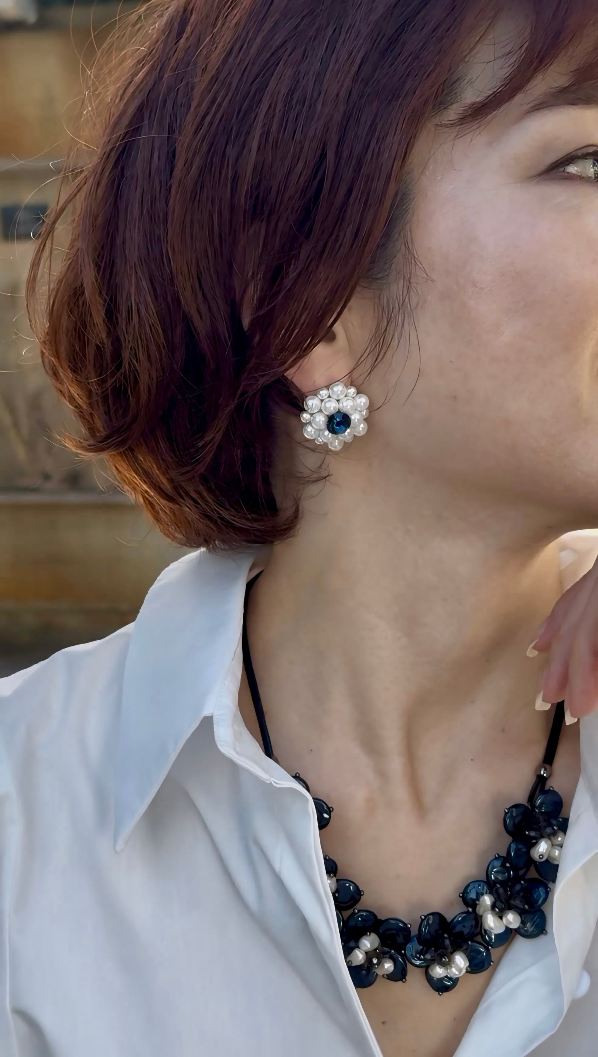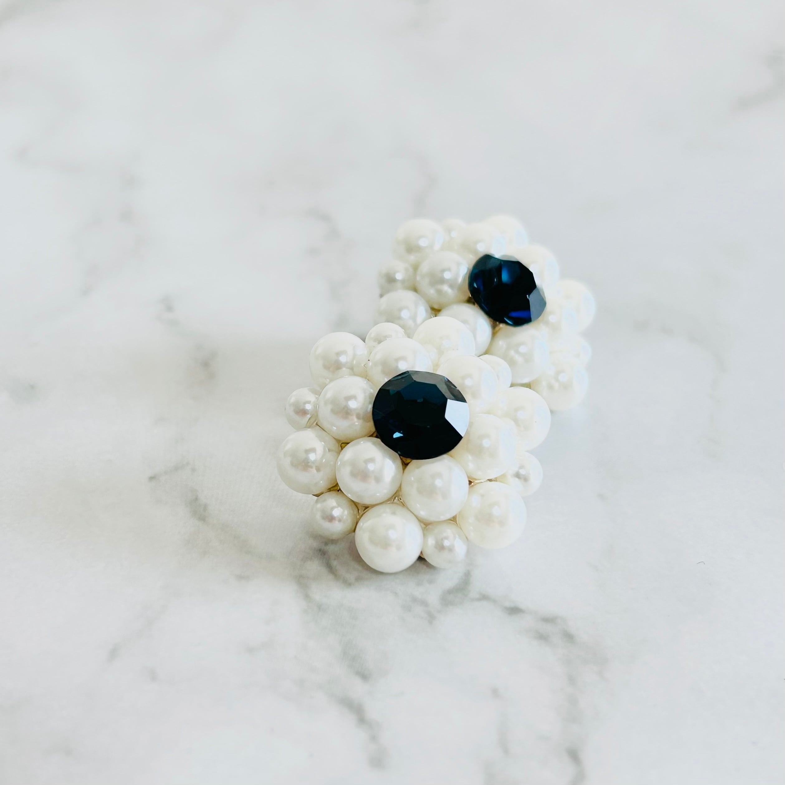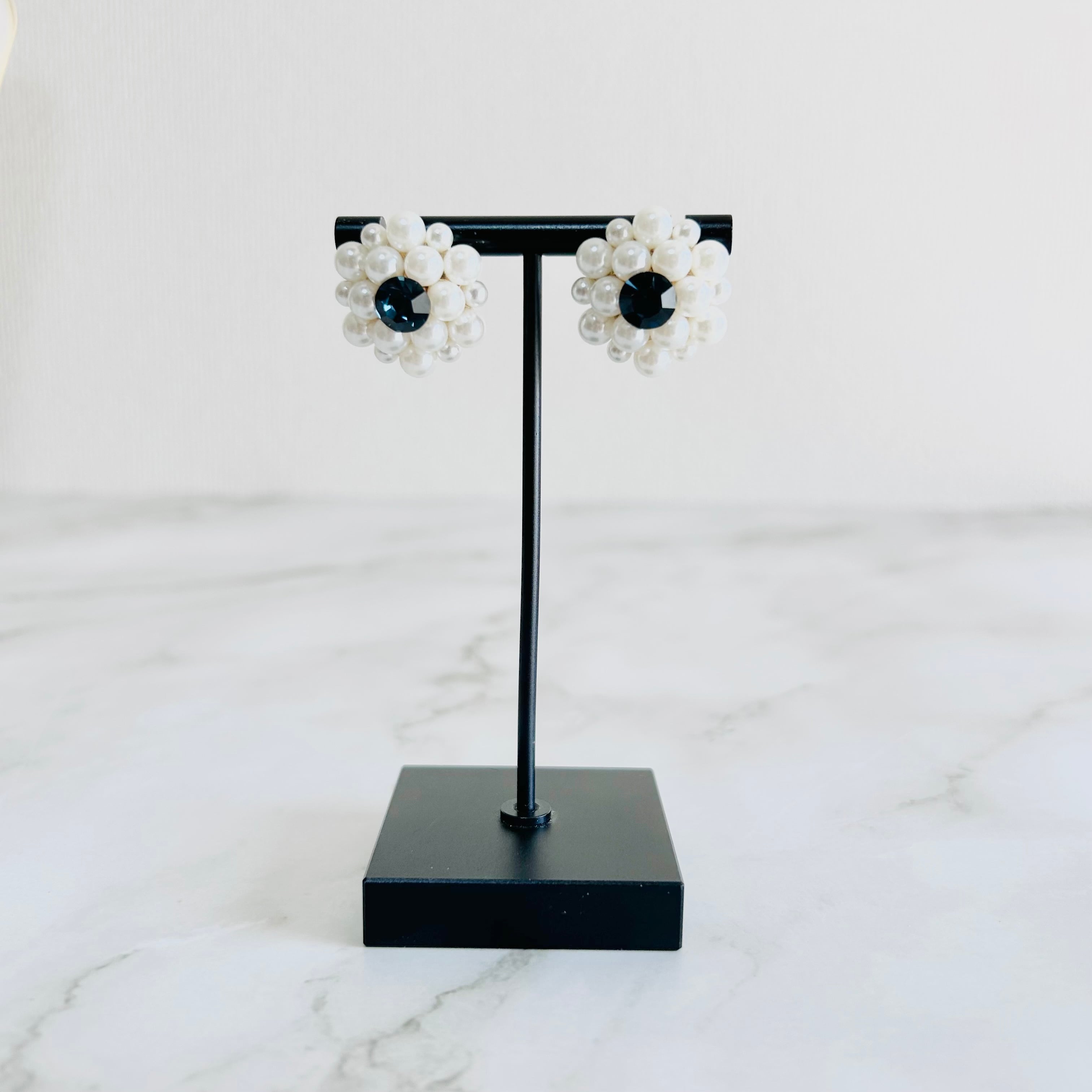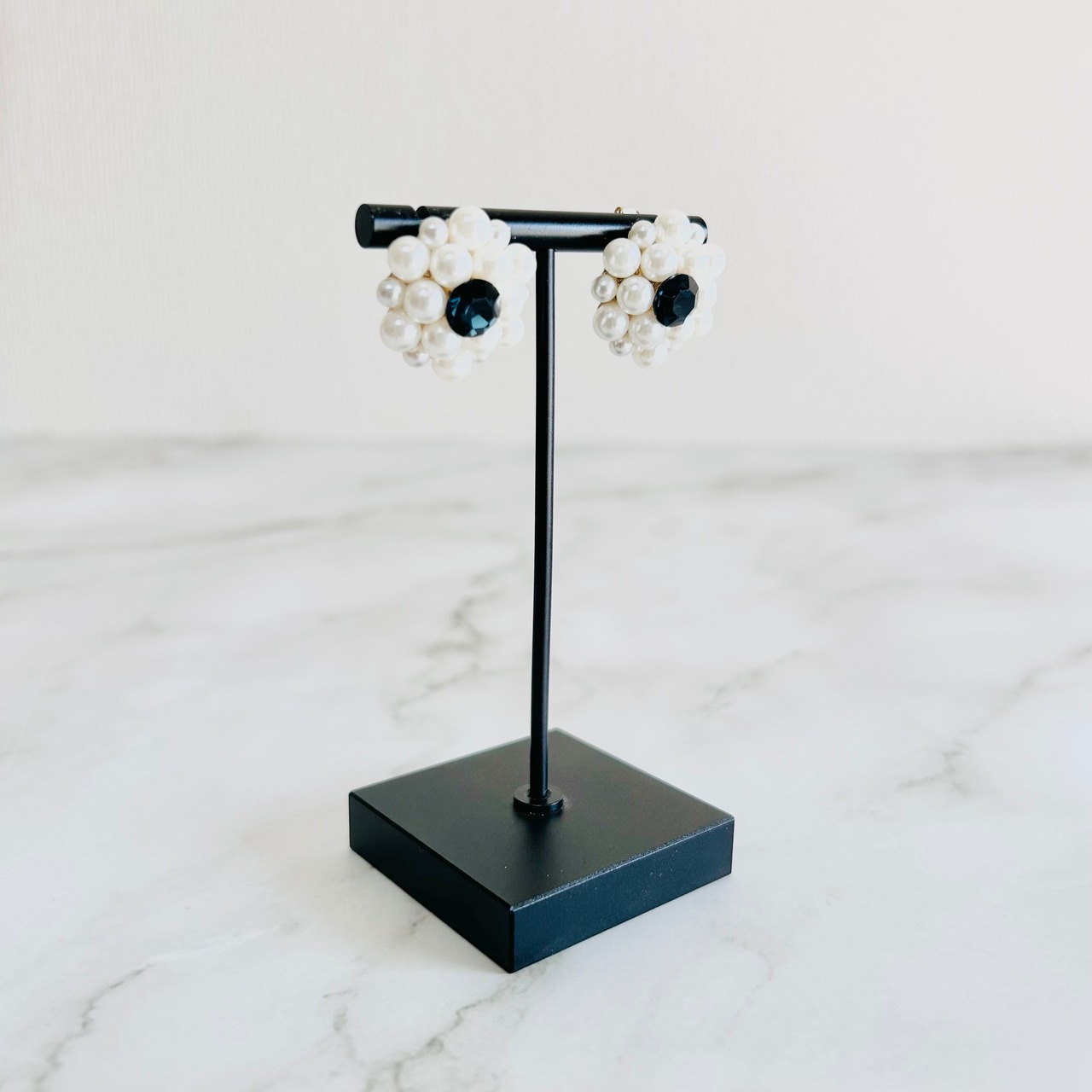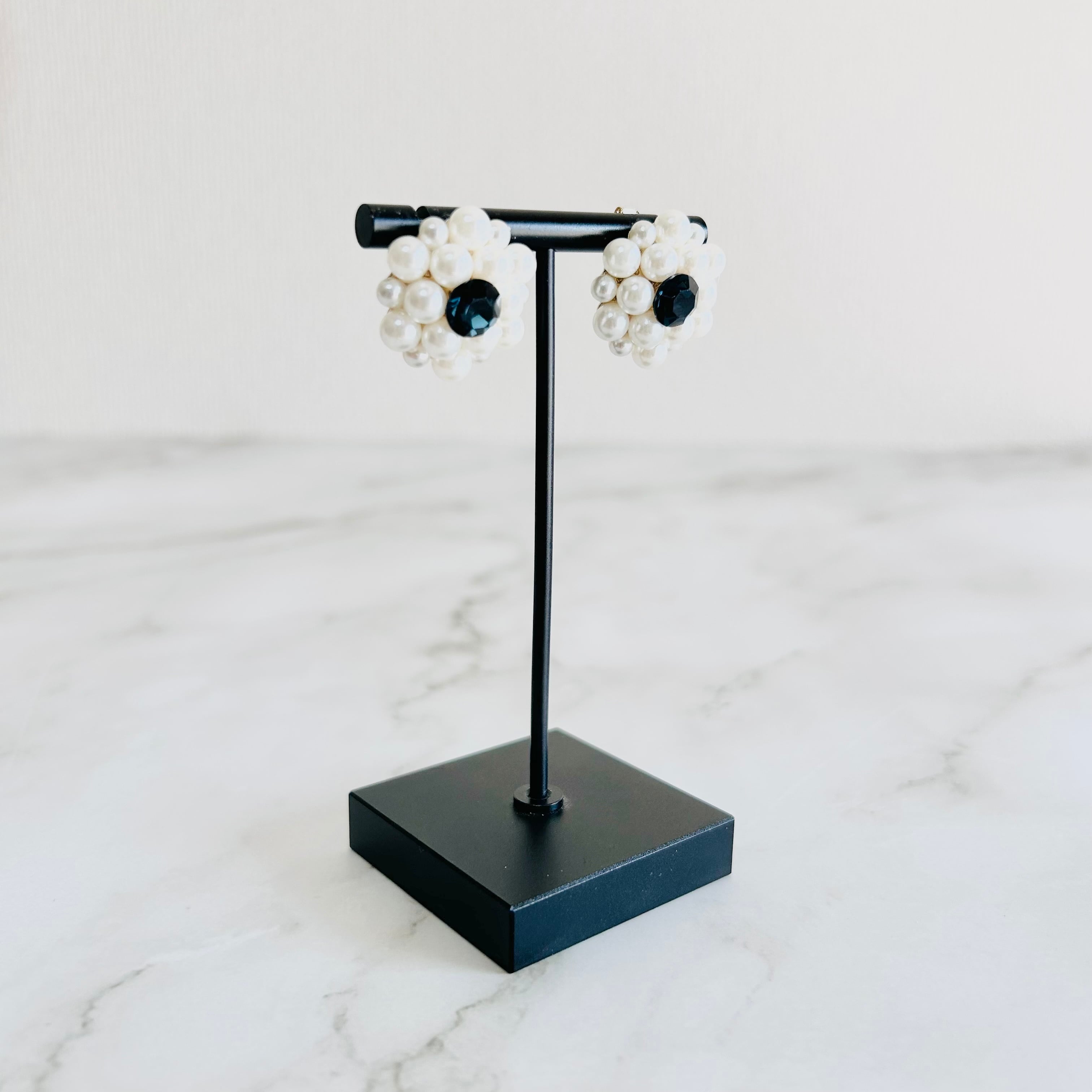 艶やかなパールを花びらのように並べ、中央にネイビーのビジューパーツを配したフラワーモチーフのピアスです。