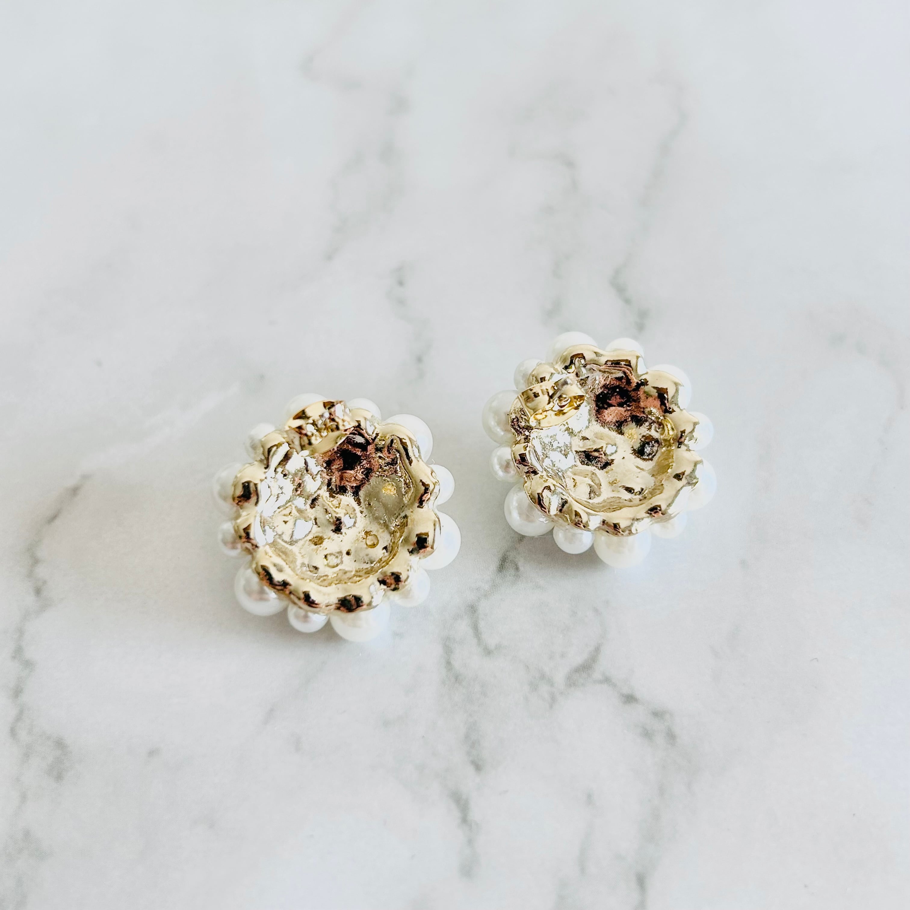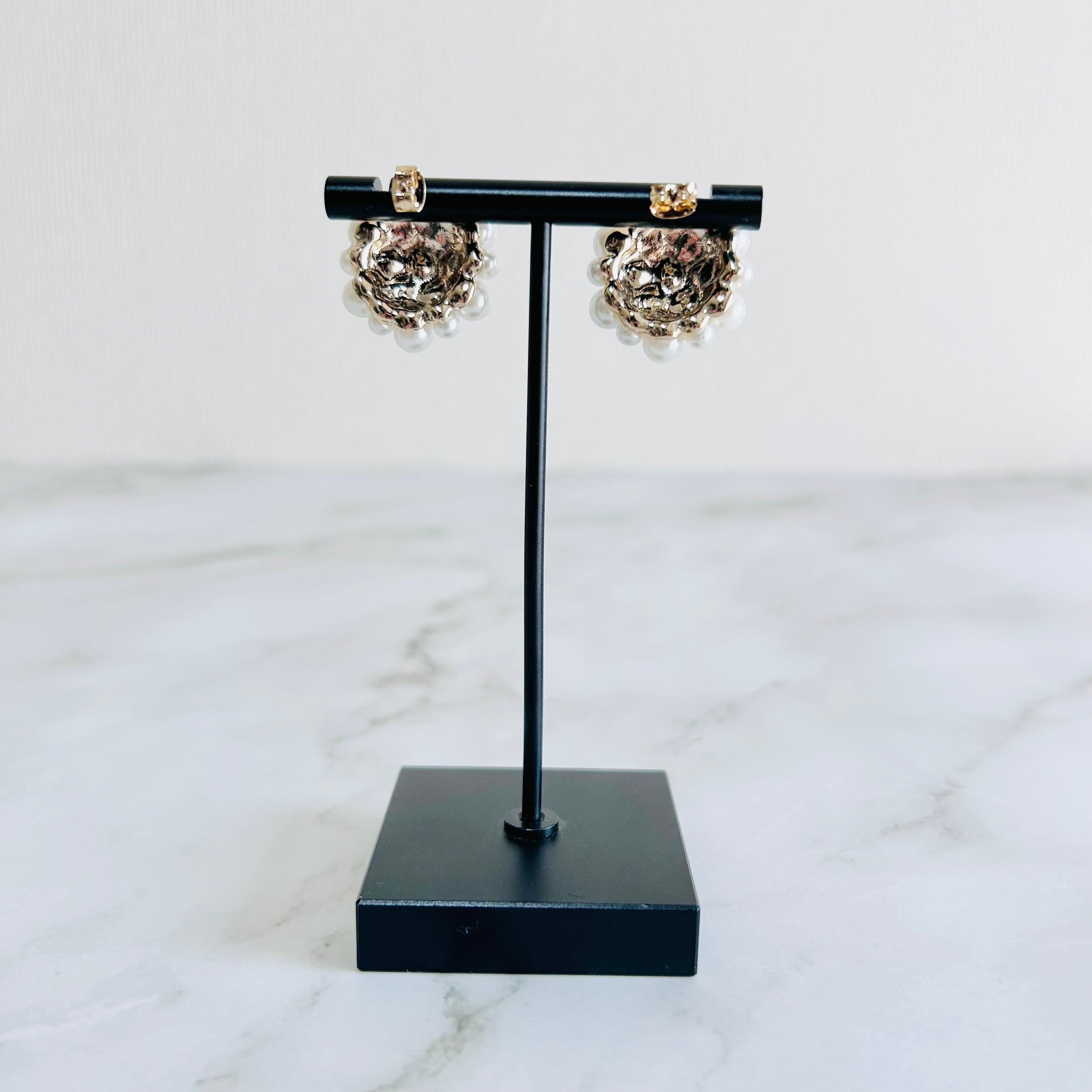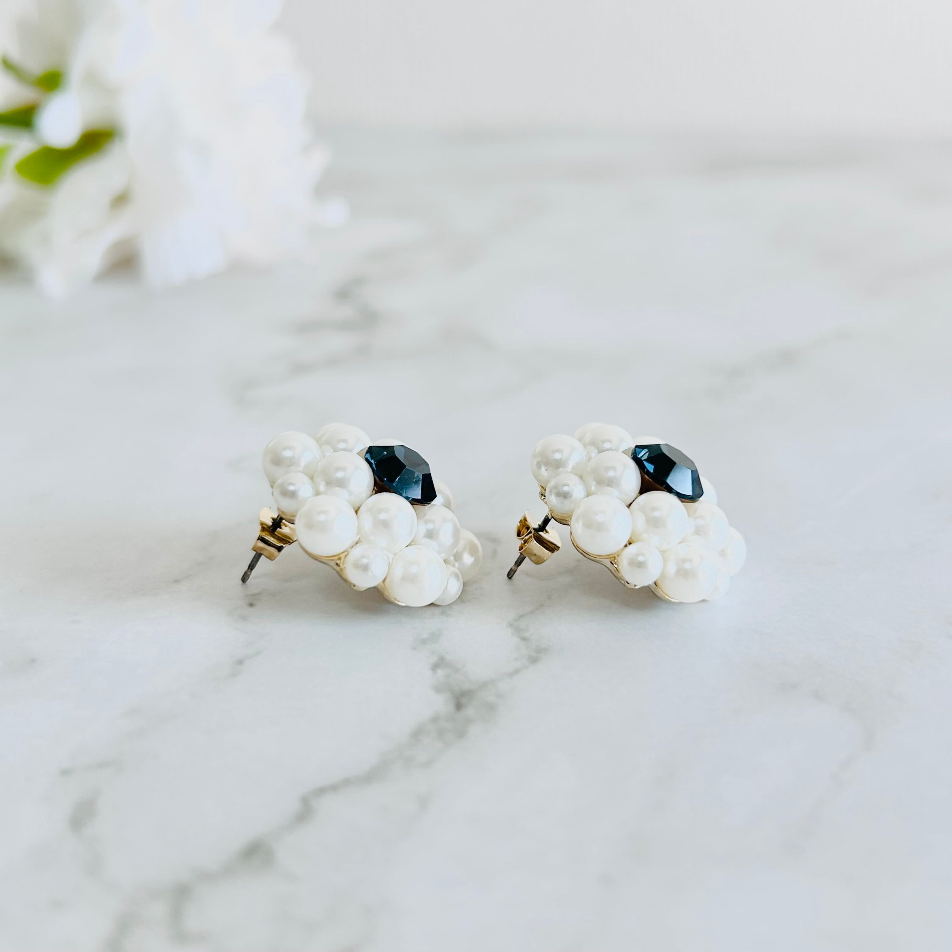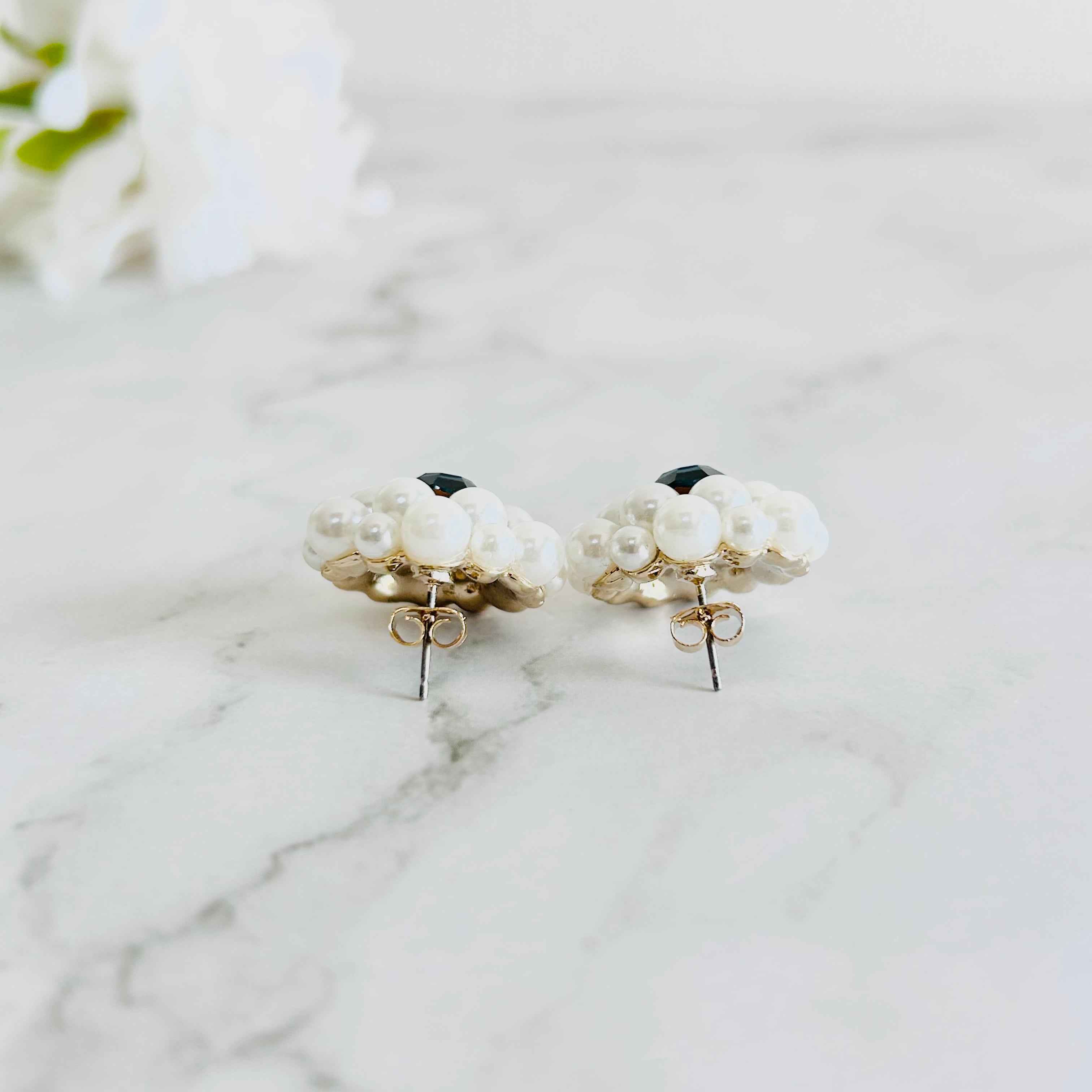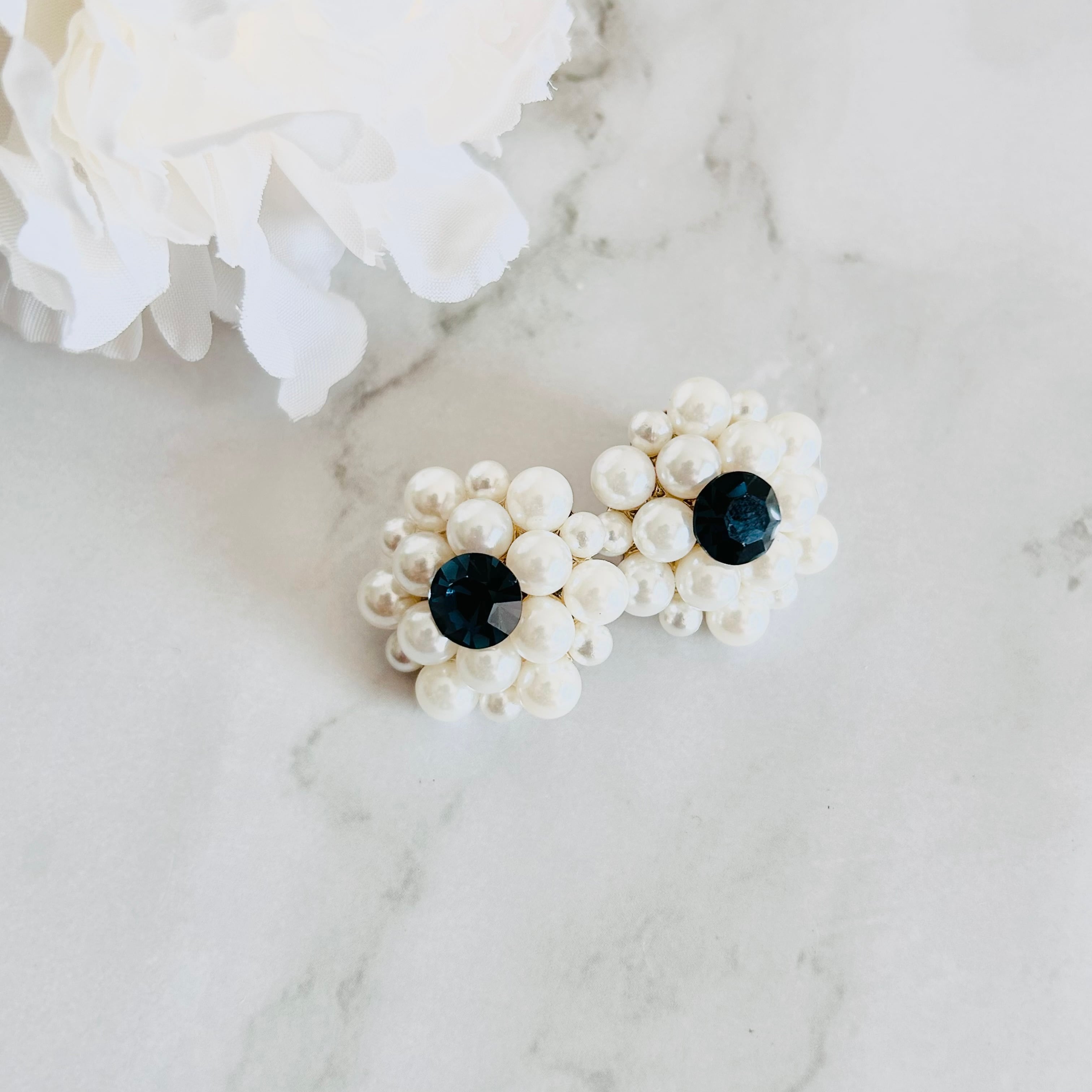 艶やかなパールを花びらのように並べ、中央にネイビーのビジューパーツを配したフラワーモチーフのピアスです。