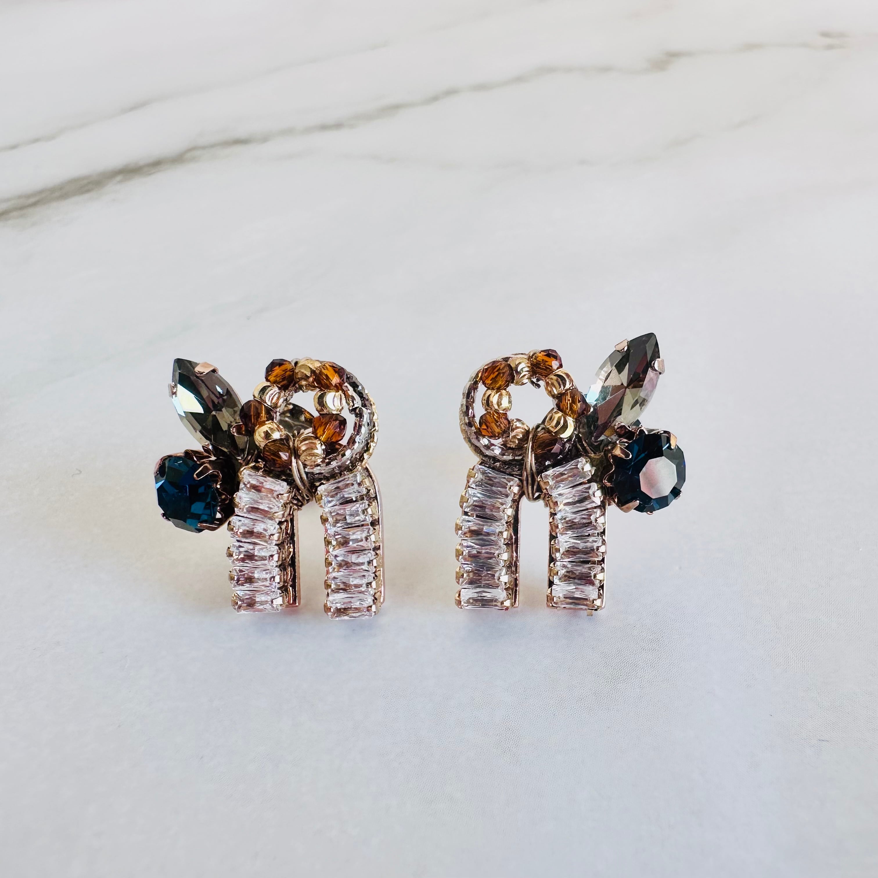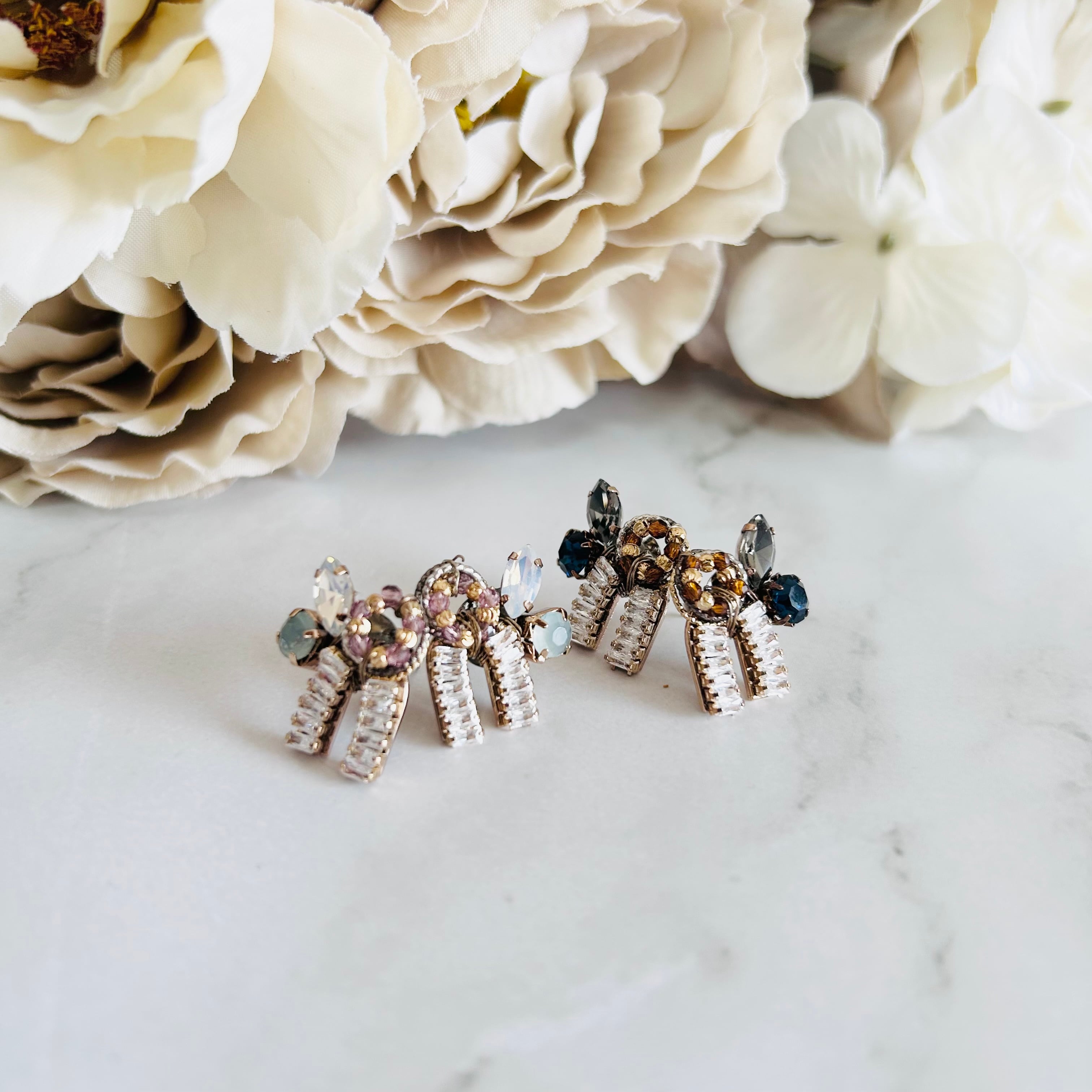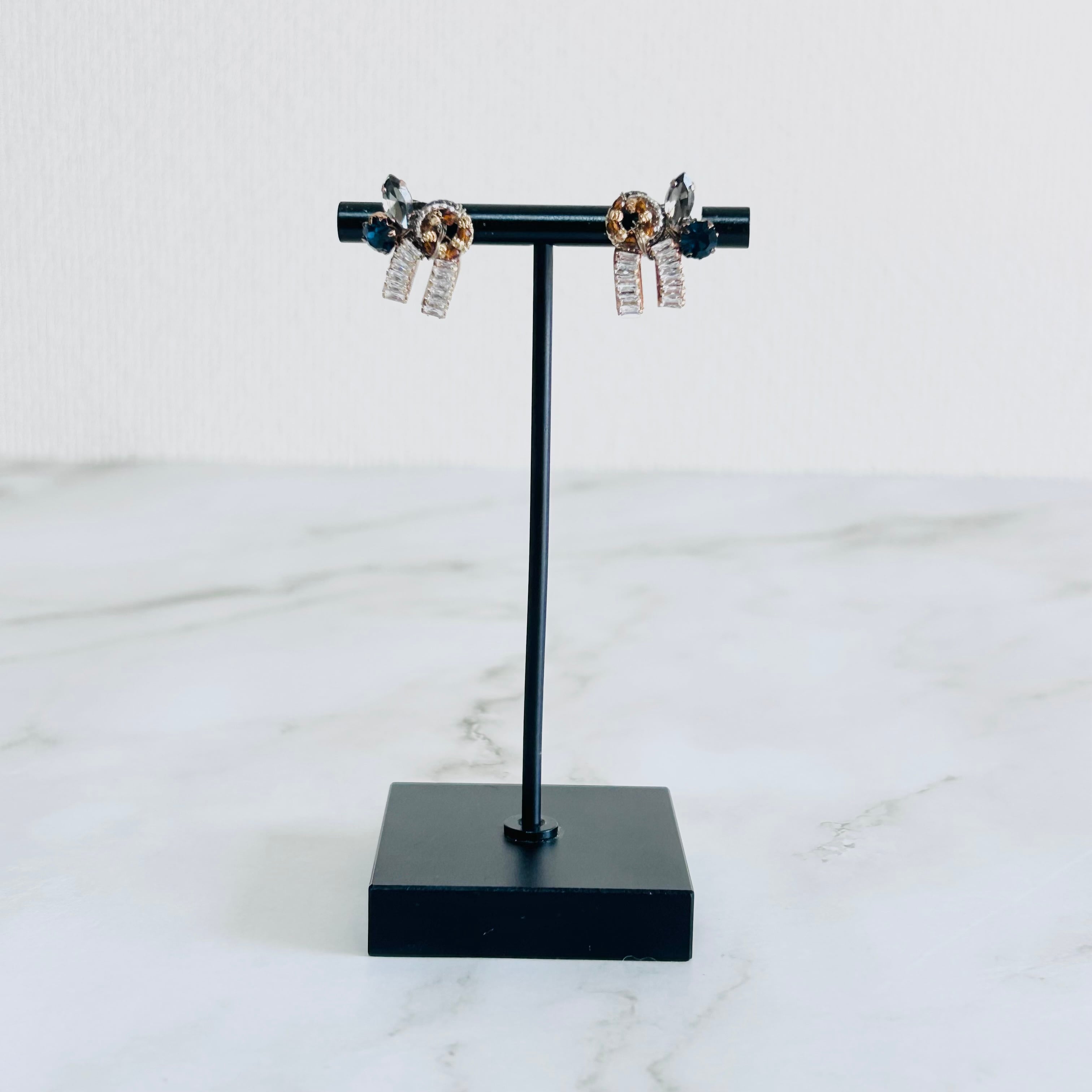 リボンのようなモチーフにクリスタルをあしらった、華やかで上品なピアスです。