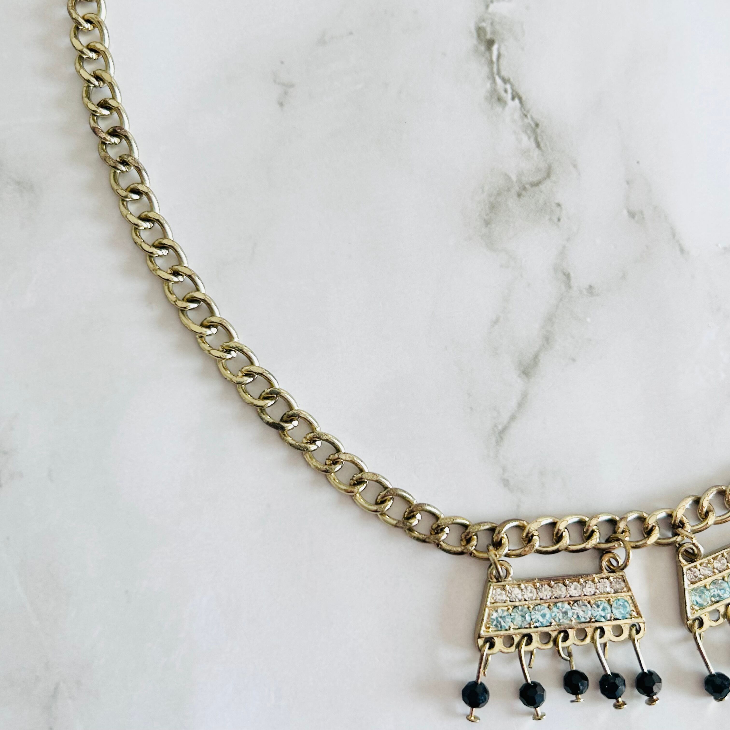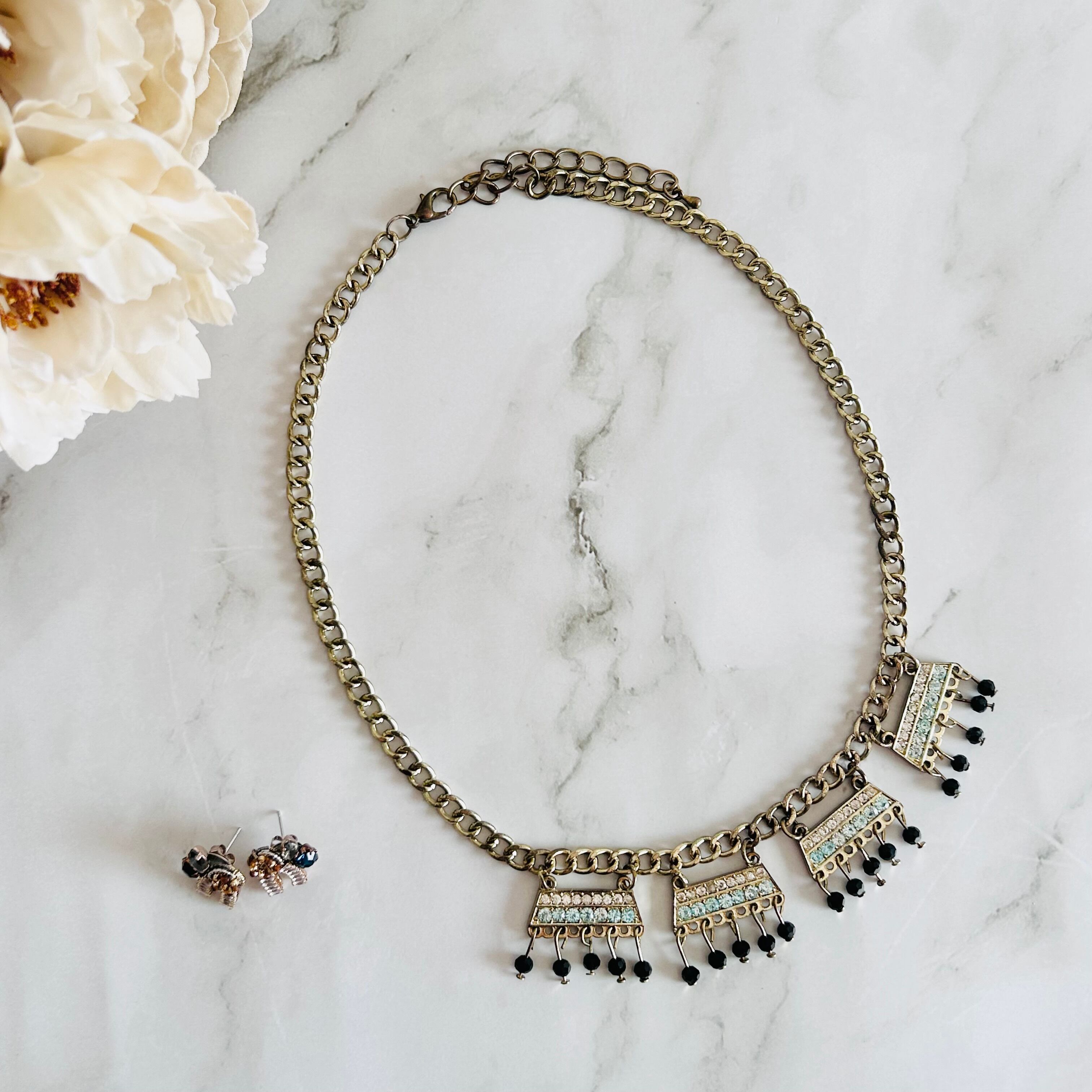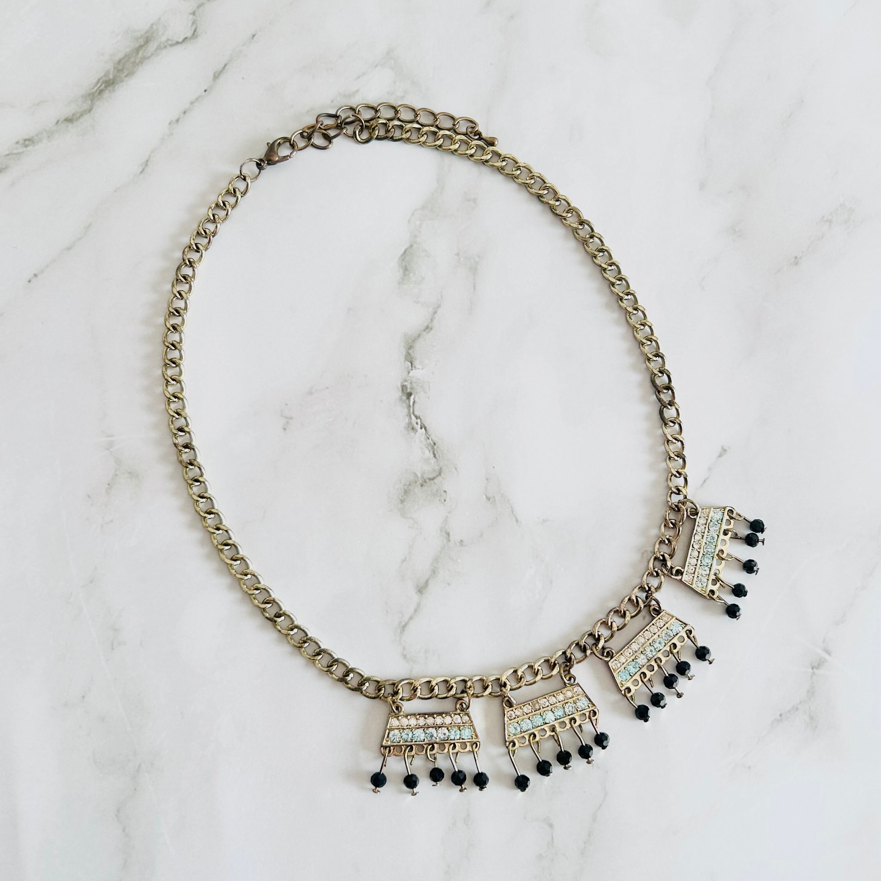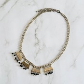 アンティーク調のゴールドチェーンに、4つのプレートモチーフが連なったデザインネックレスです。