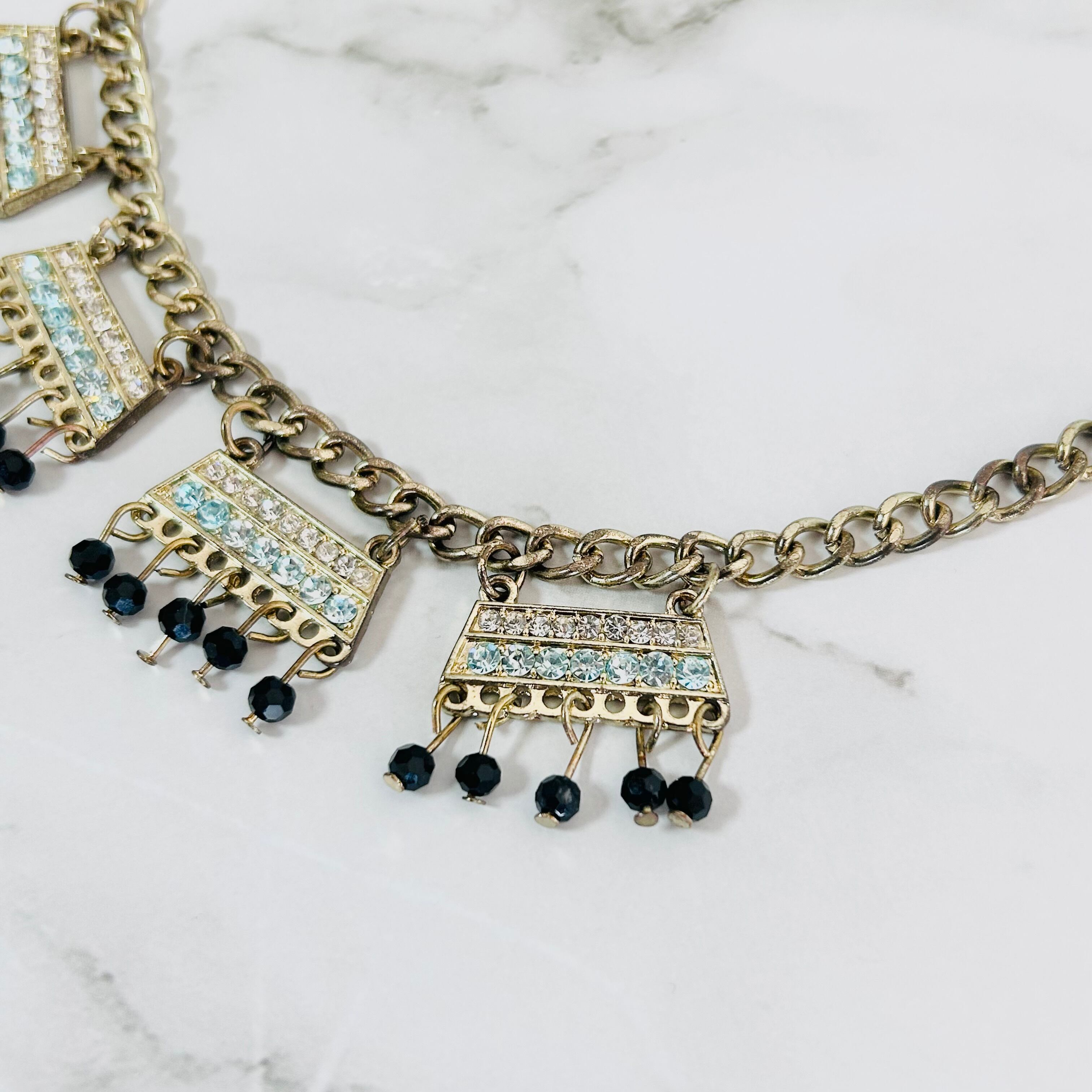 それぞれのプレートにはクリアカラーやライトブルーの繊細なラインストーンがあしらわれ、下部には小さなブラックビーズが揺れるユニークな仕立てになっています。