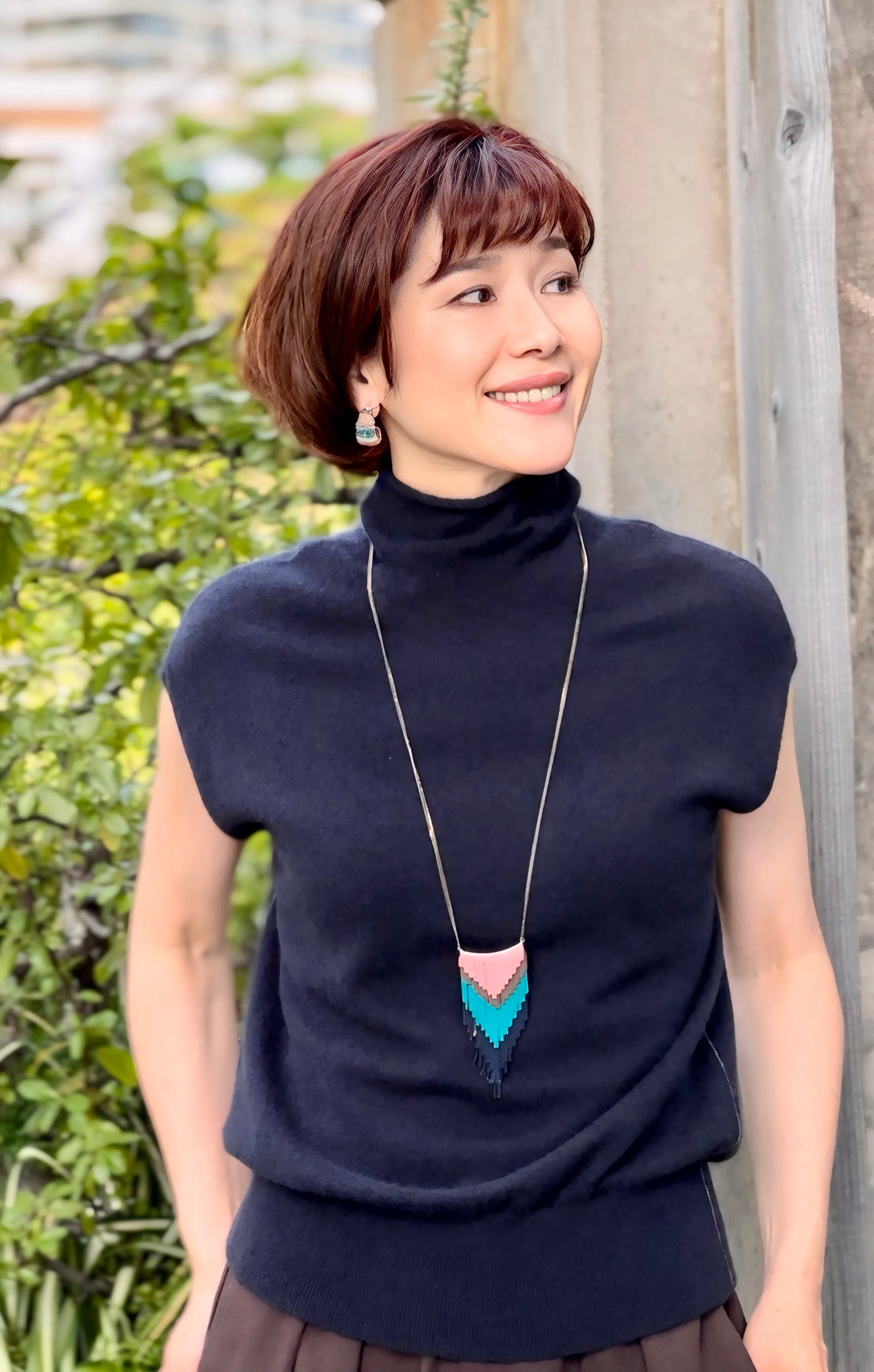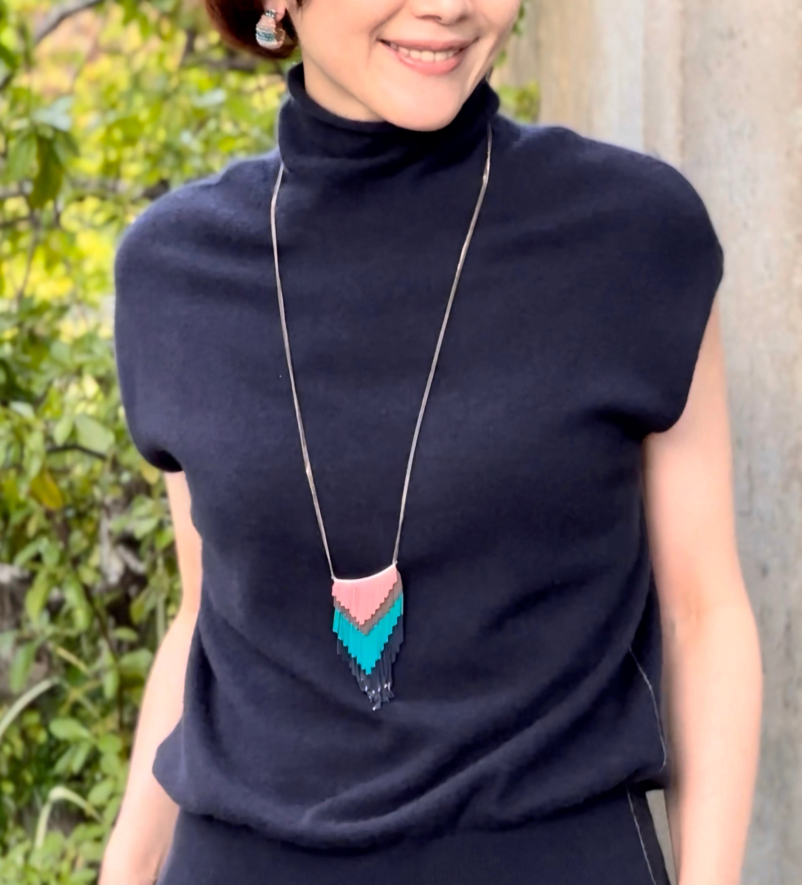 しなやかに垂れるフリンジは動くたびに揺れ、まるで羽根やタッセルのような軽やかな印象を与えてくれます。