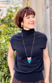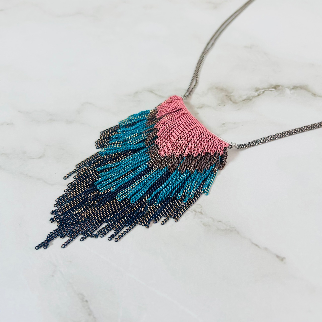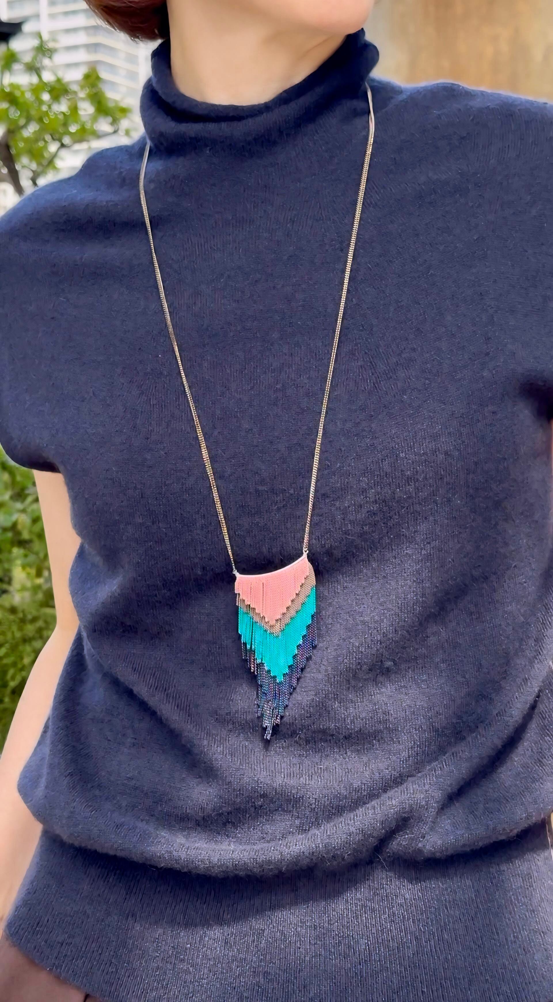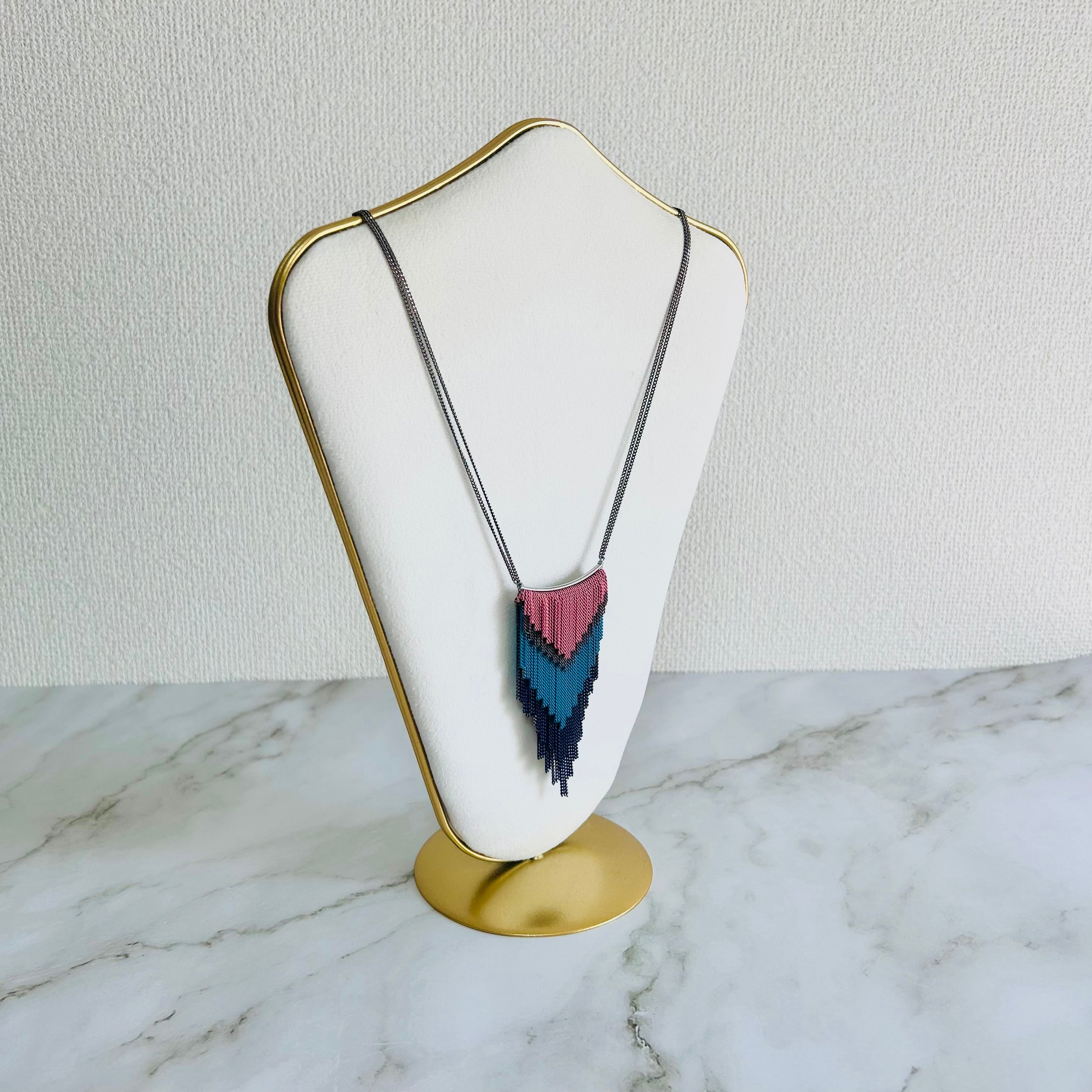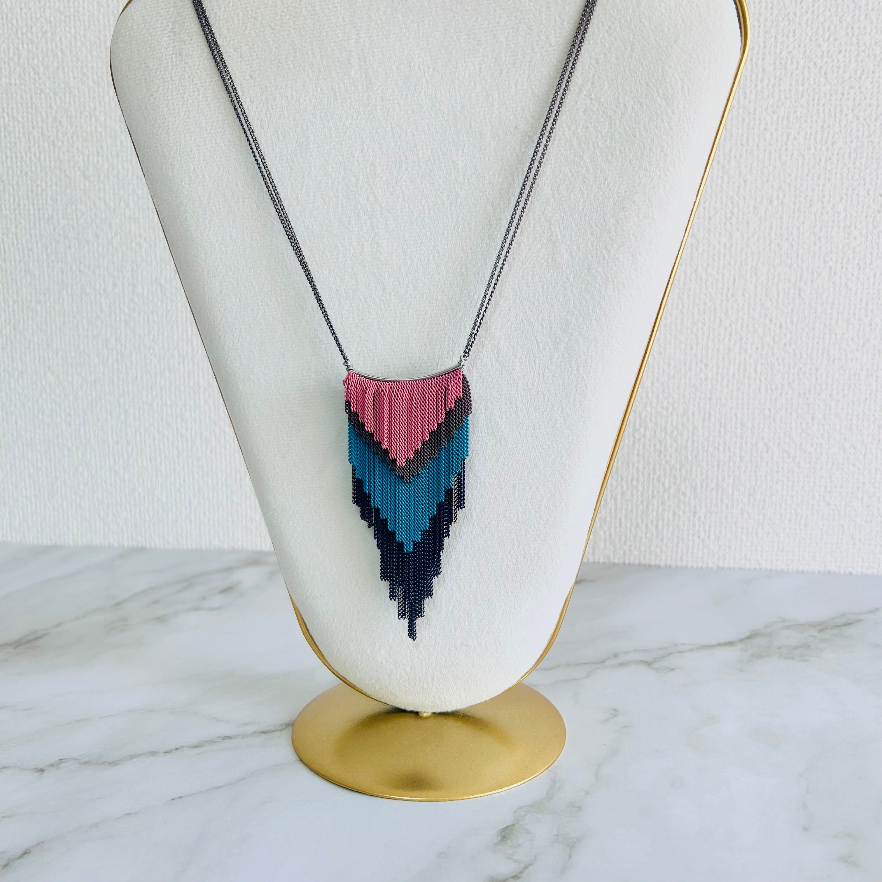 ピンク・グレージュブルー・ネイビーのチェーンを重ね、流れるようなフリンジデザインに仕上げたロングネックレスです。