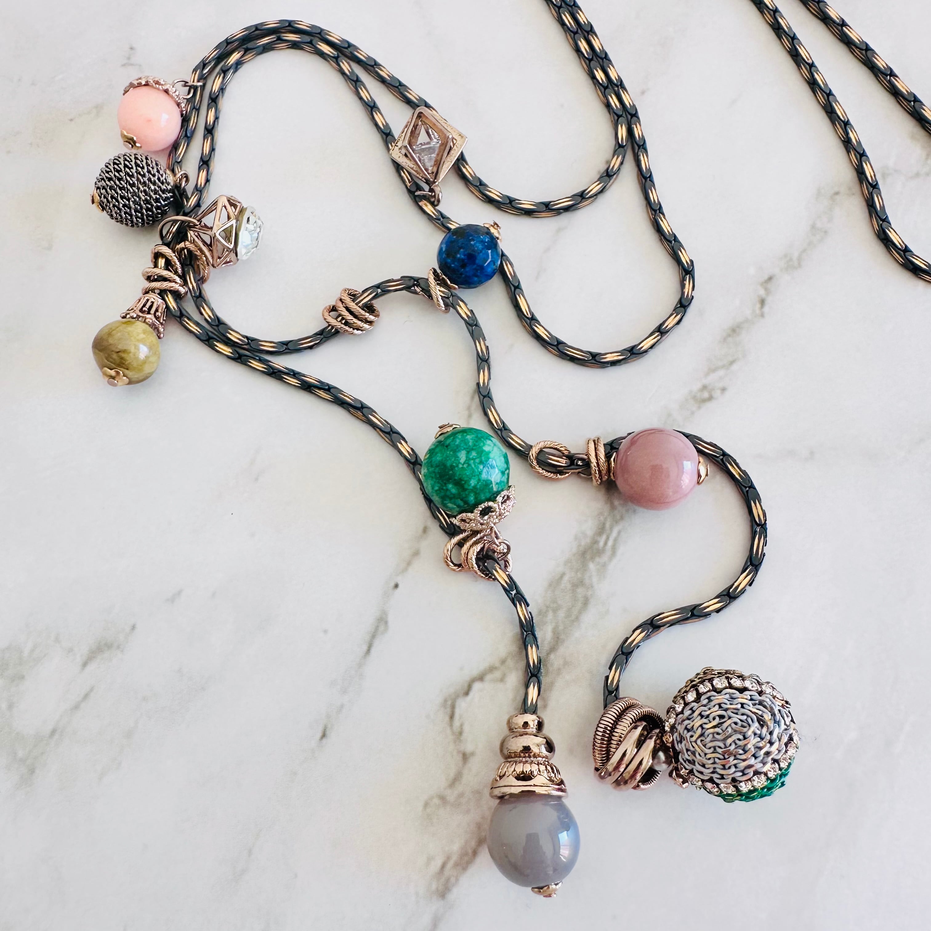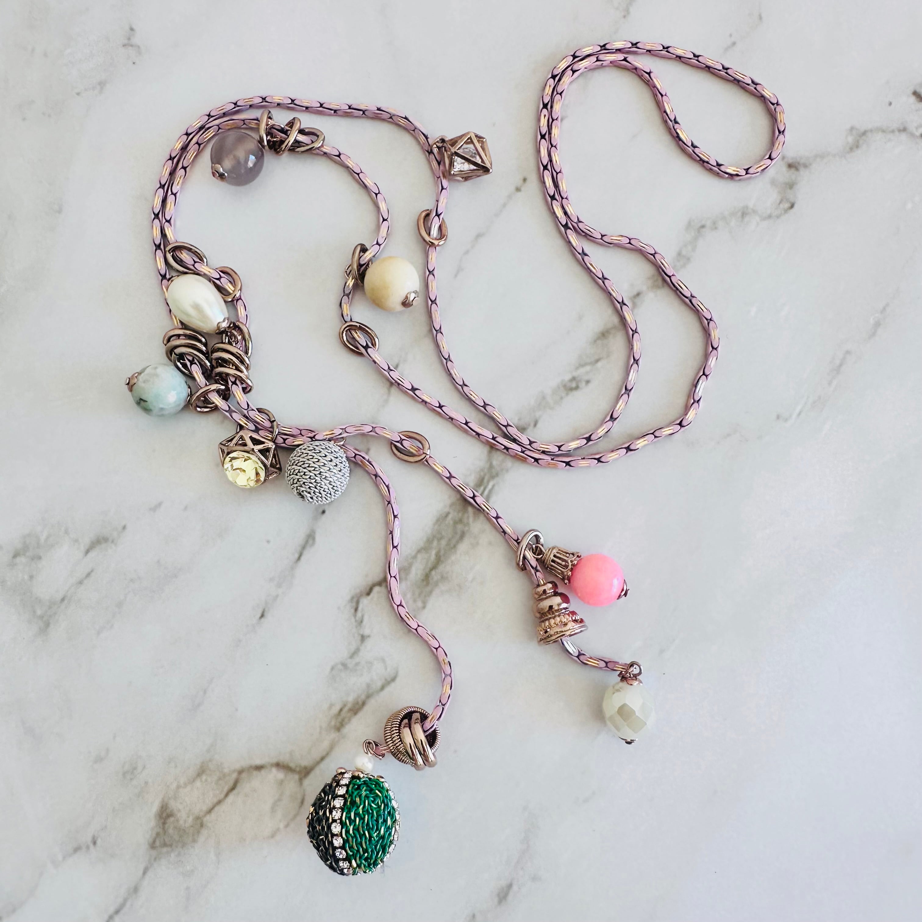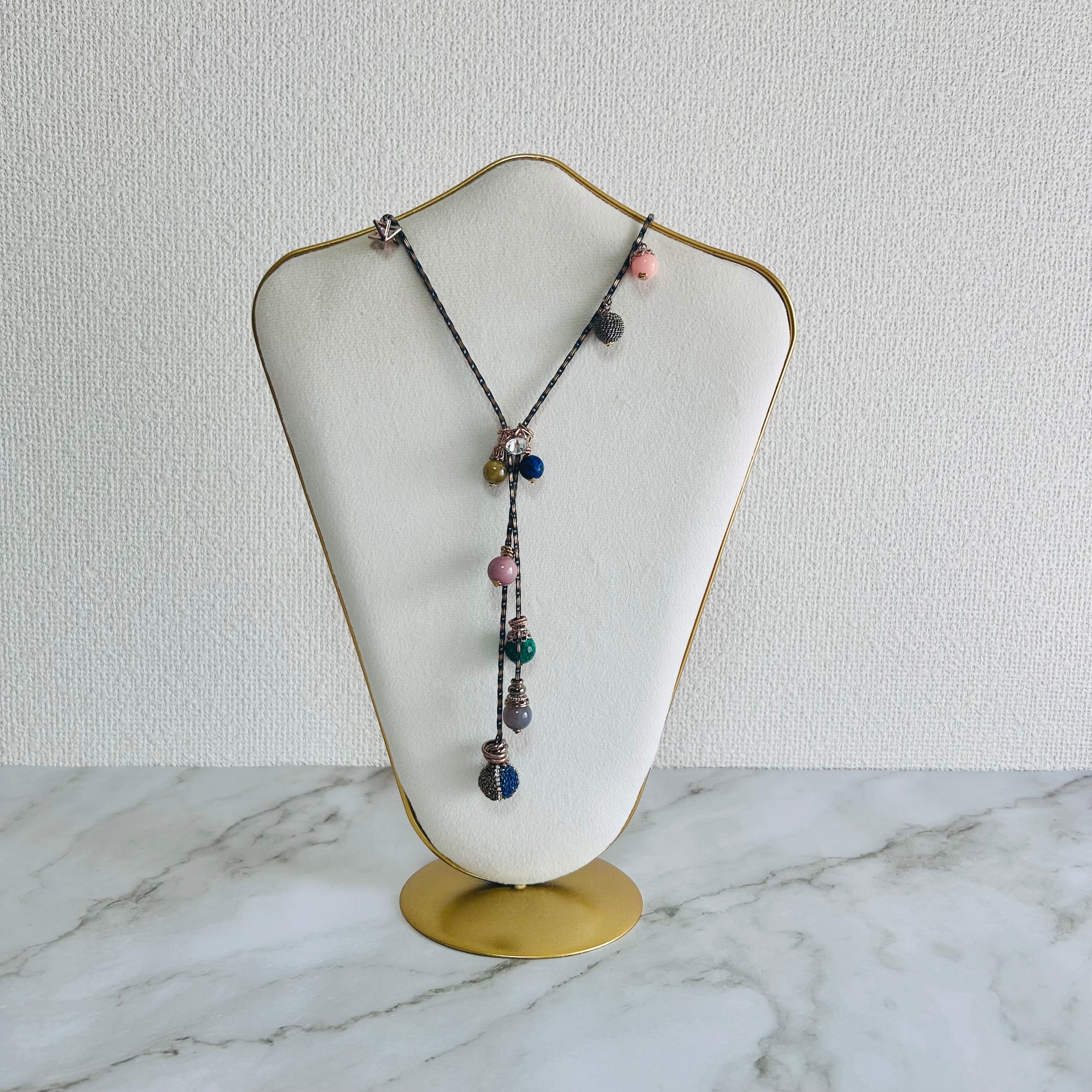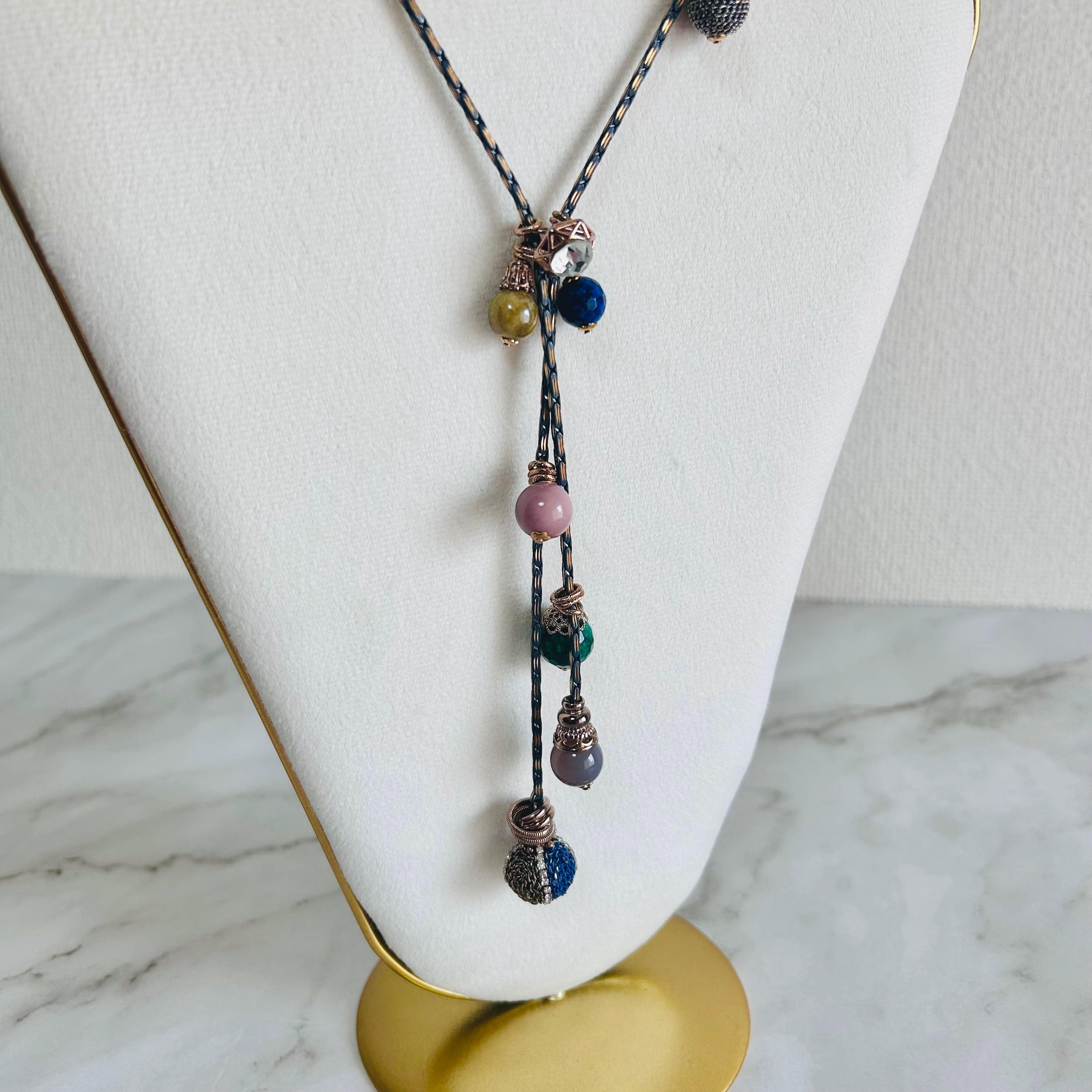 色の入ったおしゃれなチェーンに、大小さまざまな天然石やクリスタル、パールなどのチャームを散りばめた存在感のあるラリエットネックレスです。