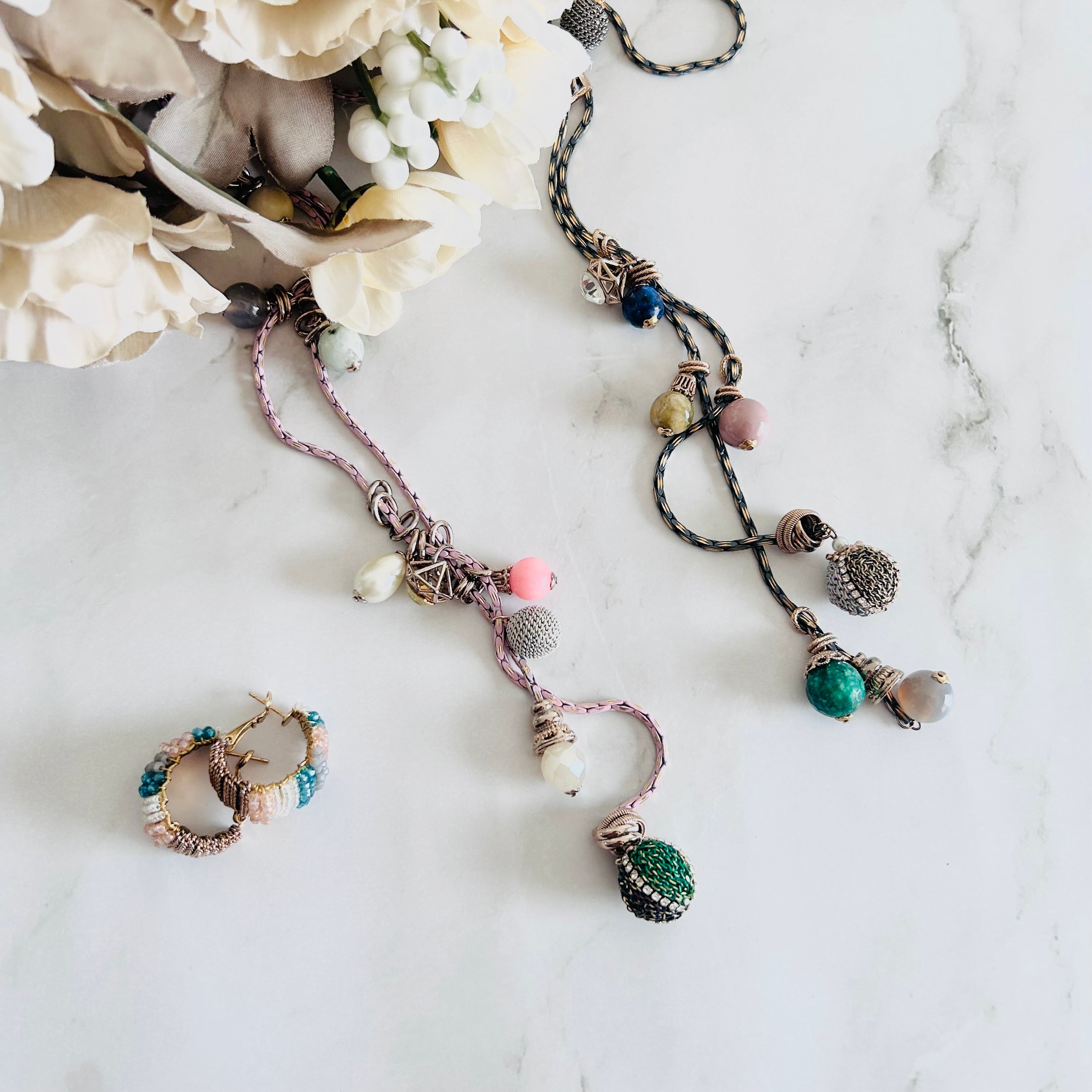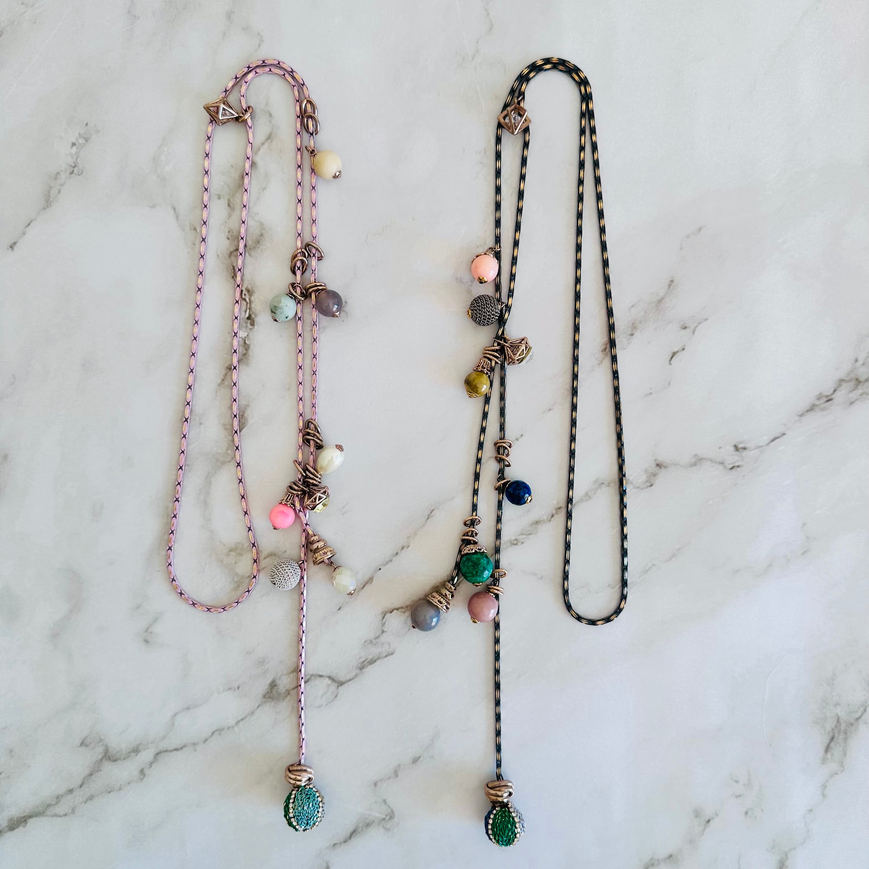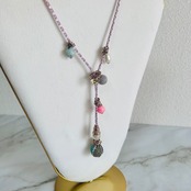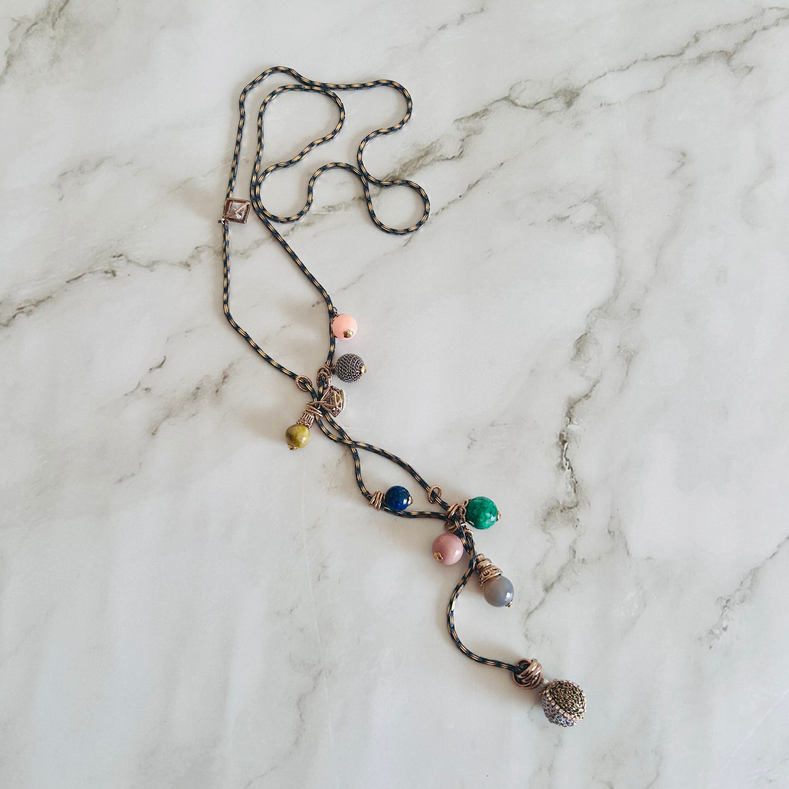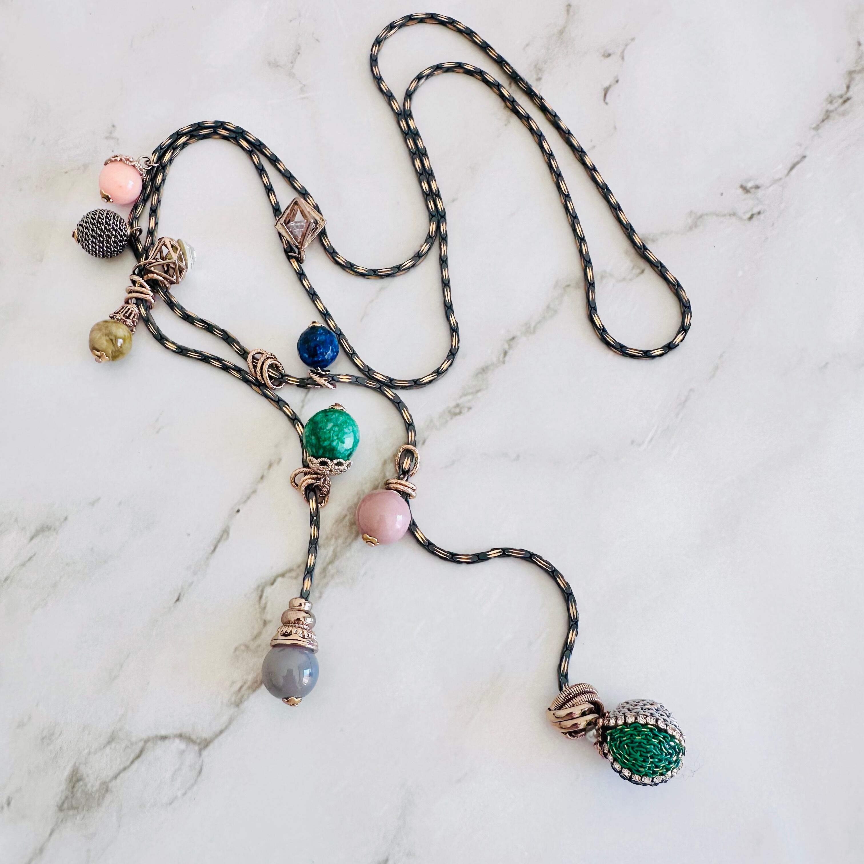 色の入ったおしゃれなチェーンに、大小さまざまな天然石やクリスタル、パールなどのチャームを散りばめた存在感のあるラリエットネックレスです。