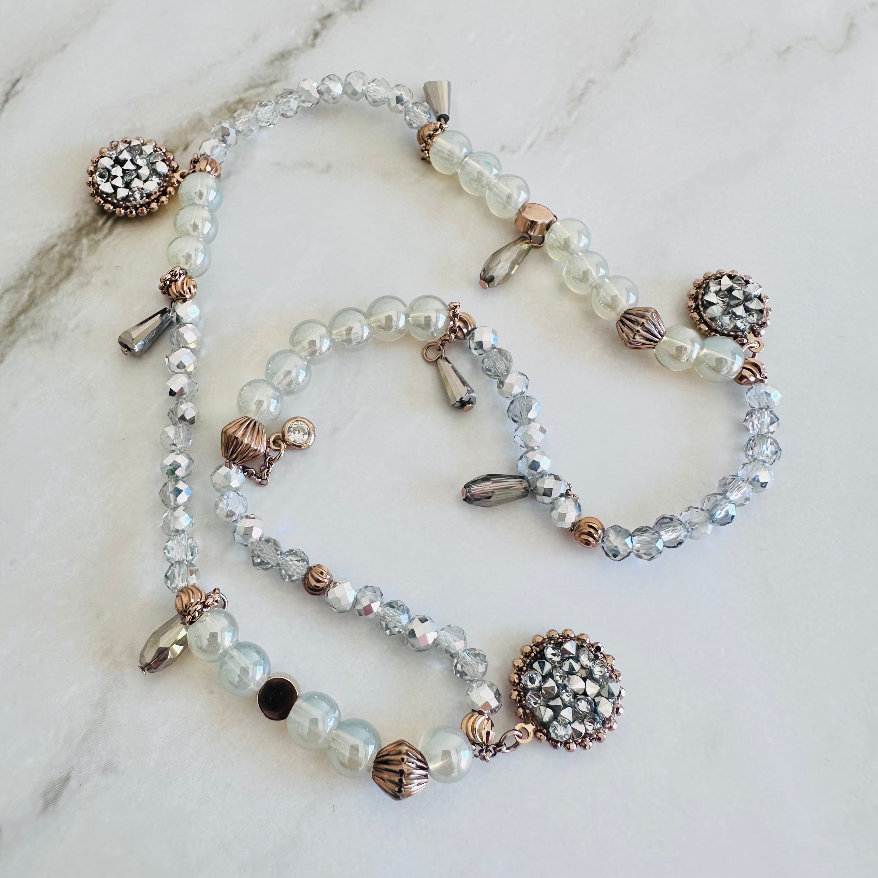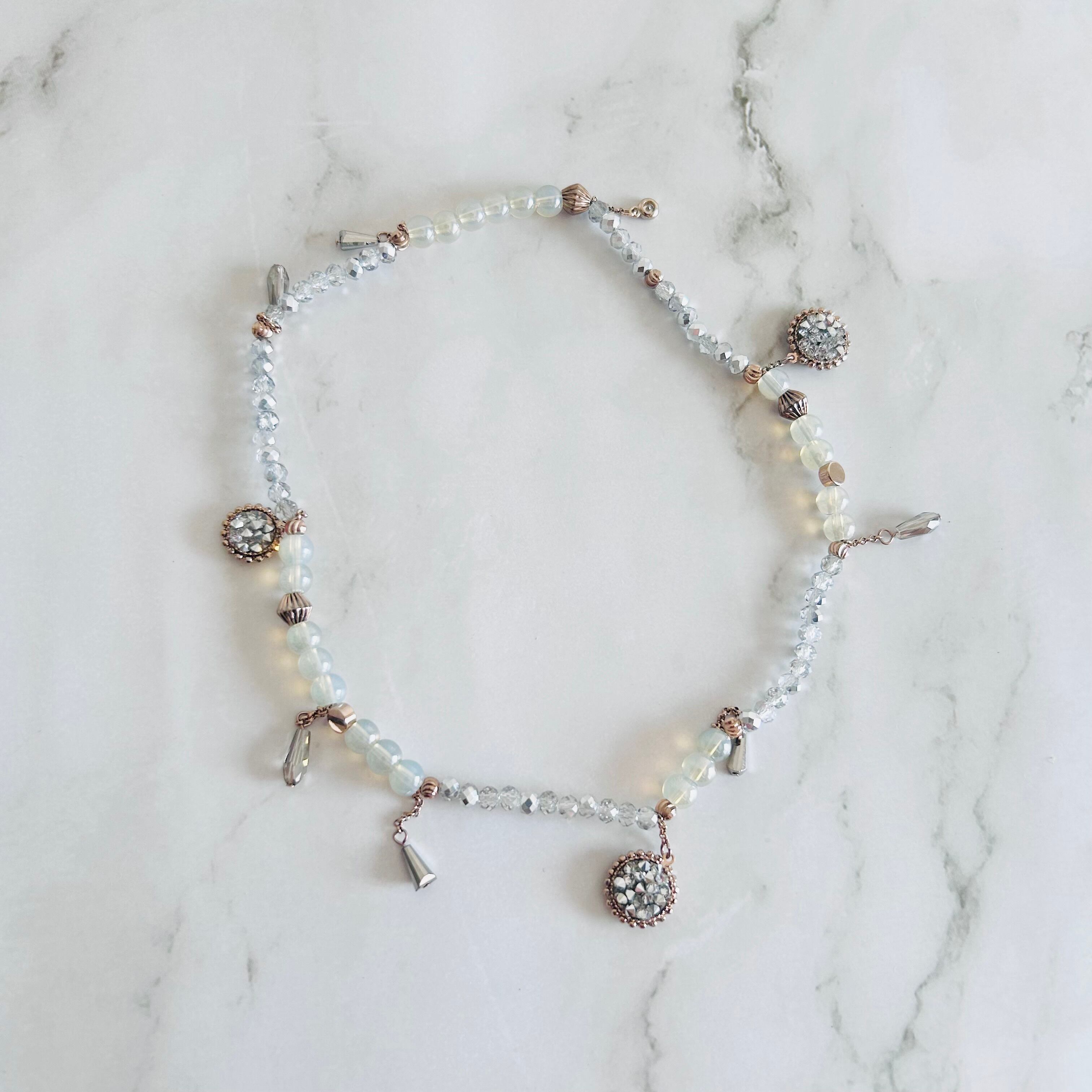 淡いグレーやオーロラに輝くビーズを組み合わせた、みずみずしく爽やかなデザイン。