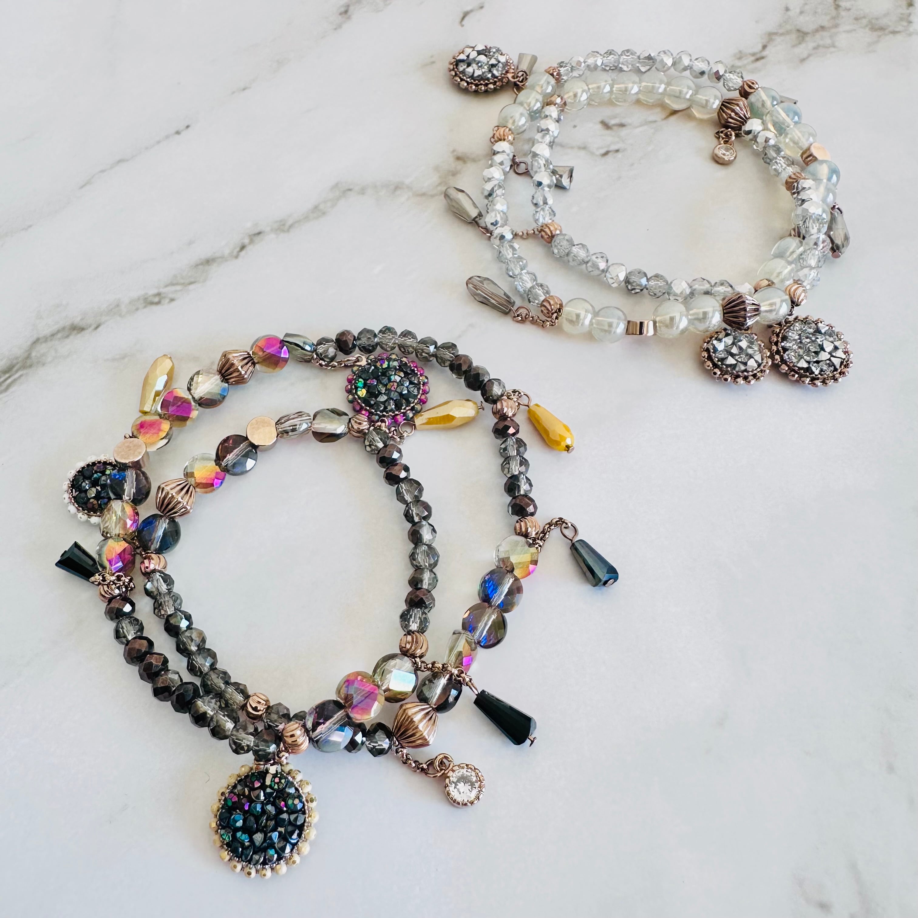 透明感あふれるクリスタルビーズやチャームを贅沢にあしらった、シリコンゴム素材で伸縮性のあるブレスレットです。
