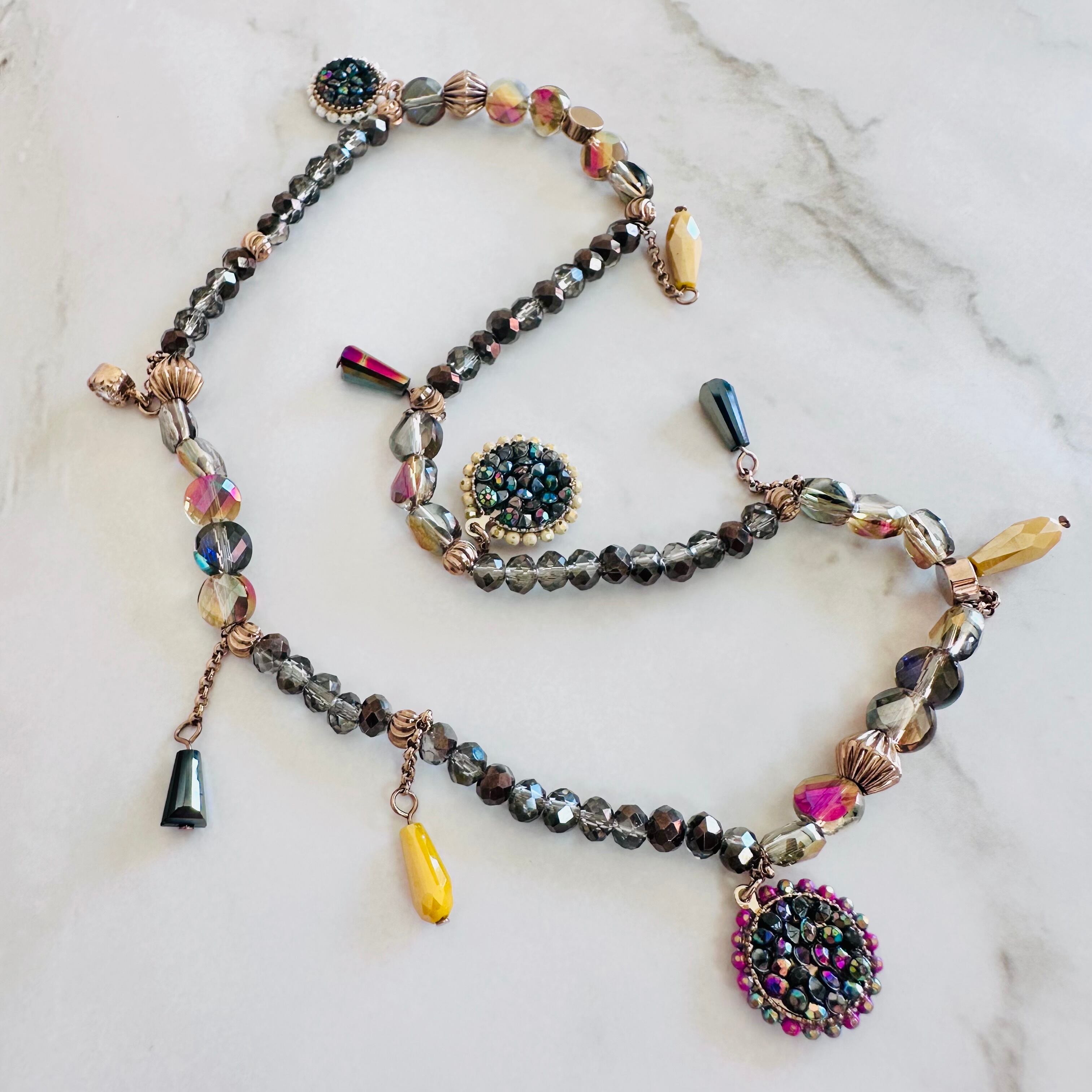 深みのあるダークカラーや偏光ビーズに、イエローの差し色を効かせたシックなデザイン。