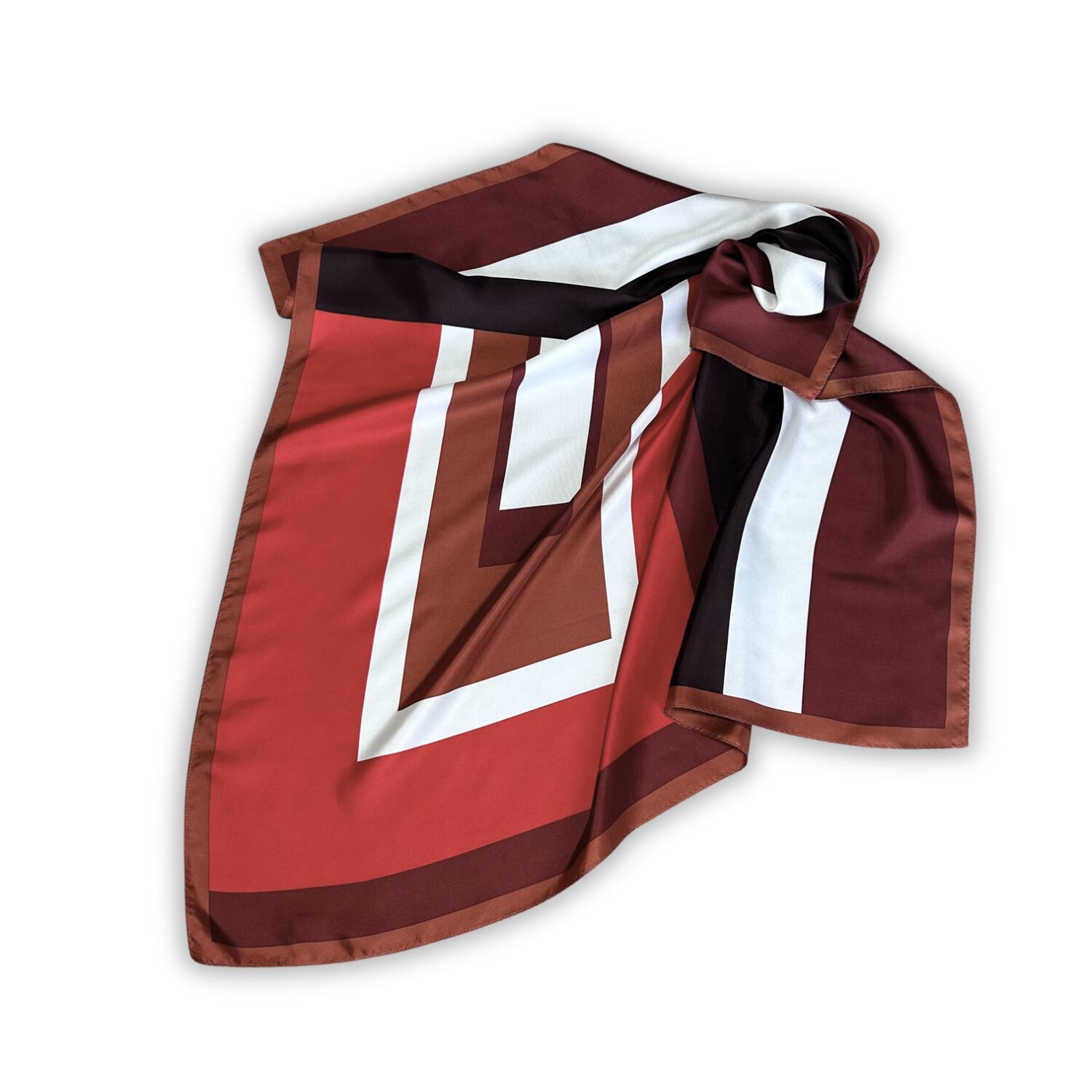 大胆なスクエアモチーフが重なり合うデザインは、巻き方によって見え方が変化し、コーディネートに立体感とリズムを与えてくれます。