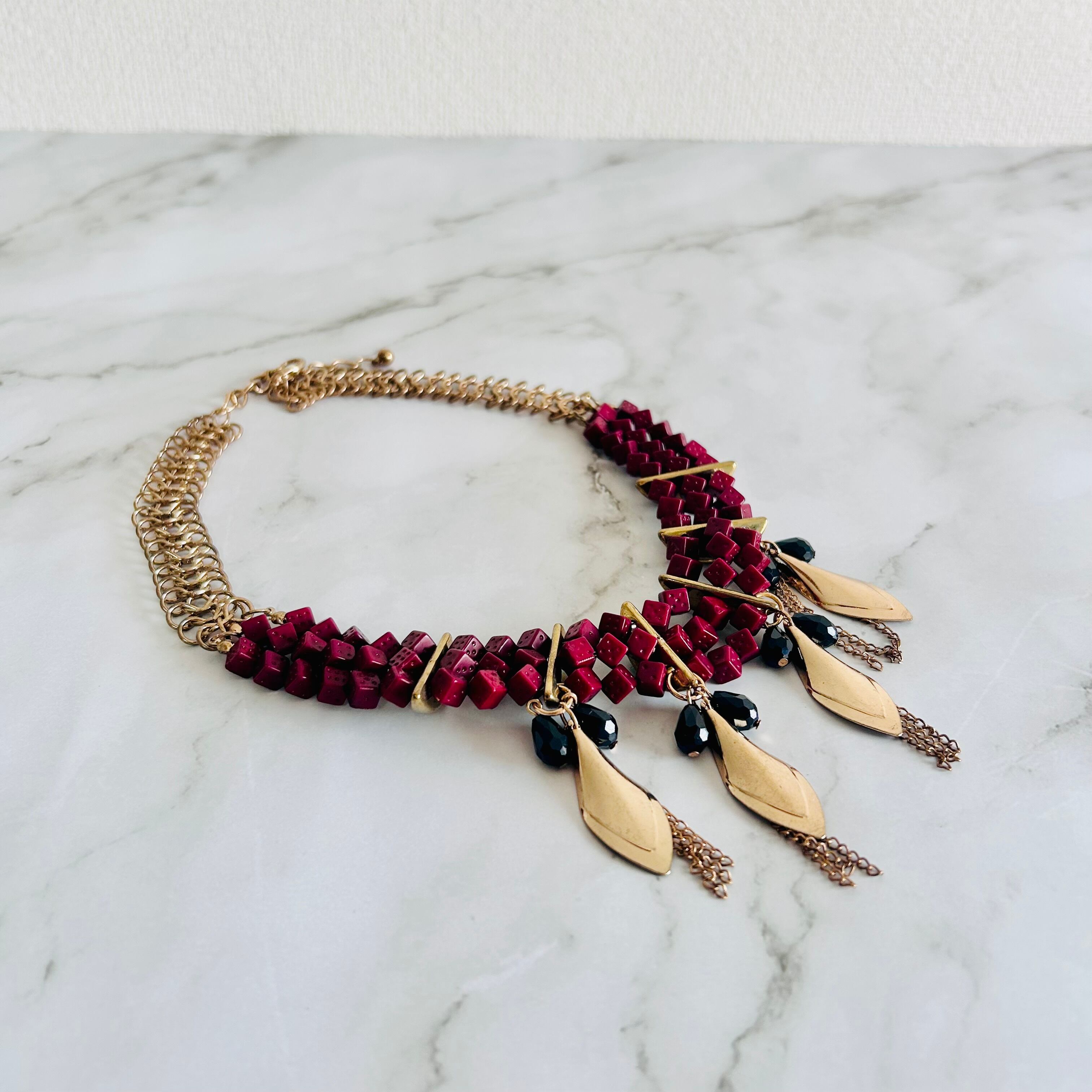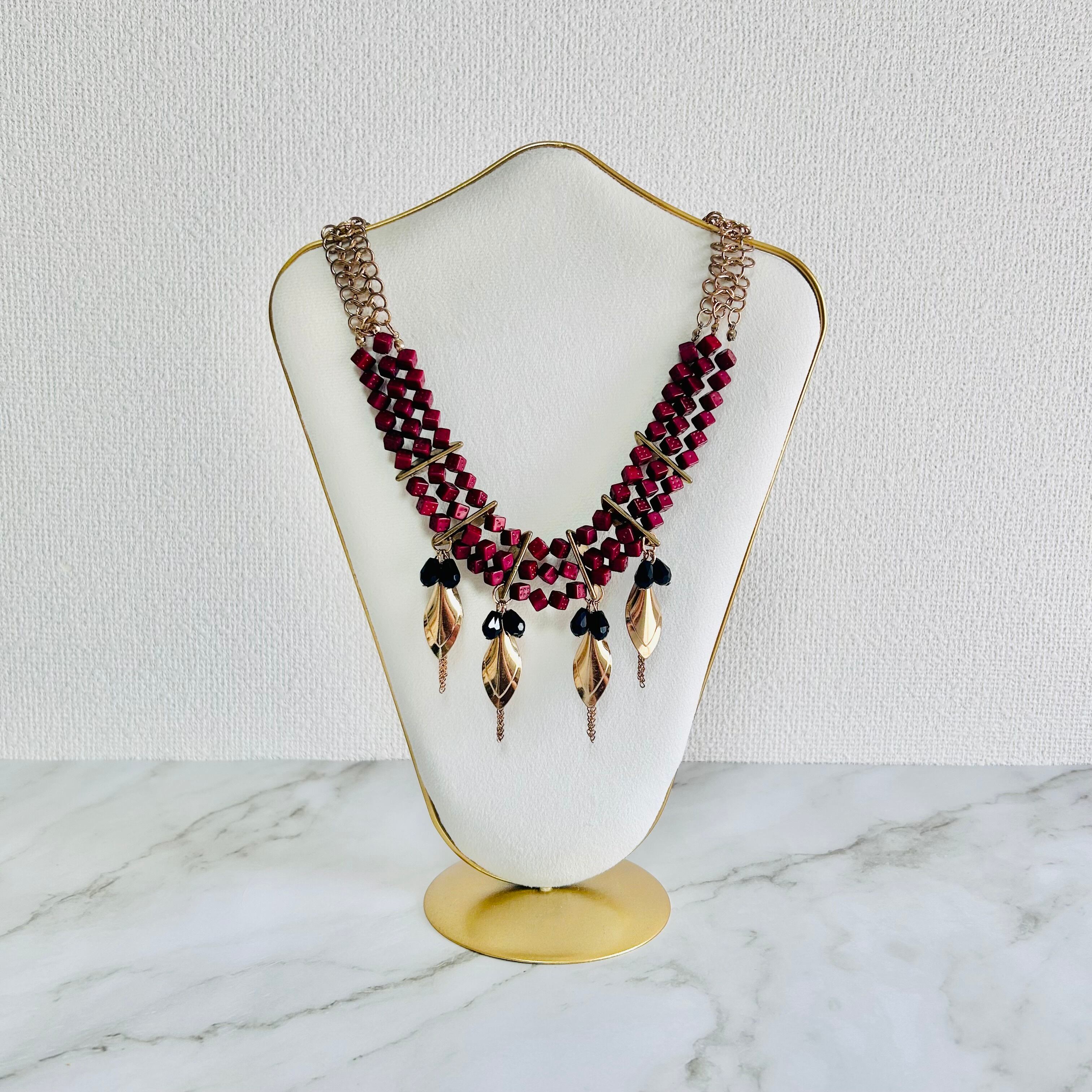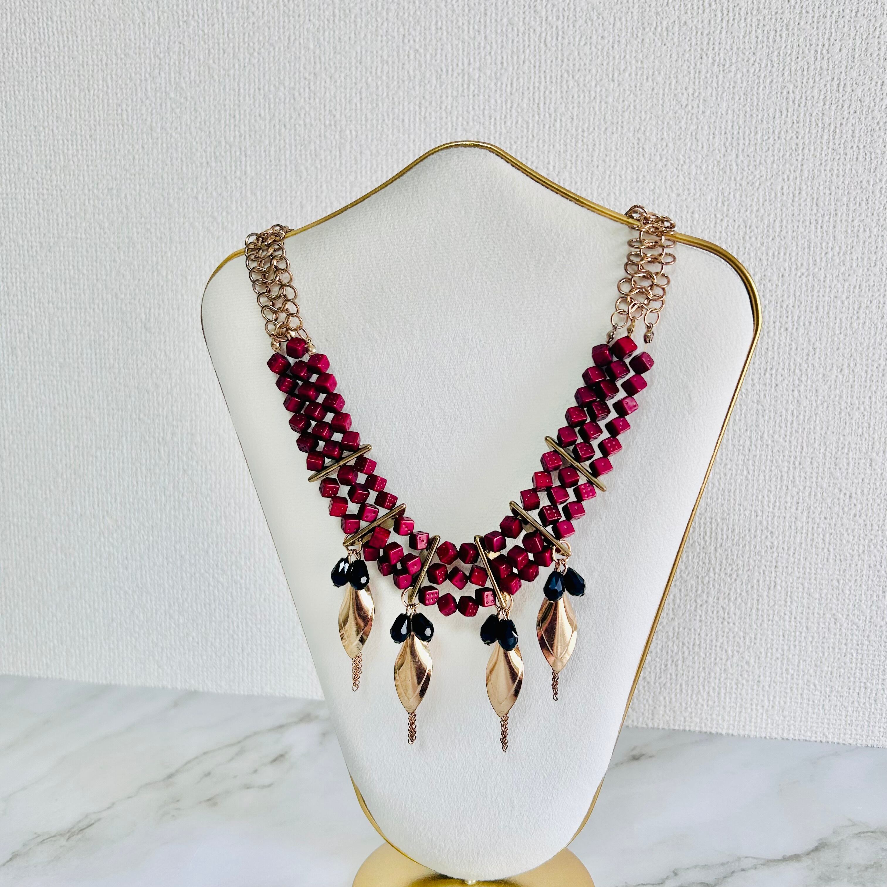 深みのあるボルドーカラーのスクウェアビーズを連ね、ゴールドのリーフモチーフをあしらった印象的なネックレスです。