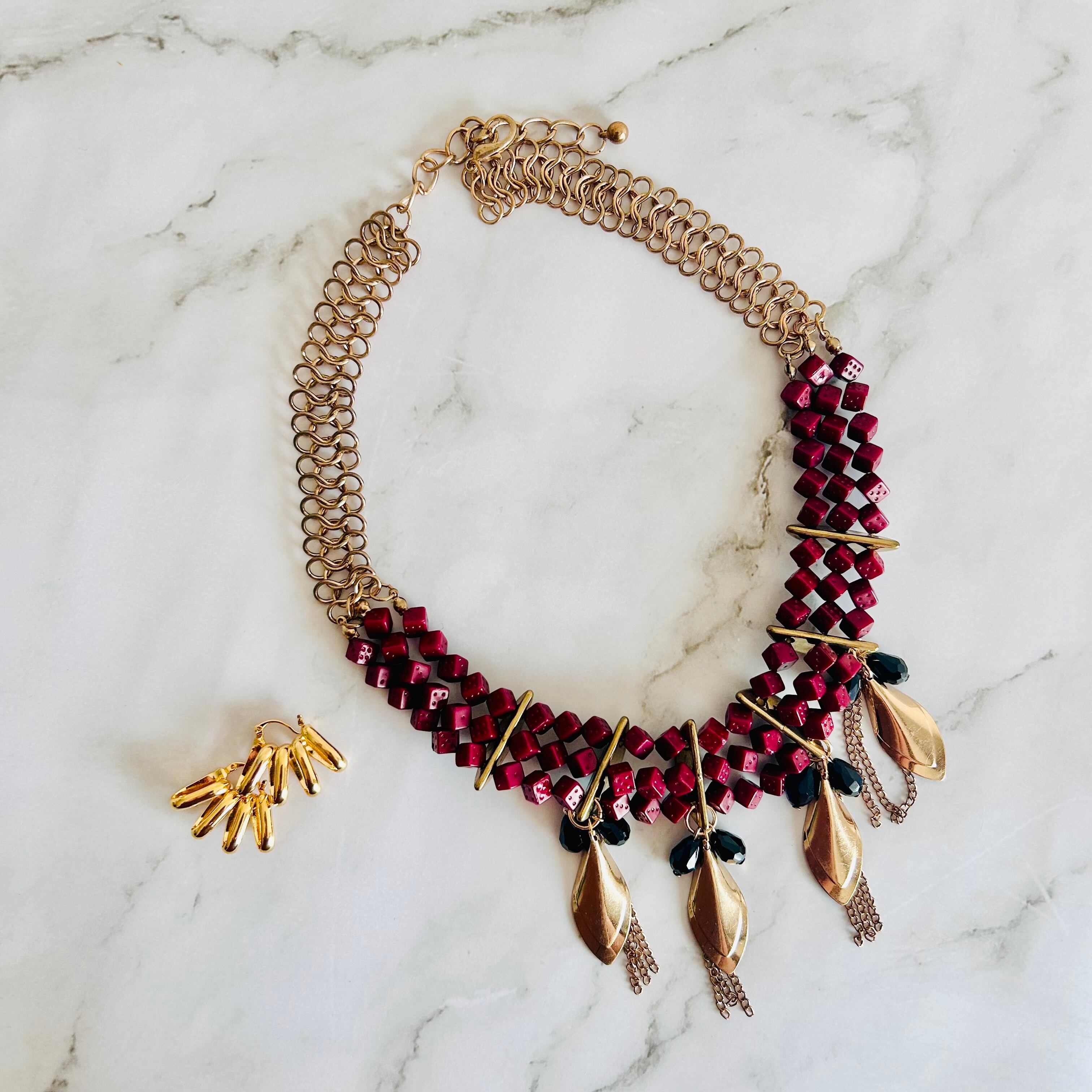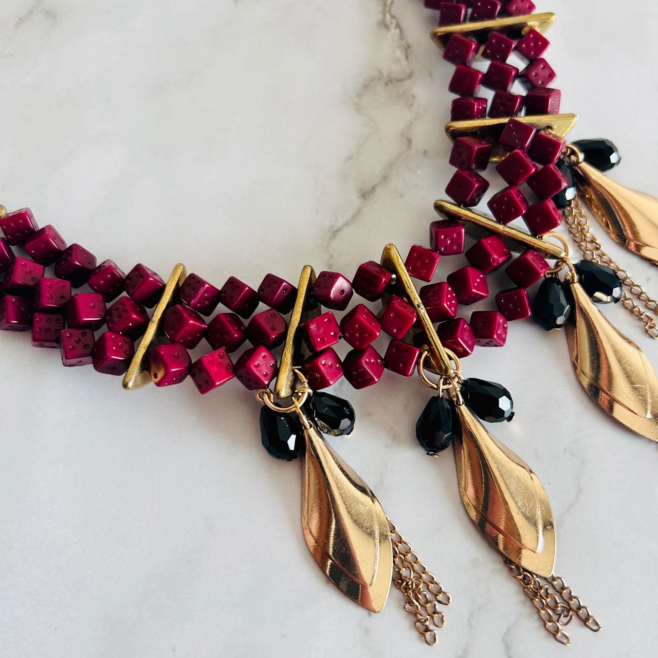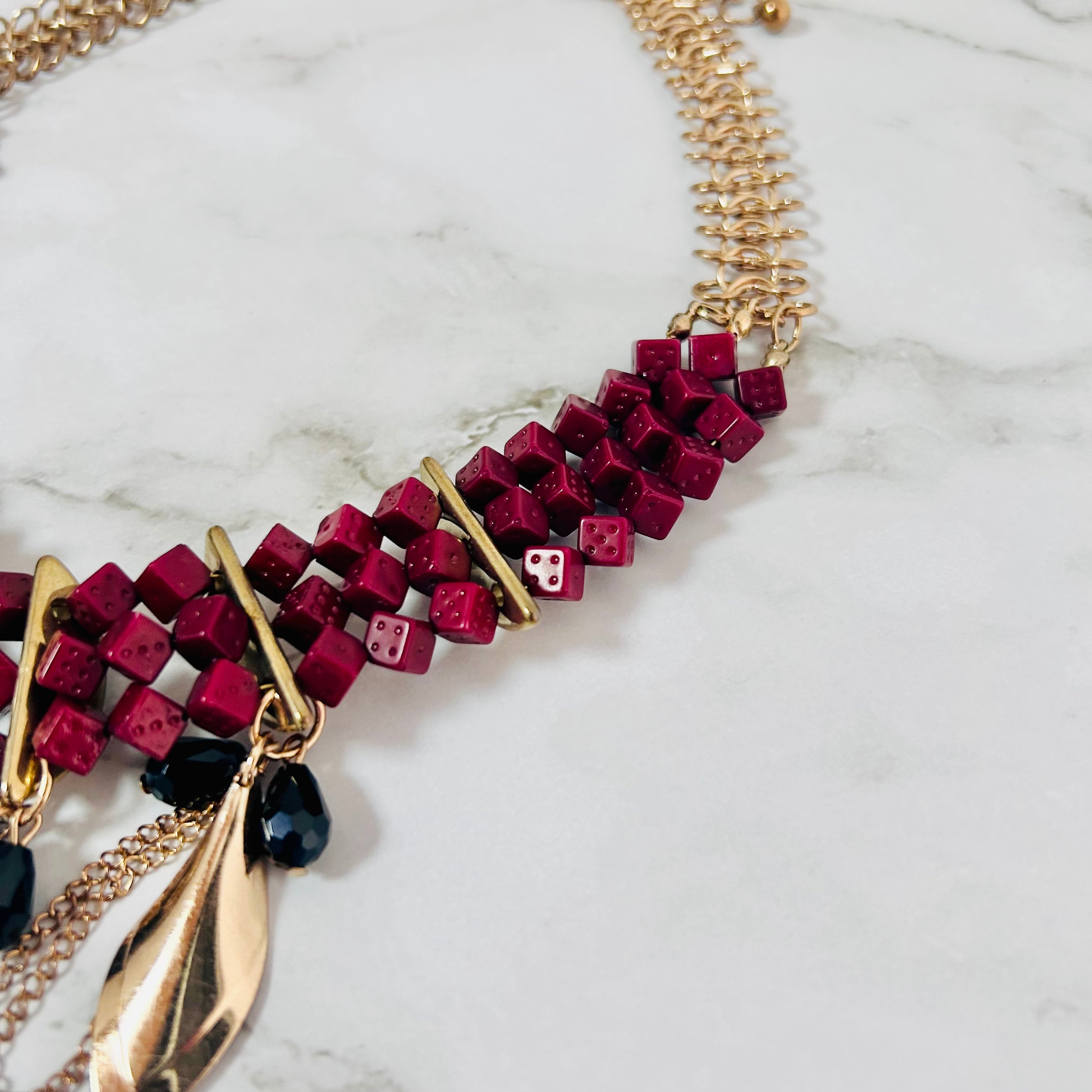 深みのあるボルドーカラーのスクウェアビーズを連ね、ゴールドのリーフモチーフをあしらった印象的なネックレスです。