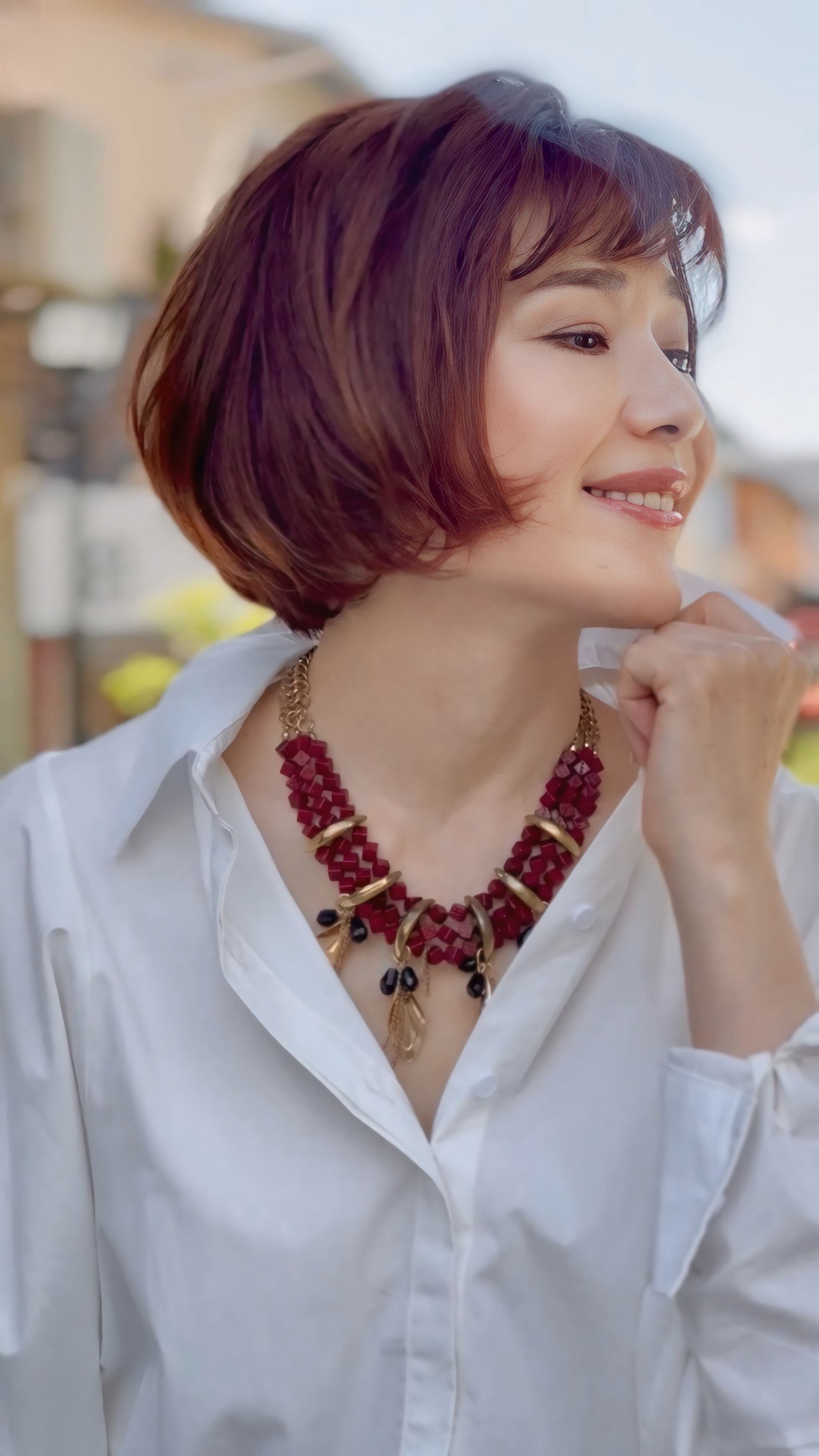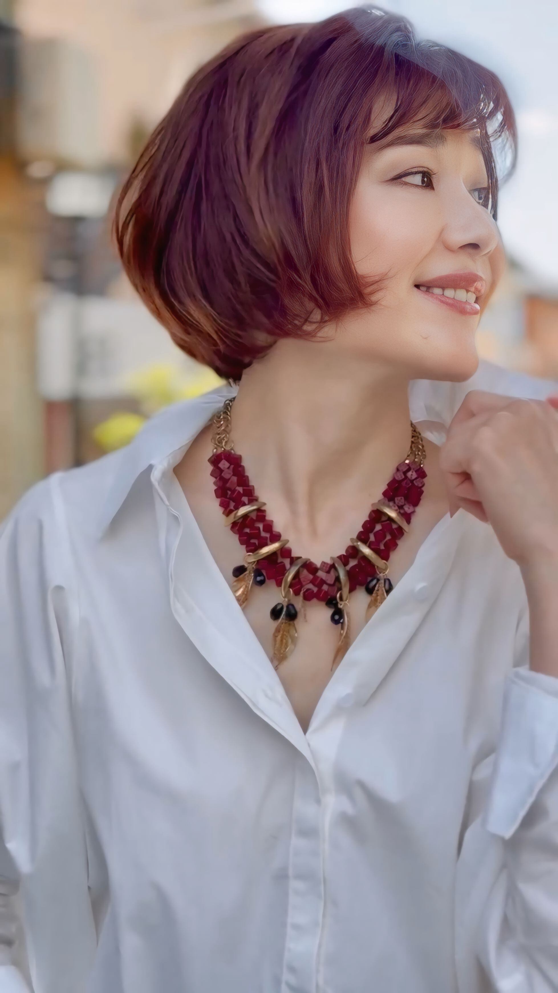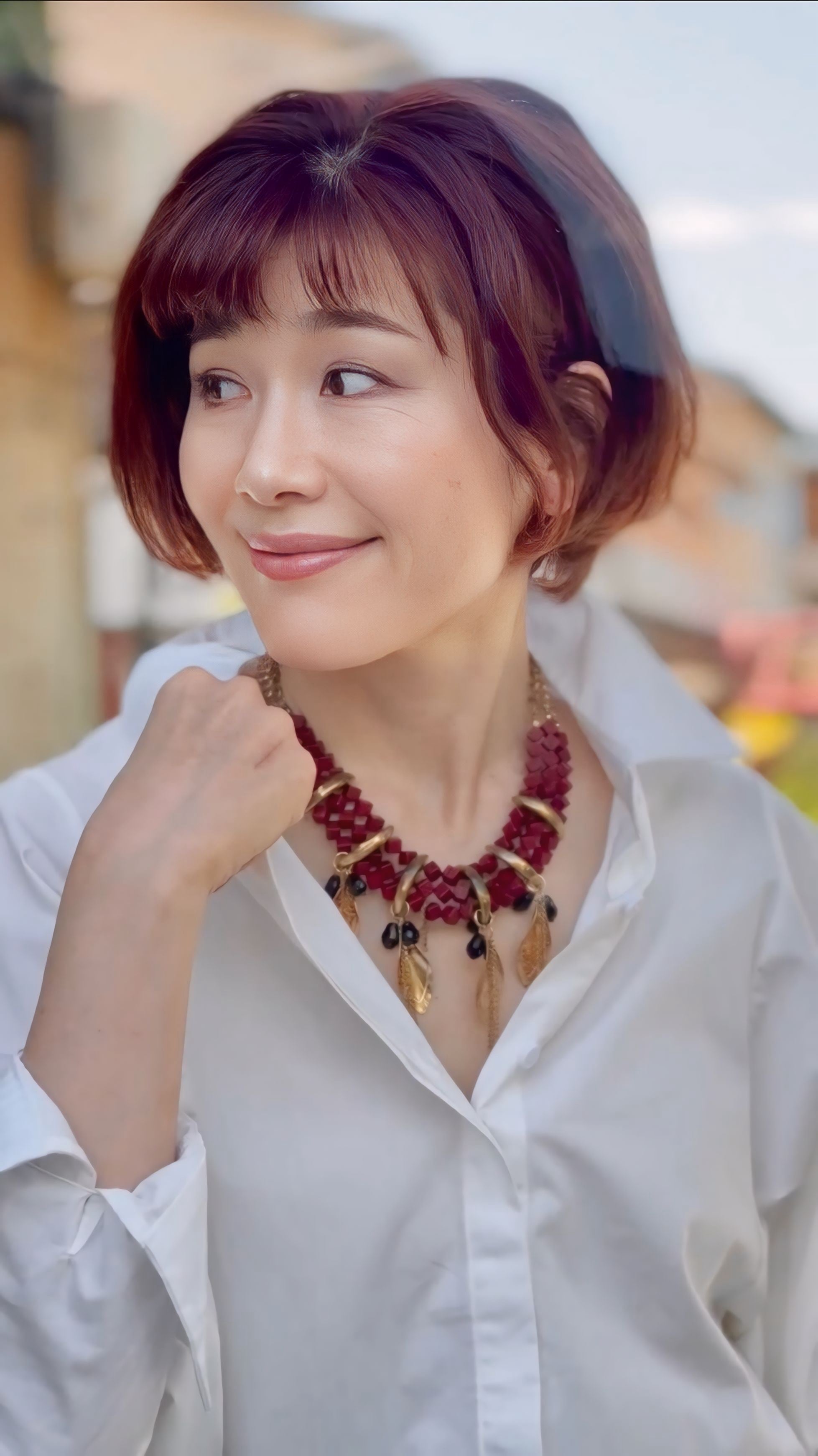 特にブラックやブラウンの落ち着いたカラーと合わせると、ネックレスの赤とゴールドがアクセントになり、装いを華やかに引き立てます♪