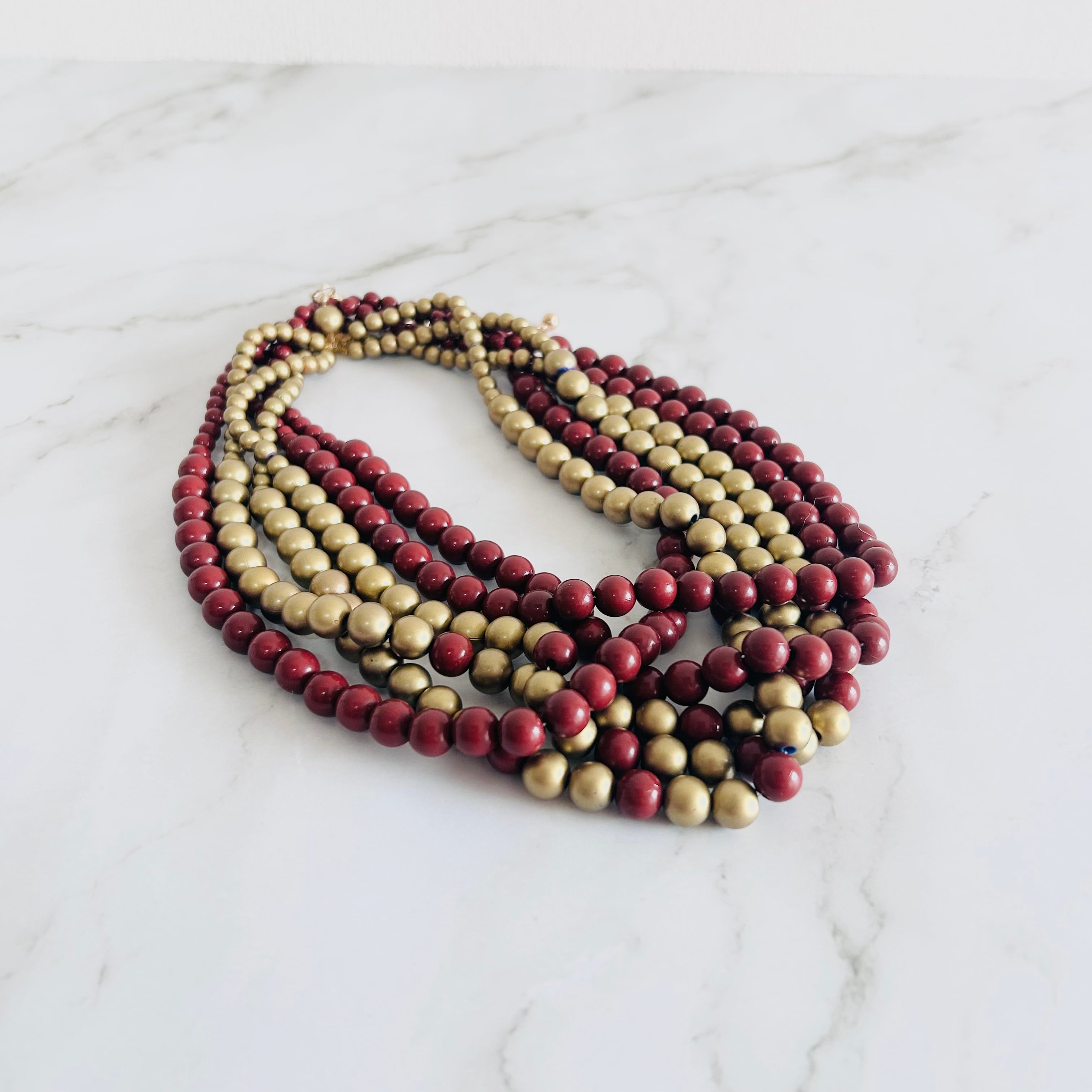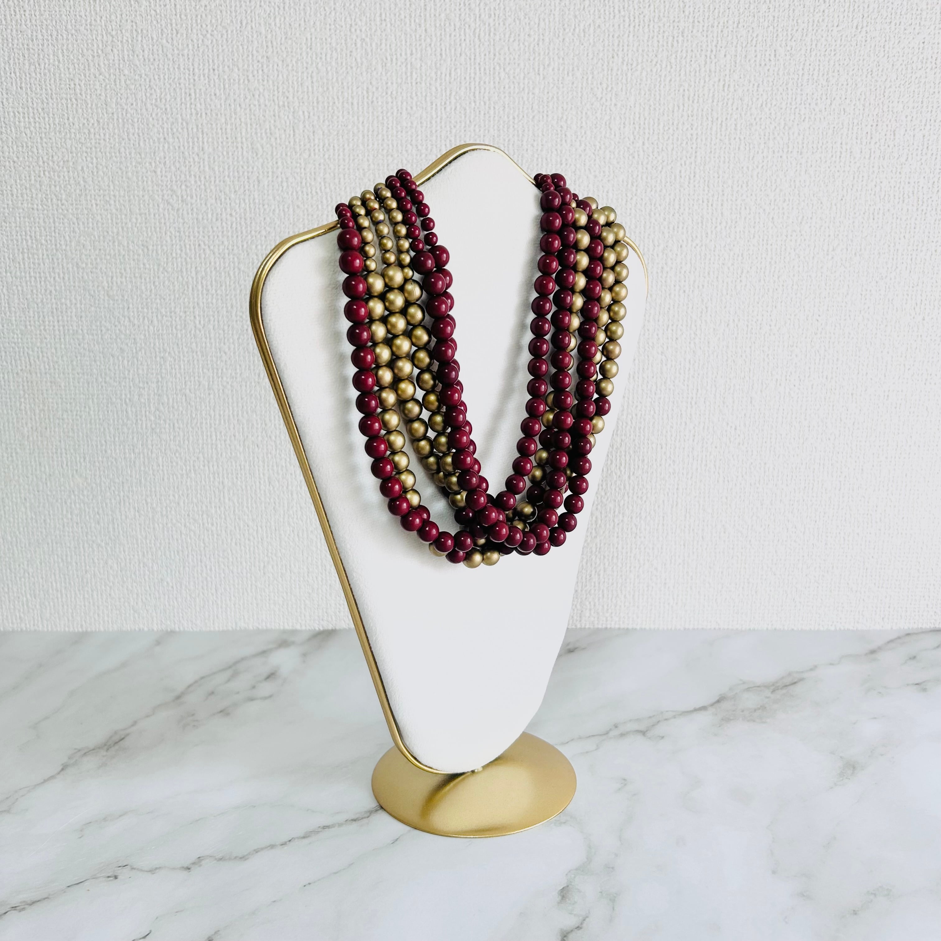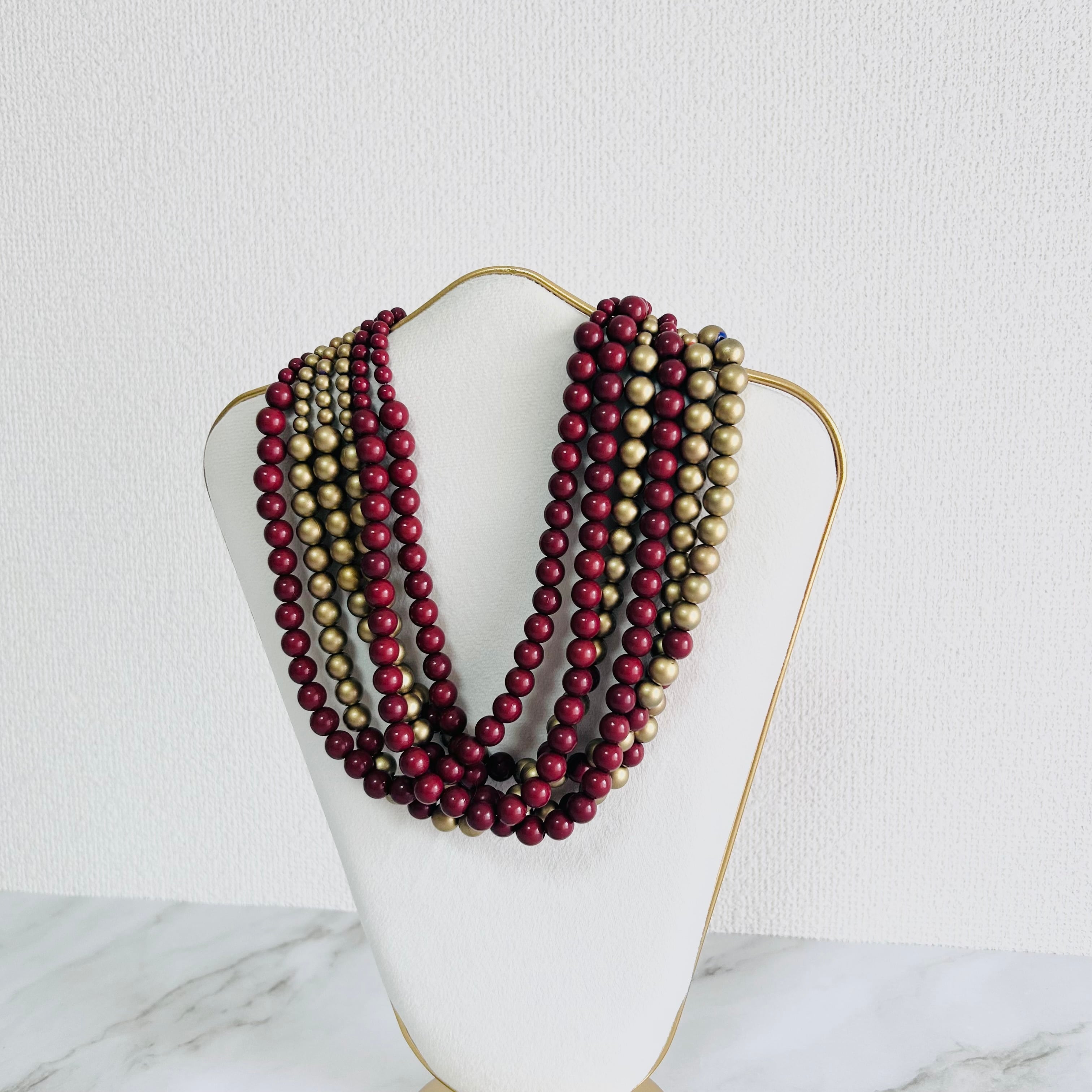 深みのあるボルドーカラーとアンティークゴールドのラウンドビーズを贅沢に重ねた、存在感抜群のネックレスです。