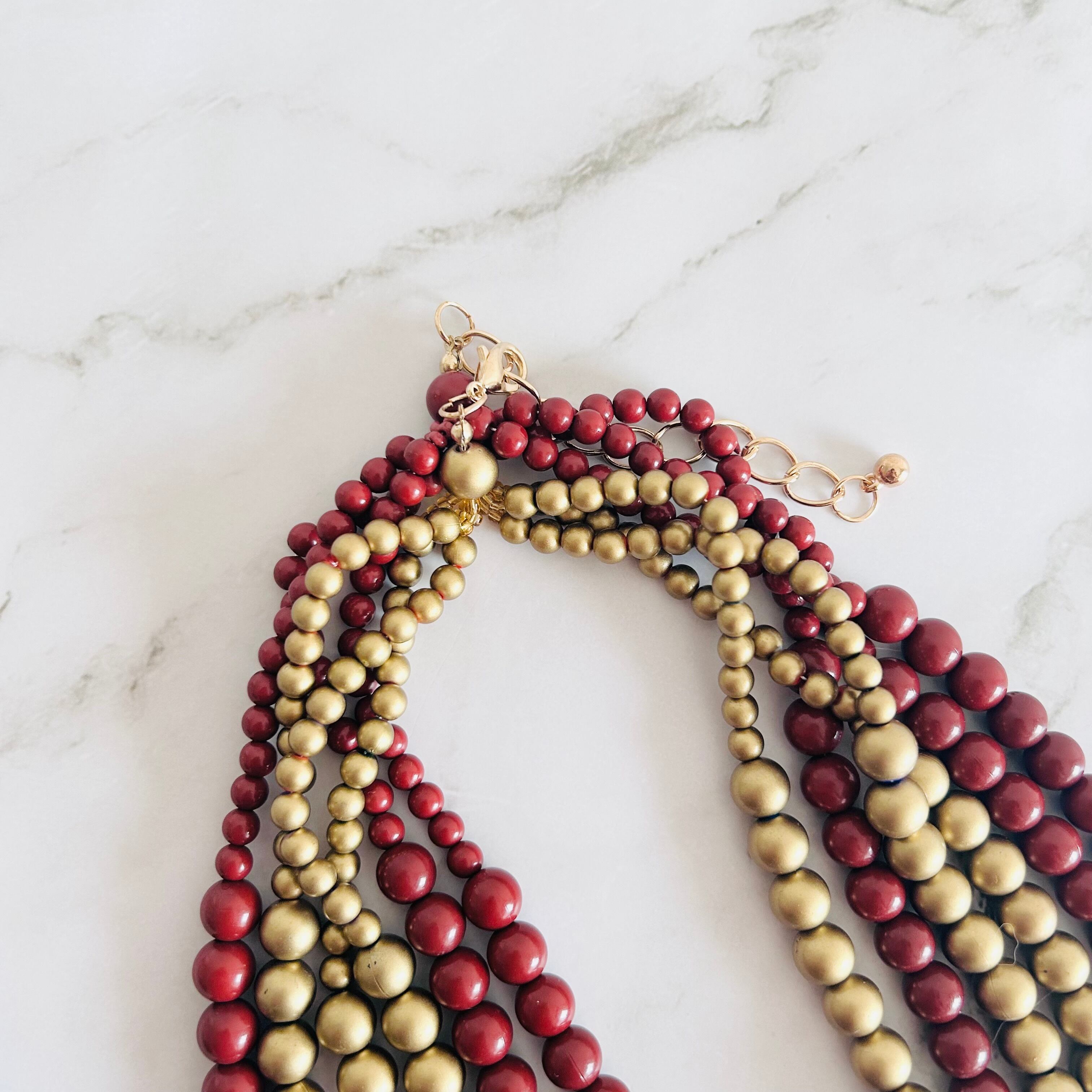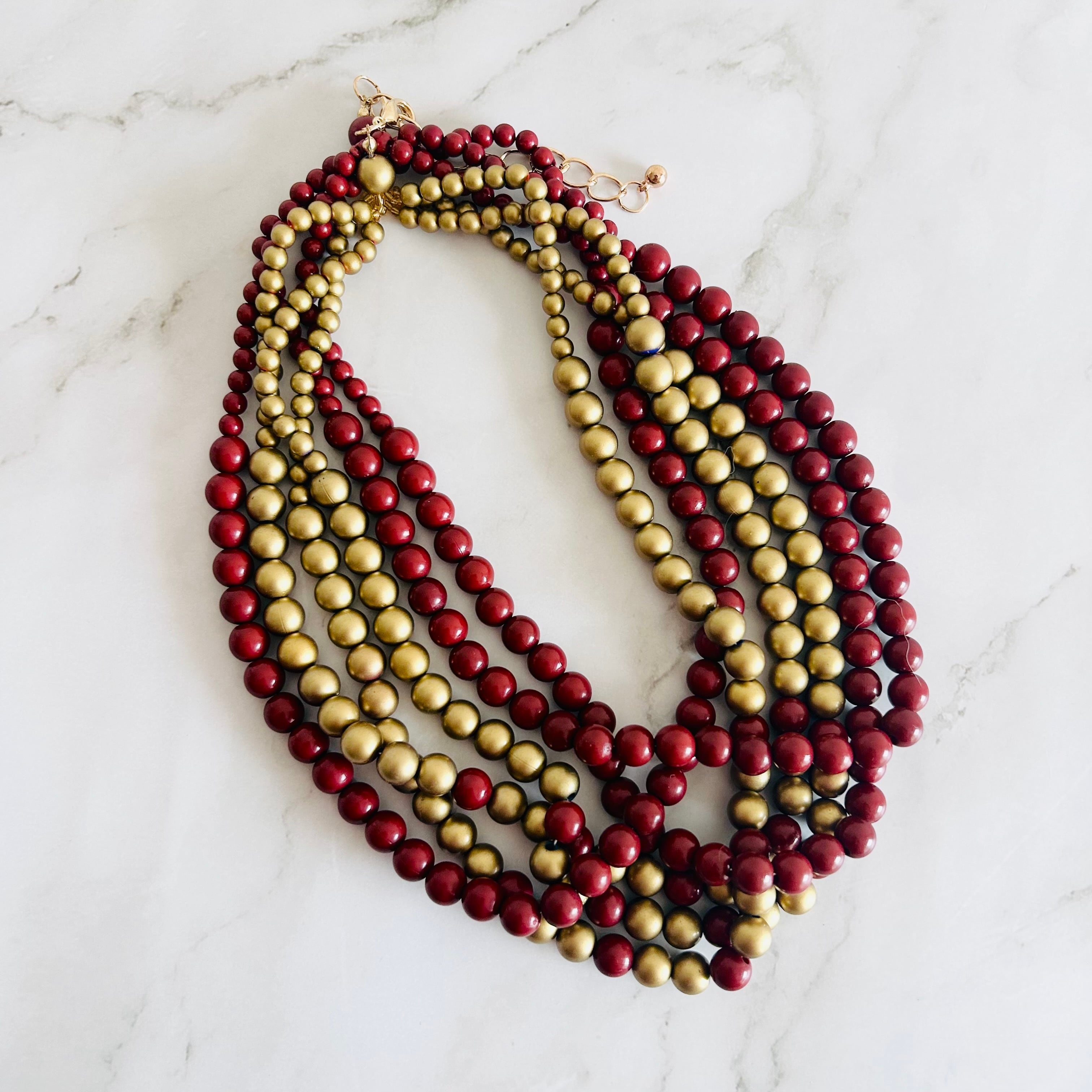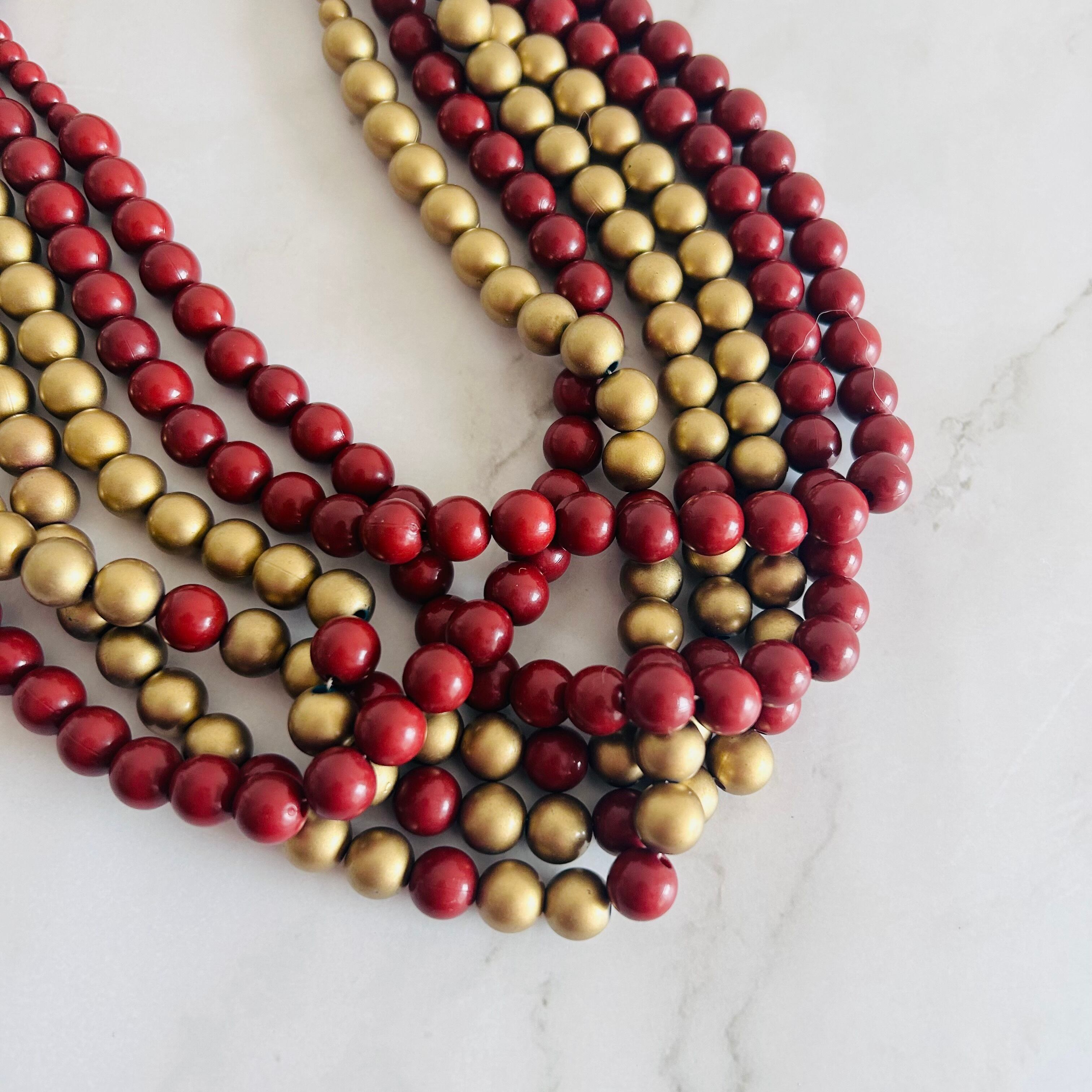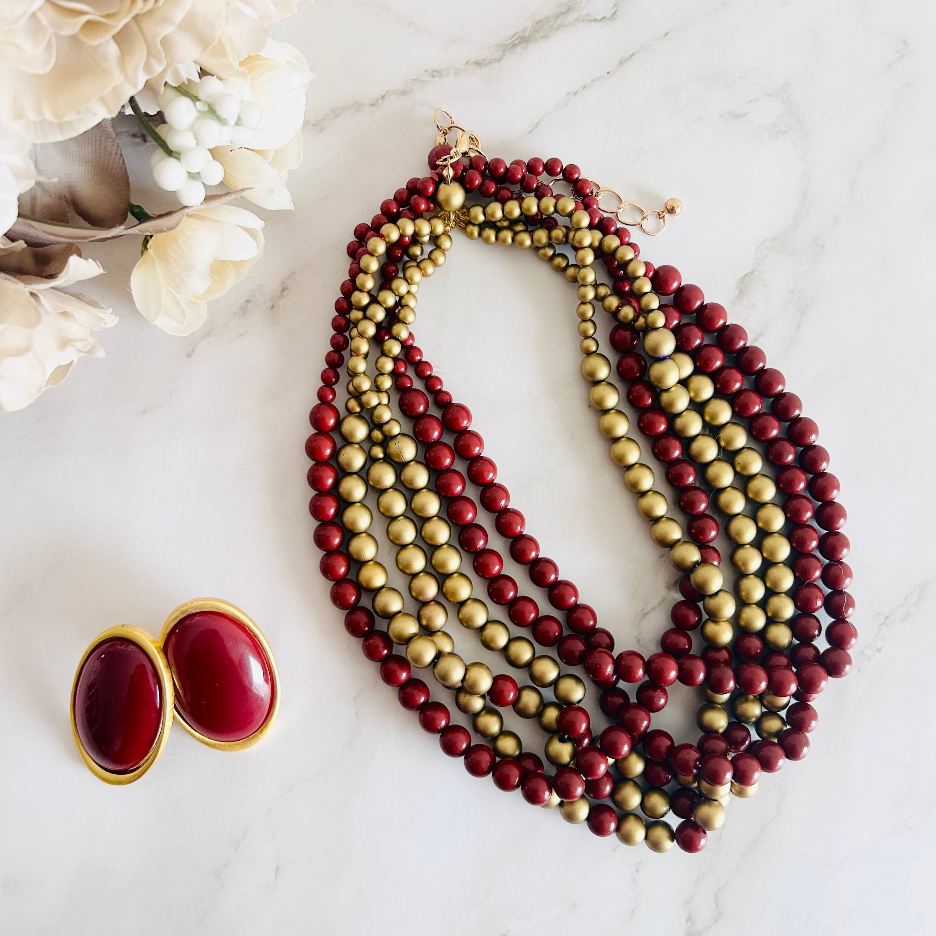 深みのあるボルドーカラーとアンティークゴールドのラウンドビーズを贅沢に重ねた、存在感抜群のネックレスです。