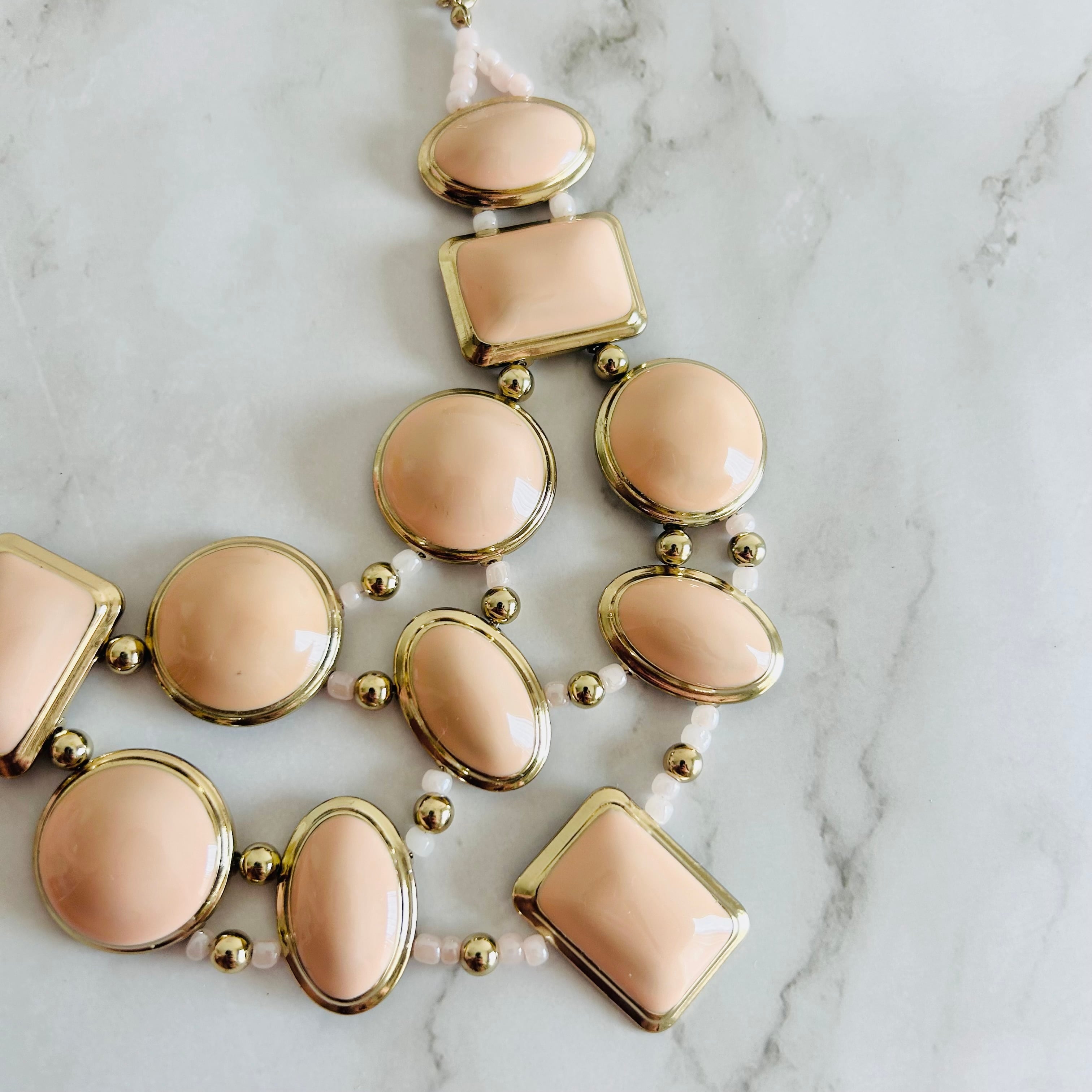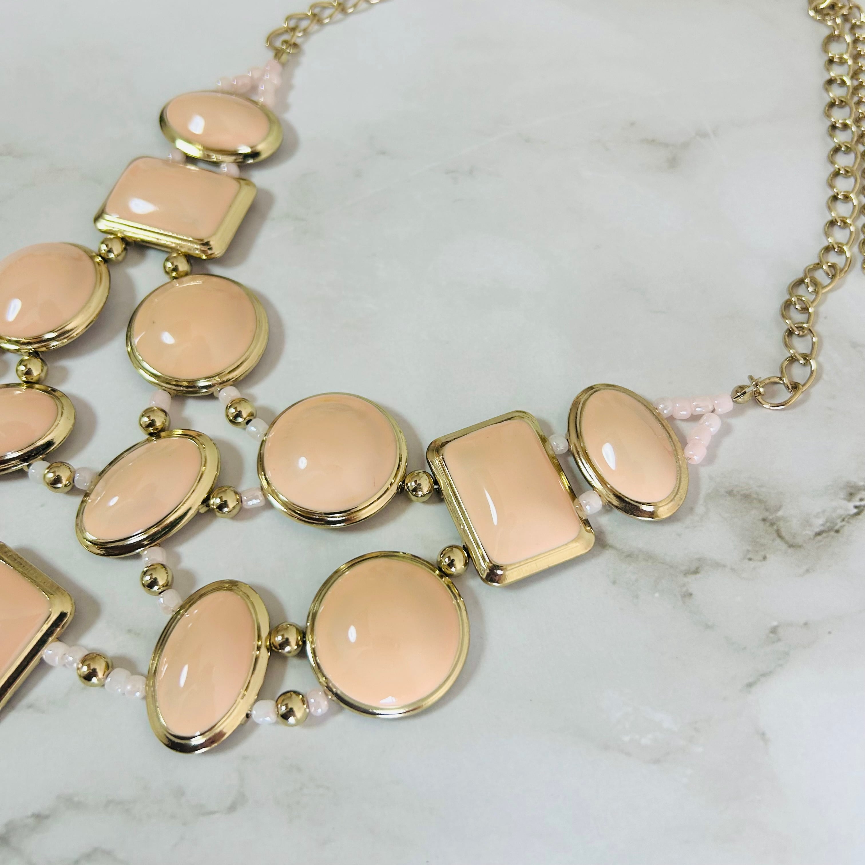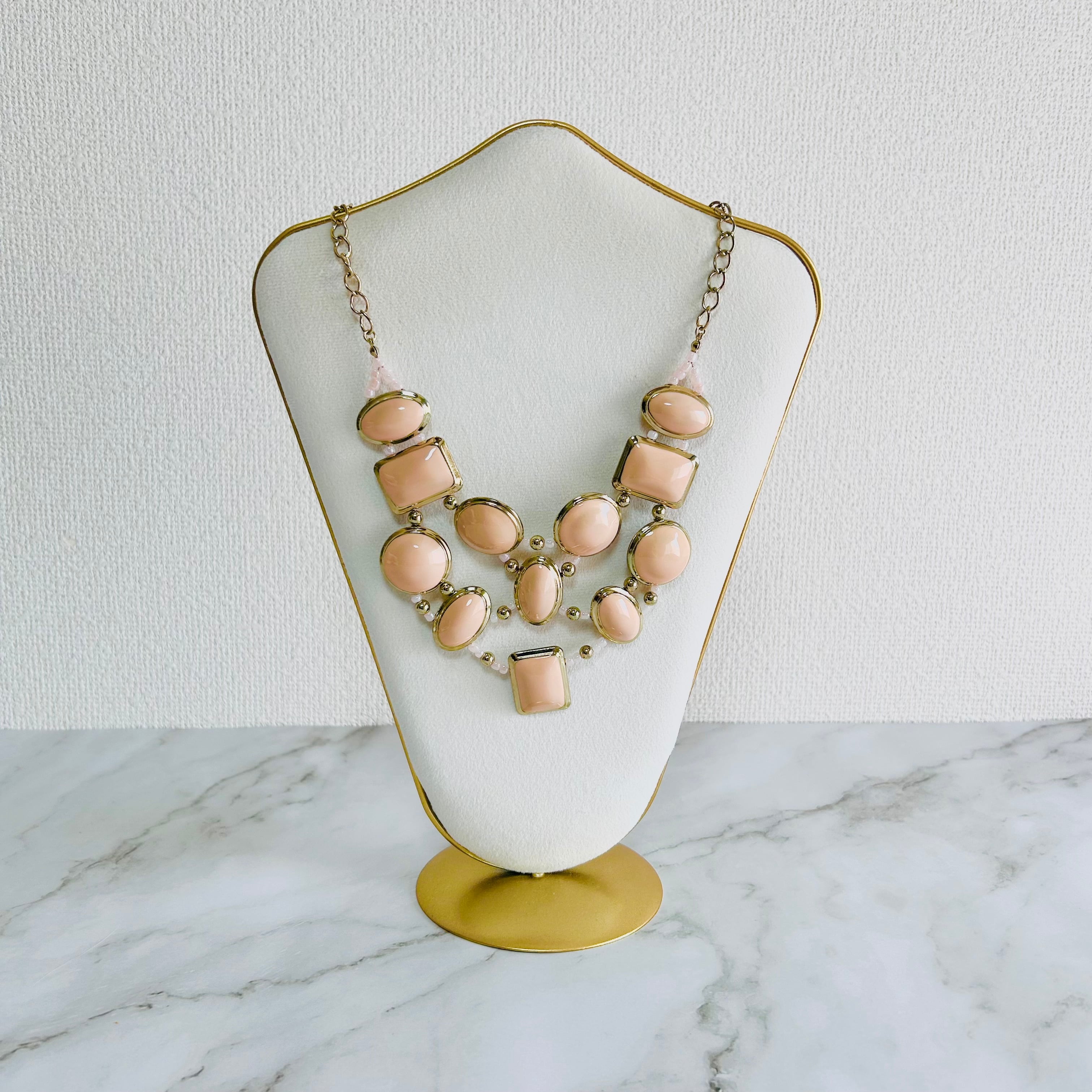 エナメル調のやわらかなピンクベージュカラーのパーツが連なった、上品で華やかなネックレスです。