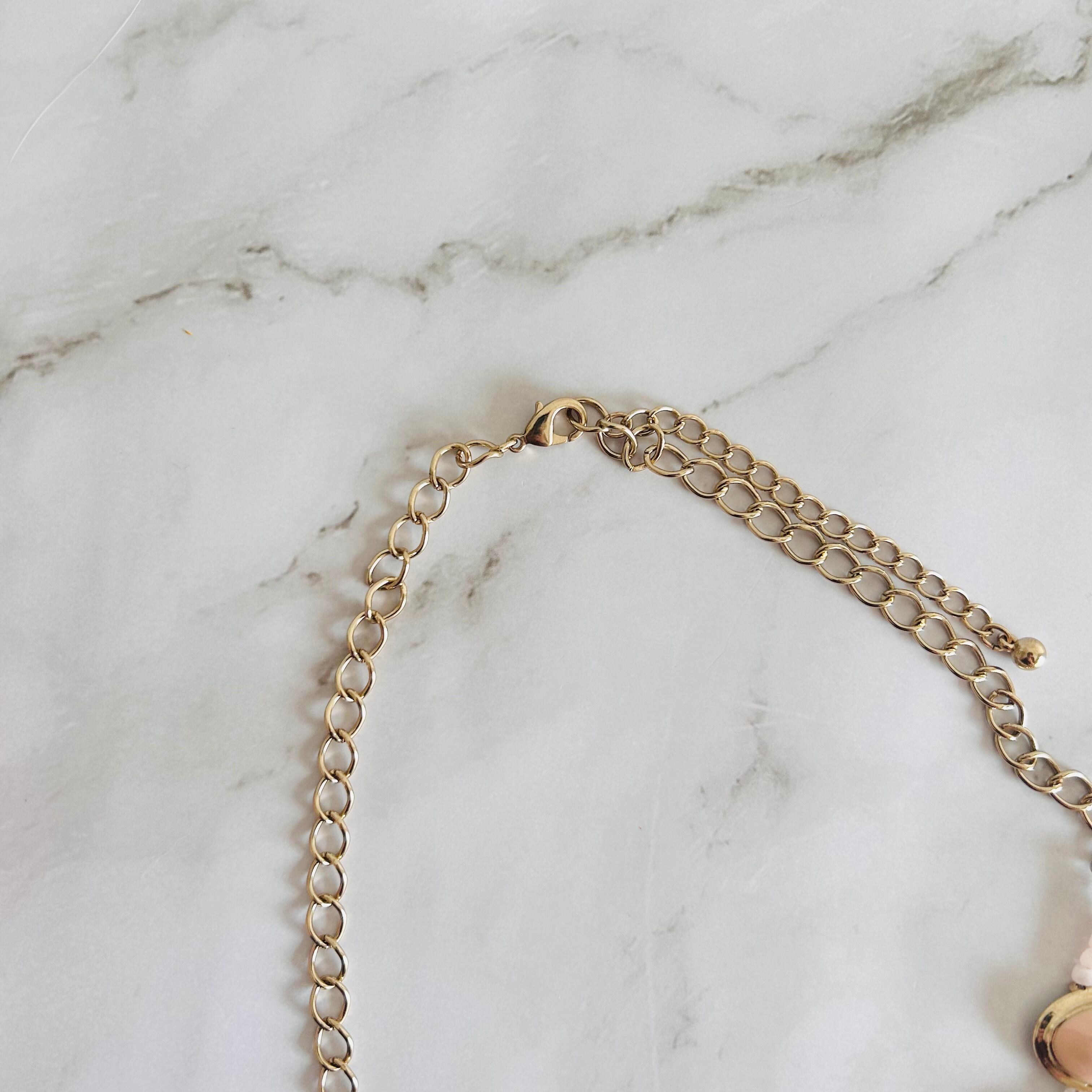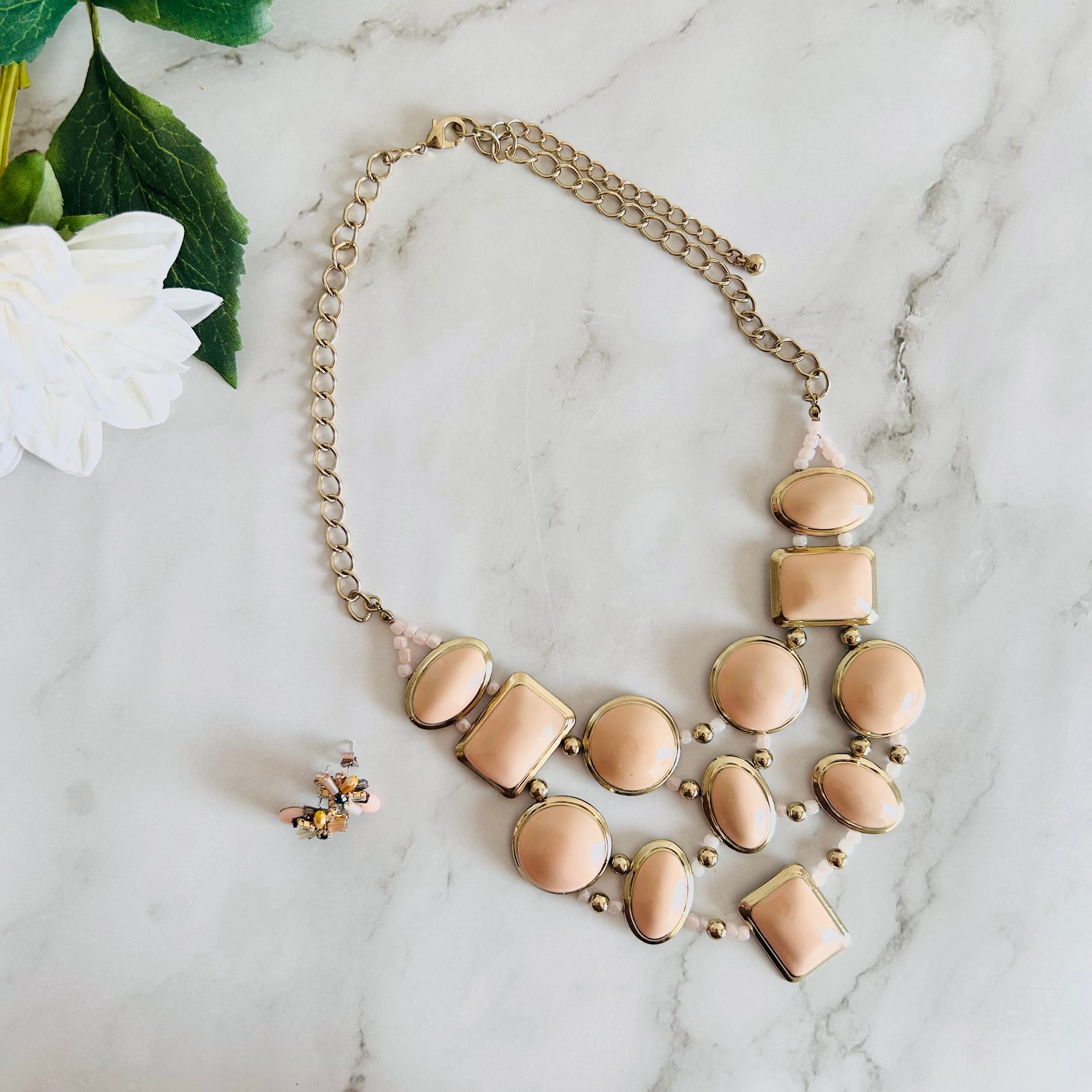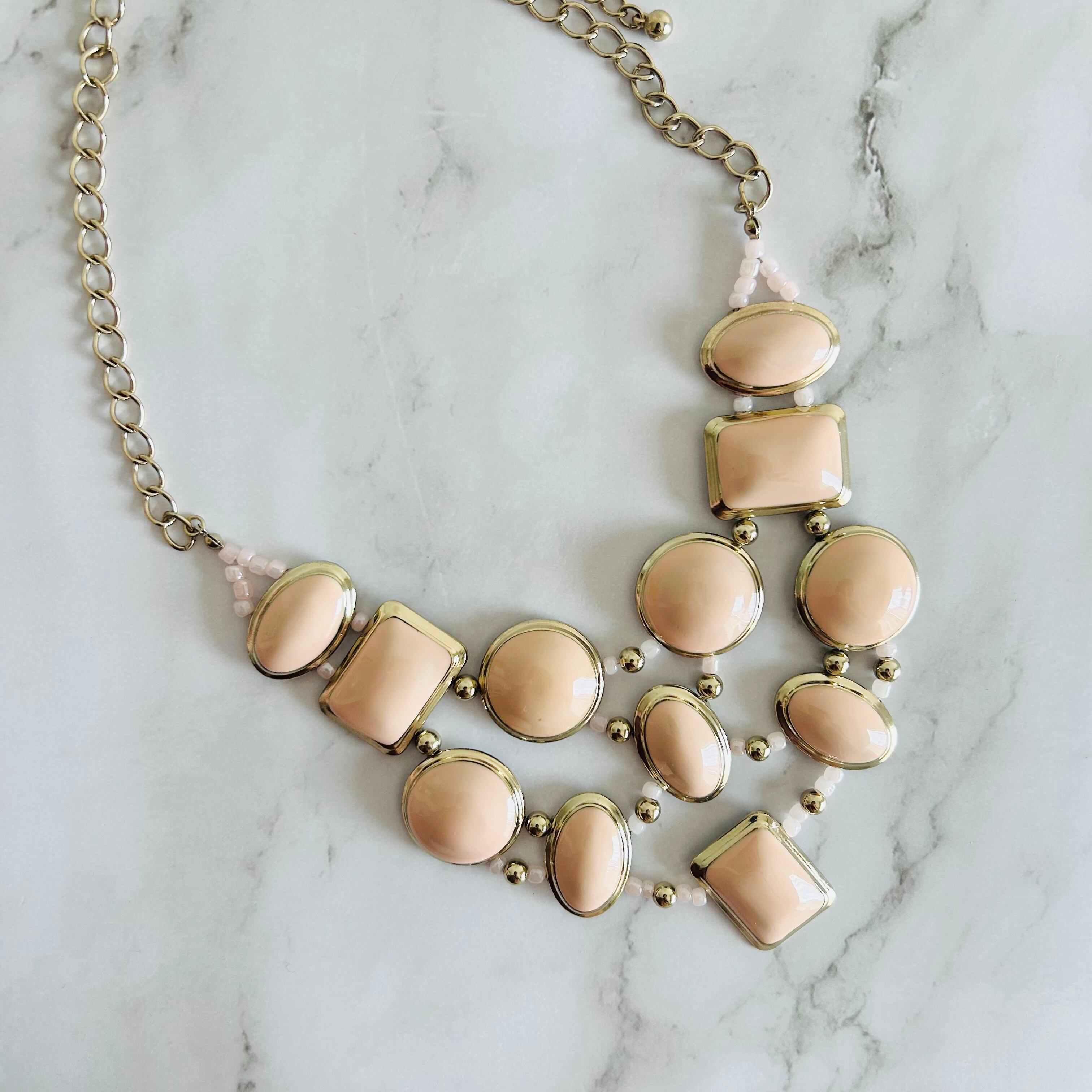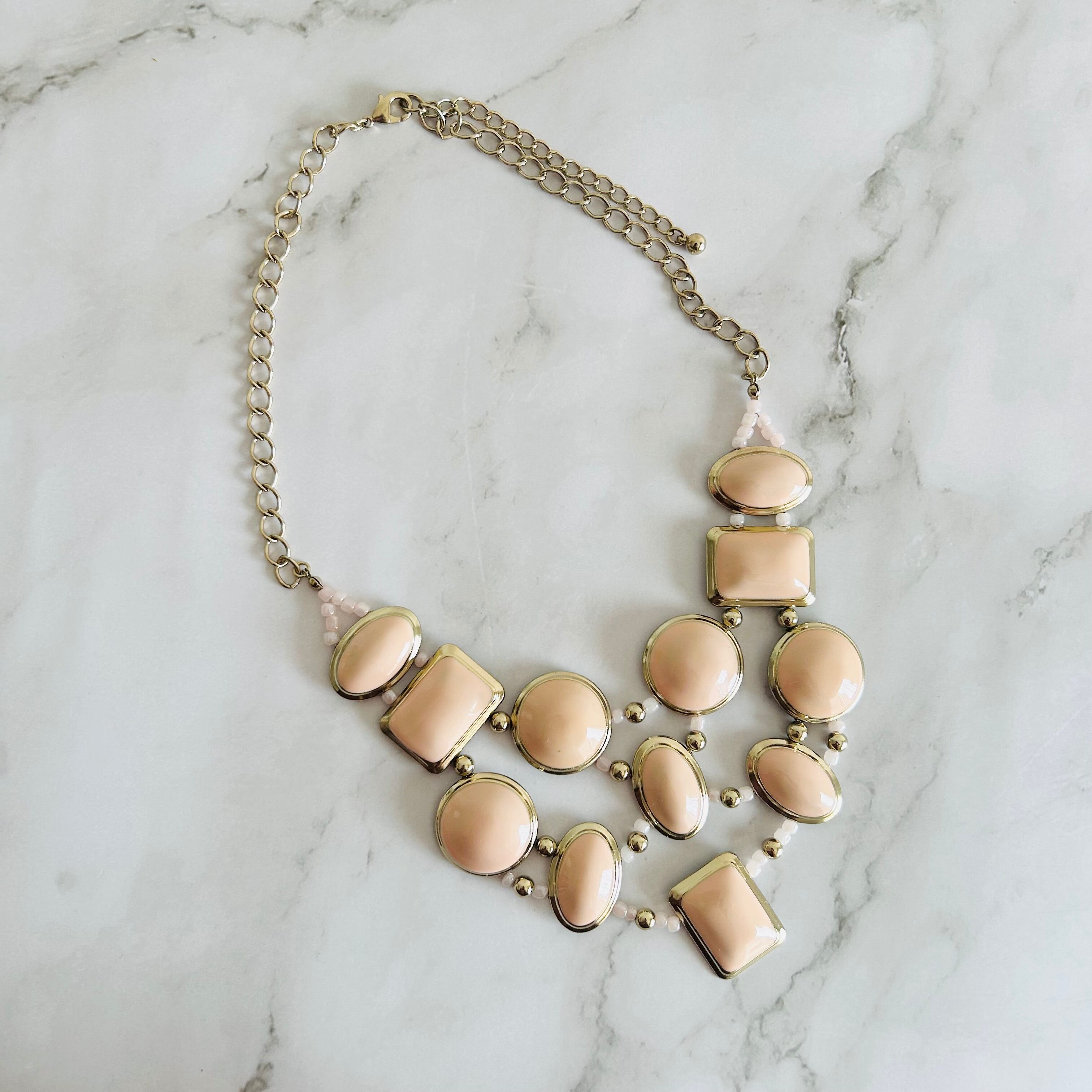 エナメル調のやわらかなピンクベージュカラーのパーツが連なった、上品で華やかなネックレスです。