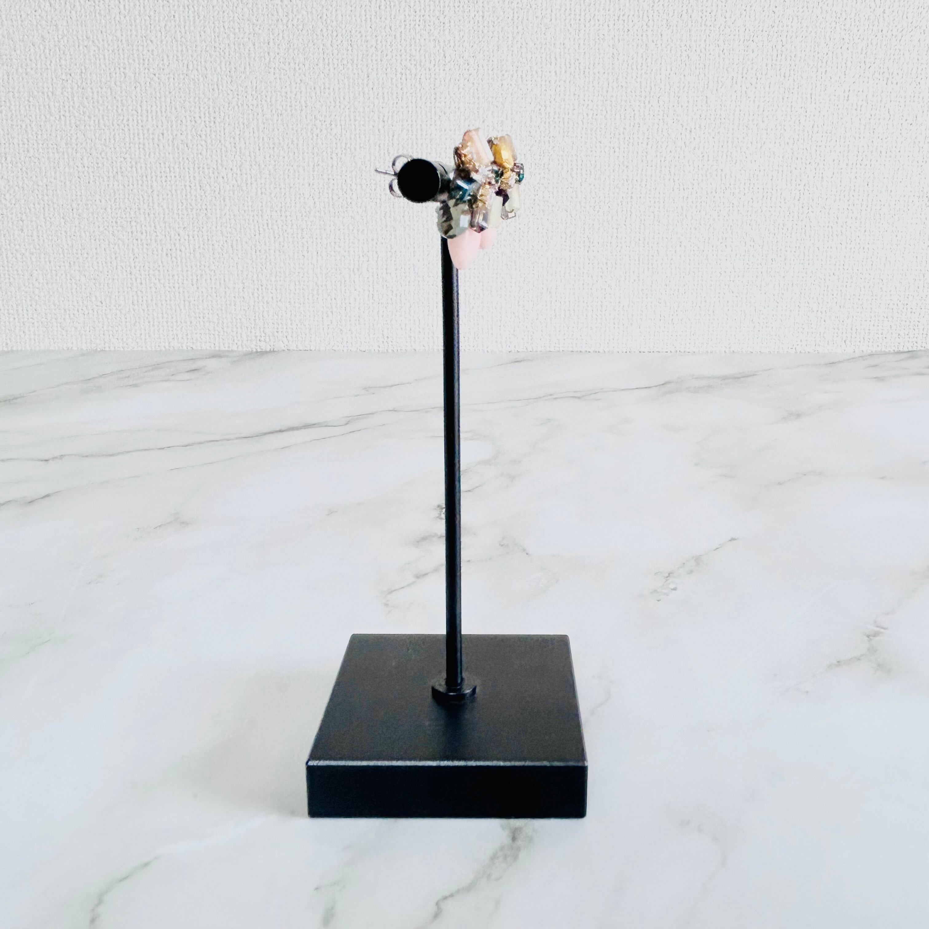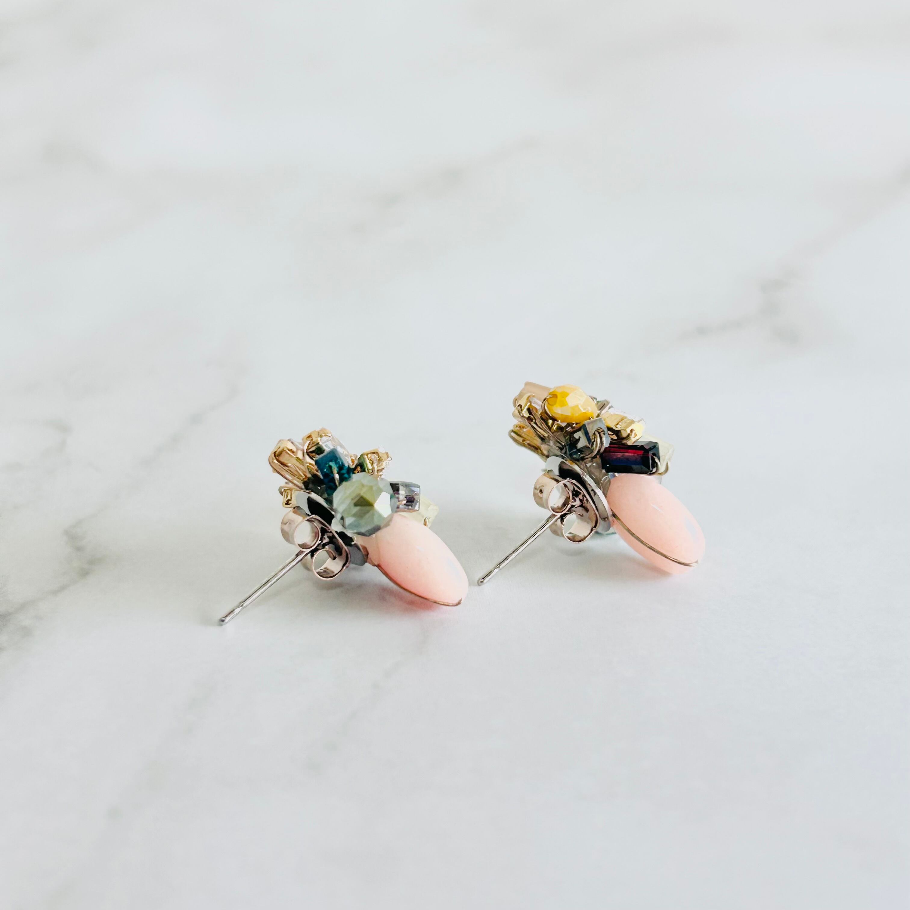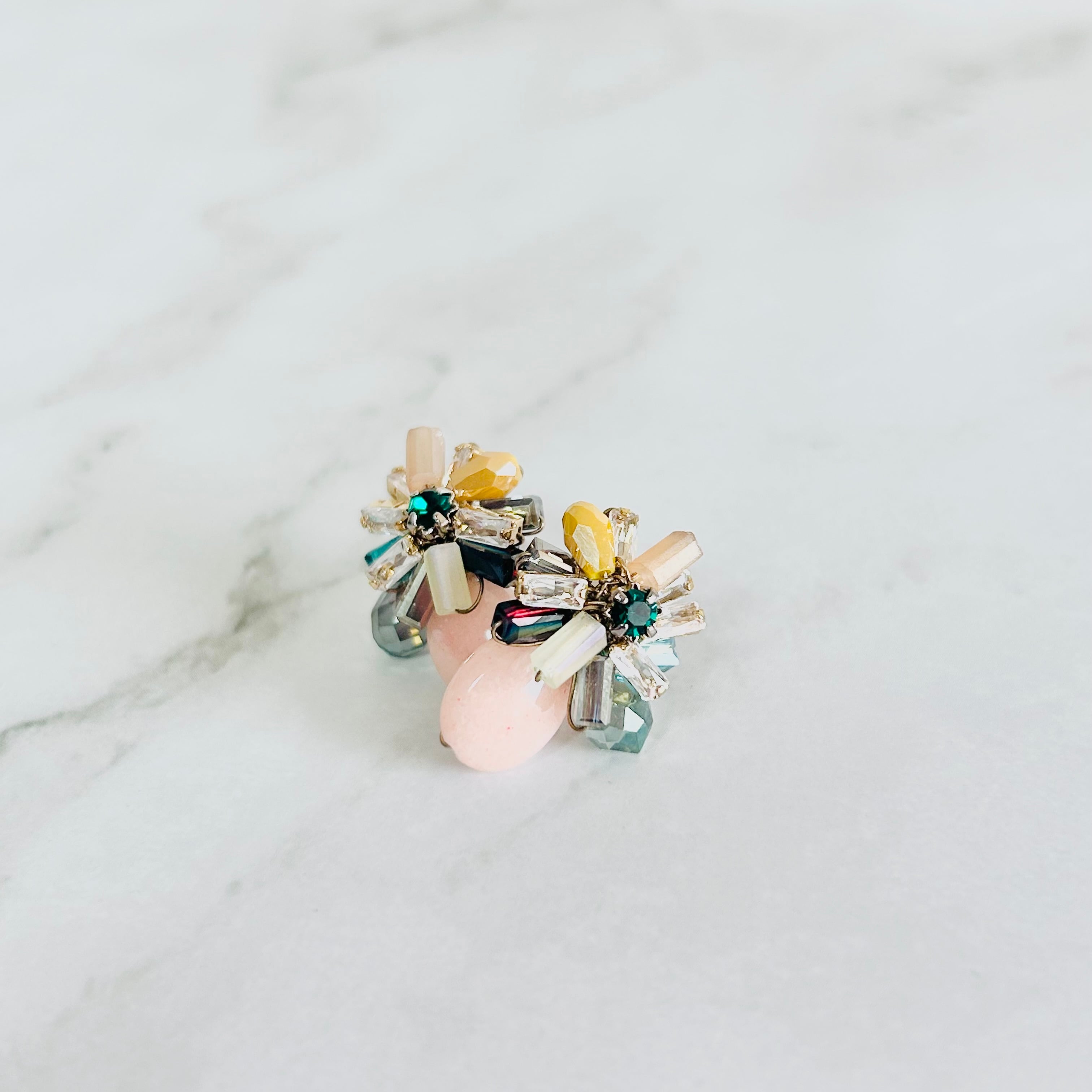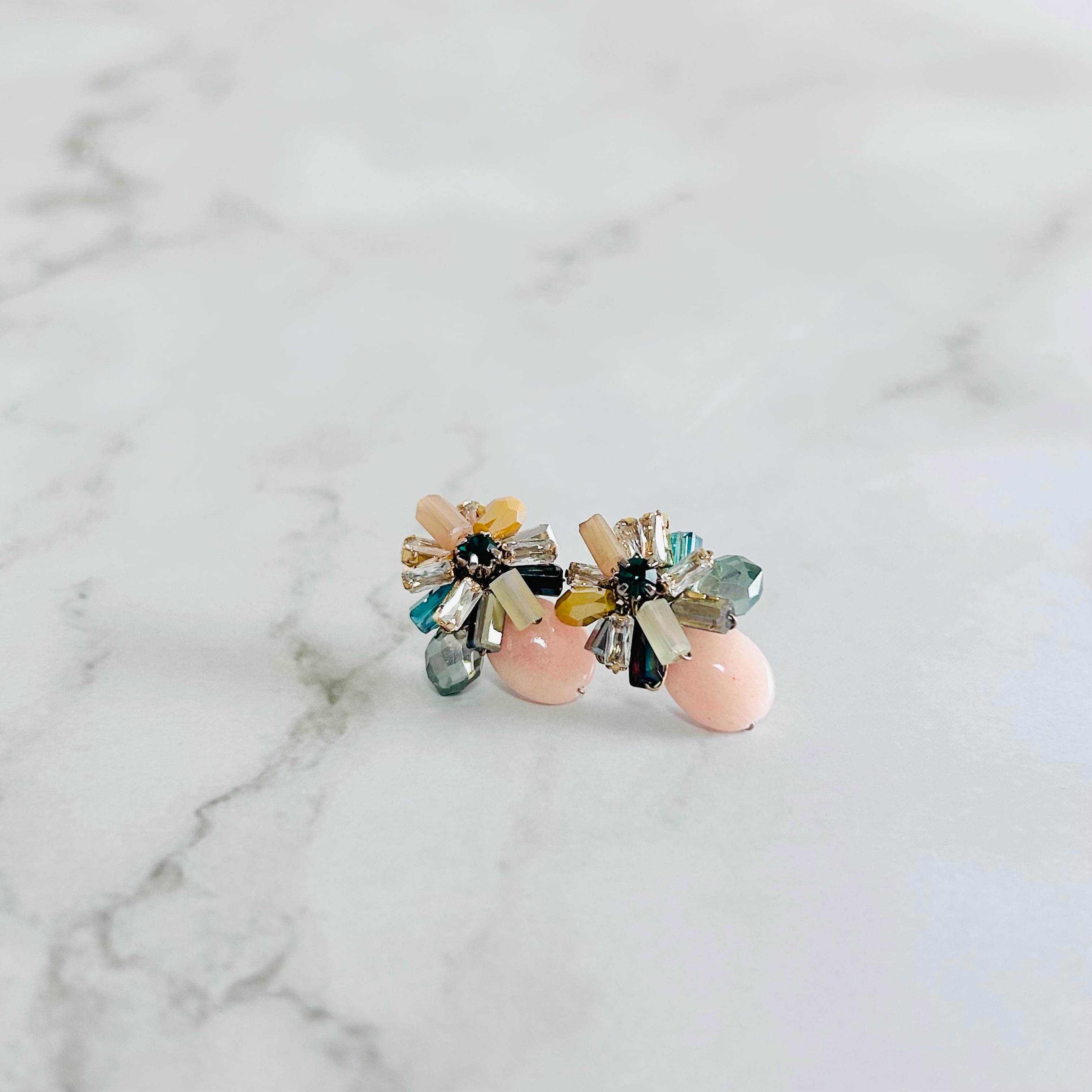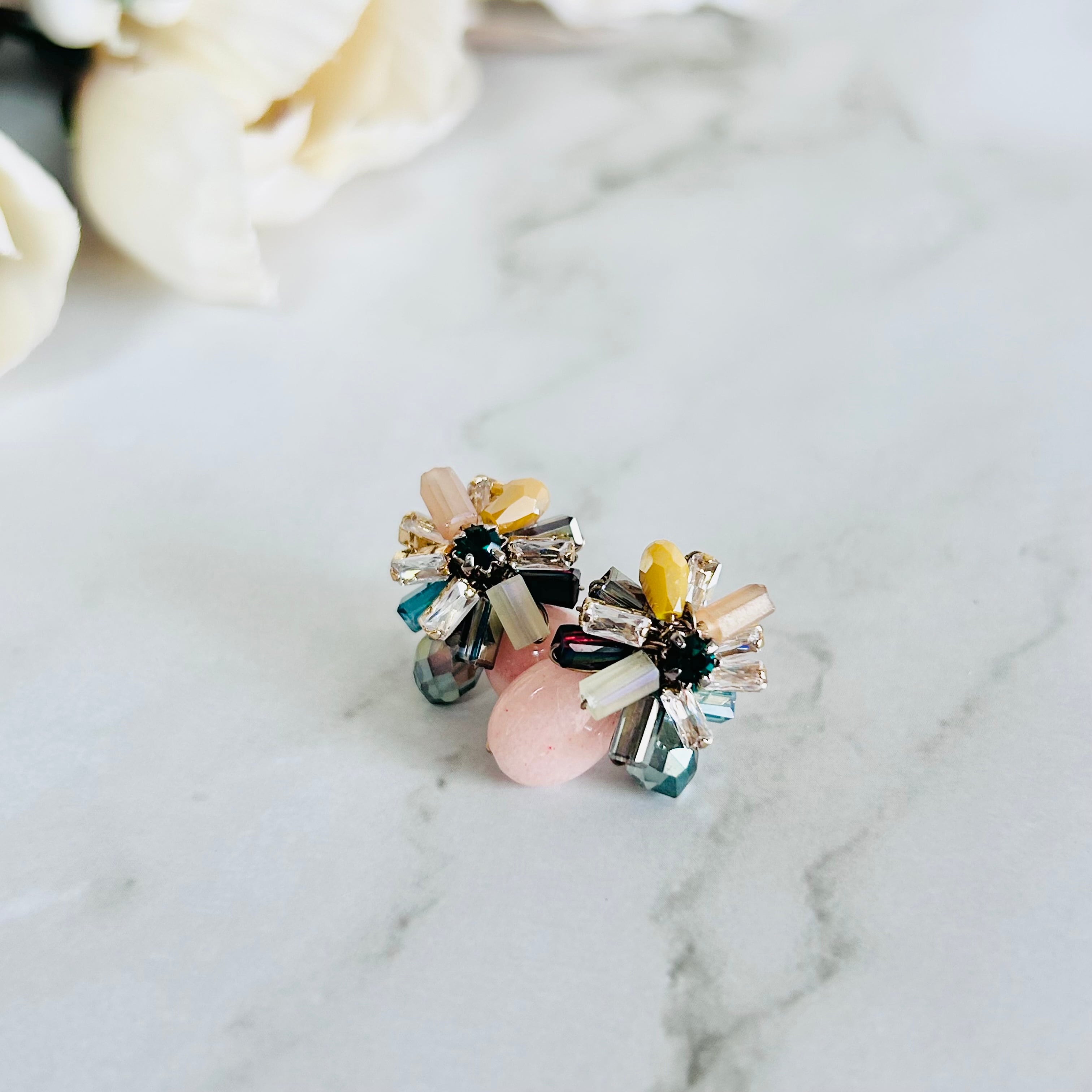 クリスタルやカットビーズ、ストーンなどのさまざまなパーツを贅沢に組み合わせた、華やかなフラワーモチーフのピアスです。
