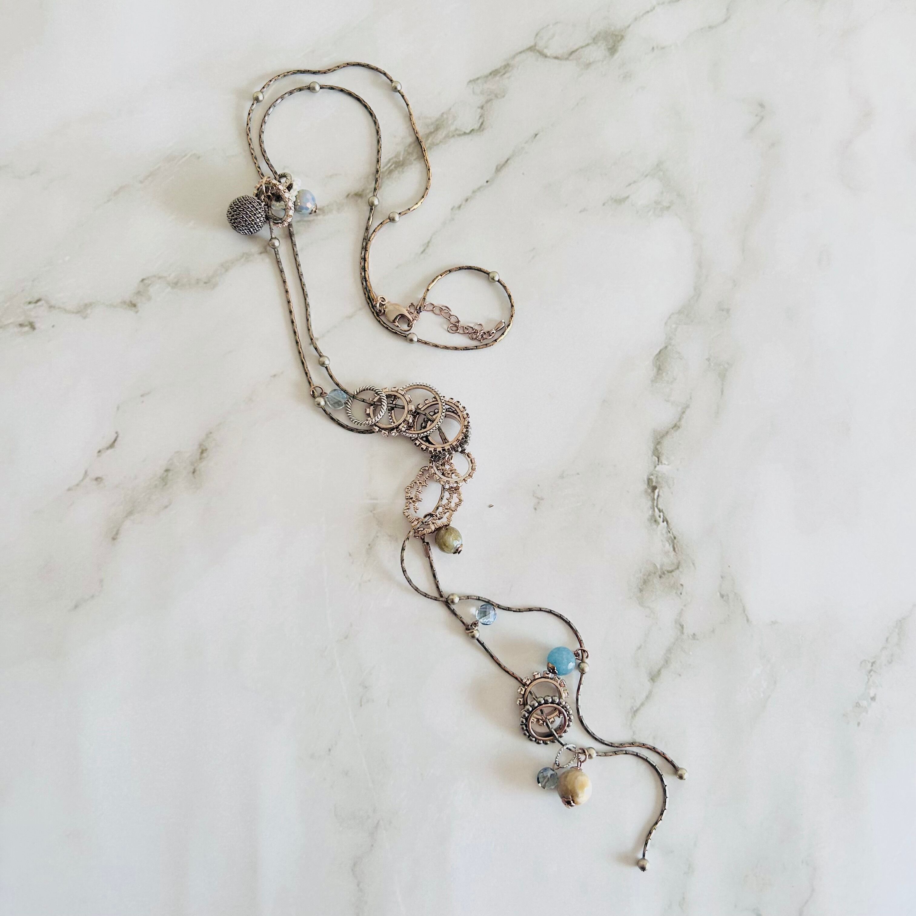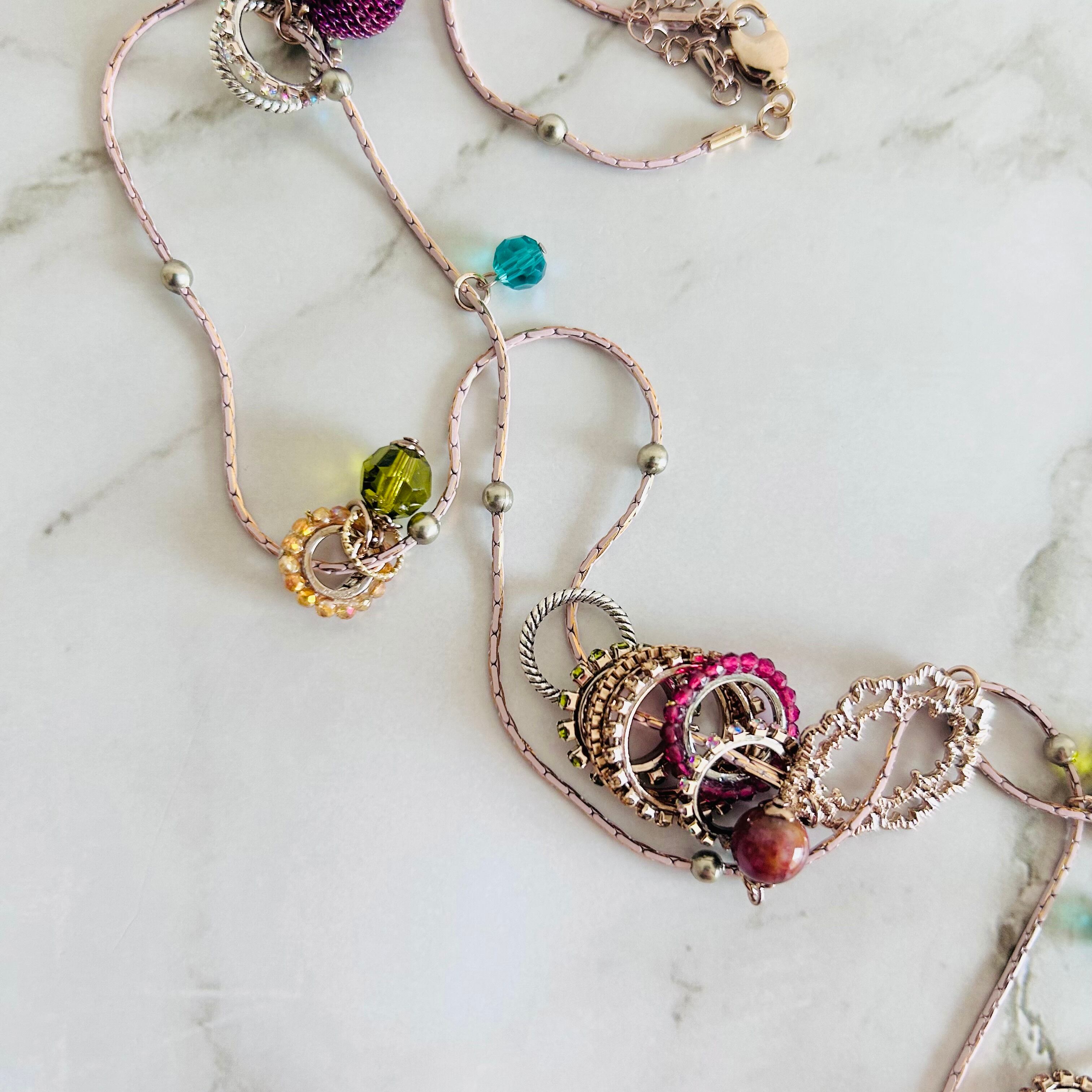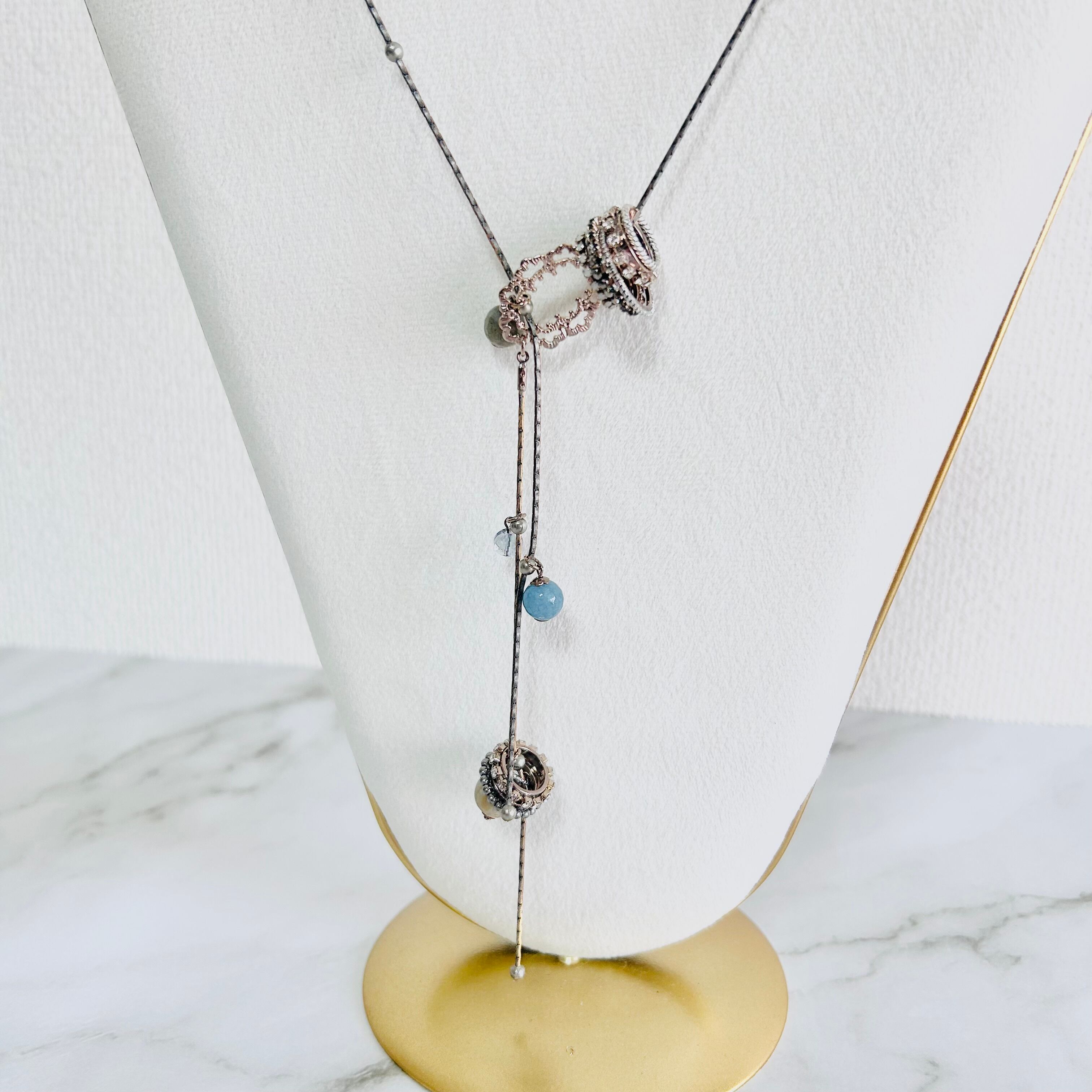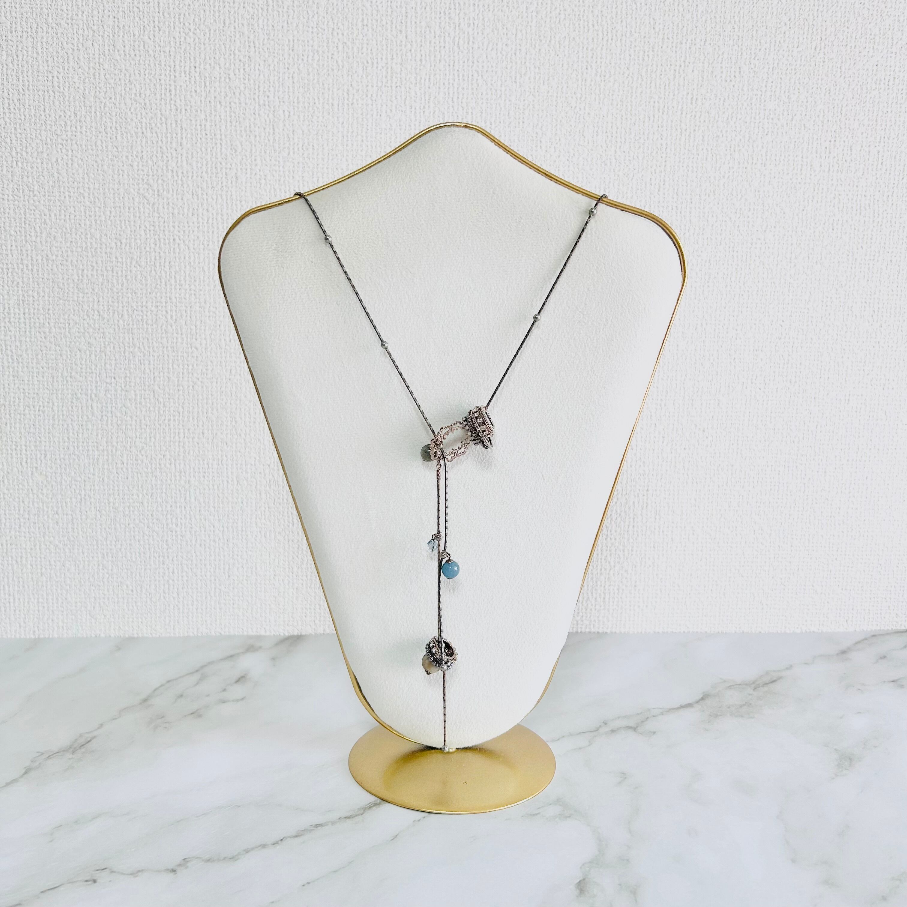 繊細なリングモチーフとさまざまな天然石やチャームを連ねた、遊び心あふれるラリエットネックレスです。