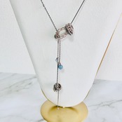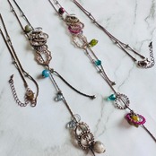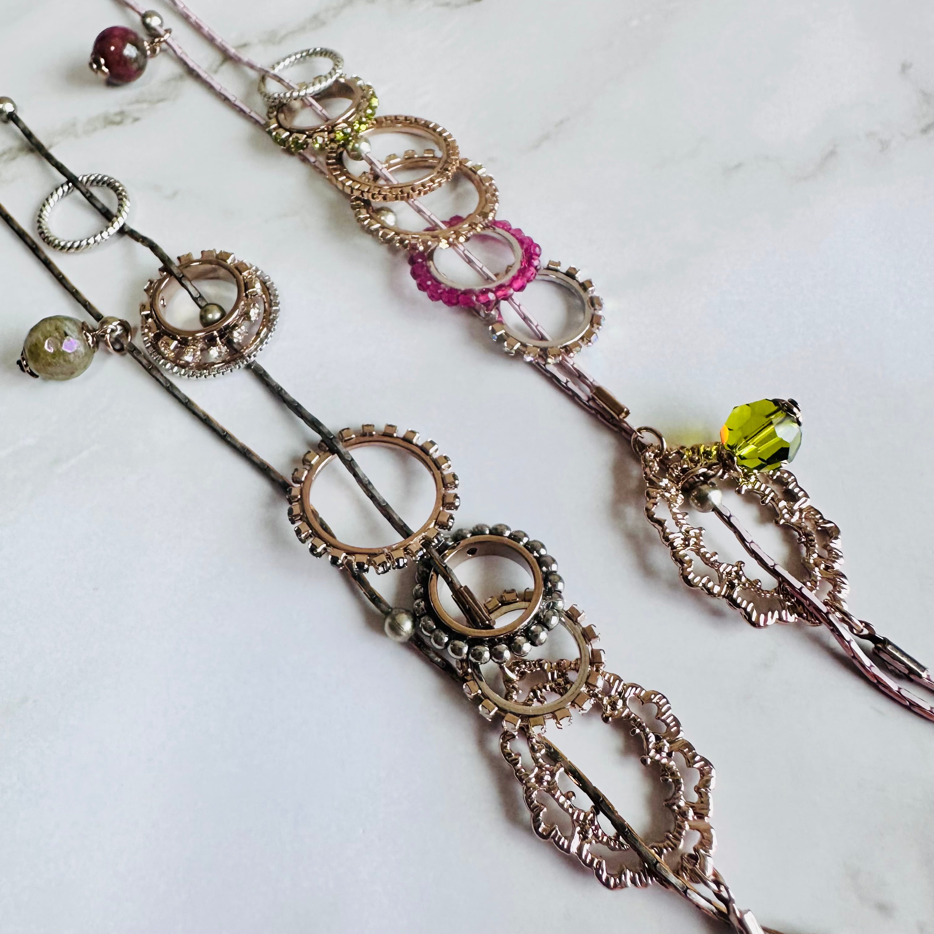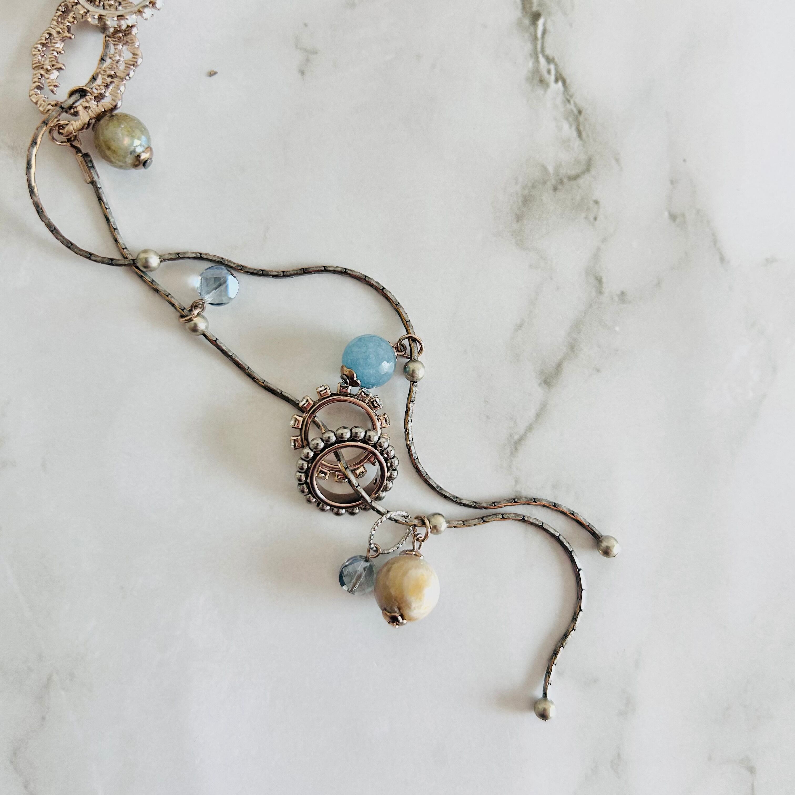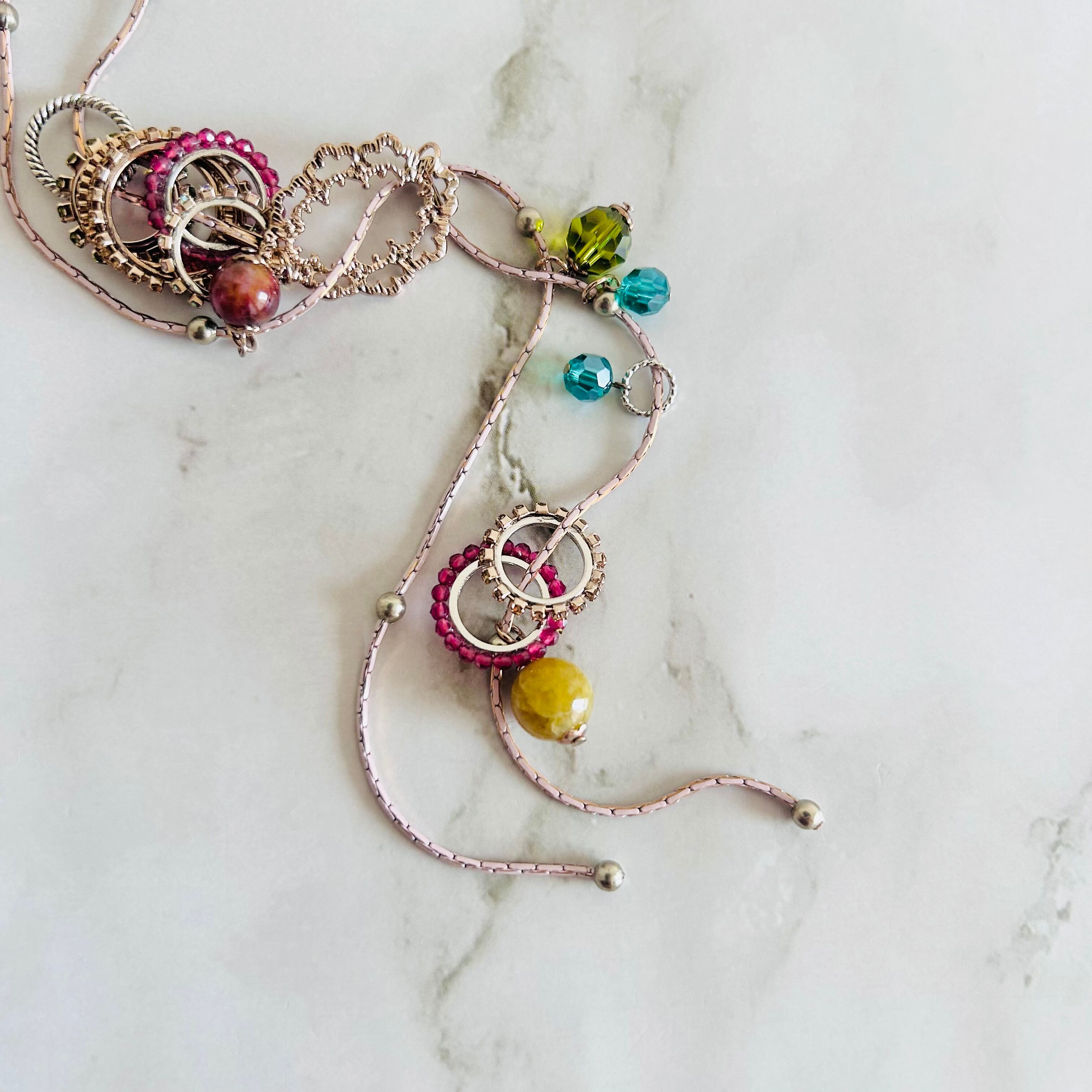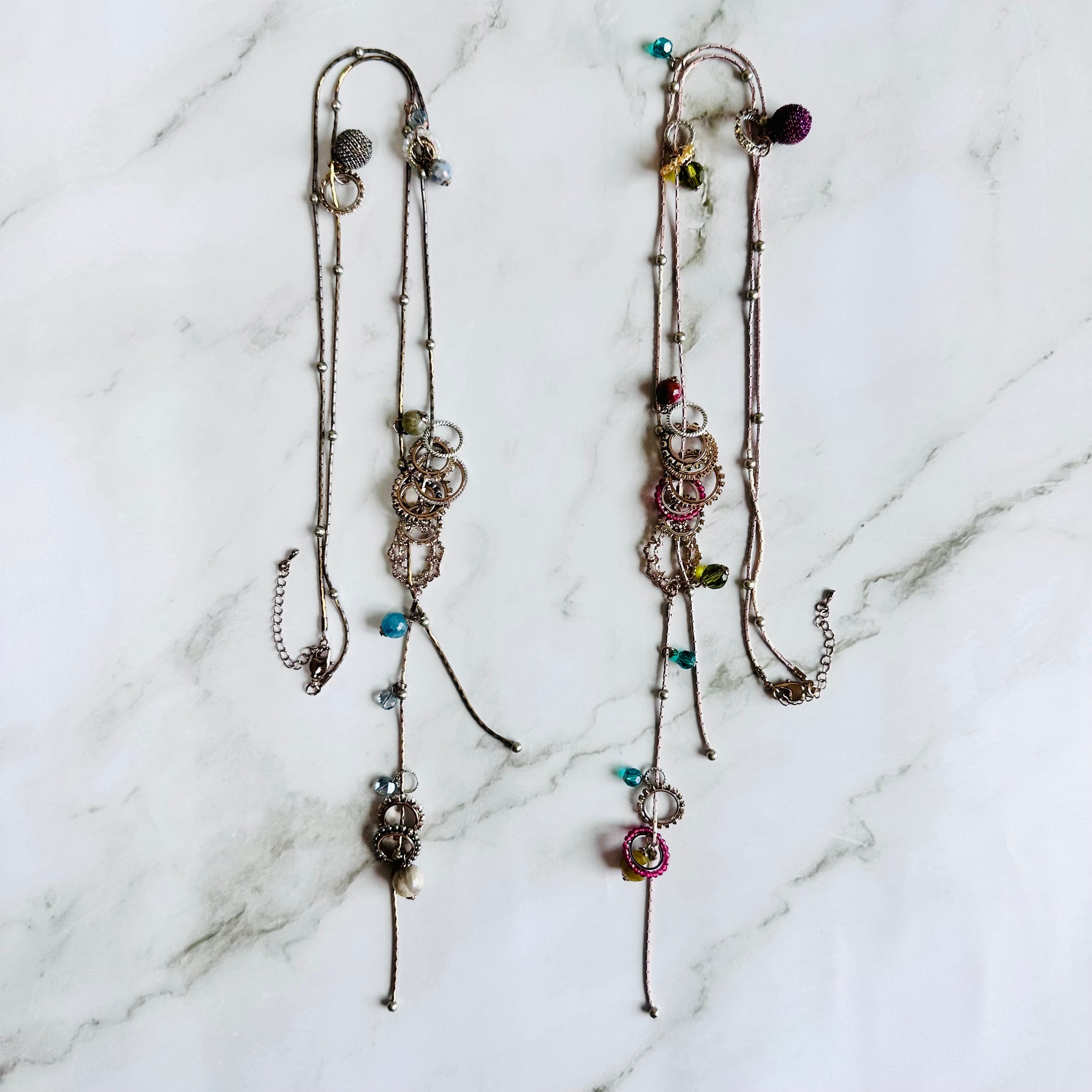 繊細なリングモチーフとさまざまな天然石やチャームを連ねた、遊び心あふれるラリエットネックレスです。