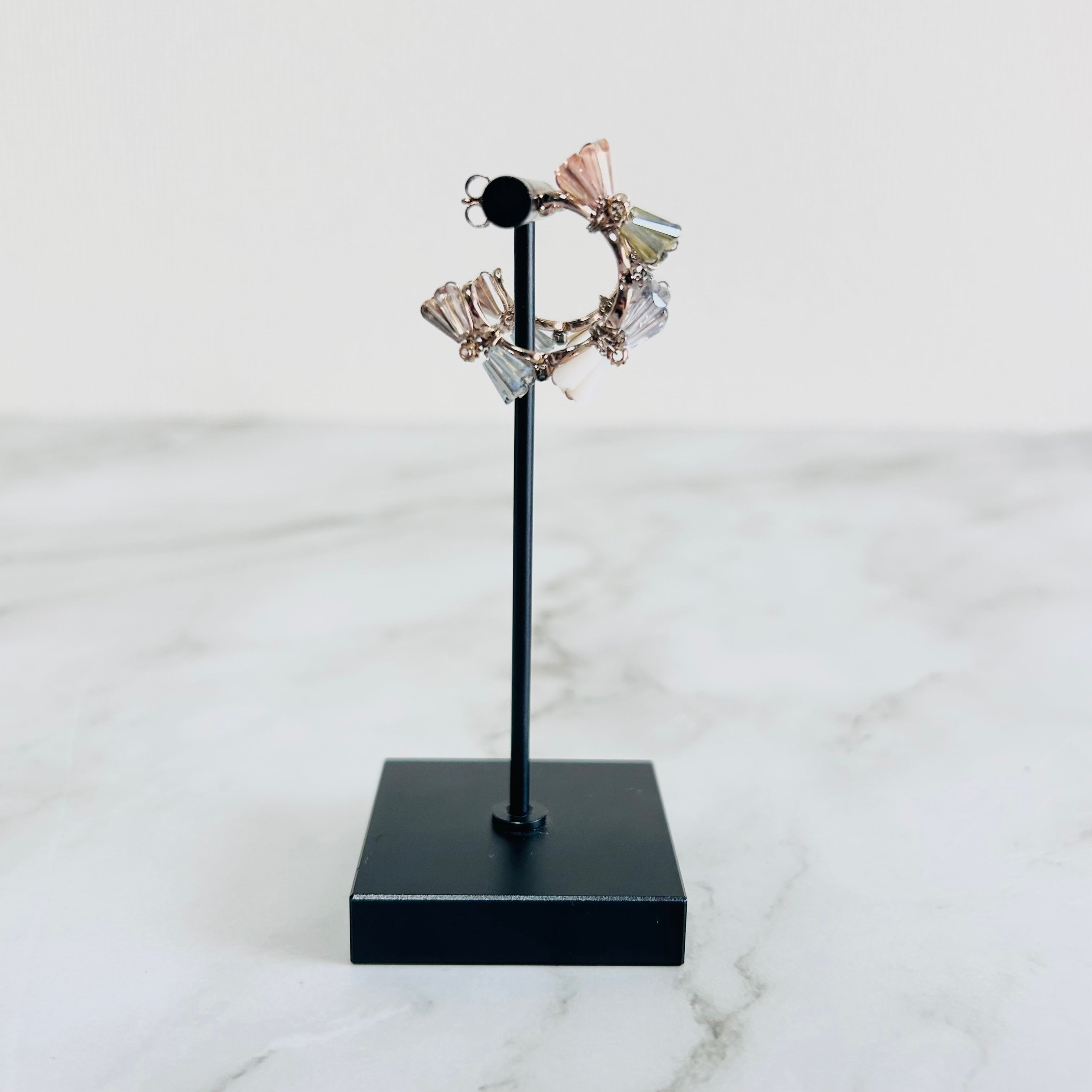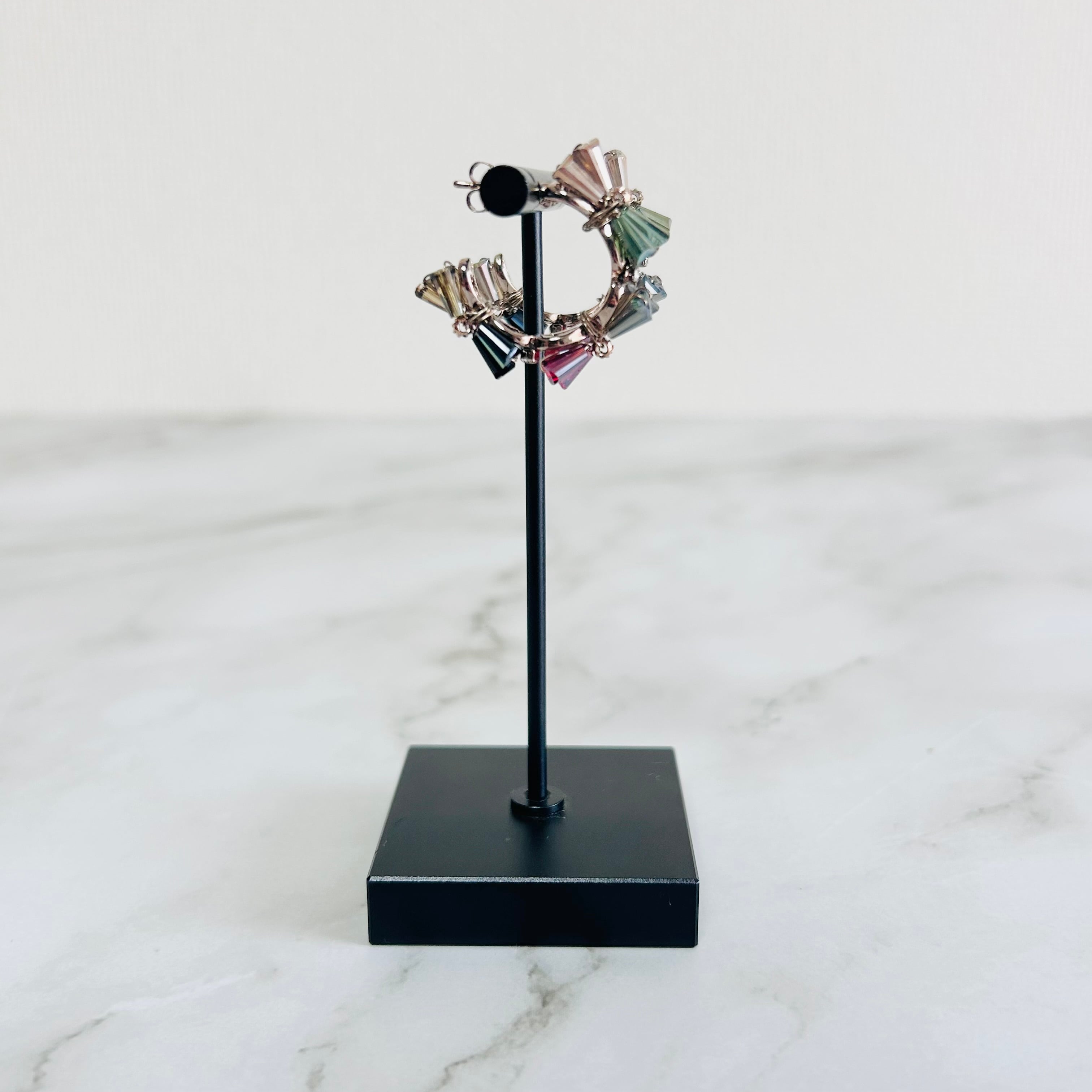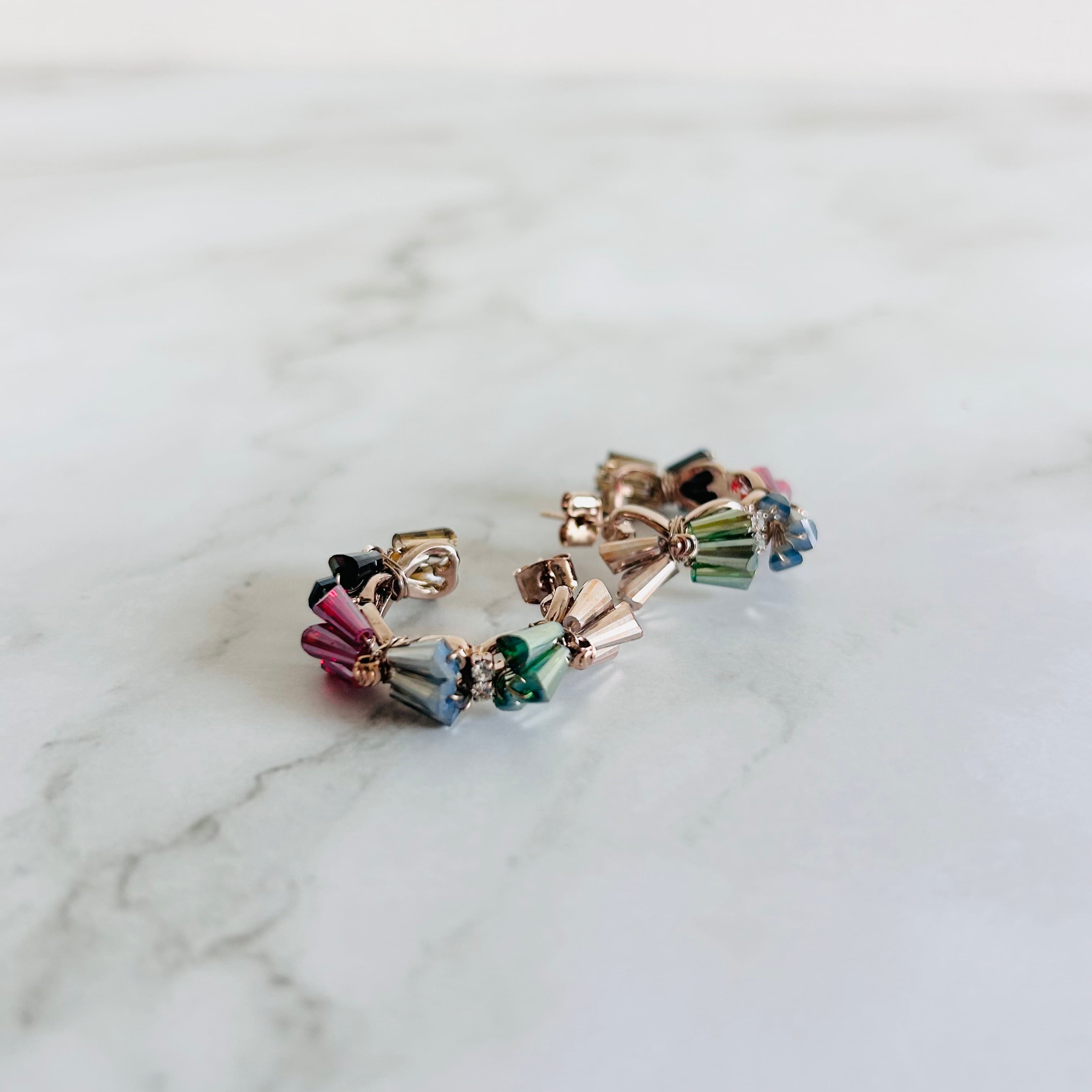 きらめくカラフルなクリスタルパーツリボン状にぐるりと並べた、華やかで遊び心のあるフープピアスです。