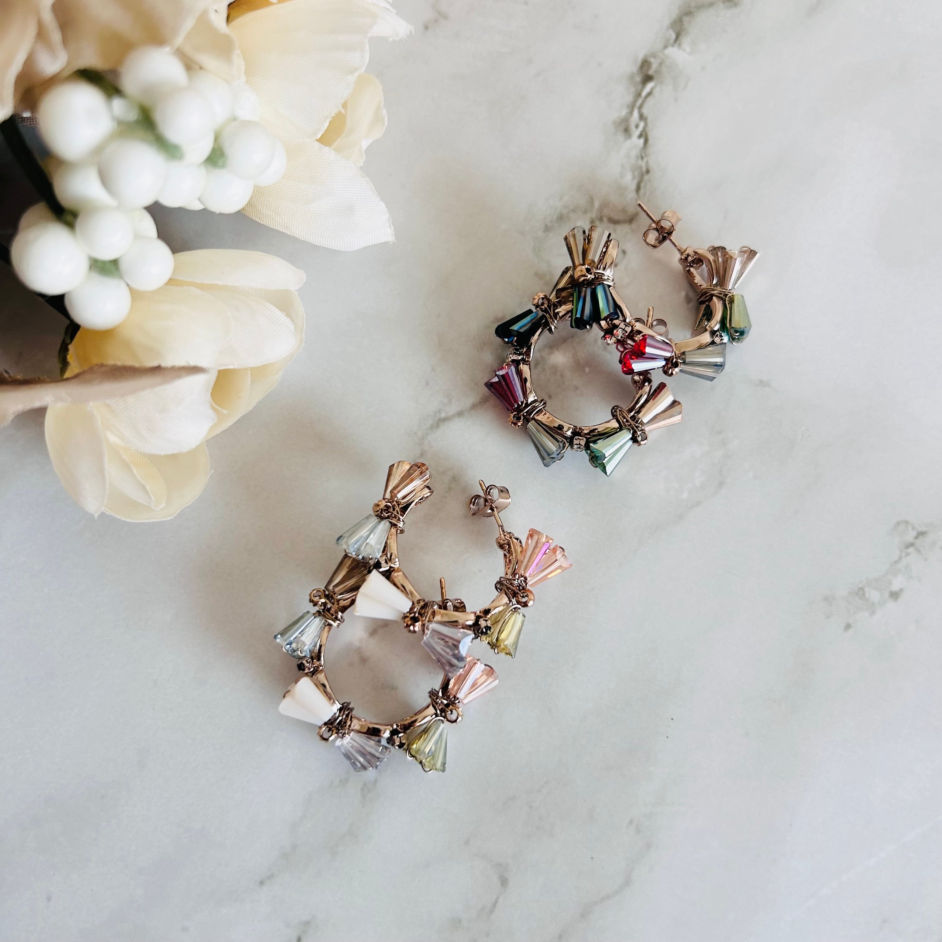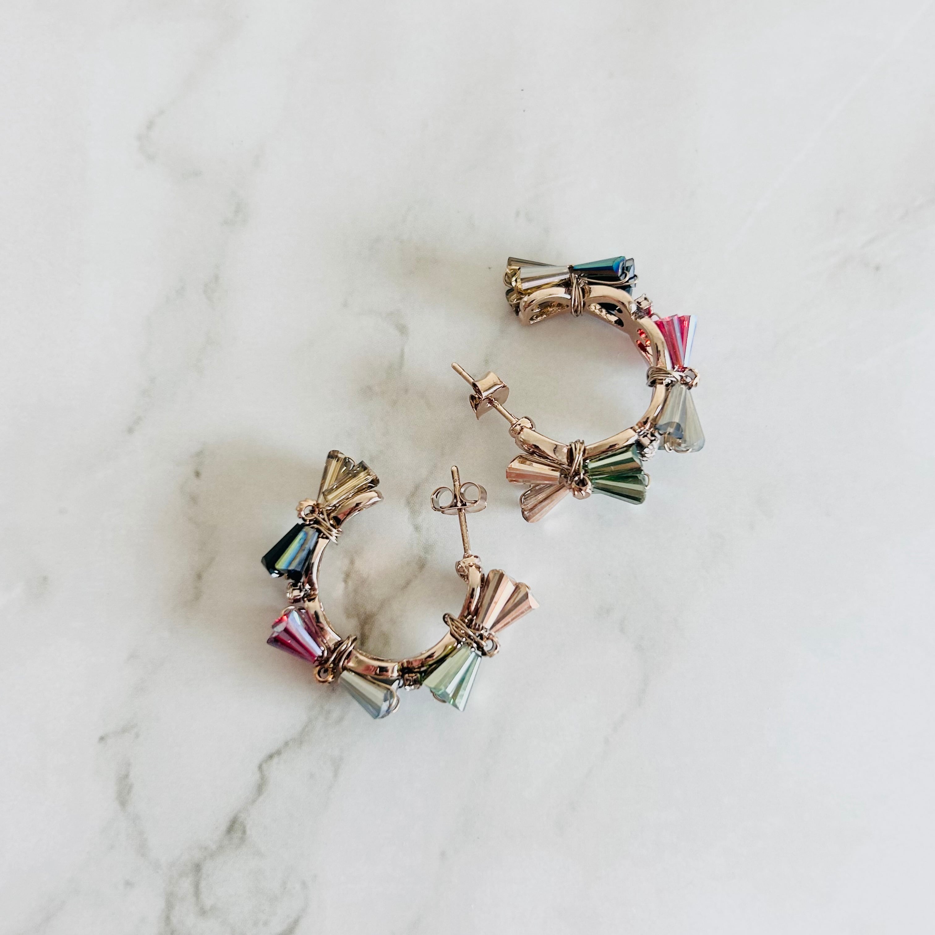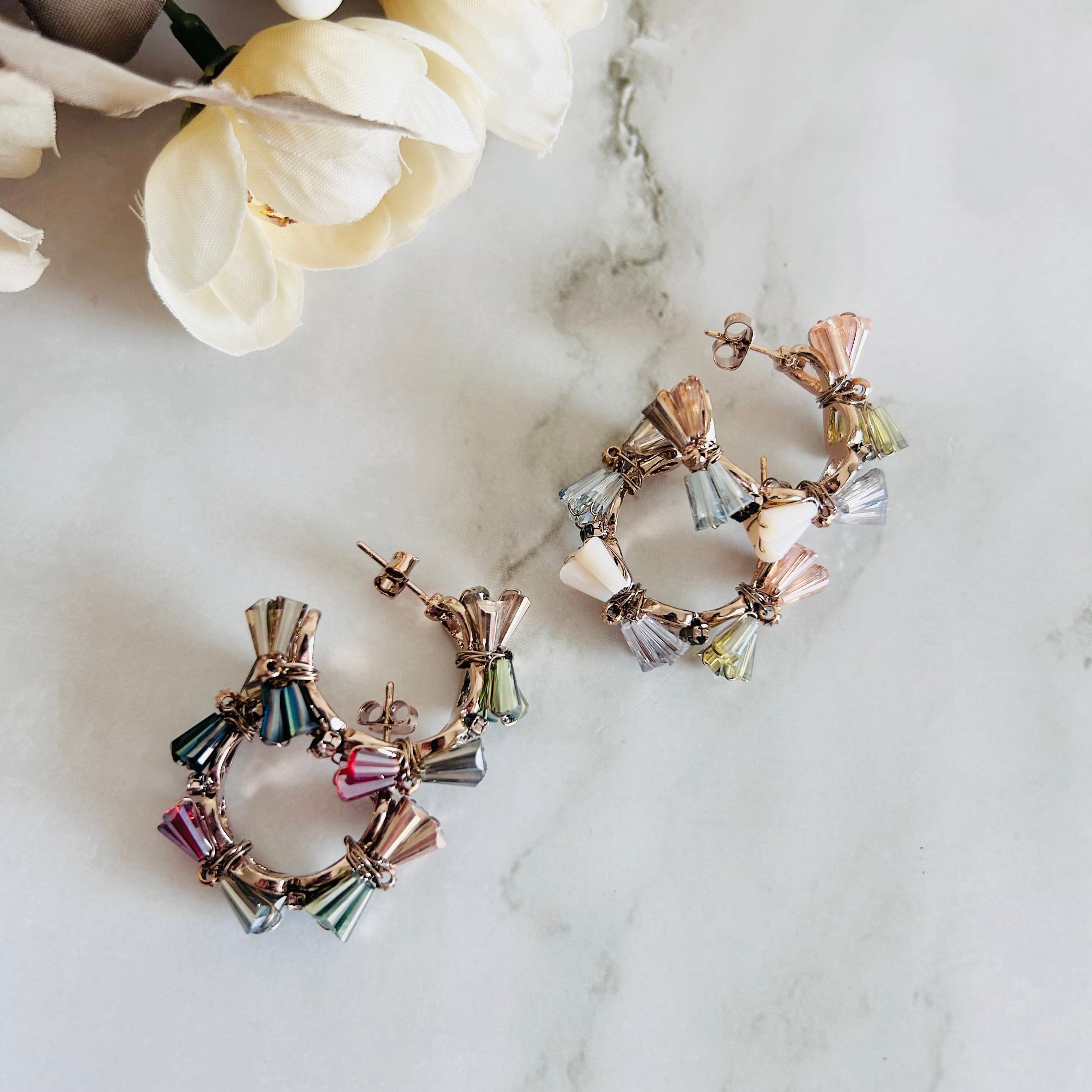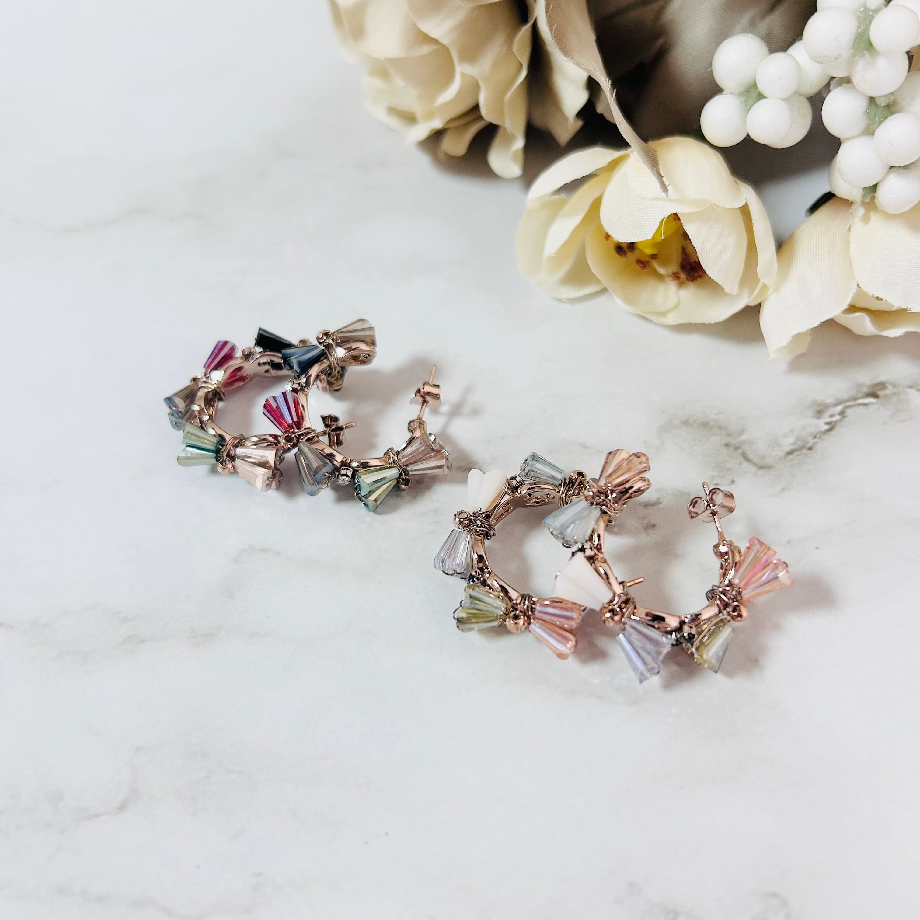 きらめくカラフルなクリスタルパーツリボン状にぐるりと並べた、華やかで遊び心のあるフープピアスです。