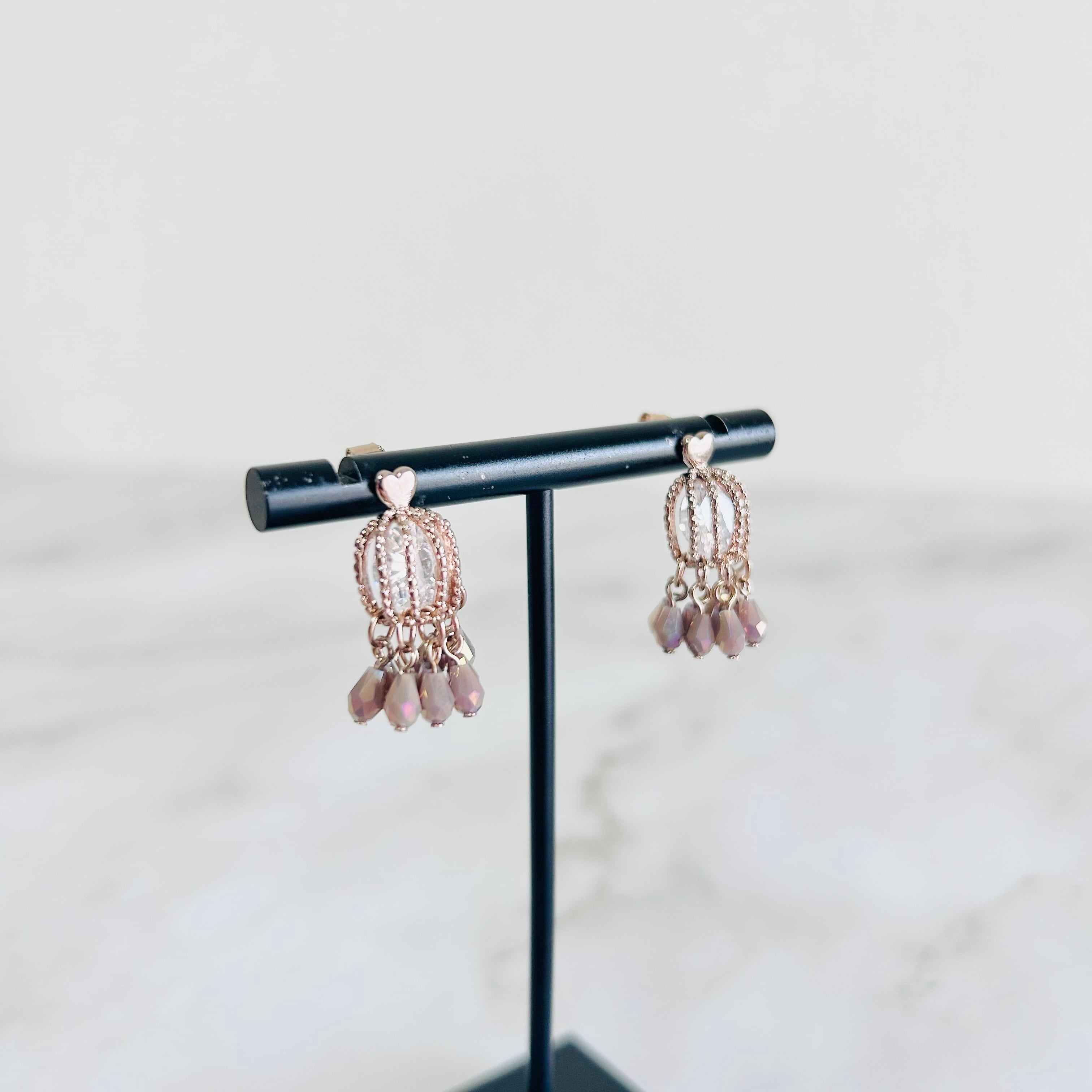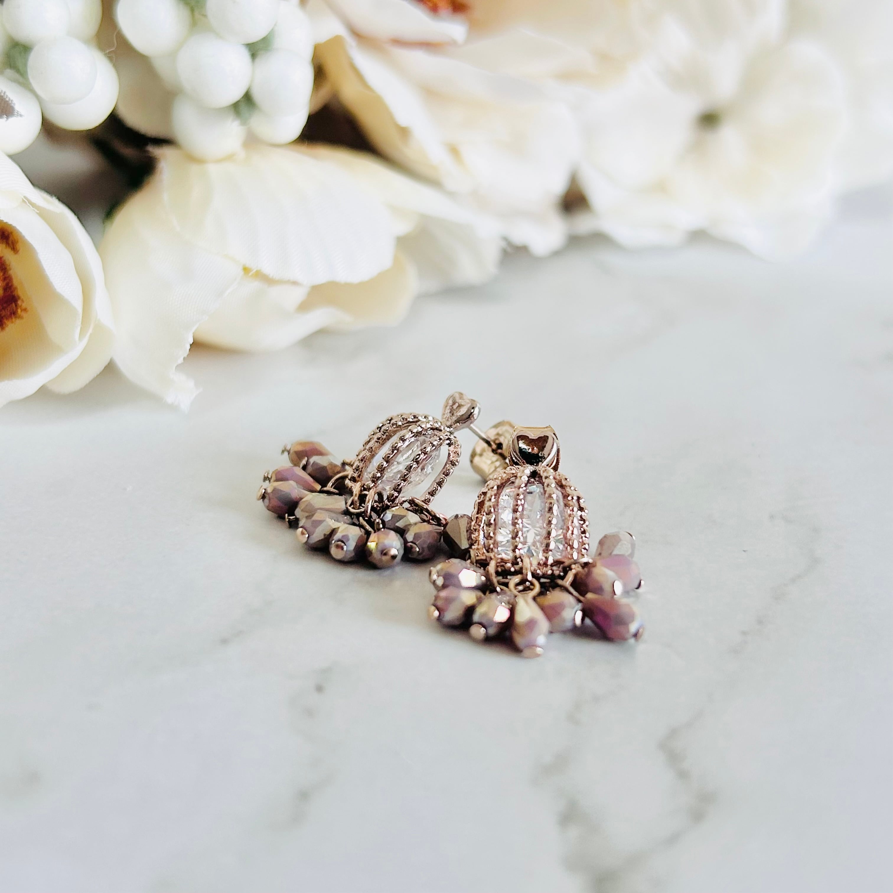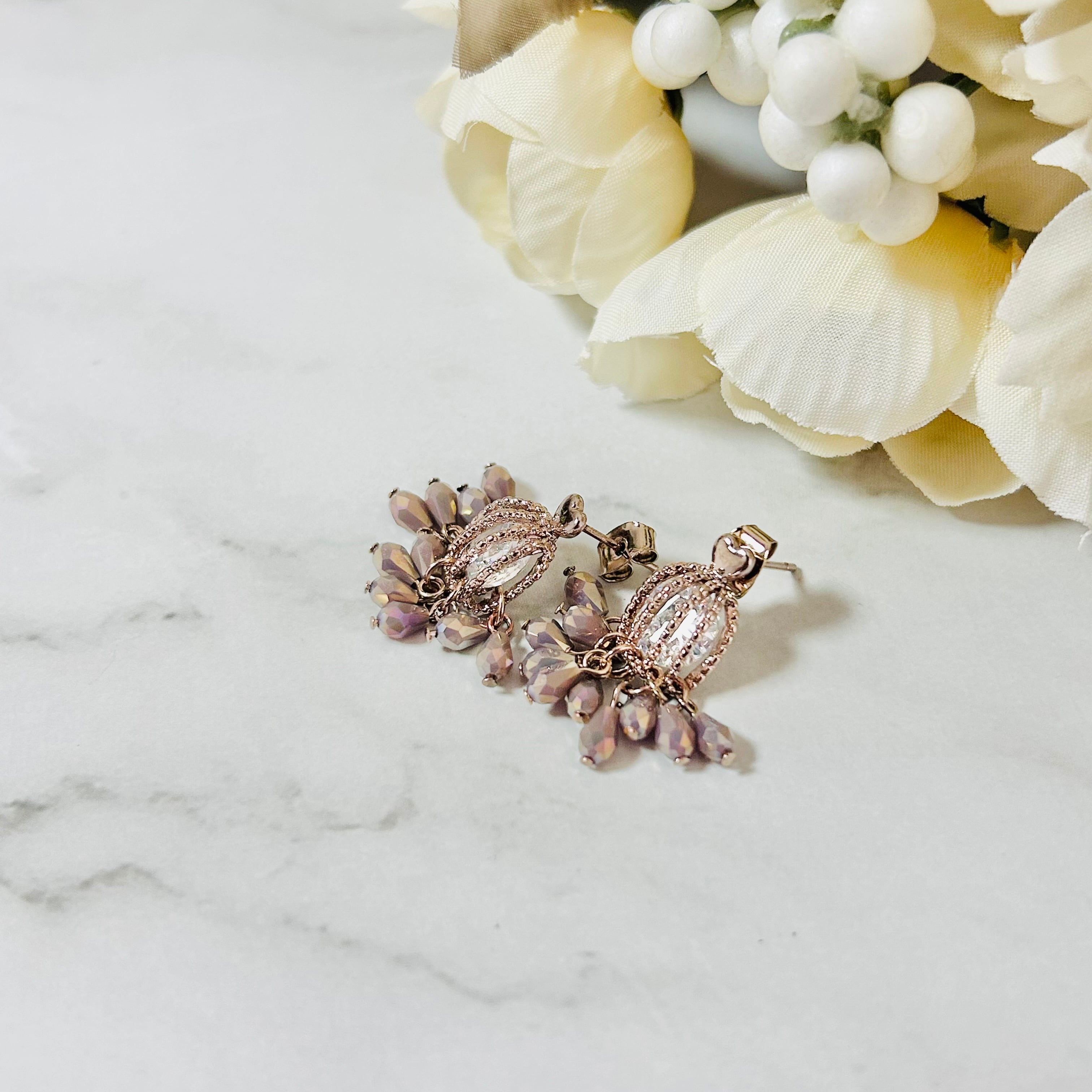 柔らかな光沢を放つグレイッシュなパープル系のクリスタルビーズを、クラシカルなケージデザインのフレームにあしらったおしゃれ心をくすぐるピアスです。