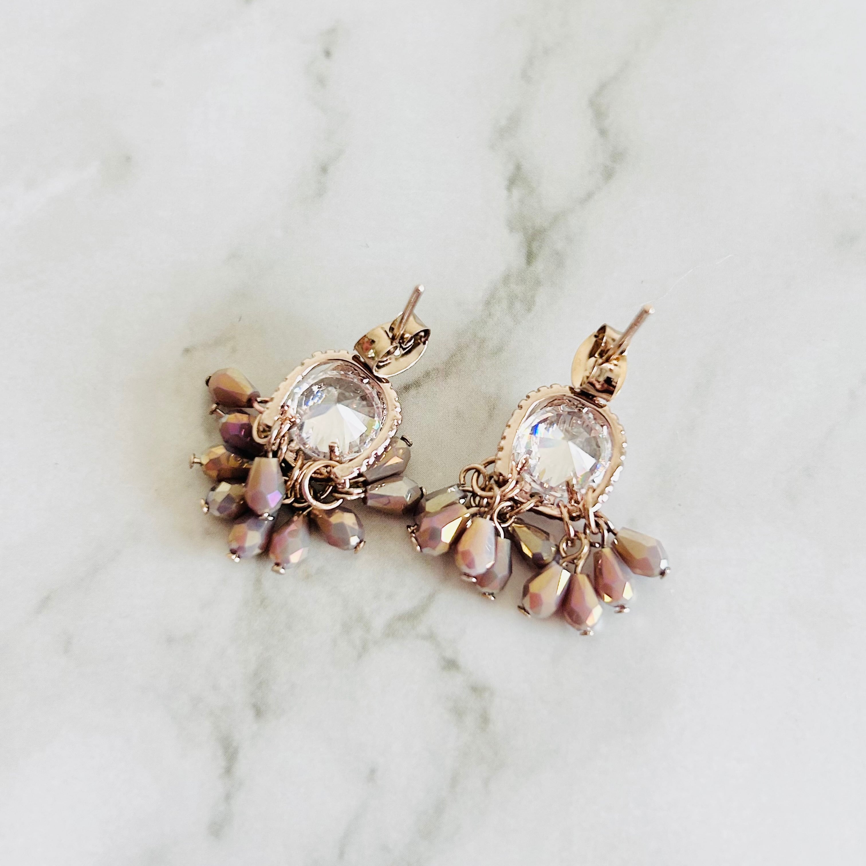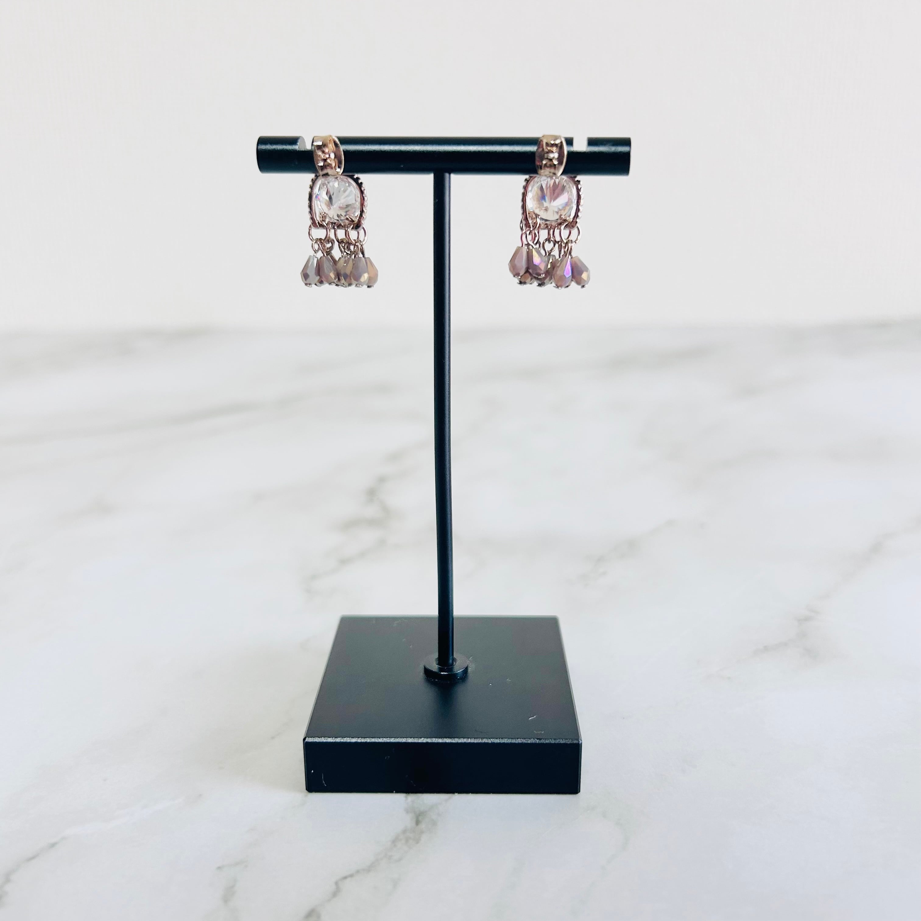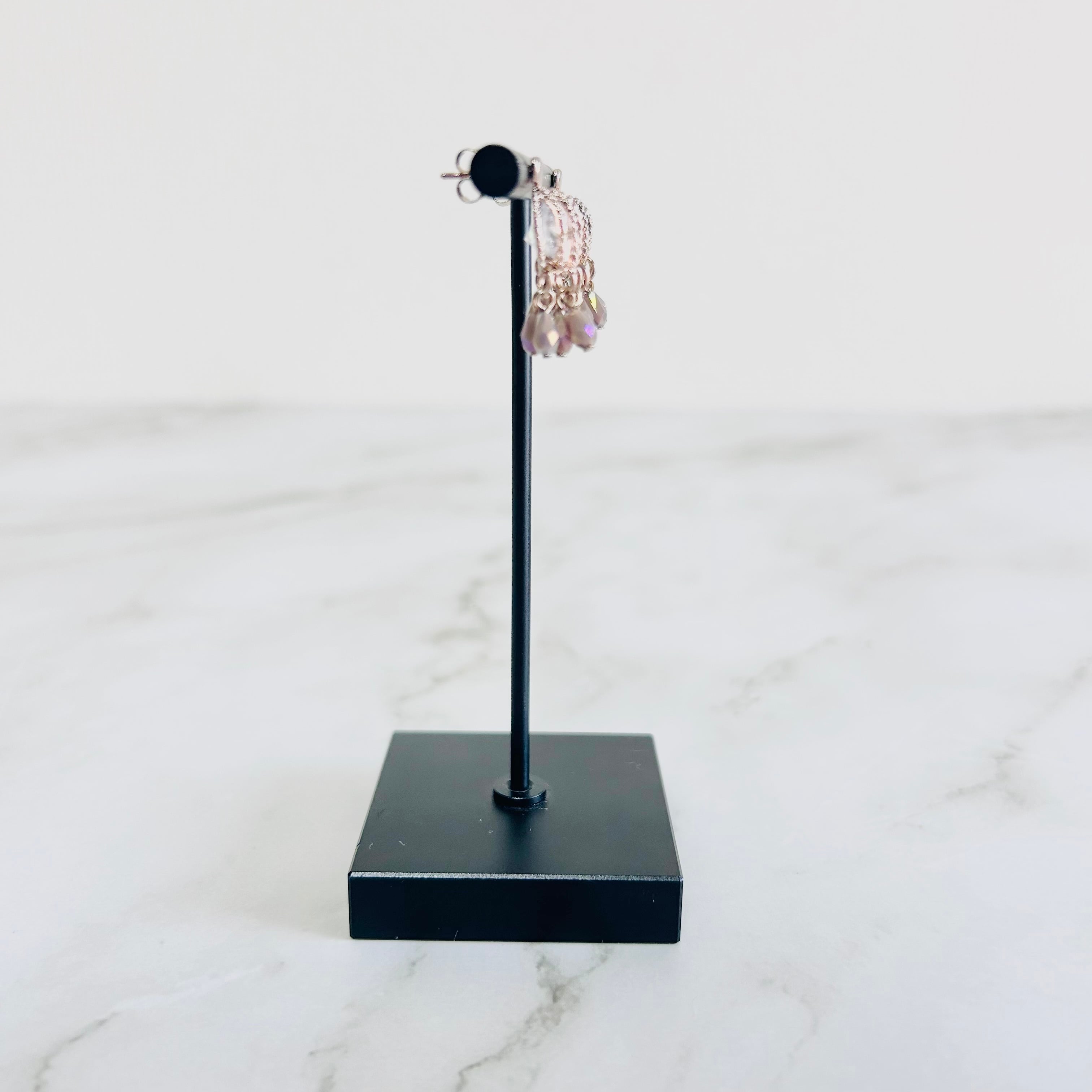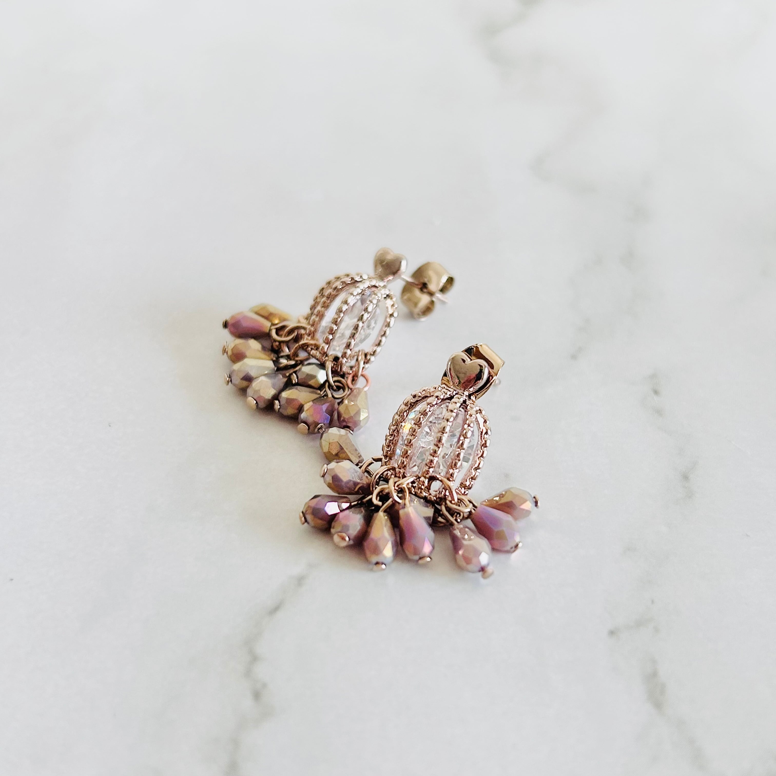 柔らかな光沢を放つグレイッシュなパープル系のクリスタルビーズを、クラシカルなケージデザインのフレームにあしらったおしゃれ心をくすぐるピアスです。