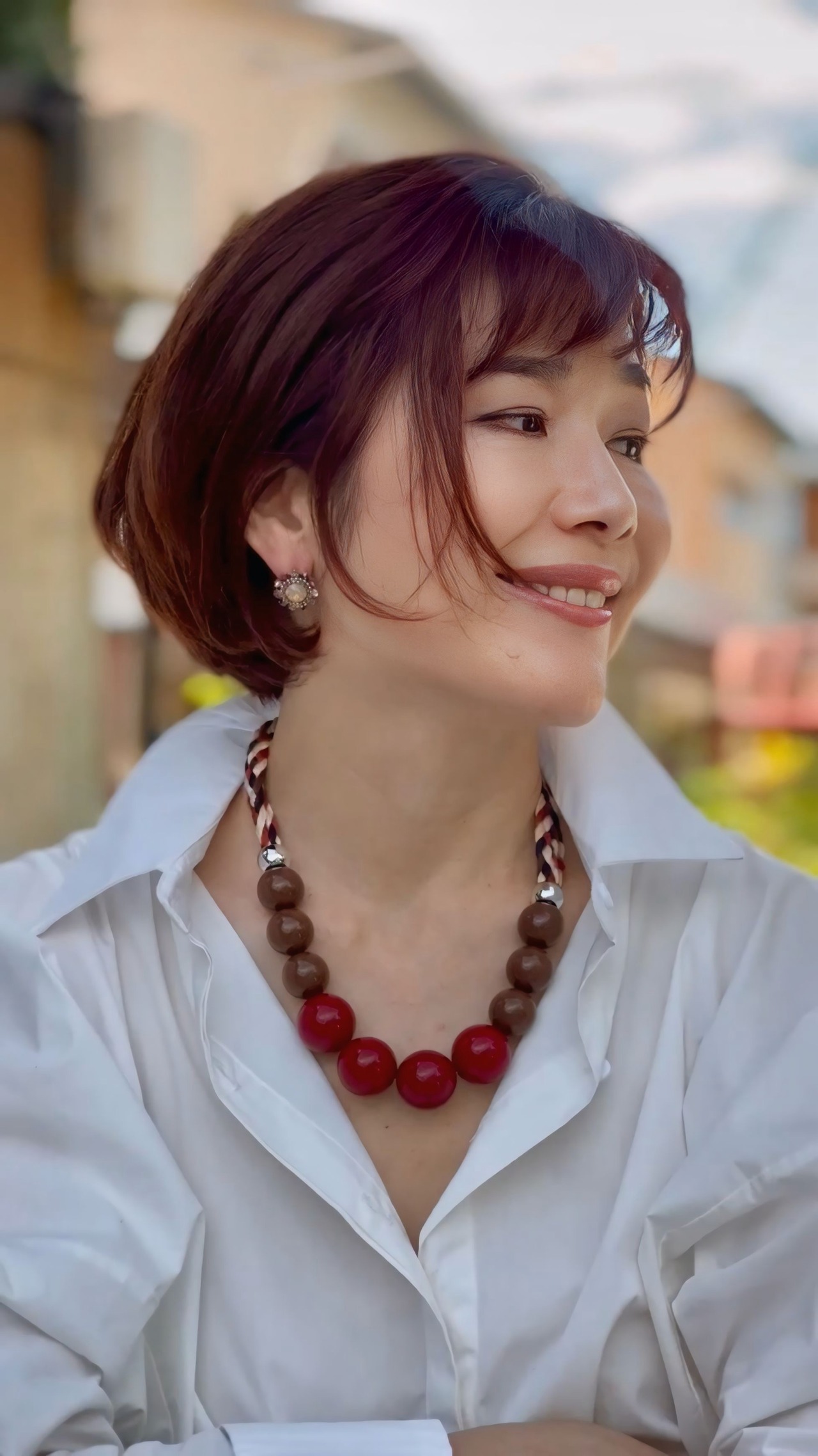 艶やかなダークレッドとチョコレートブラウンのビーズがリズム良く並び、存在感のあるデザインに仕上がっています。