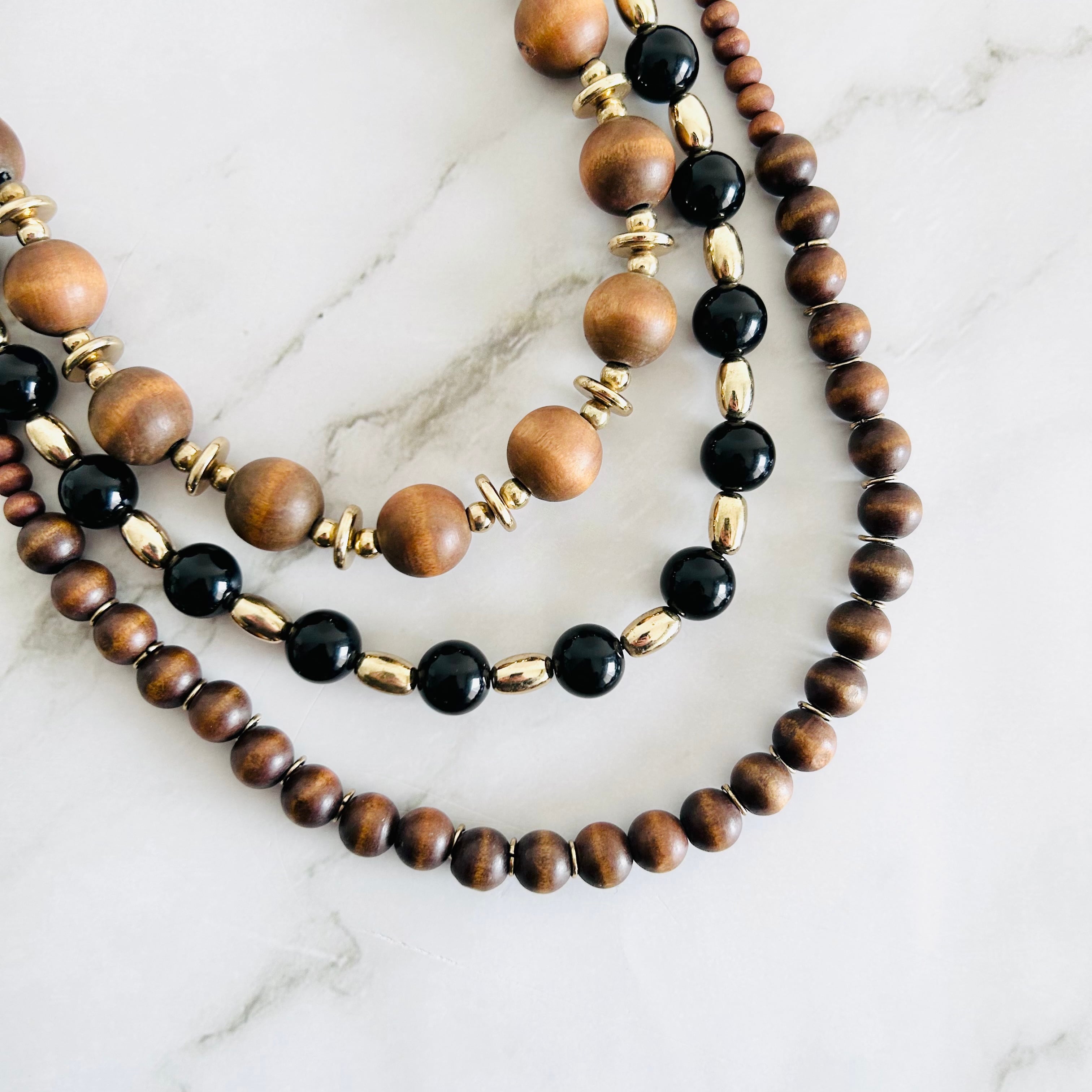 木の温もりを感じるウッドビーズと、艶やかなブラックビーズ、そして輝きを添えるゴールドパーツを組み合わせた三連ネックレスです。